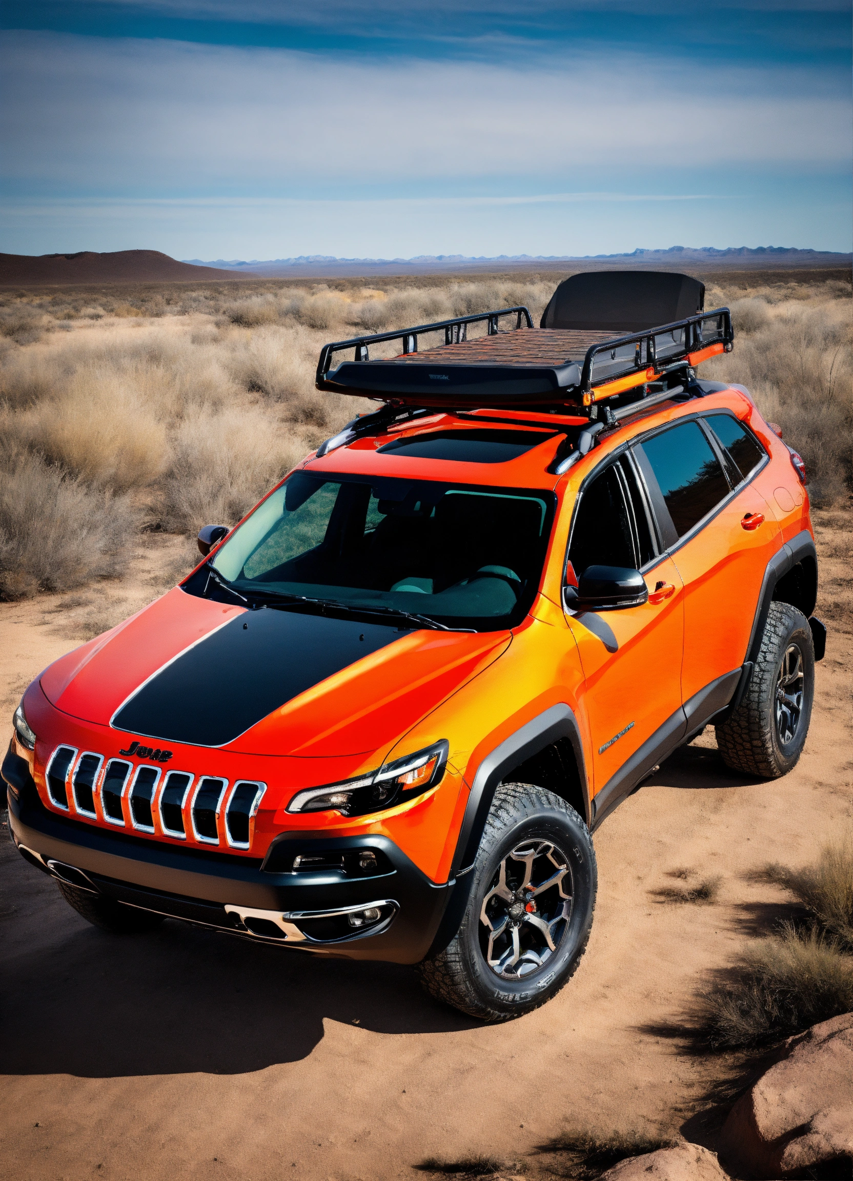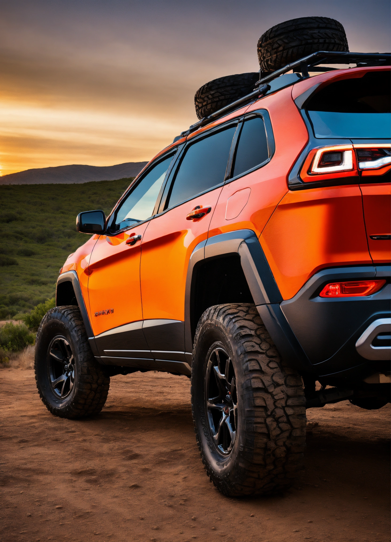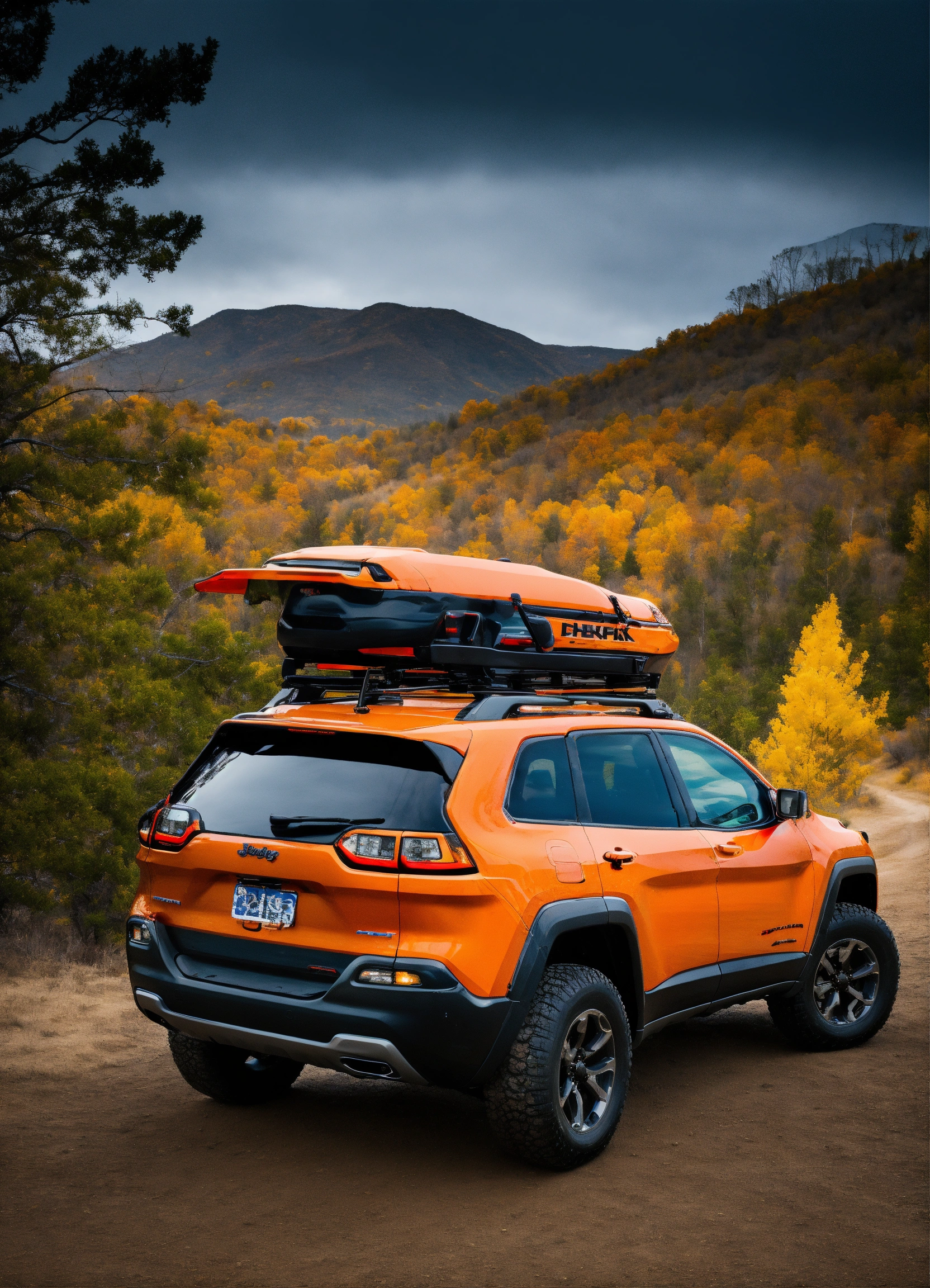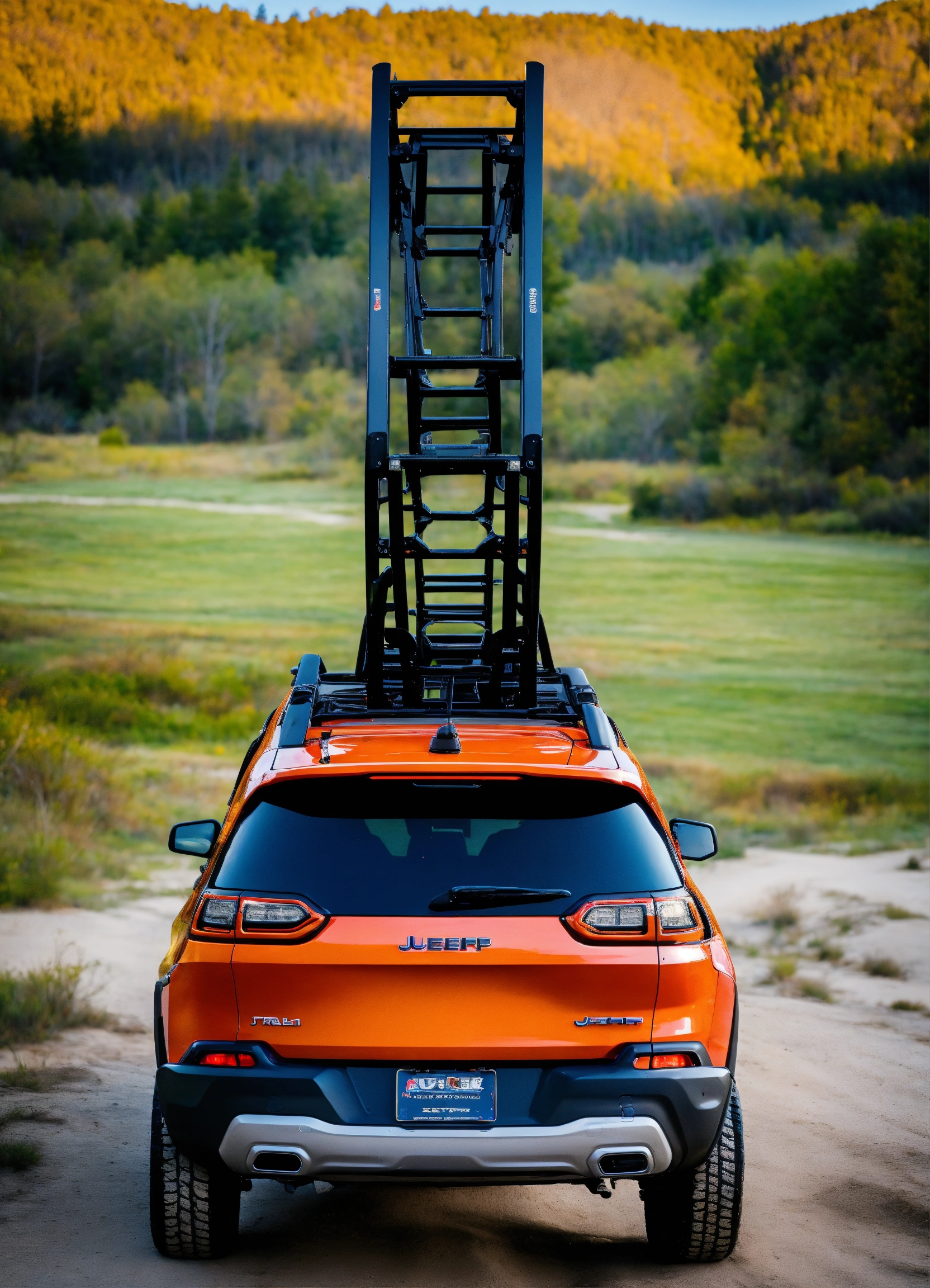 Orange jeep cherokee trailhawk, it has a rear ladder on the liftgate, traction boards are attached to the ladder