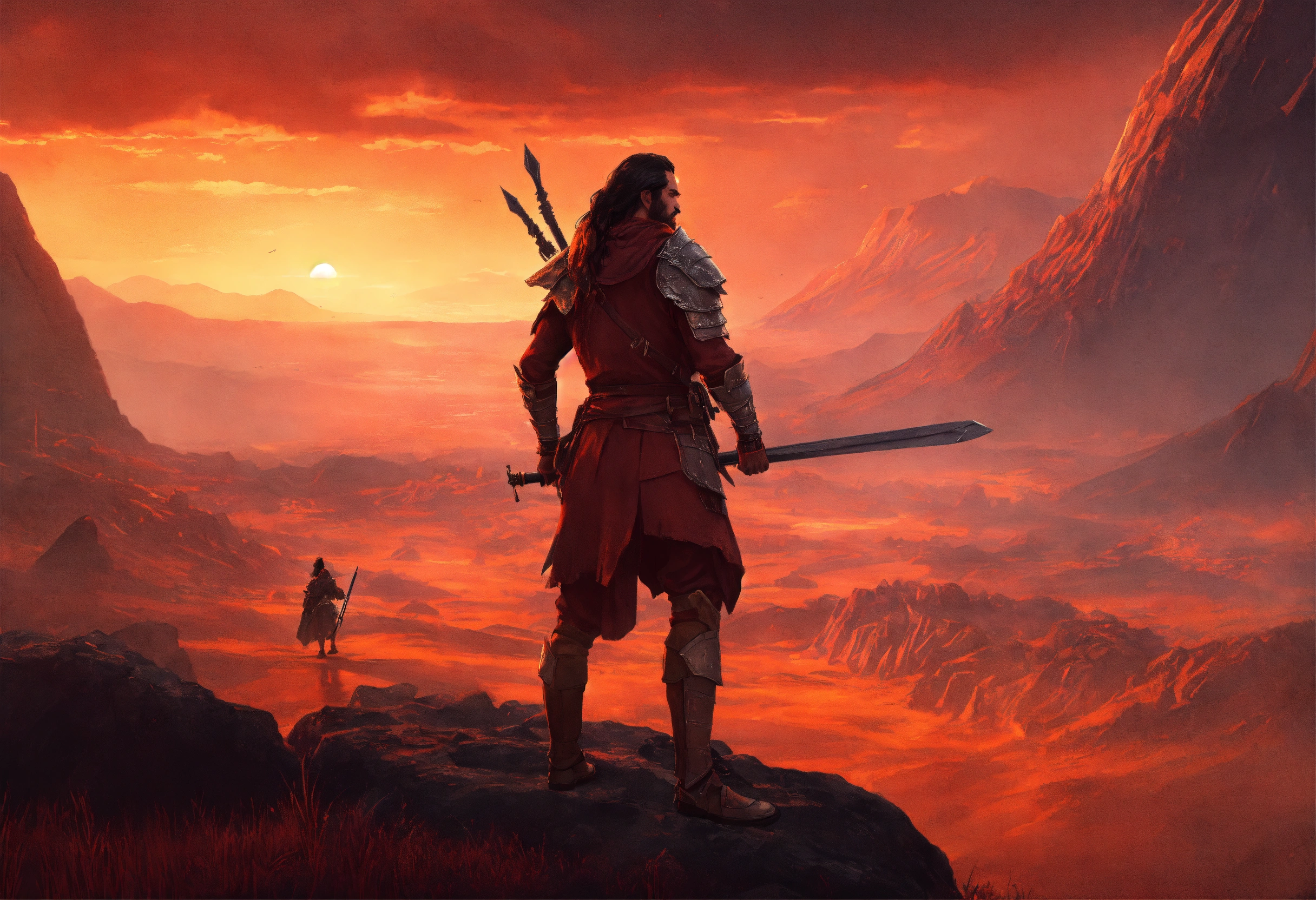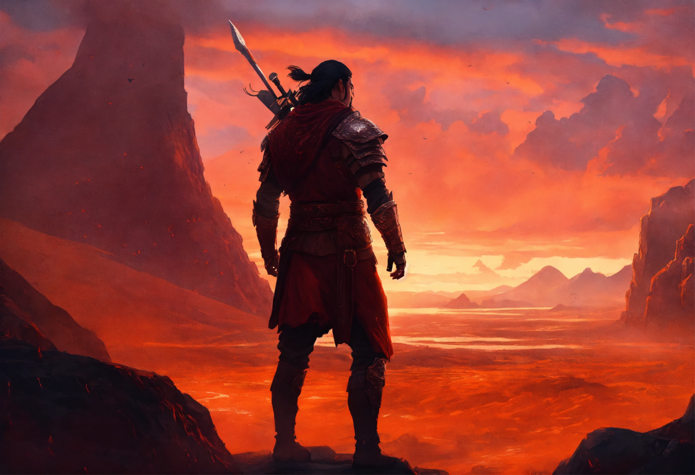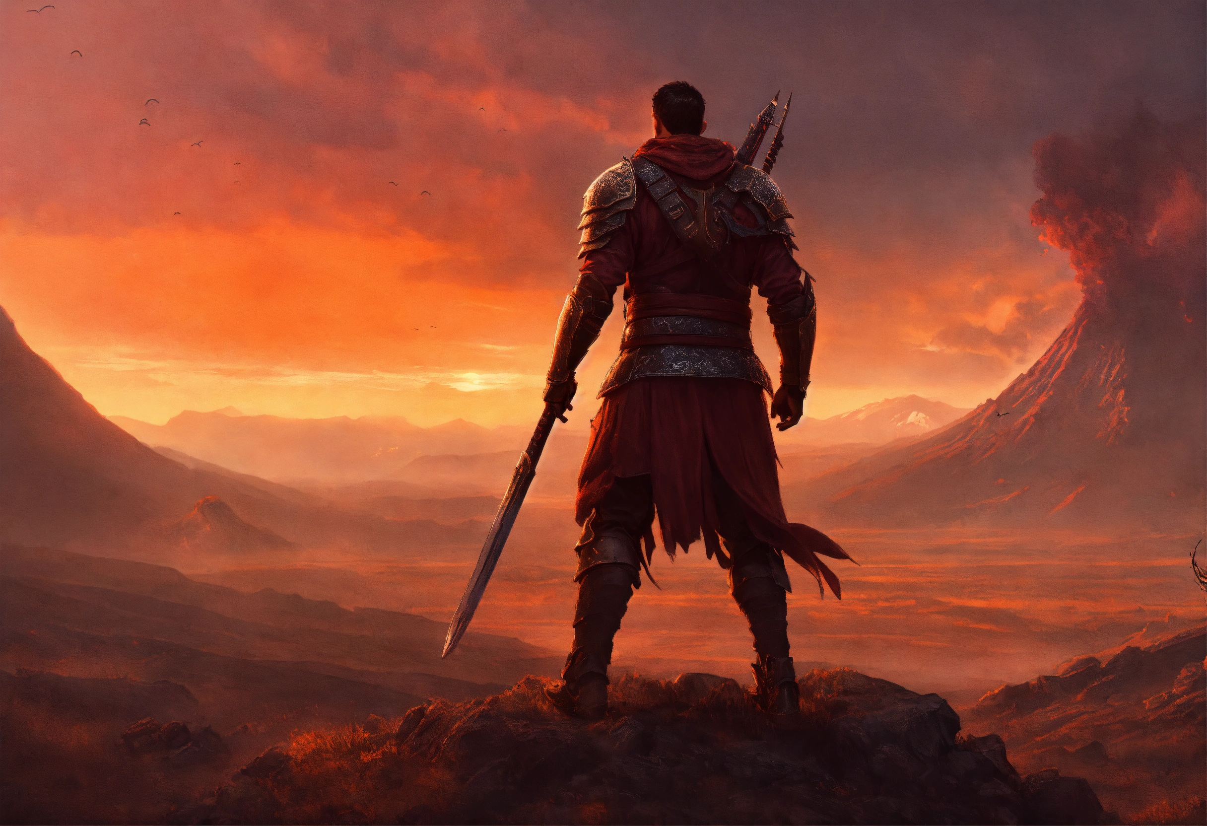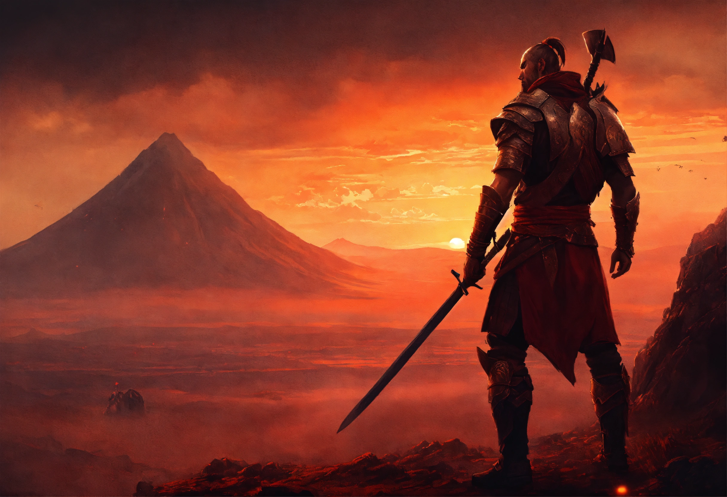 A highly detailed, epic cinematic concept art of a warrior in dirty burgundy clothing who finds himself in a defensive stance. looking at the viewer.the sky is colored by an soft orange sunrise. the landscape is characterized by volcanic rock.
