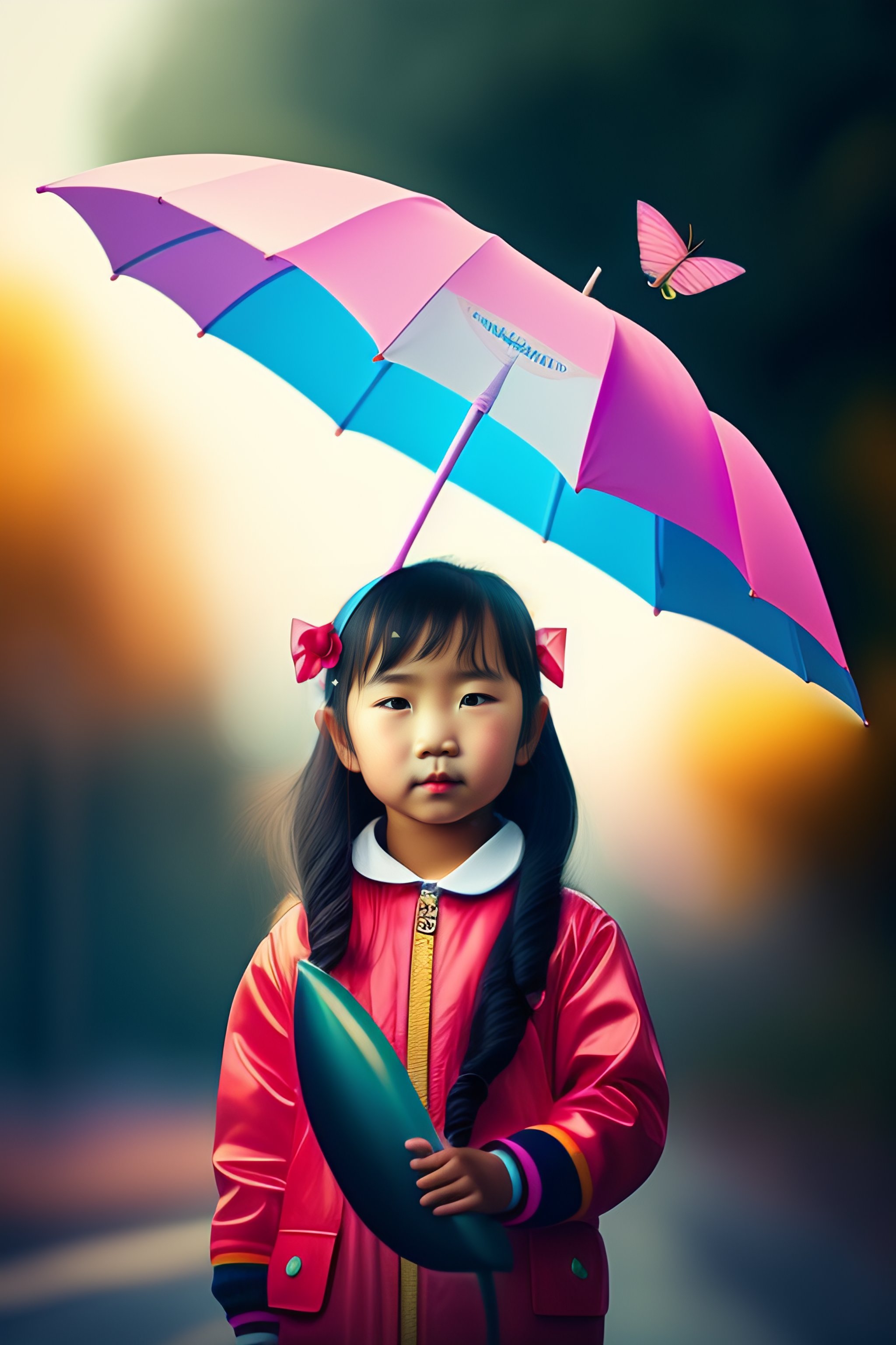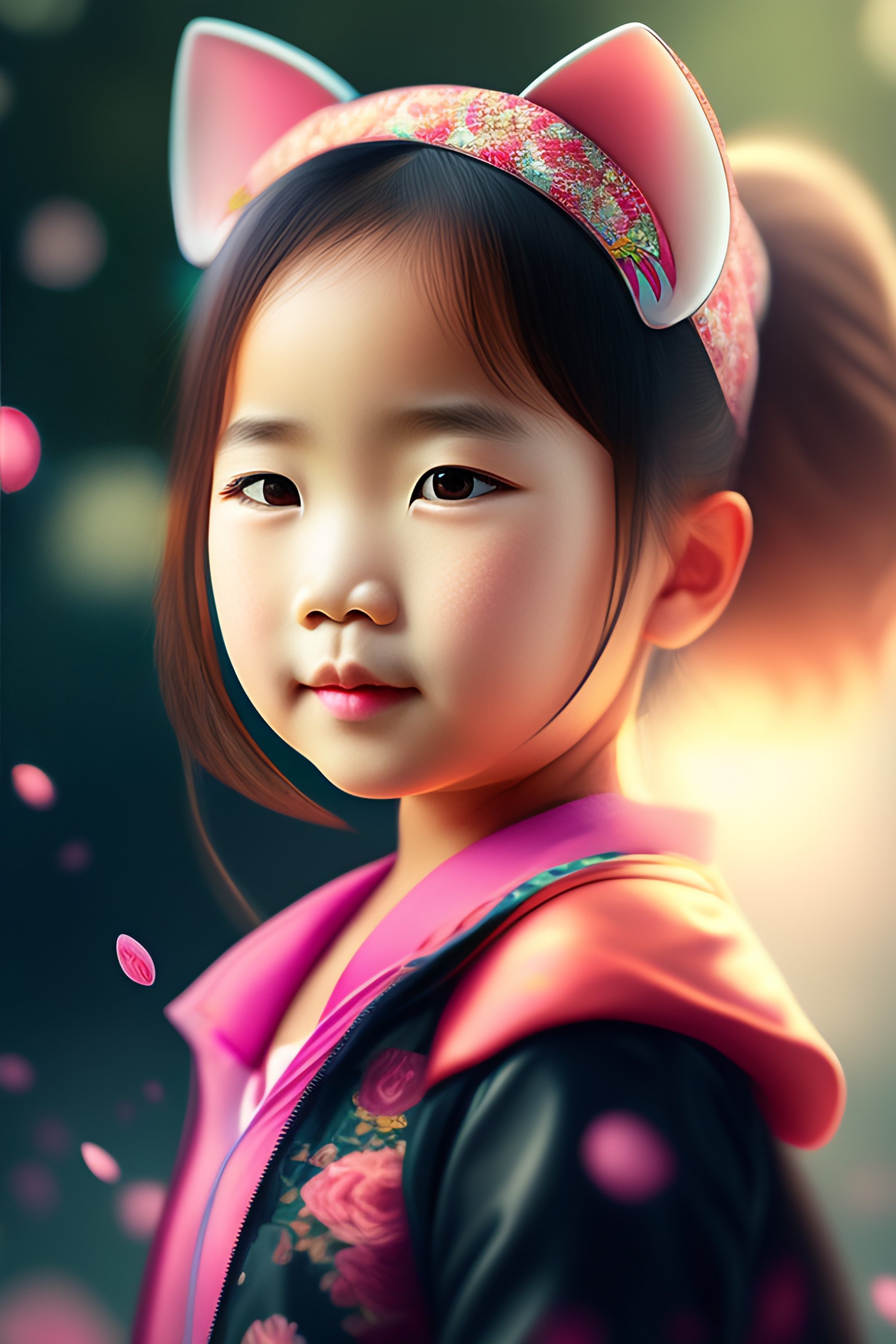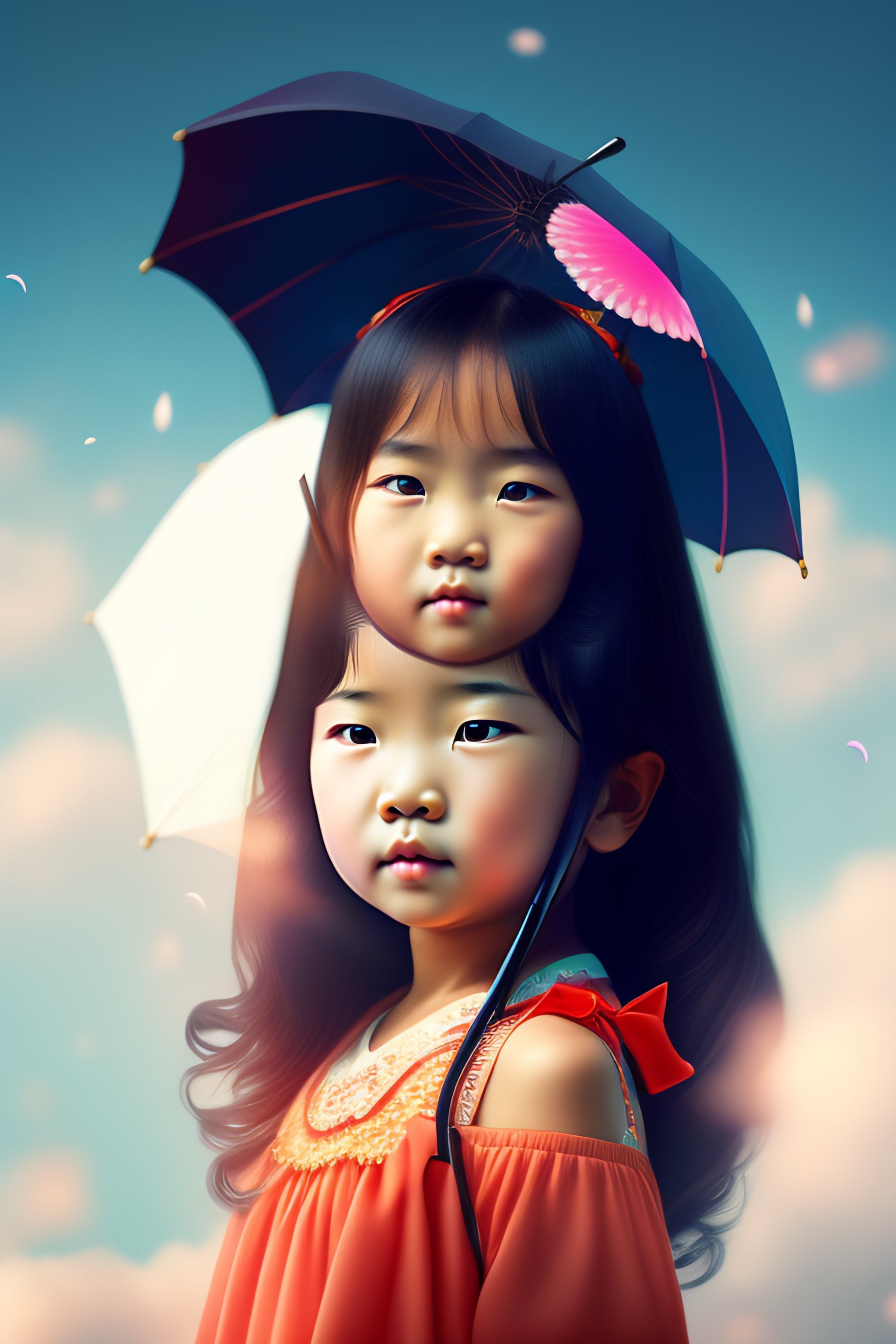 Beautiful cute little asian girl, wearing kitty headband, holding floating umbrella, floating in the sky, digital art, photo-realistic, 4k