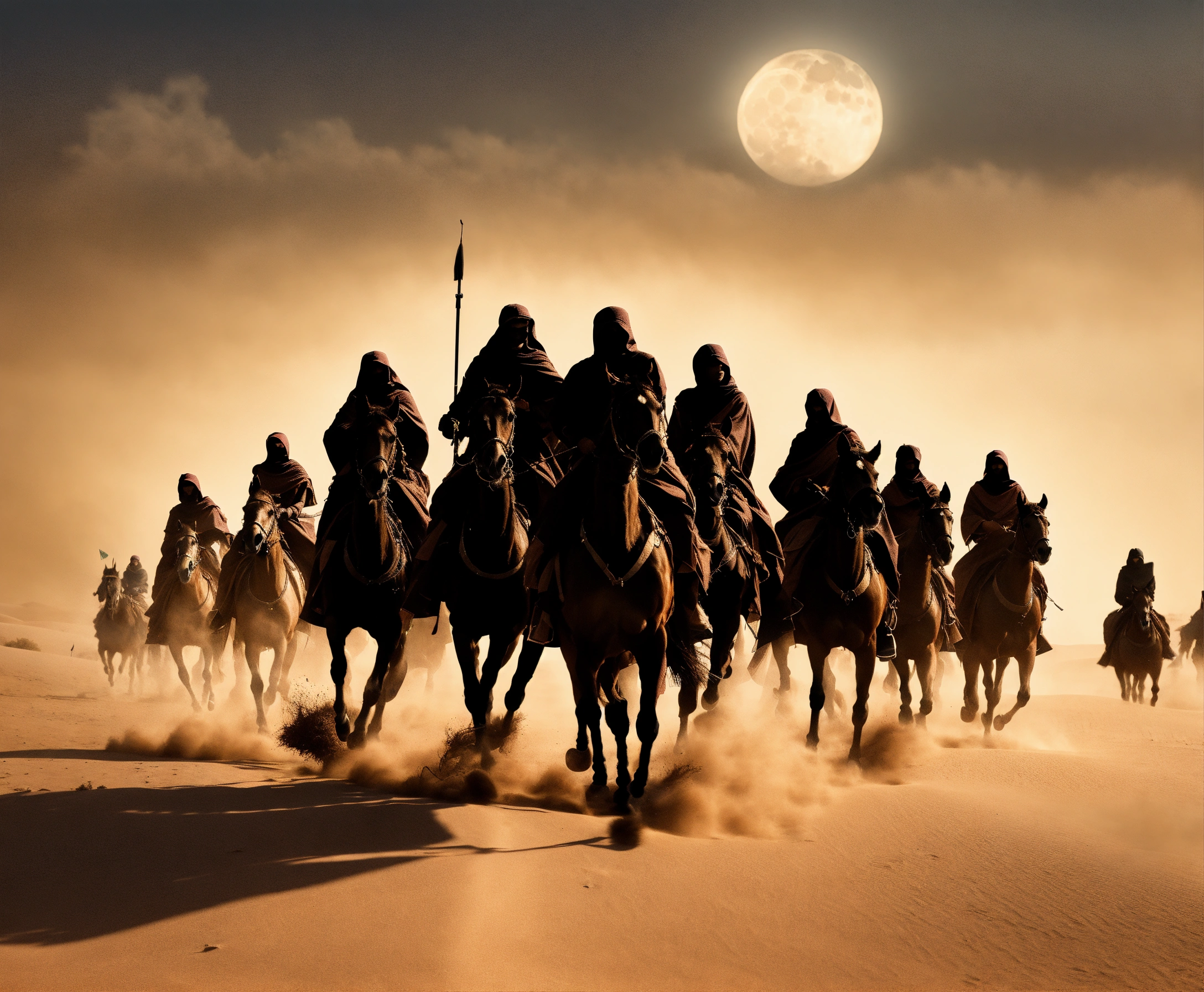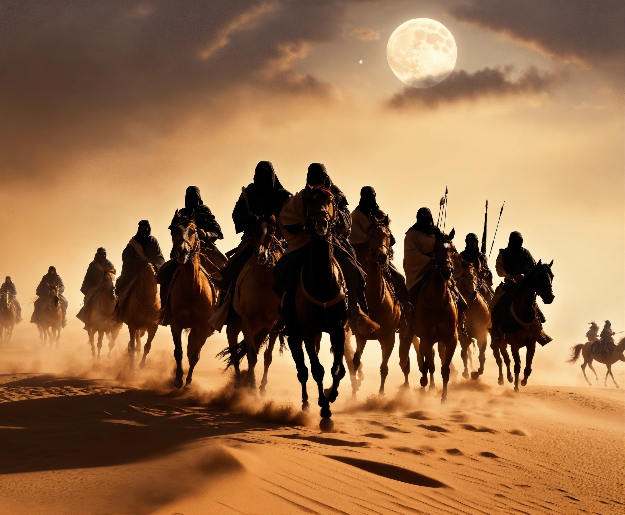 In the stillness of a dark and moonless night, the black silhouettes of a group of marauding robed arab warriors, mounted on running horses can be seen fleeing across the dusty desert dunes, realistic, digital art, digital painting, intricately detailed, intense, foreboding, unreal engine