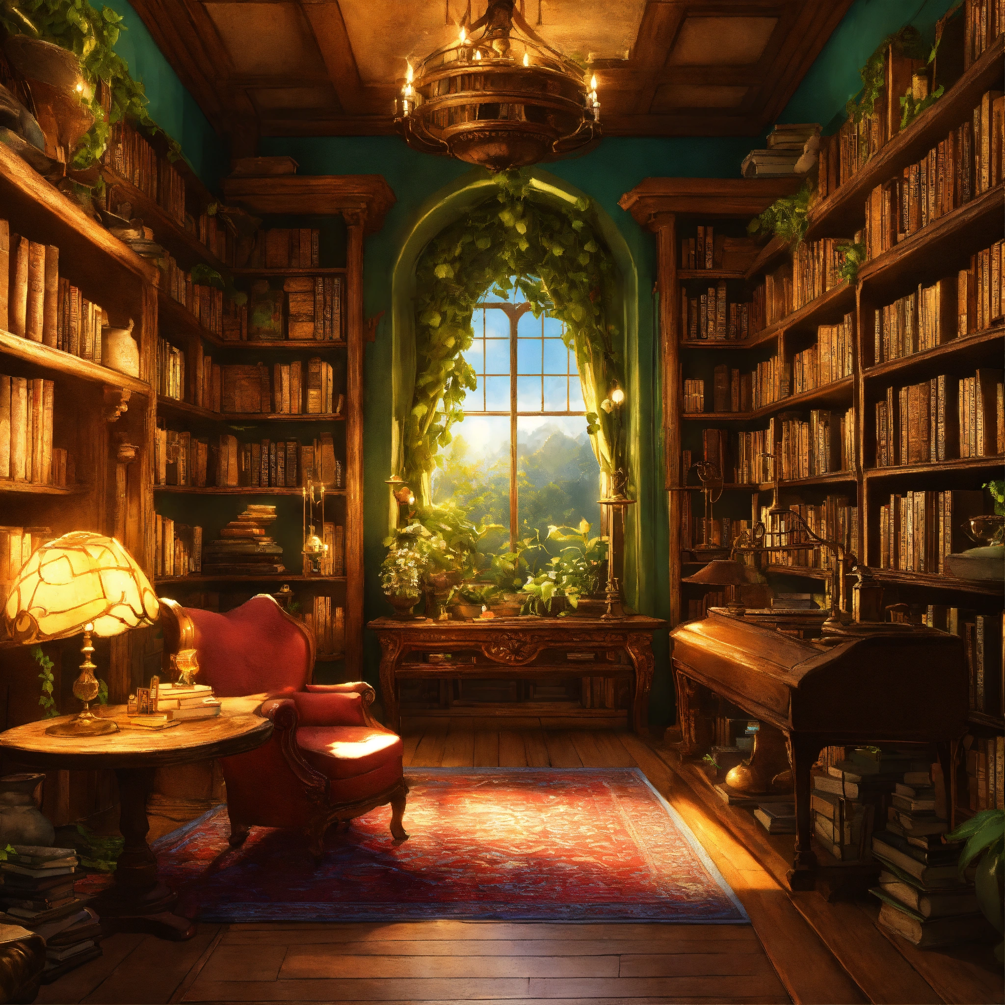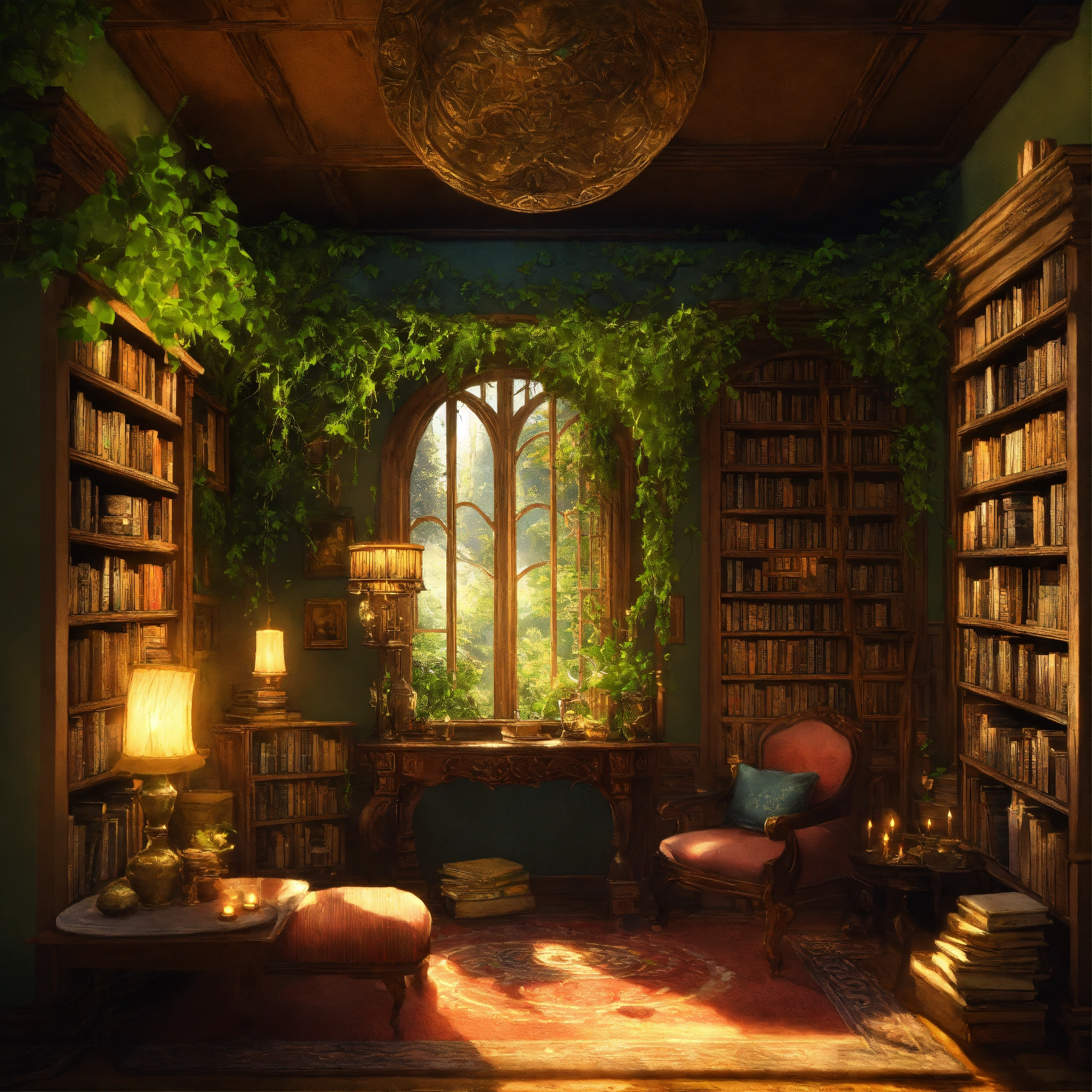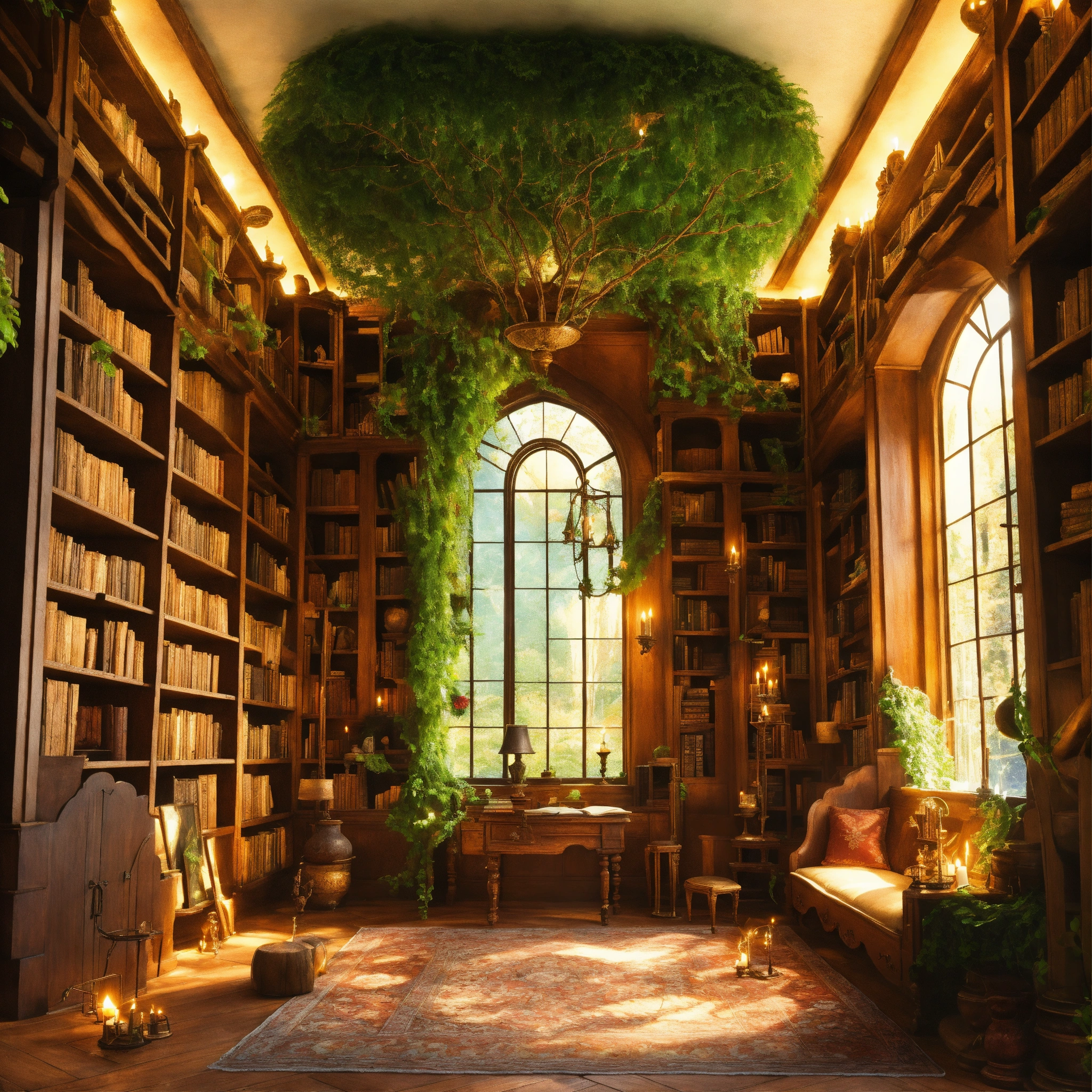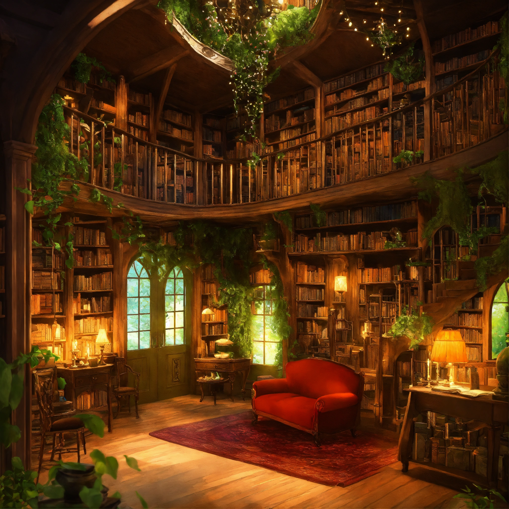 Generate descriptions and full-page layouts for various fantasy furnished rooms in a magical house. each room should be unique and imaginative, with vivid details and enchanting elements. consider the following rooms the enchanted library describe a library that seems to stretch on forever, filled with ancient books, floating candles, and talking paintings. the shelves are made of living vines, and the books whisper secrets to those who listen.