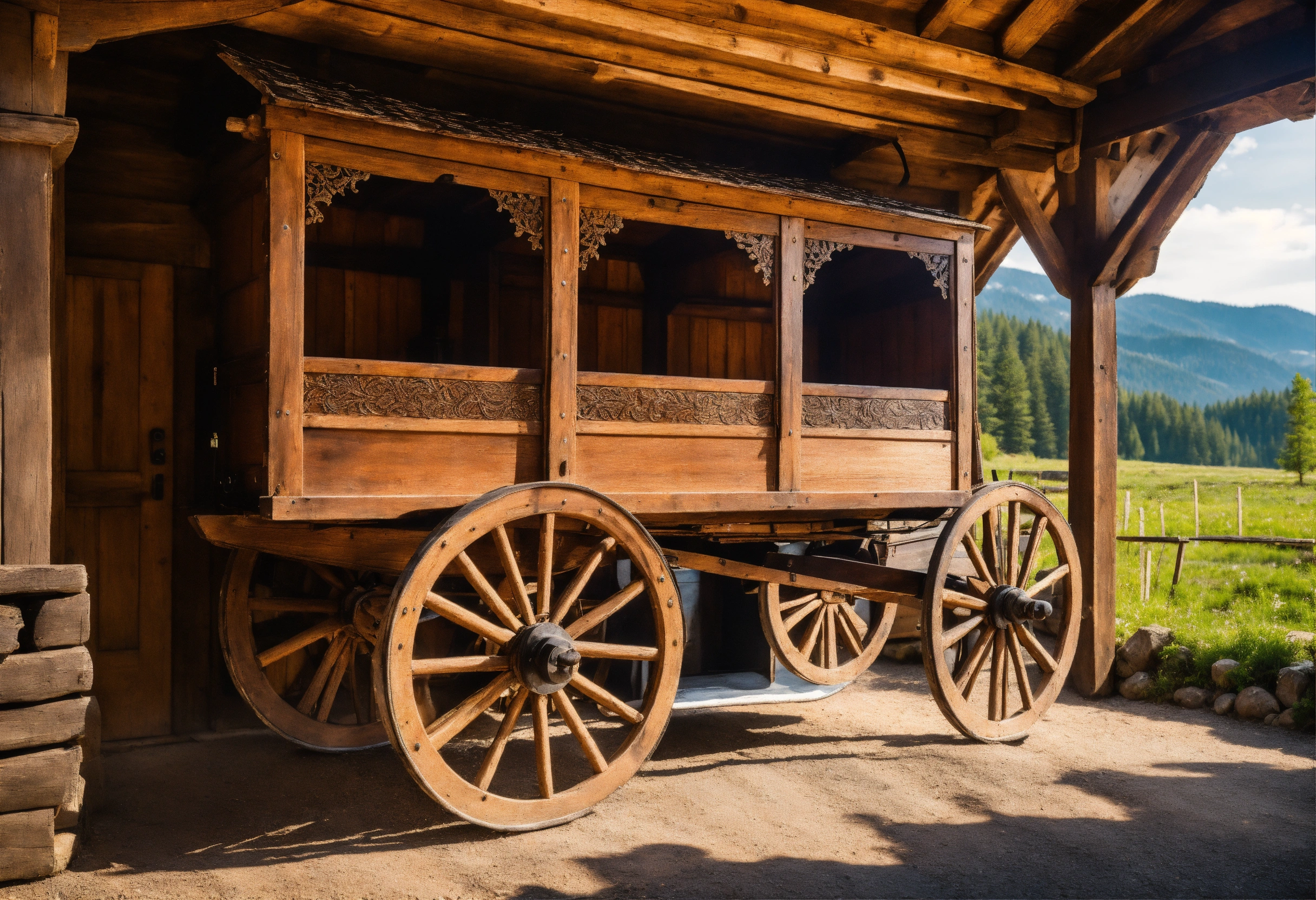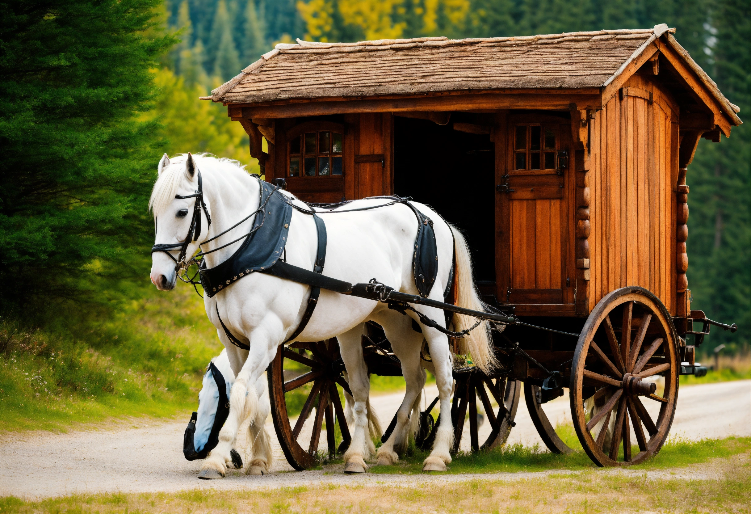 Medieval magnificent large box wagon of the traveling people made of plain dark wood with ornaments, a carriage to sit in front, two axles, the entrance door at the back can be reached via a small staircase, two windows closed with wooden shutters on the right and left of the wagon, solid roof, pulled by two large white draft horses next to each other, very detailled, photography, 8k, gravel road, coniferous forest in the background