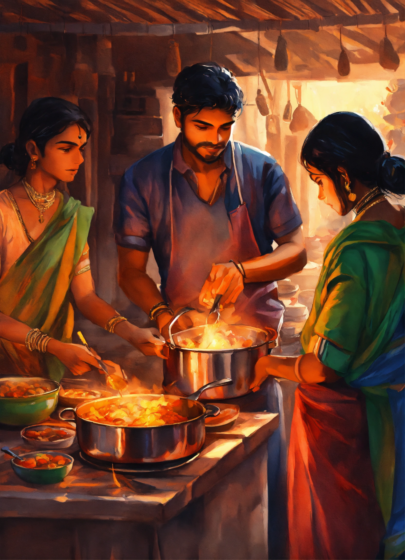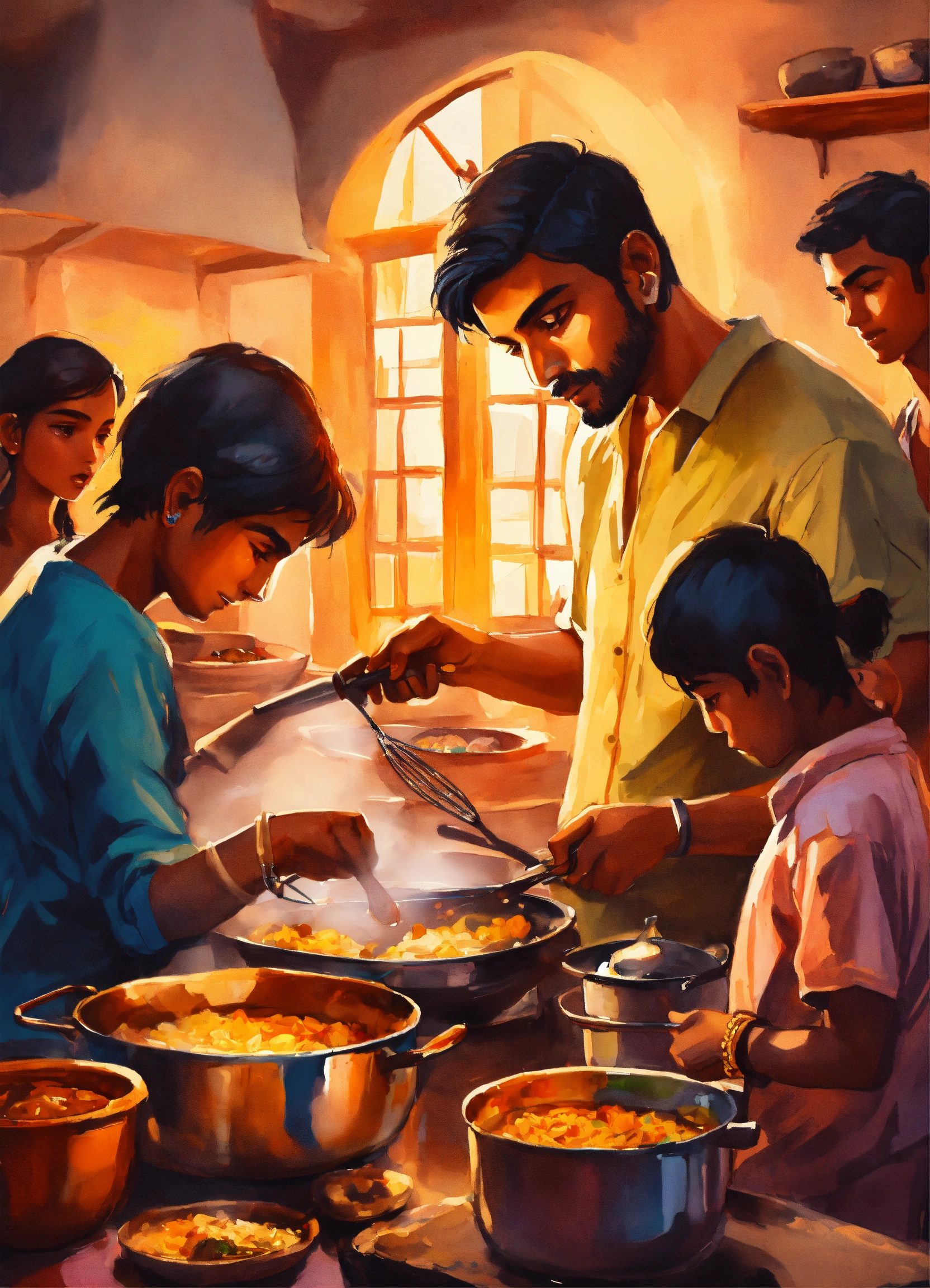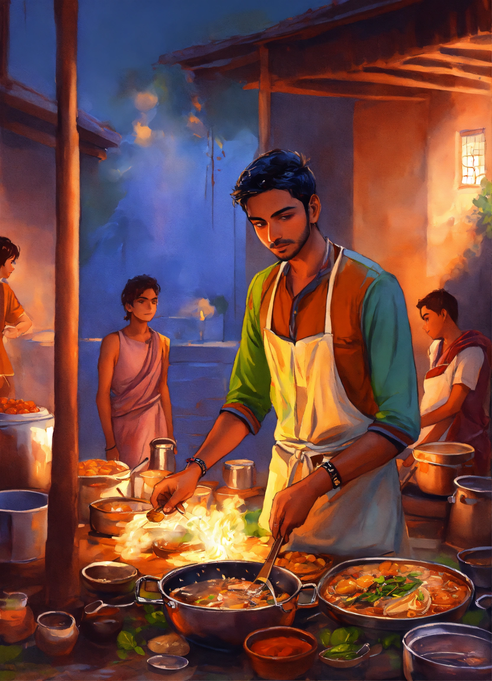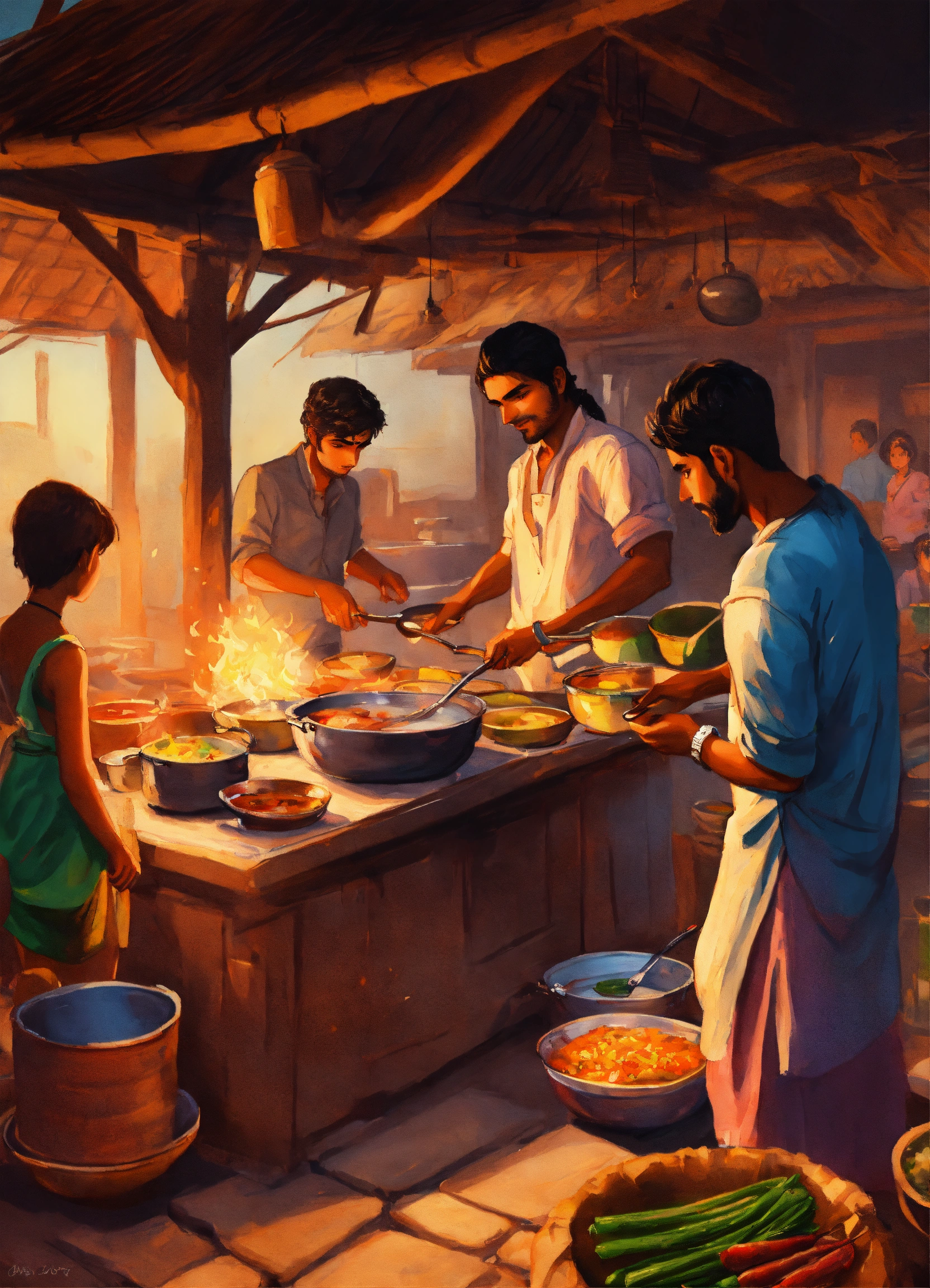 A hand drawn painting of an indian young man cooking, a group of people standing near by, kids playing, 8k, sharp, detailed, vibrant, vivid