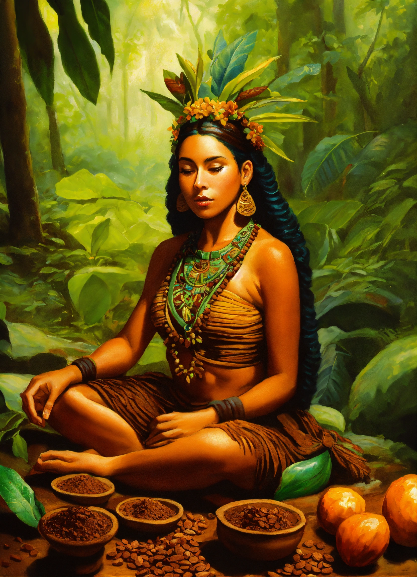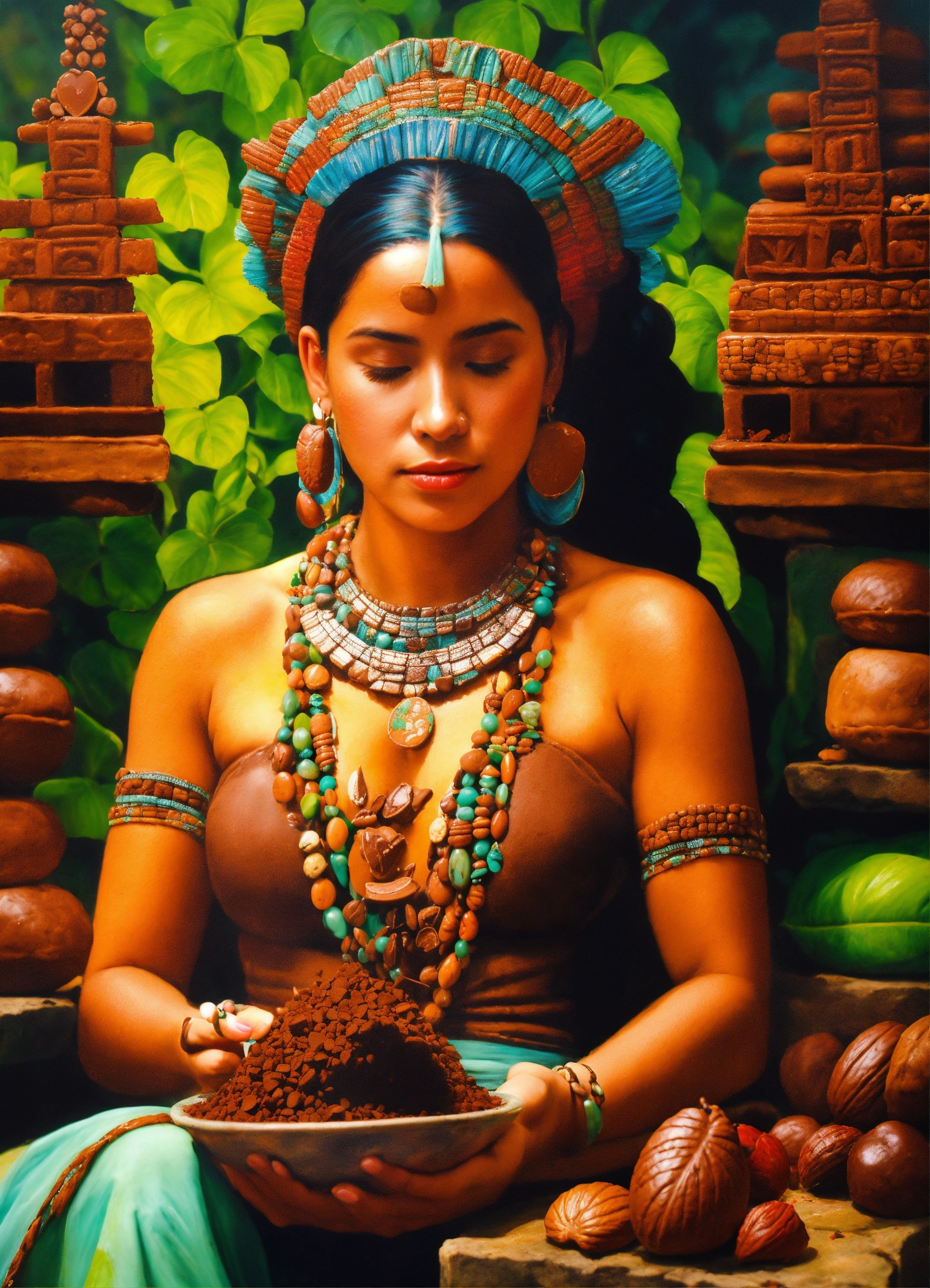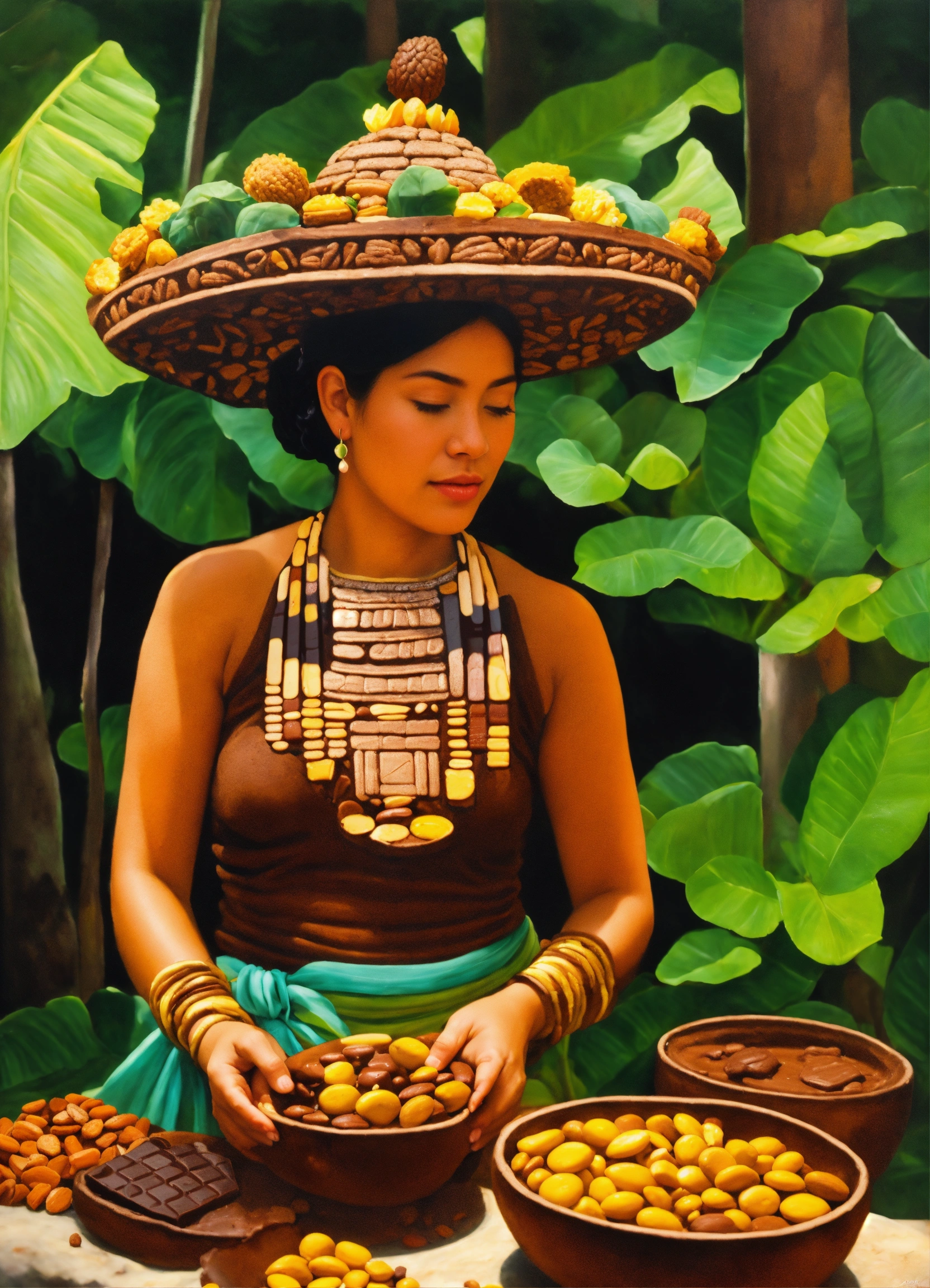 Realismo crear una pintura autentica de una mujer de la cultura maya de copan ruinas de honduras haciendo chocolate que refleje a historia, la tradición del cacao con detalles realistas y mazorcas de cacao con colores jade