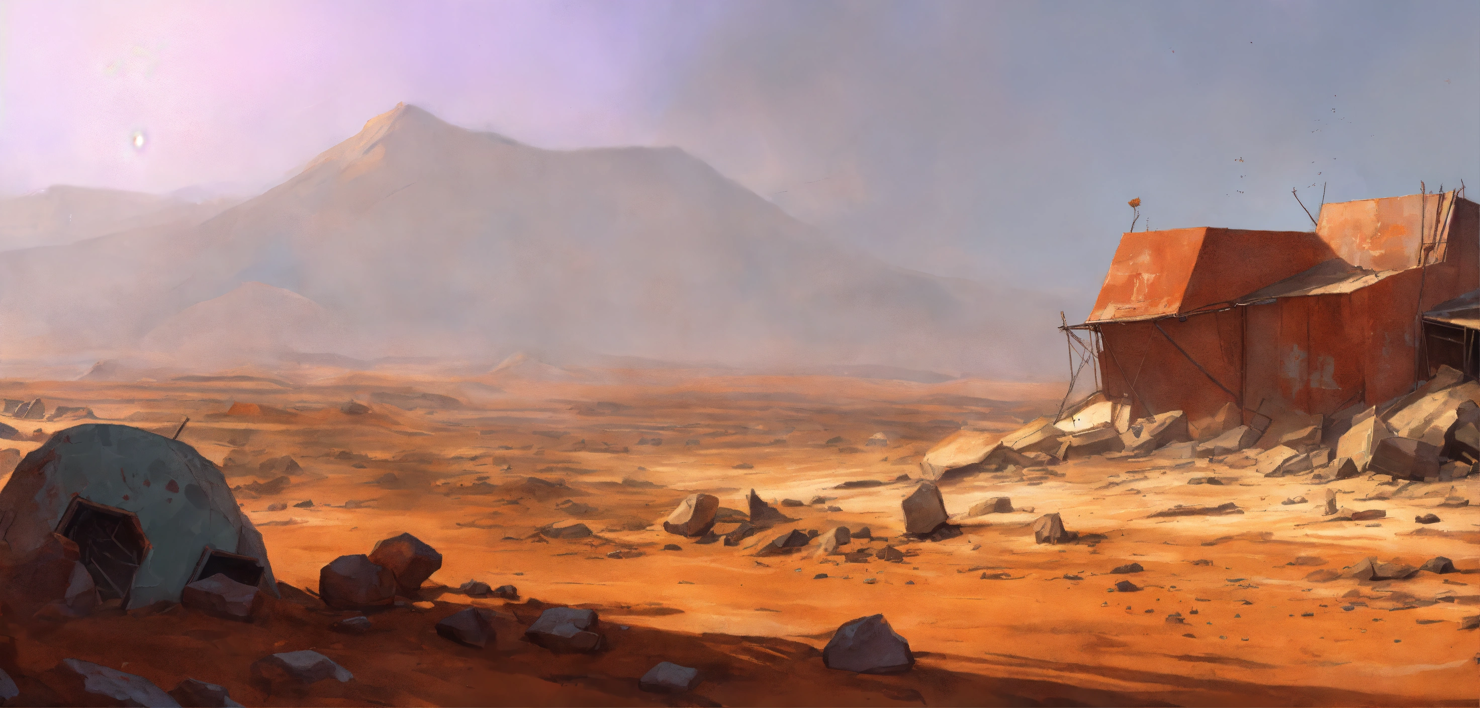 Conept art digital realistic painting, post apocalyptic, wasteland, terracotta earth, barren, rocks, concrete chunks, desert