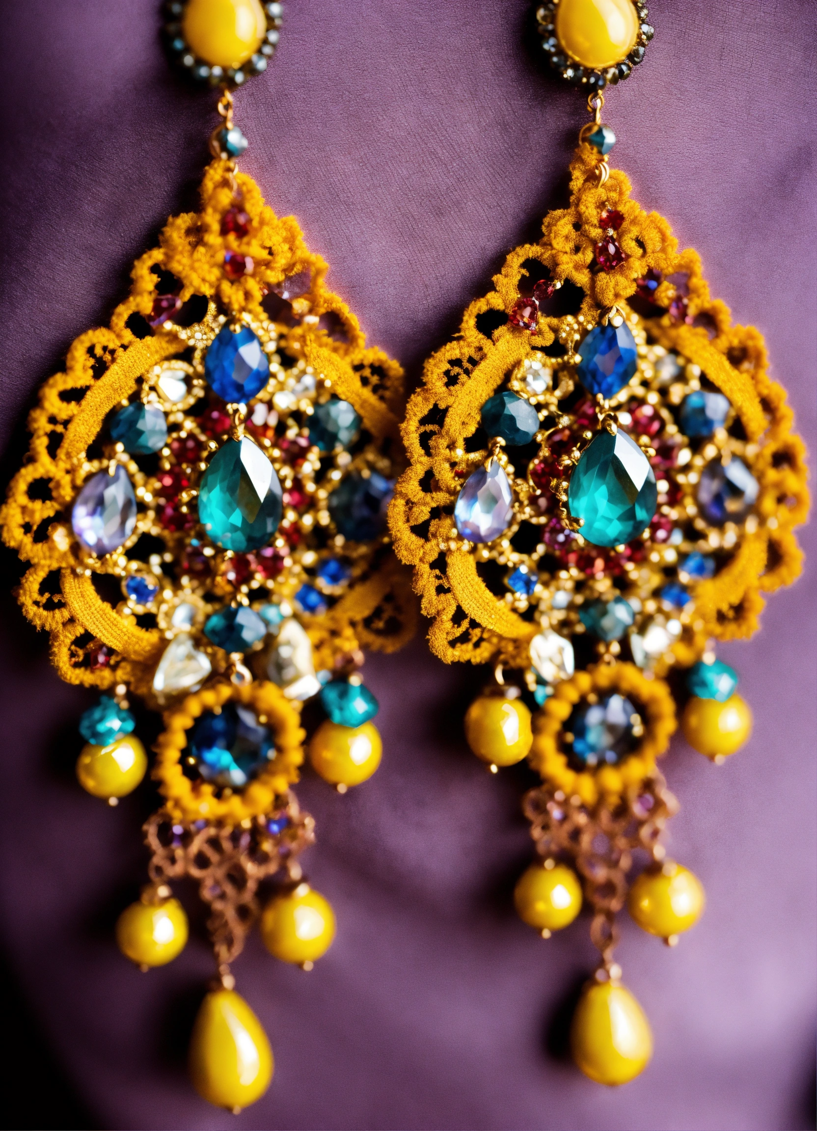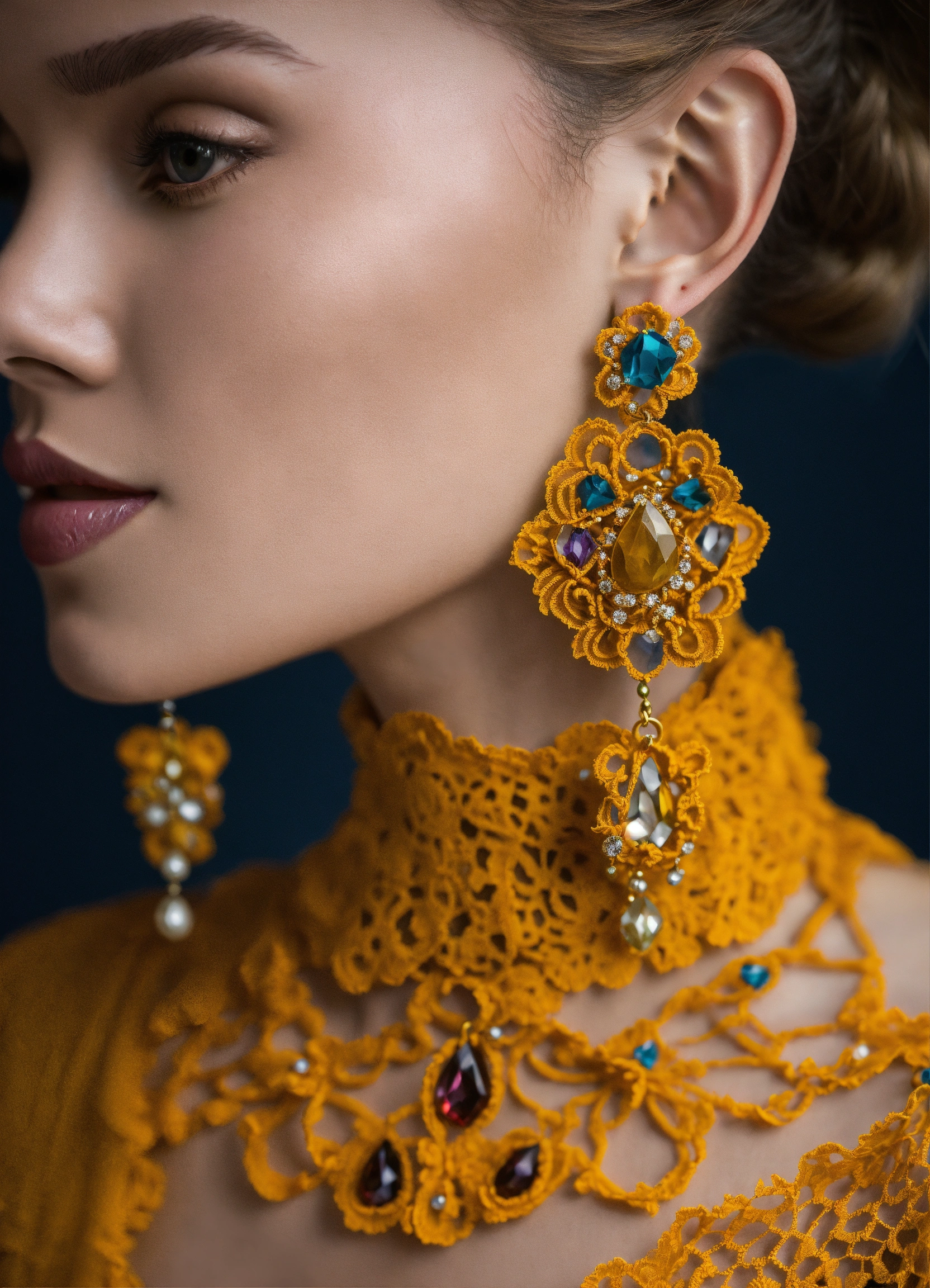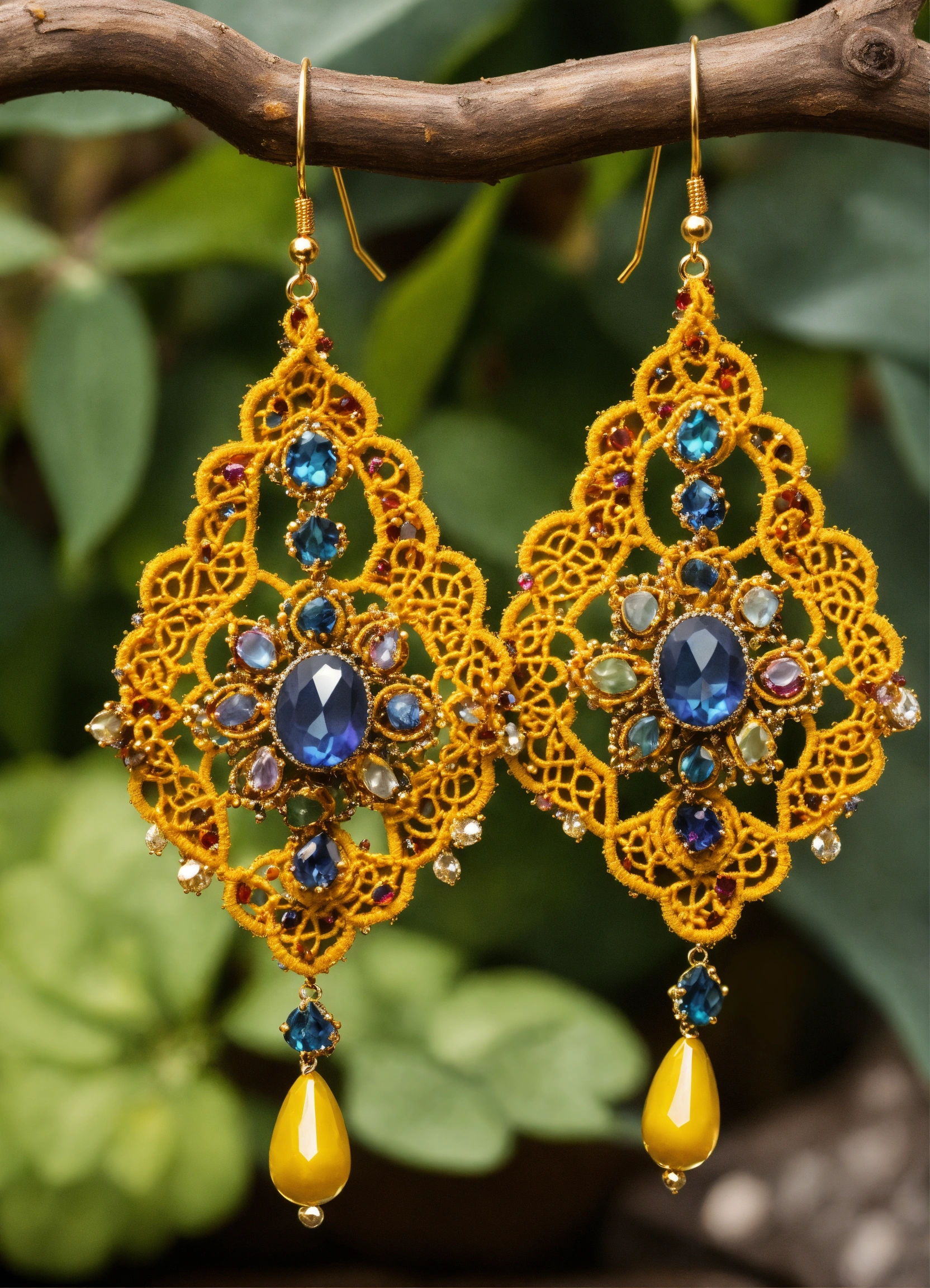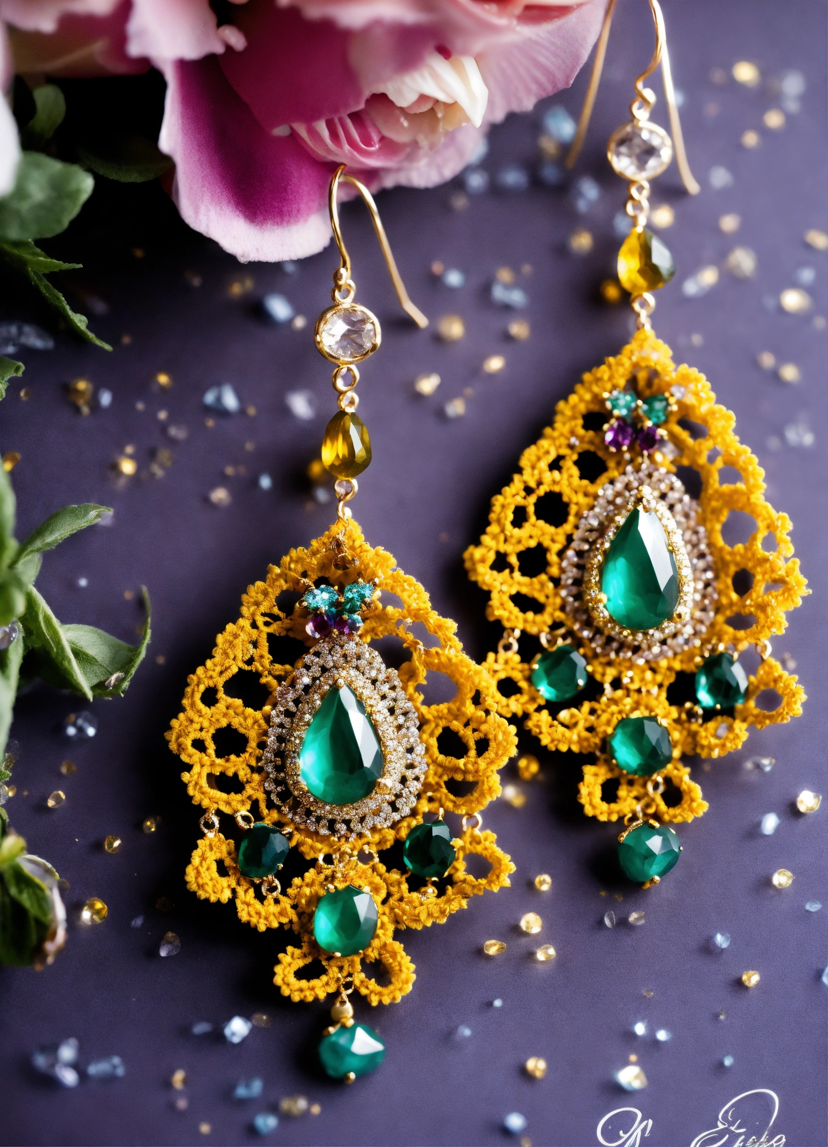 Luxurious detaled mustard color tatted lace earrings decorated with precious stones and crystals in the style of liam sharp, dutch tradition, webcam, gail simone, mark seliger, 8k, high resolution