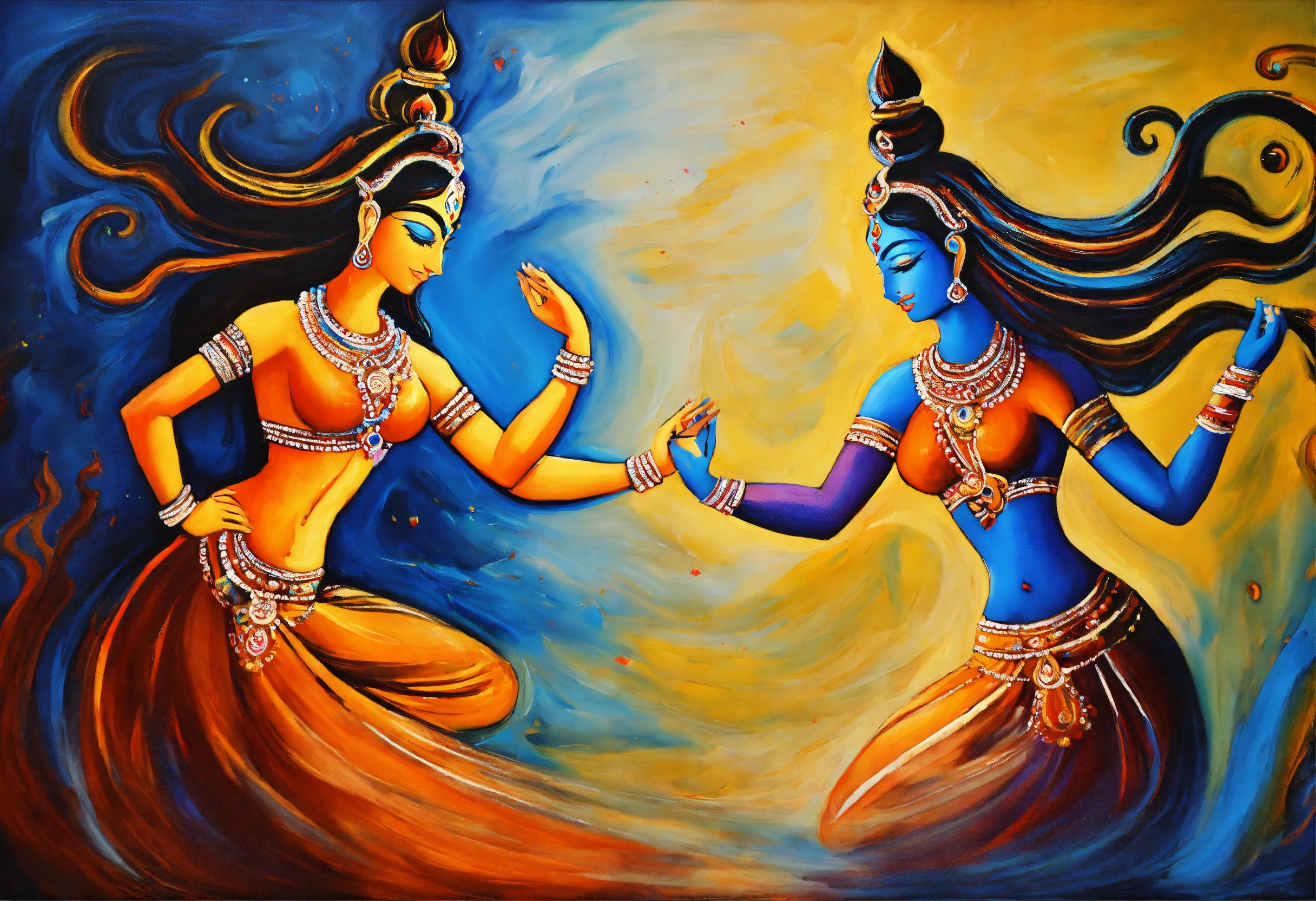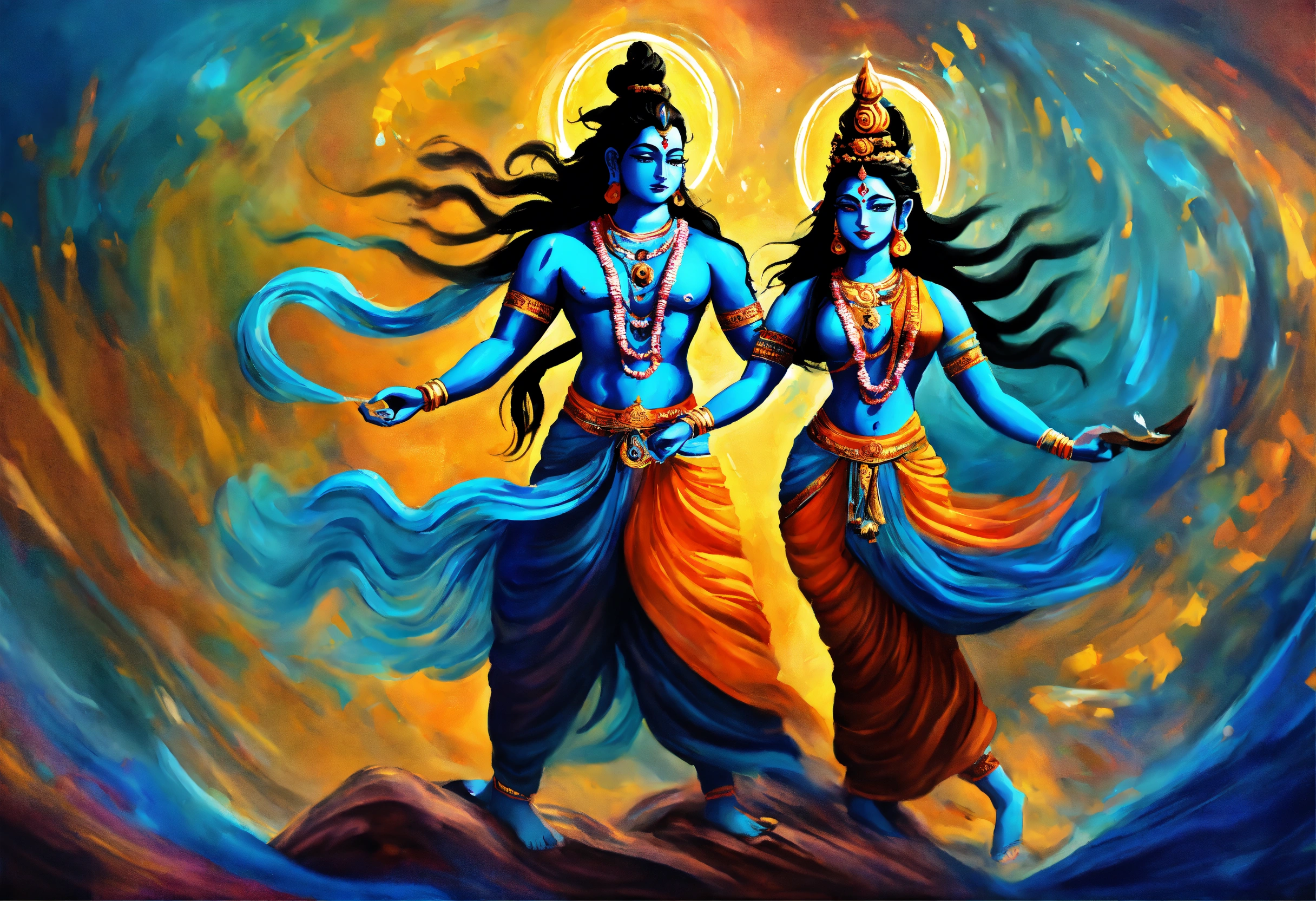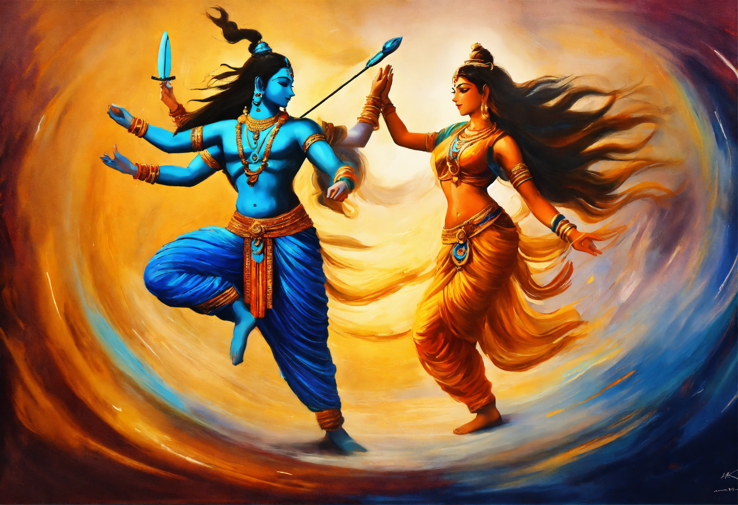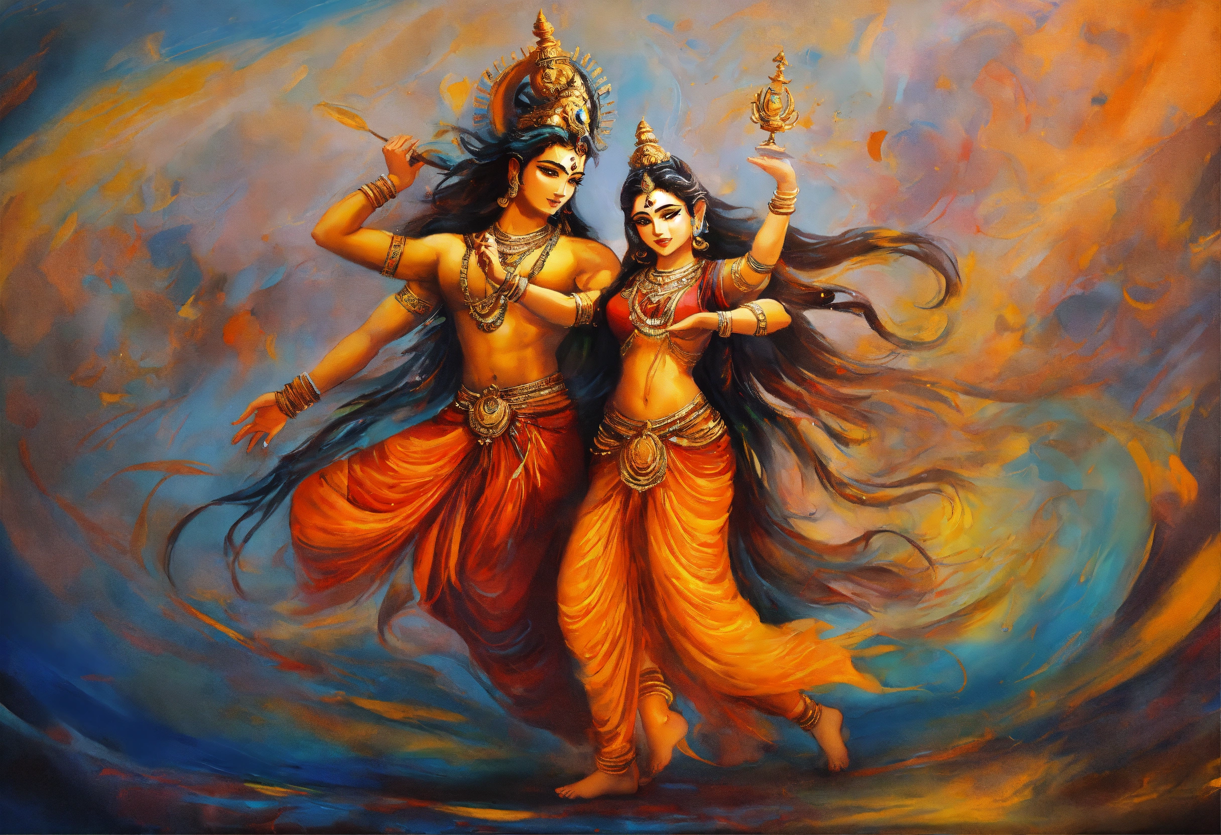 A dynamic abstract painting depicting the dancing hindu deities shiva and parvati