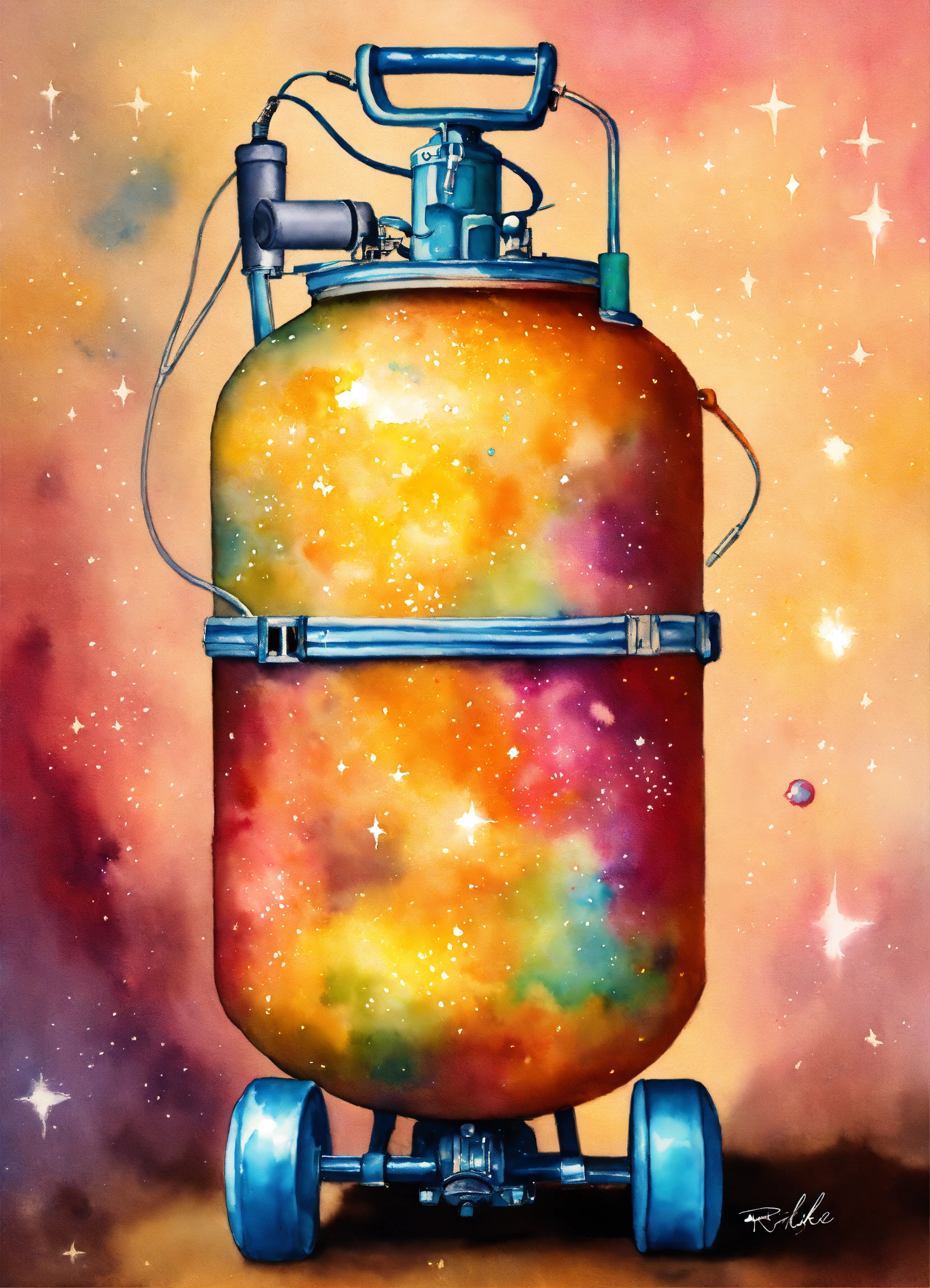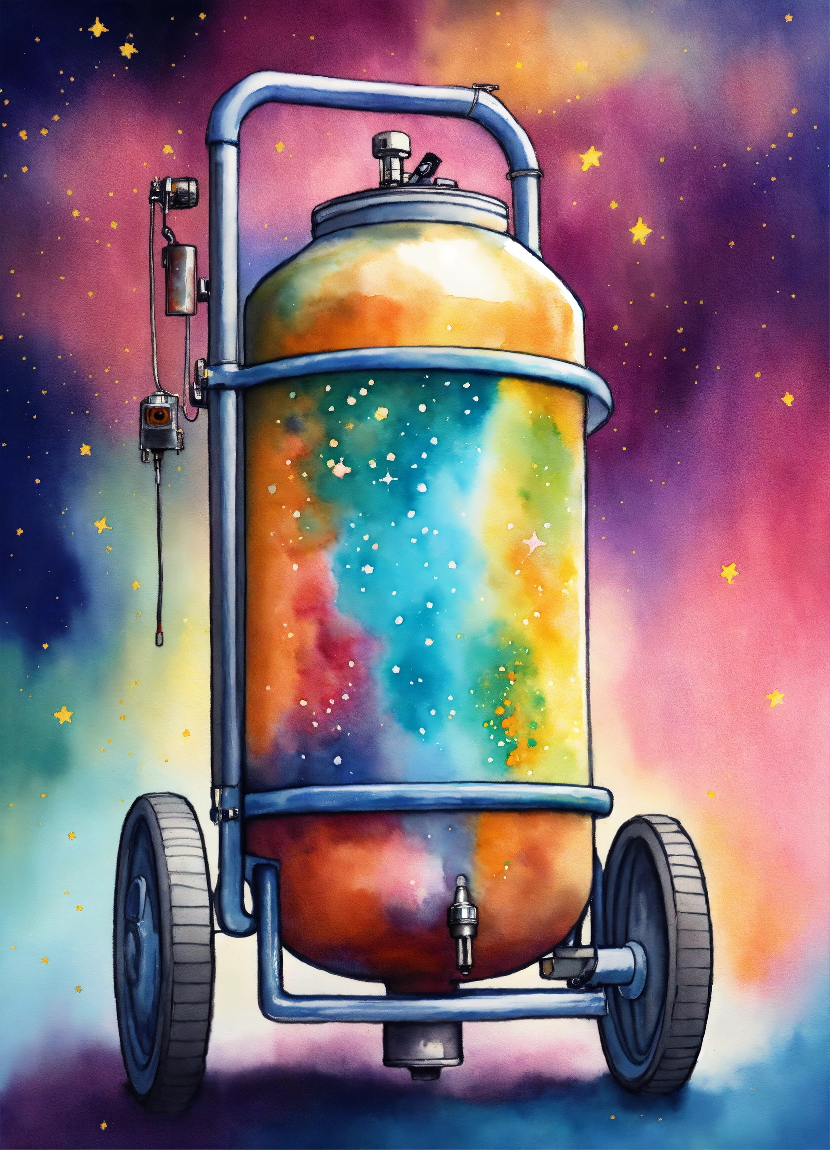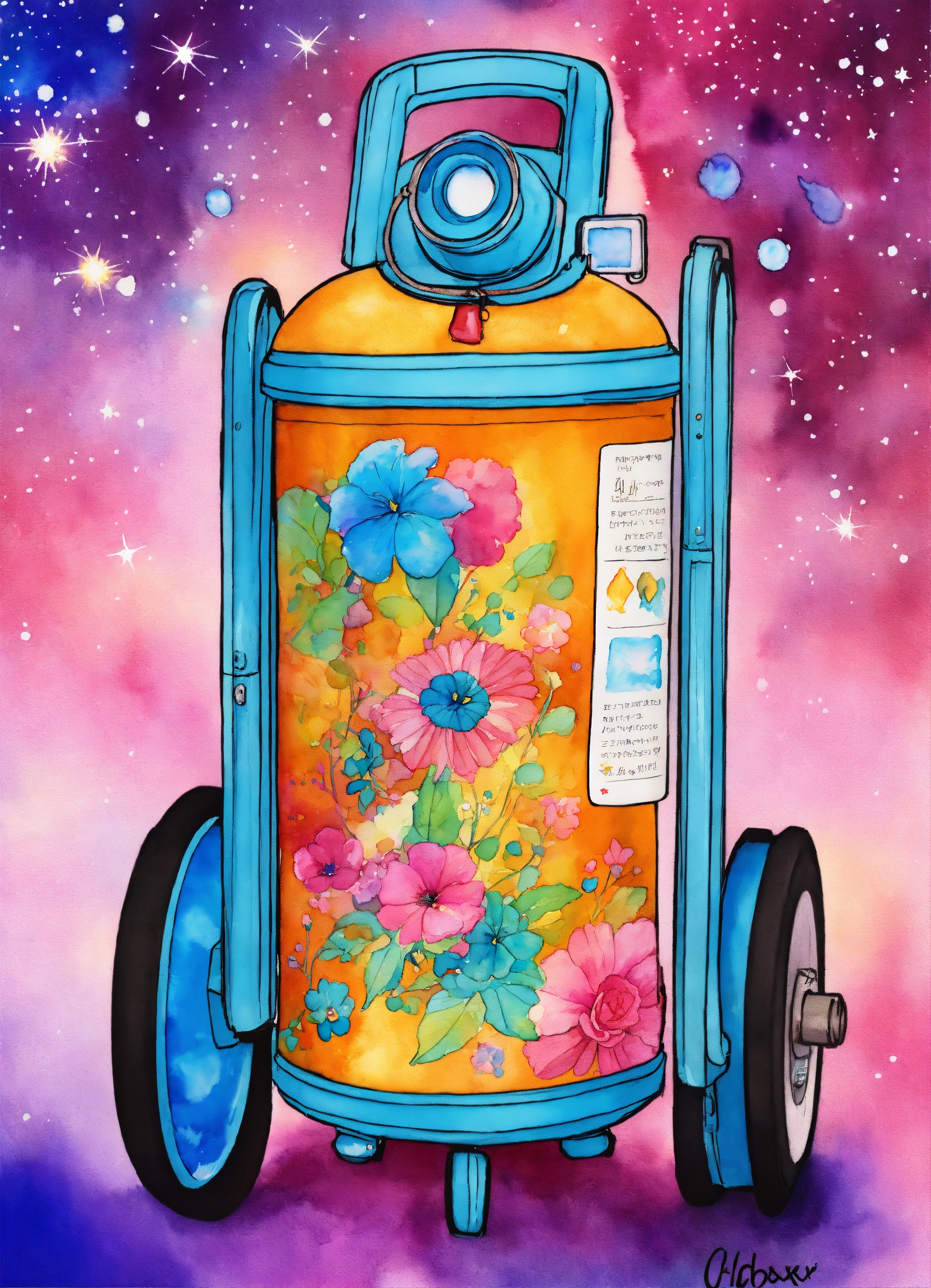 Concept art of oxygen tank and nasogastric tubenose tube, portable, rolling wheels, small, blank background, handprinted painted artsy design, portable oxygen concentrators, sparkle galaxy painted on the tank, medical, realistic, hyper realistic, portable, cute, artsy, decorated, thin tank, colorful girly handprinted designs on the tank, thin small portable tank, personalized decorated painted medical portable oxygen tank, respiratory, thin tank, watercolor paint, whimsical paint, super thin small narrow tank, watercolor abstract paint, clear thin tube attached, watercolor galaxy, boho paint, small wheels, colorful painted sequins glitter watercolor, narrow tank, very narrow thin oxygen tank, glitter, realistic, colorful, feminine blank background, small wheels, glitter paint, glitter