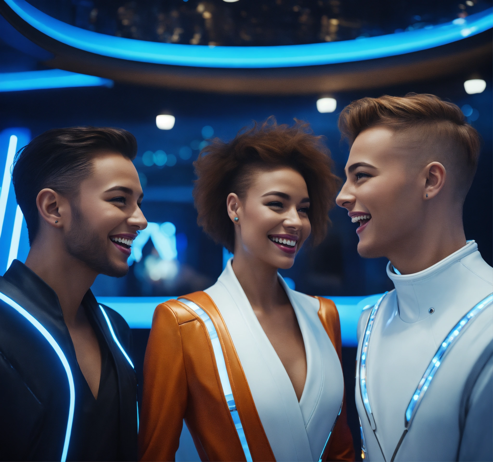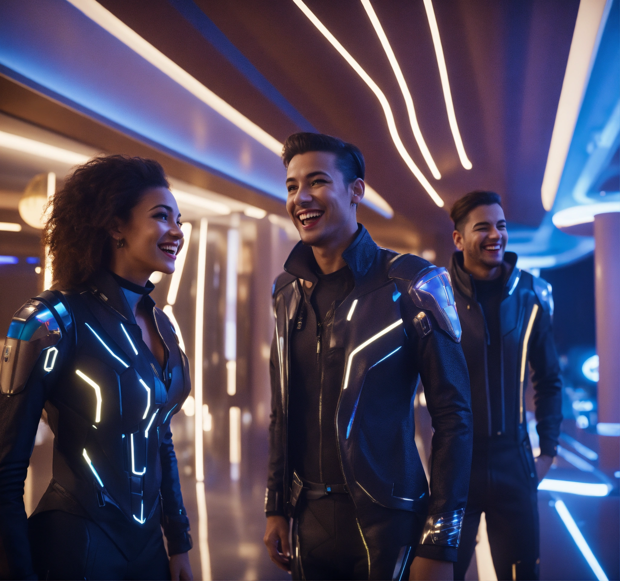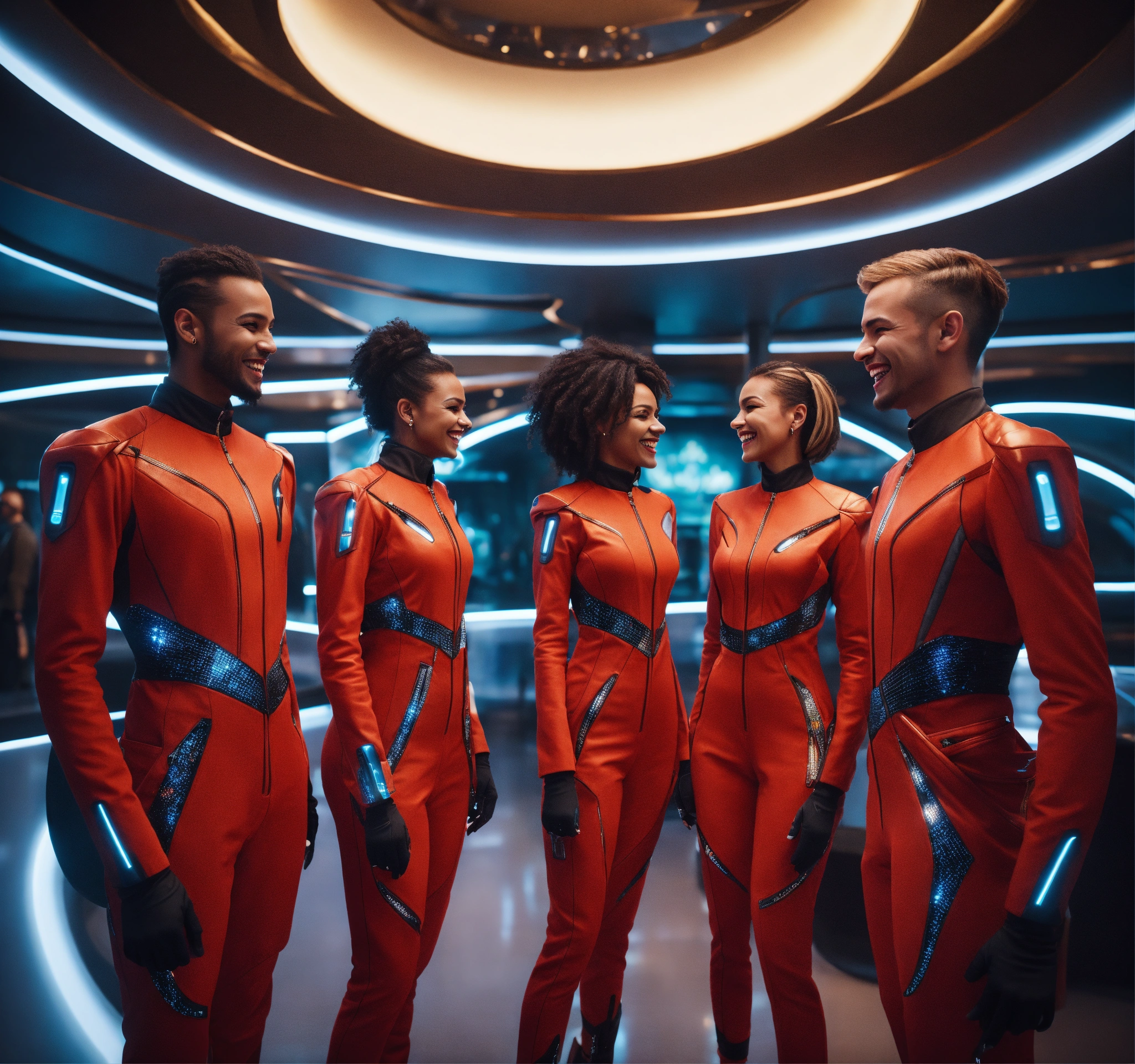 Close up of 5 beautiful male and female travelers wearing futuristic clothes that are laughing and having fun in a luxurious space port hotel reception area, realistic, futuristic, sci-fi, 8k, unreal engine, pixar, disney, zaha hadid
