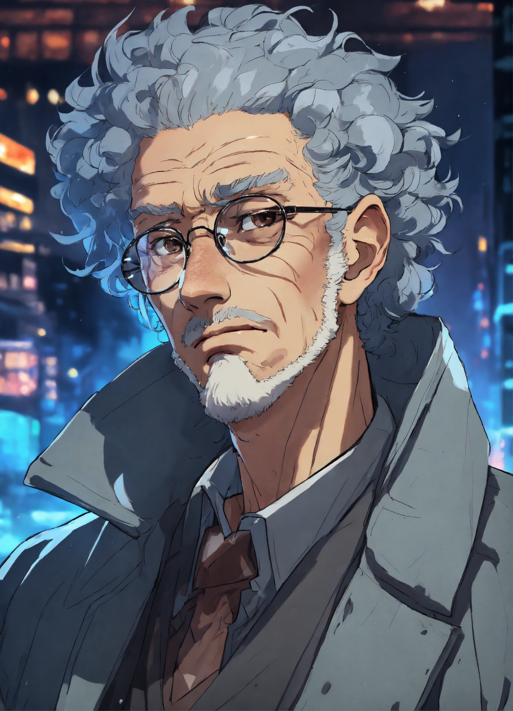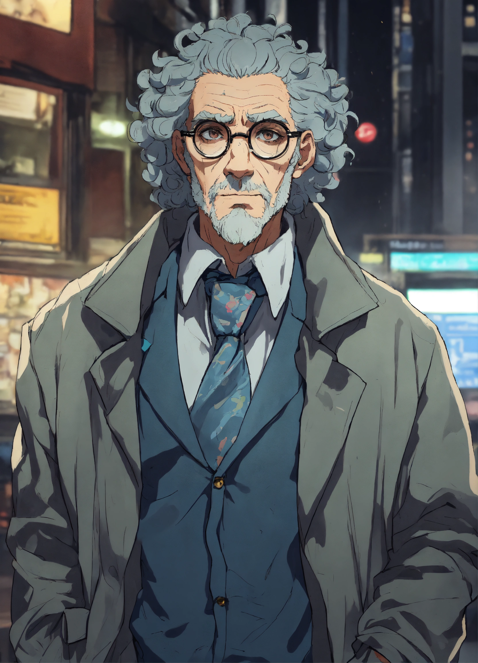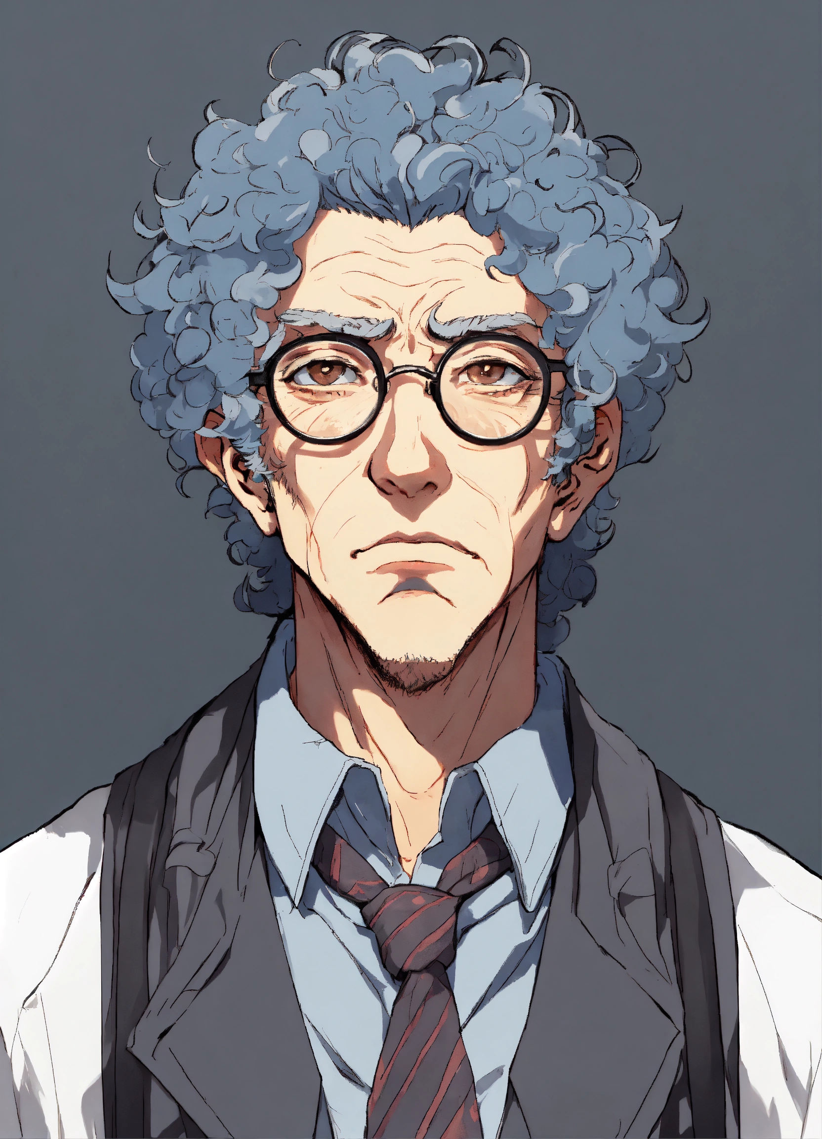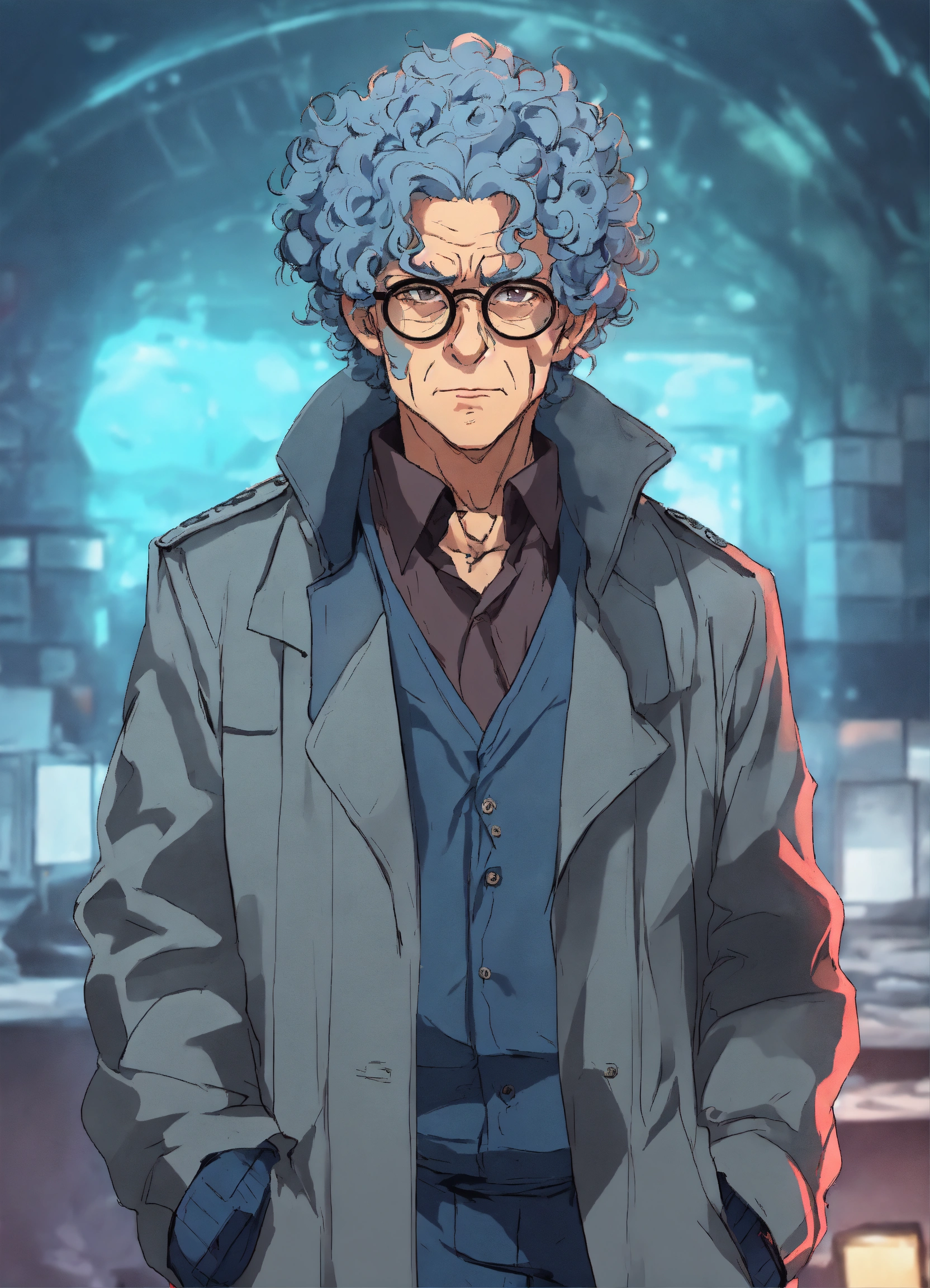Anime style, an ugly shrewd older male criminal scientist with curly blue hair and spectacles in a grey duster, mean dirty face