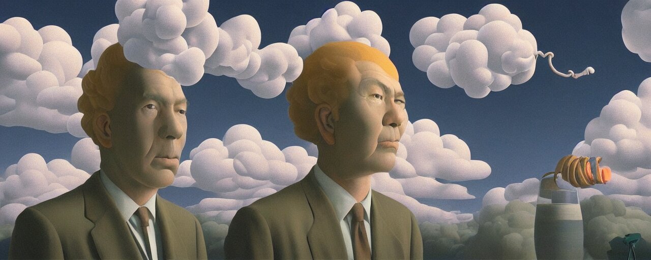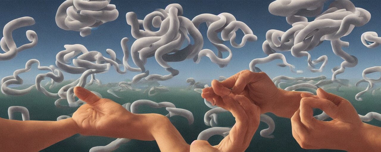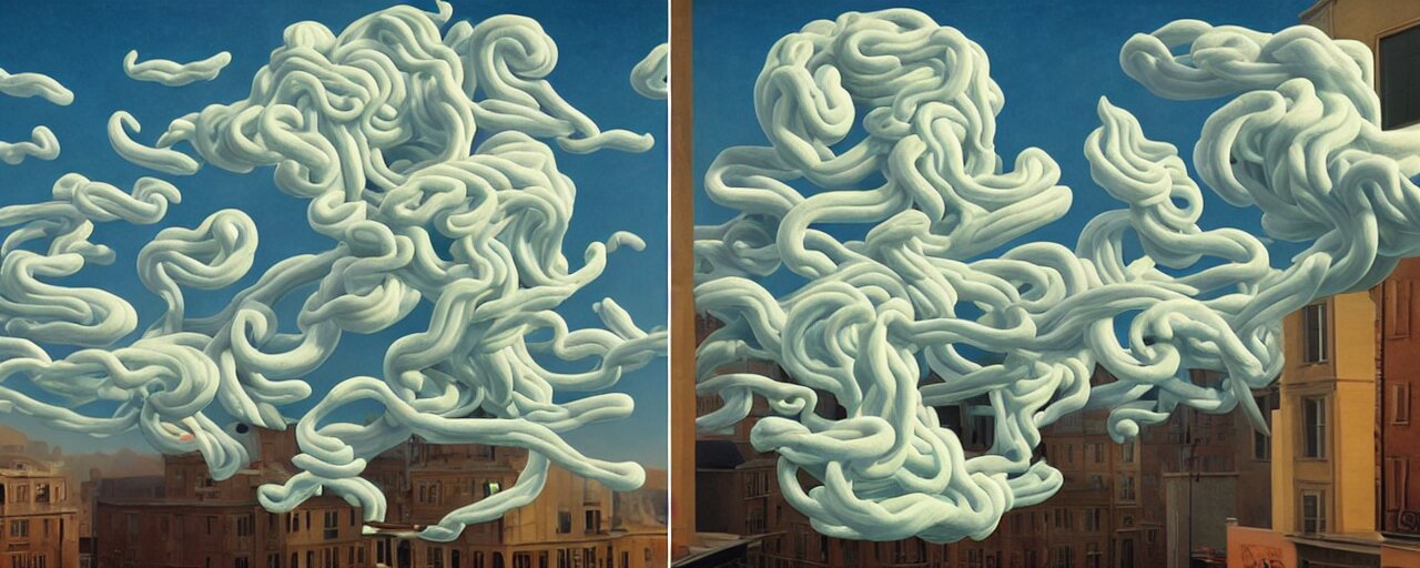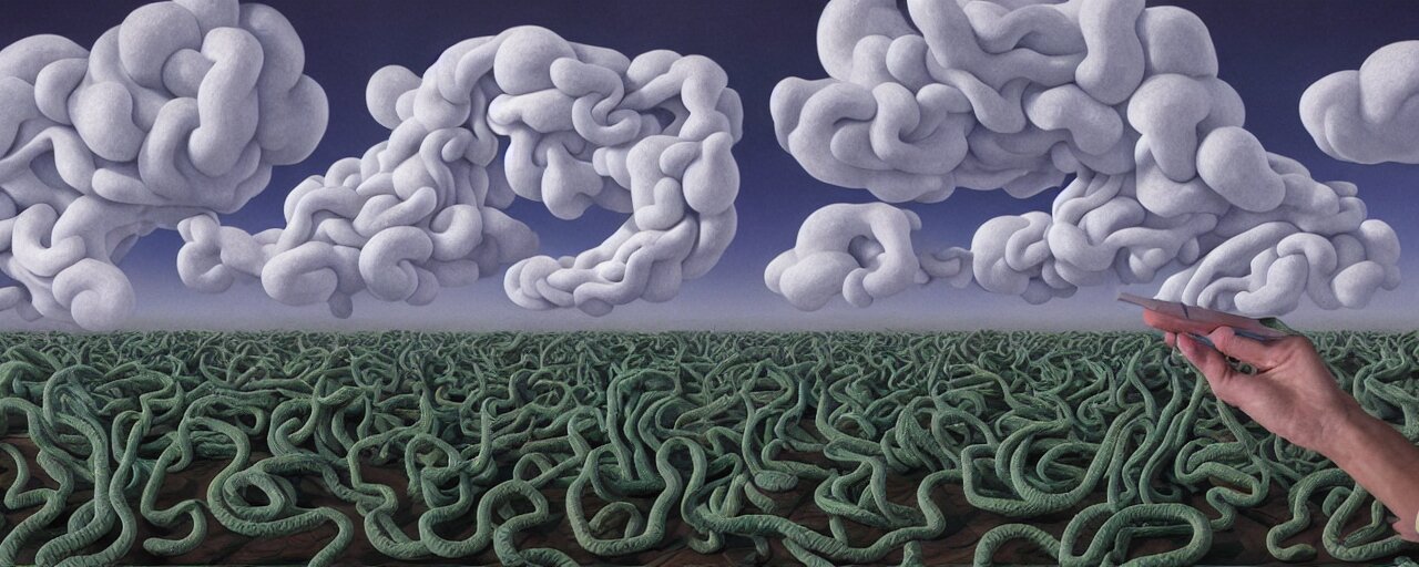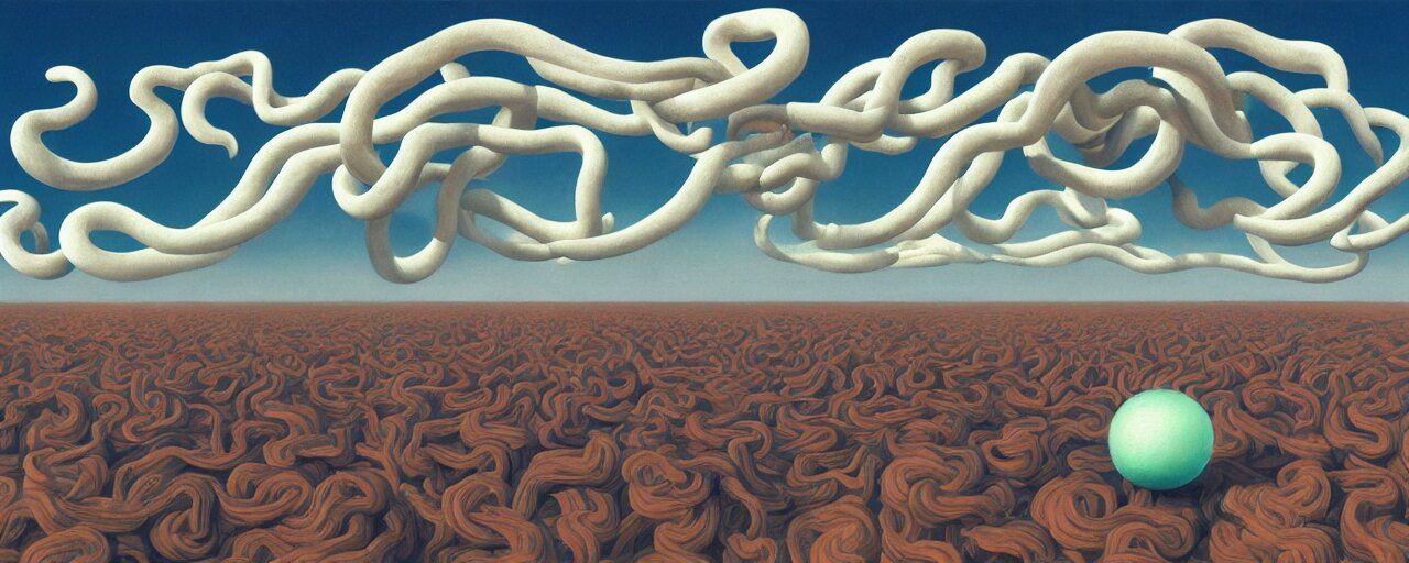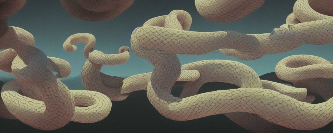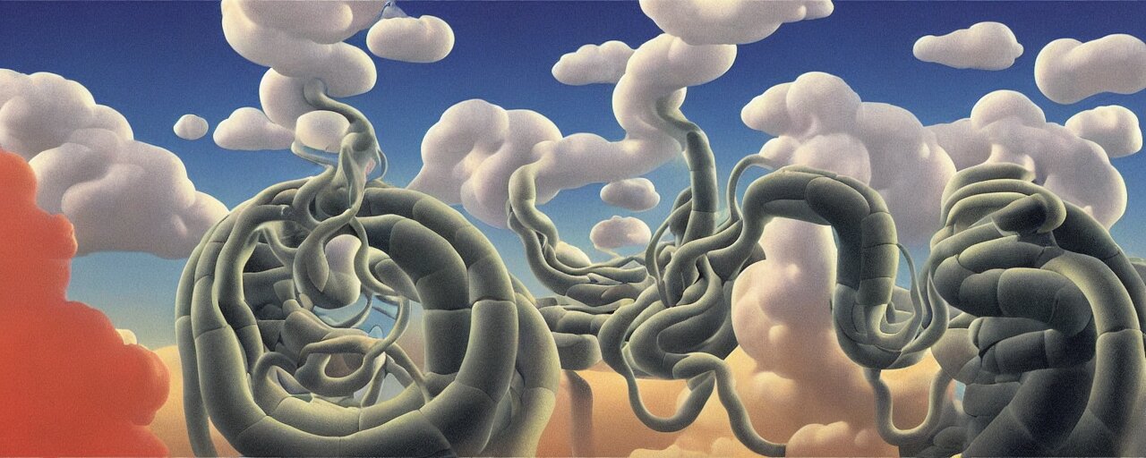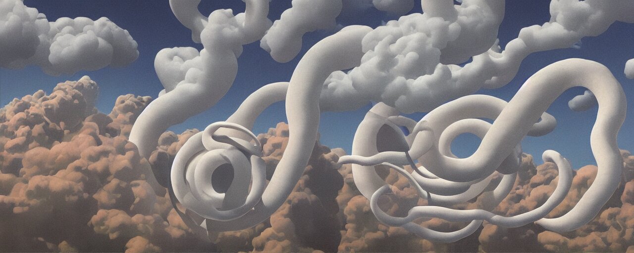 A swirling cloud of snake medicine. painting by rené magritte, 3d rendering by beeple, sketch by r. crumb