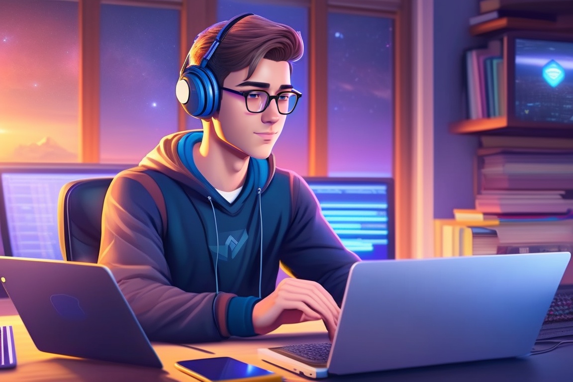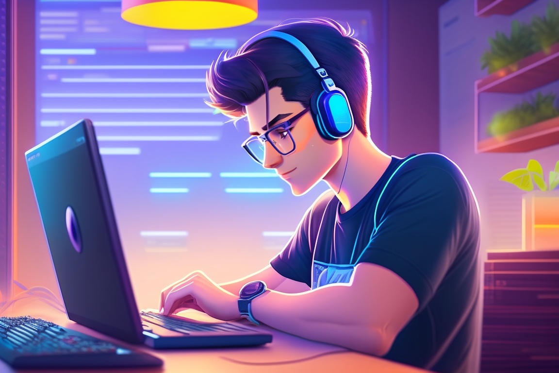 Young man, programmer, nerd, listening to music with headphones, working on the computer in his room that is a programming studio, anime layout, 8k, ultrarealistic