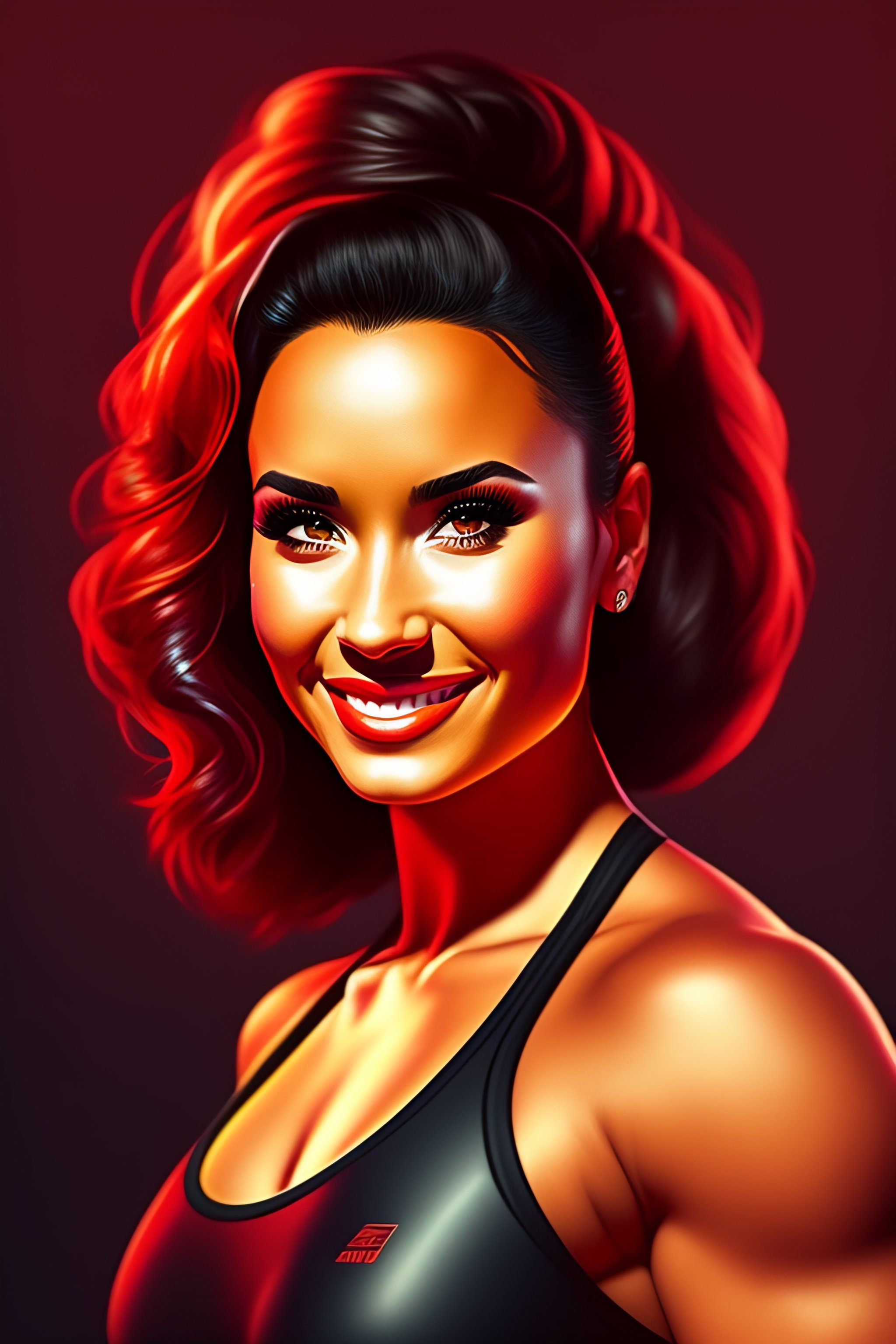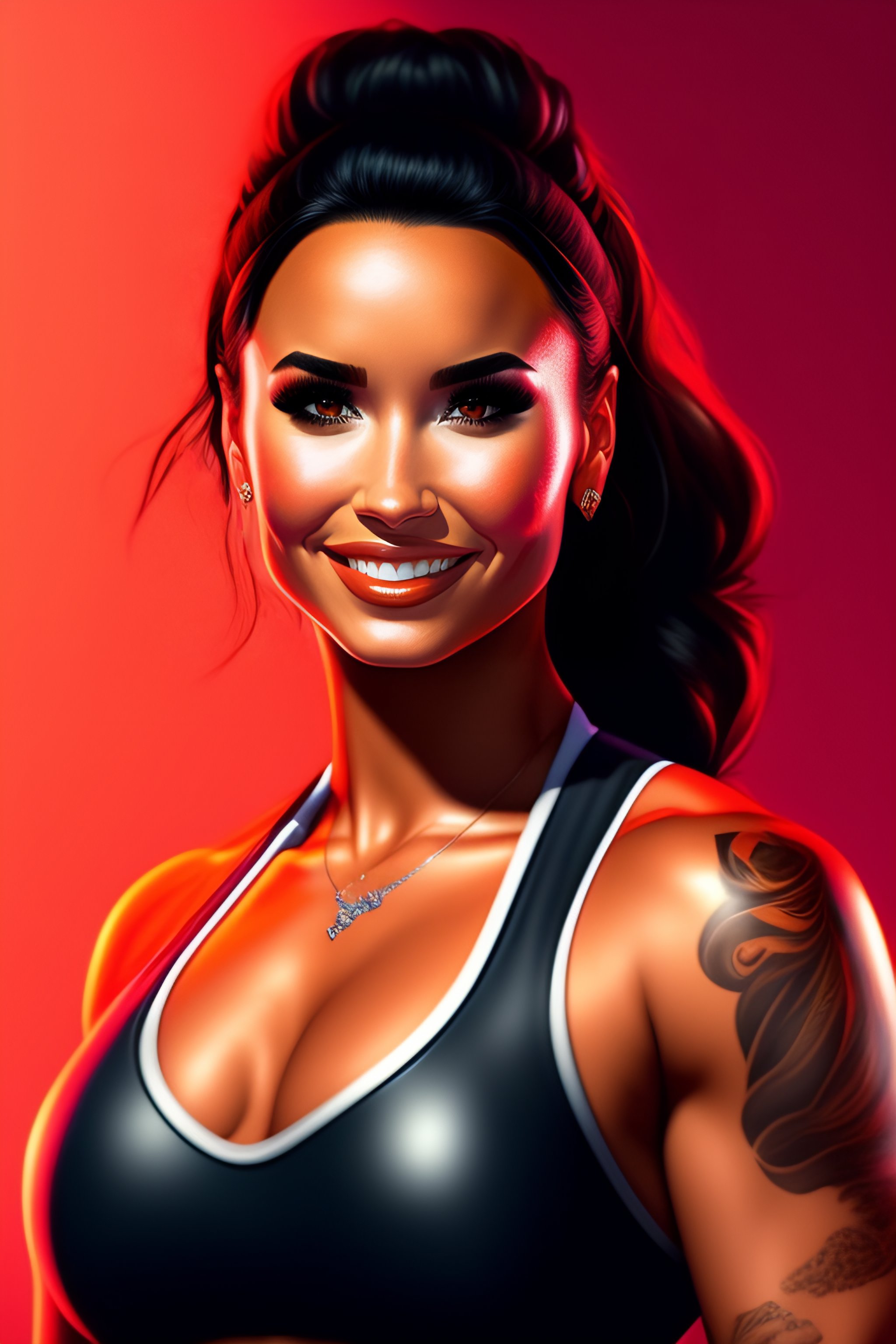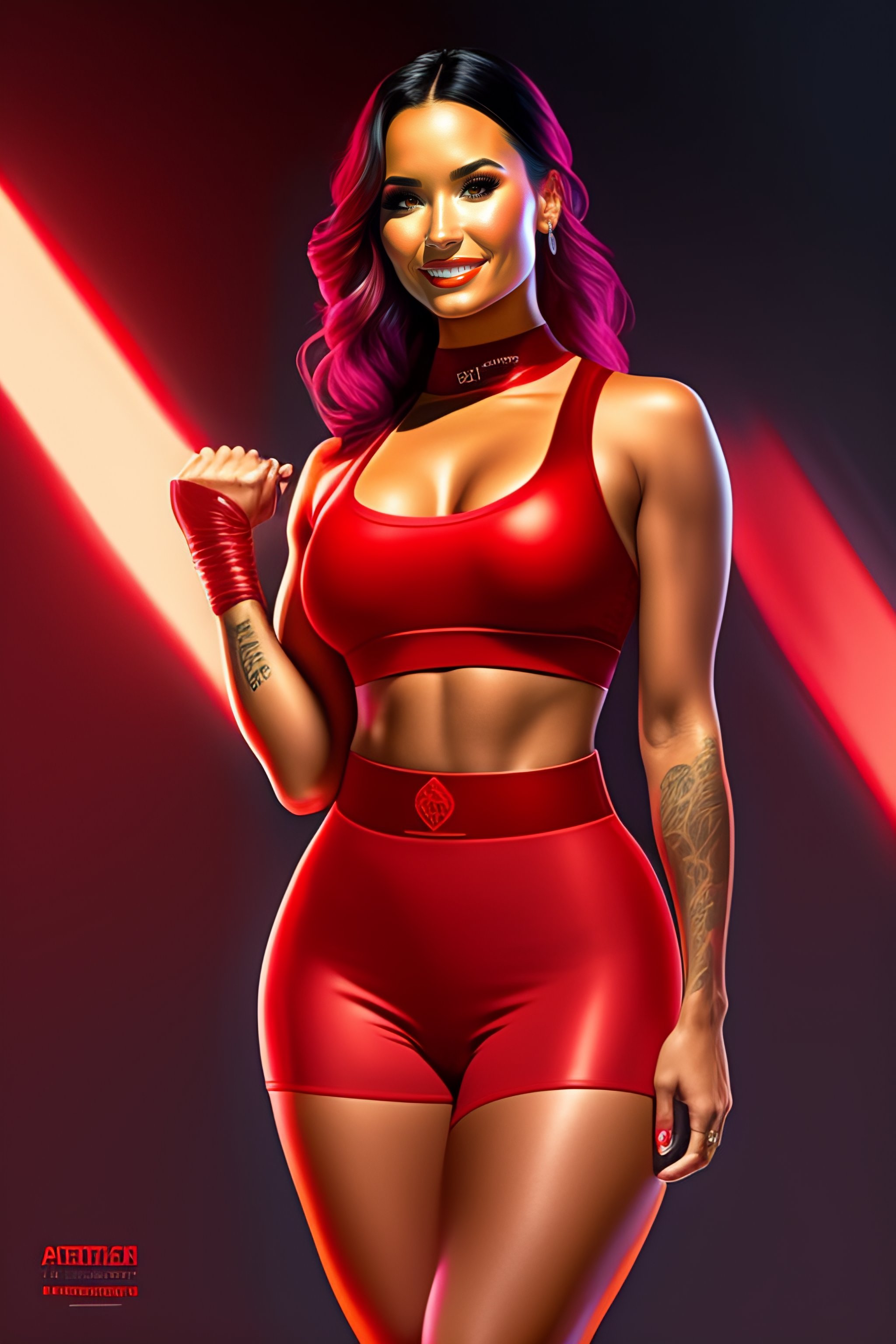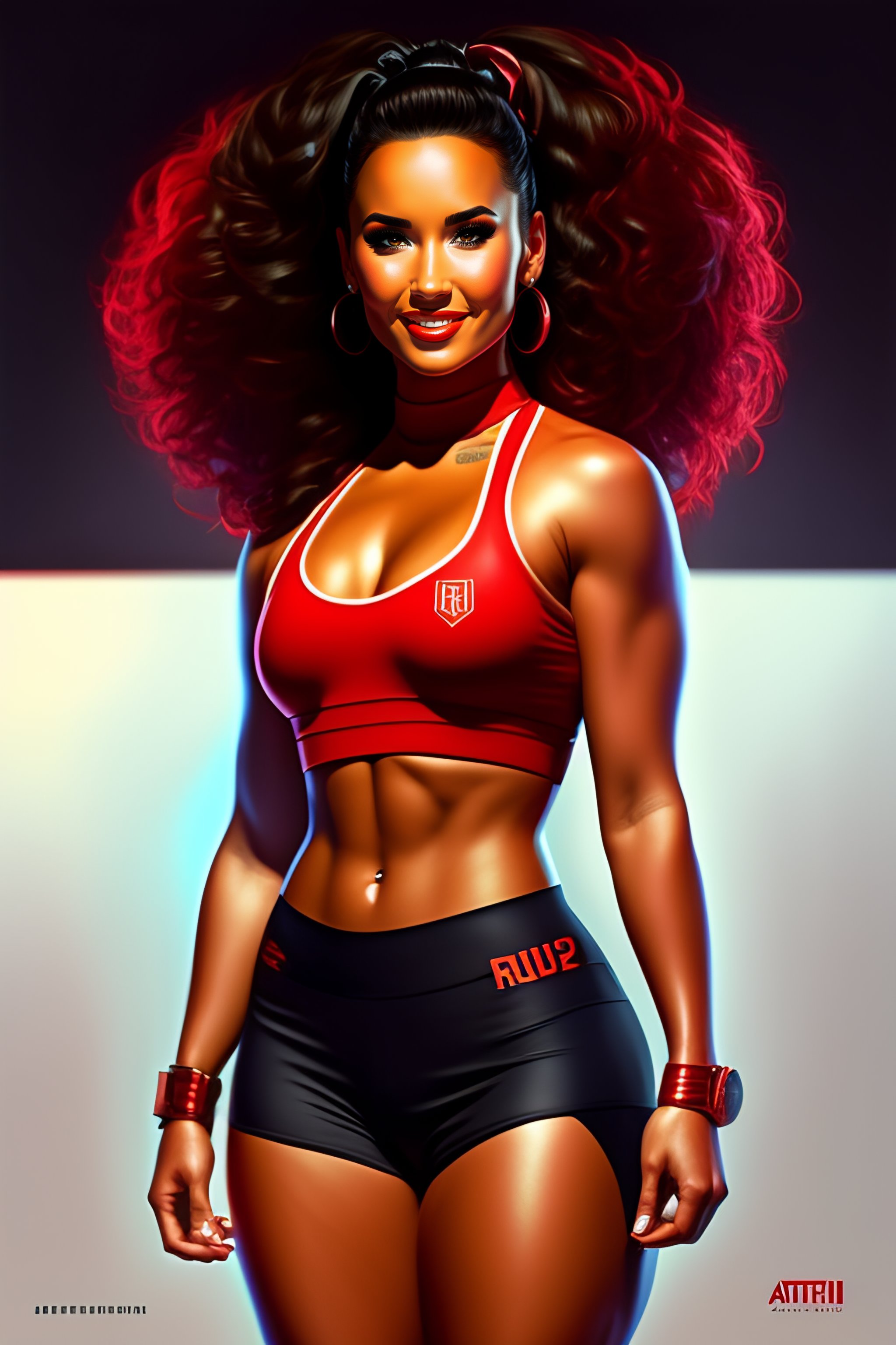 Demi lovato as red fitness instructor, smiling, full body realistic portrait, highly detailed, digital painting, artstation, concept art, smooth, sharp focus, illustration, cinematic lighting, art by artgerm and greg rutkowski and alphonse mucha
