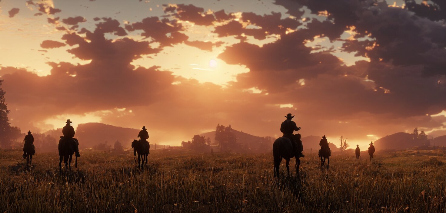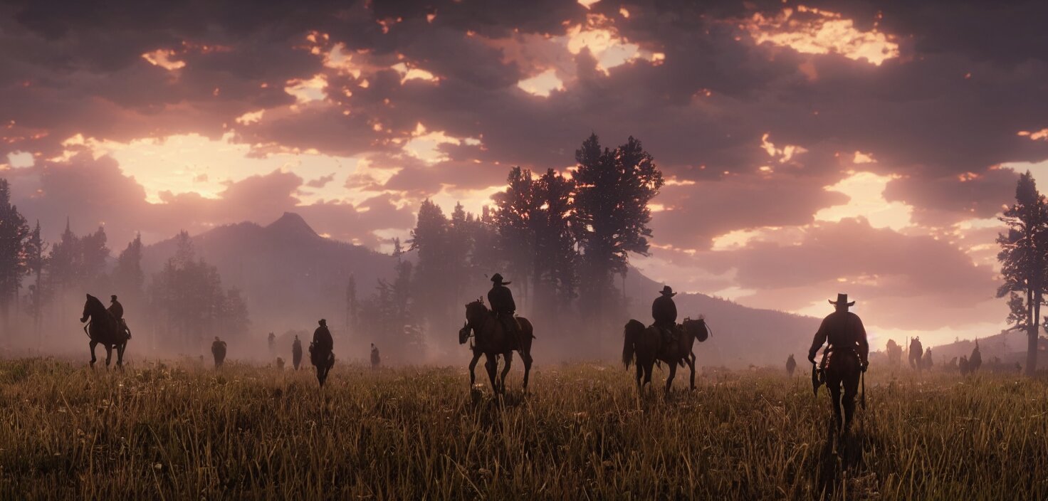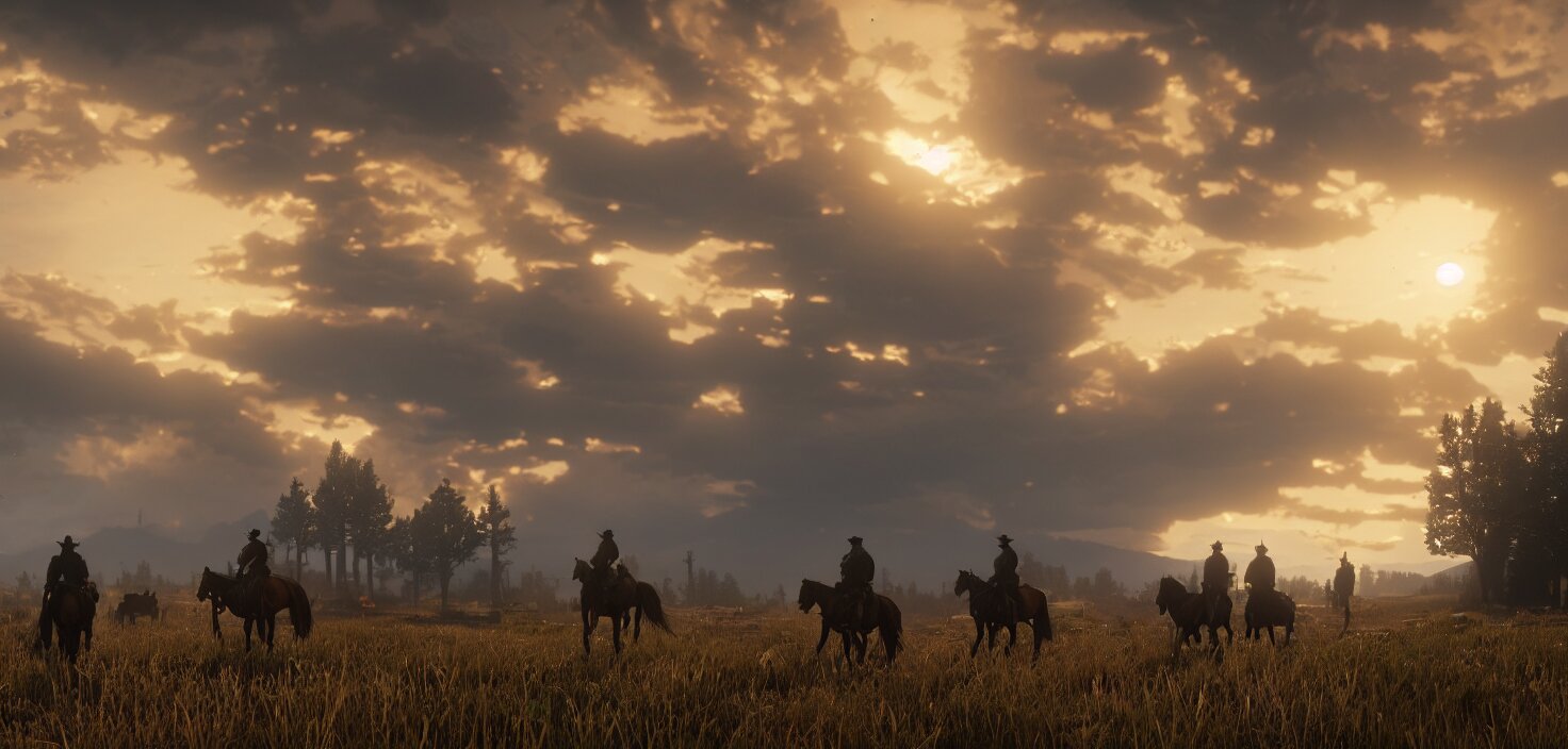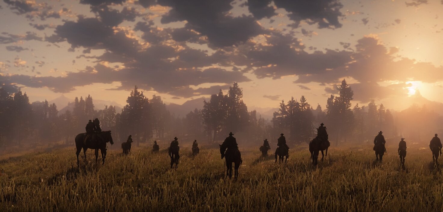 Red dead redemption 2, cinematic view, epic sky, detailed, concept art, low angle, high detail, warm lighting, volumetric, godrays, vivid, beautiful, trending on artstation, by jordan grimmer, huge scene, grass, art greg rutkowski