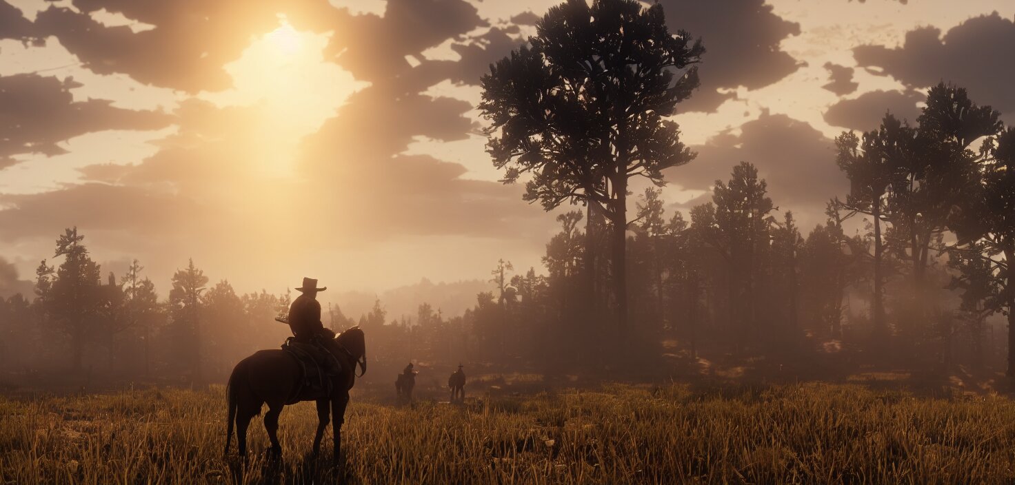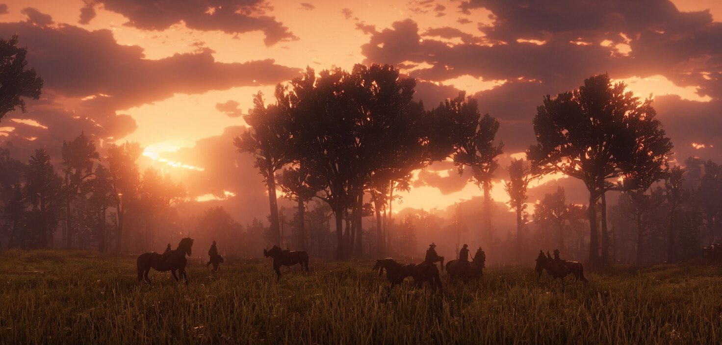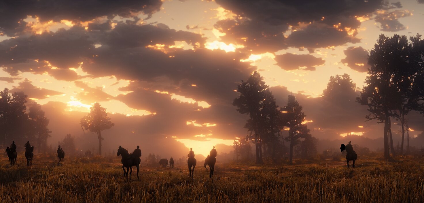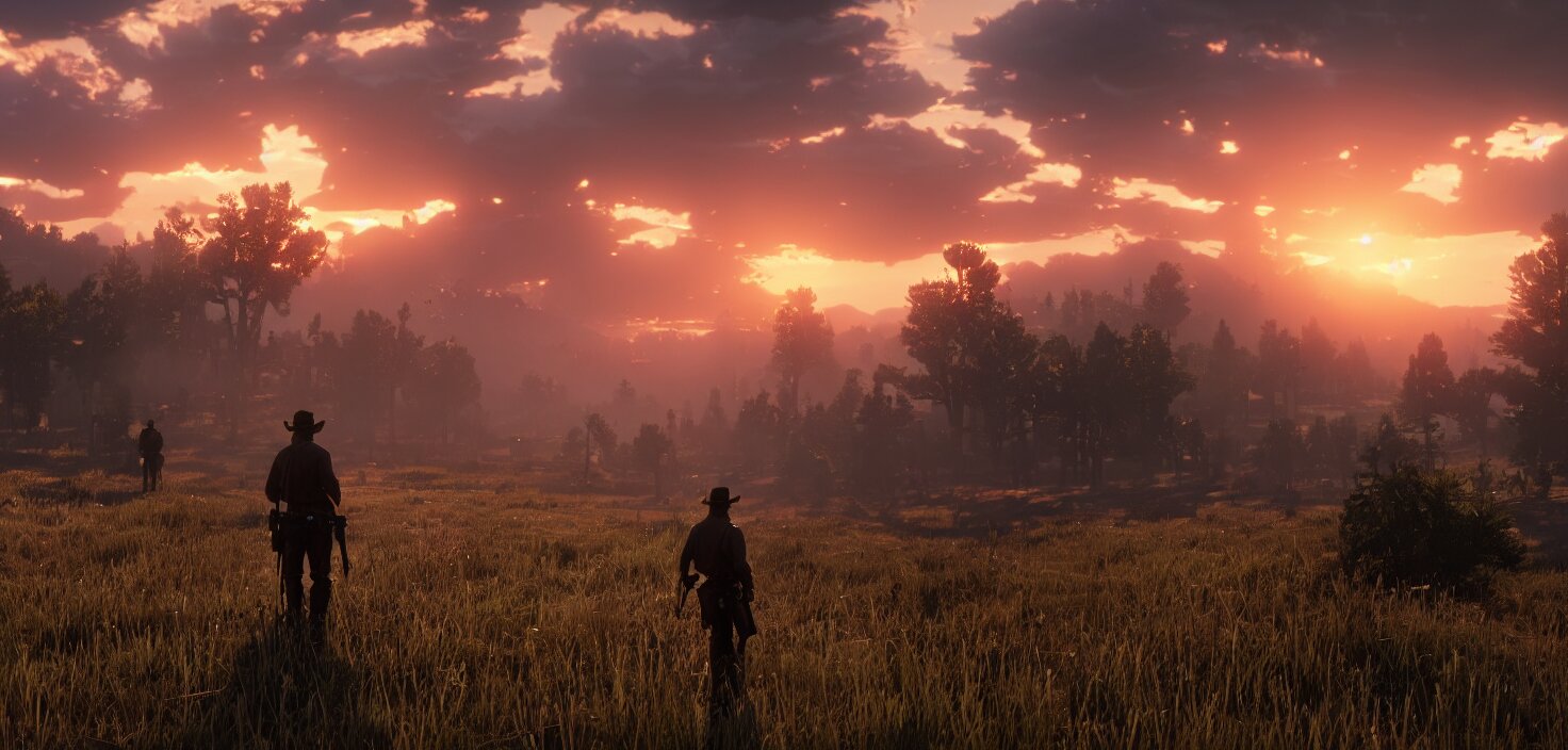 Red dead redemption 2, cinematic view, epic sky, detailed, concept art, low angle, high detail, warm lighting, volumetric, godrays, vivid, beautiful, trending on artstation, by jordan grimmer, huge scene, grass, art greg rutkowski