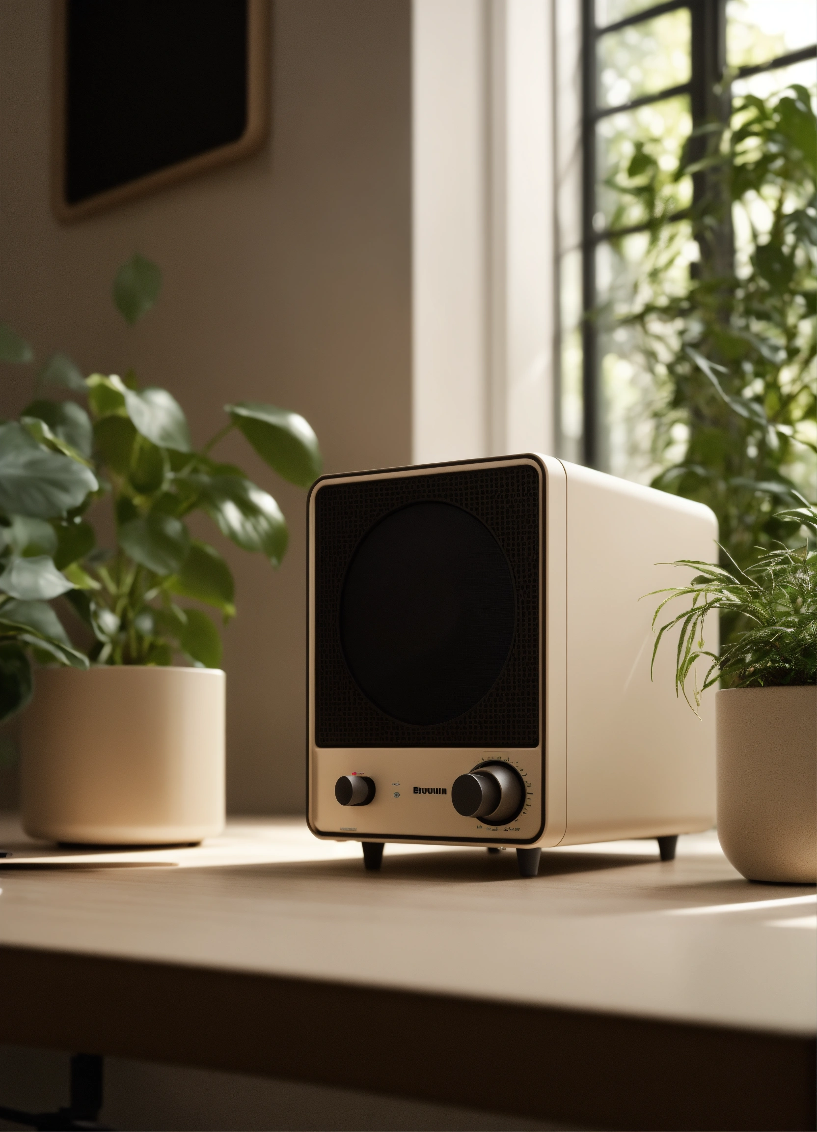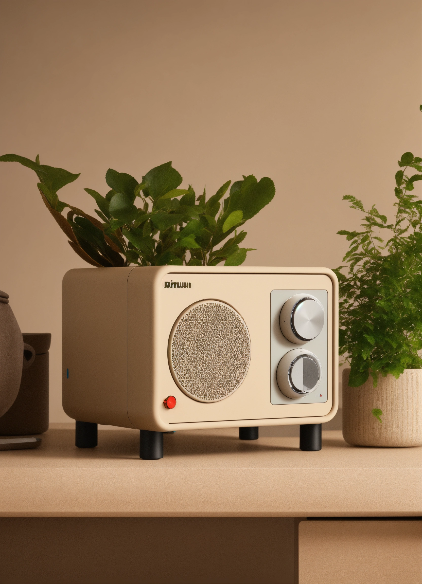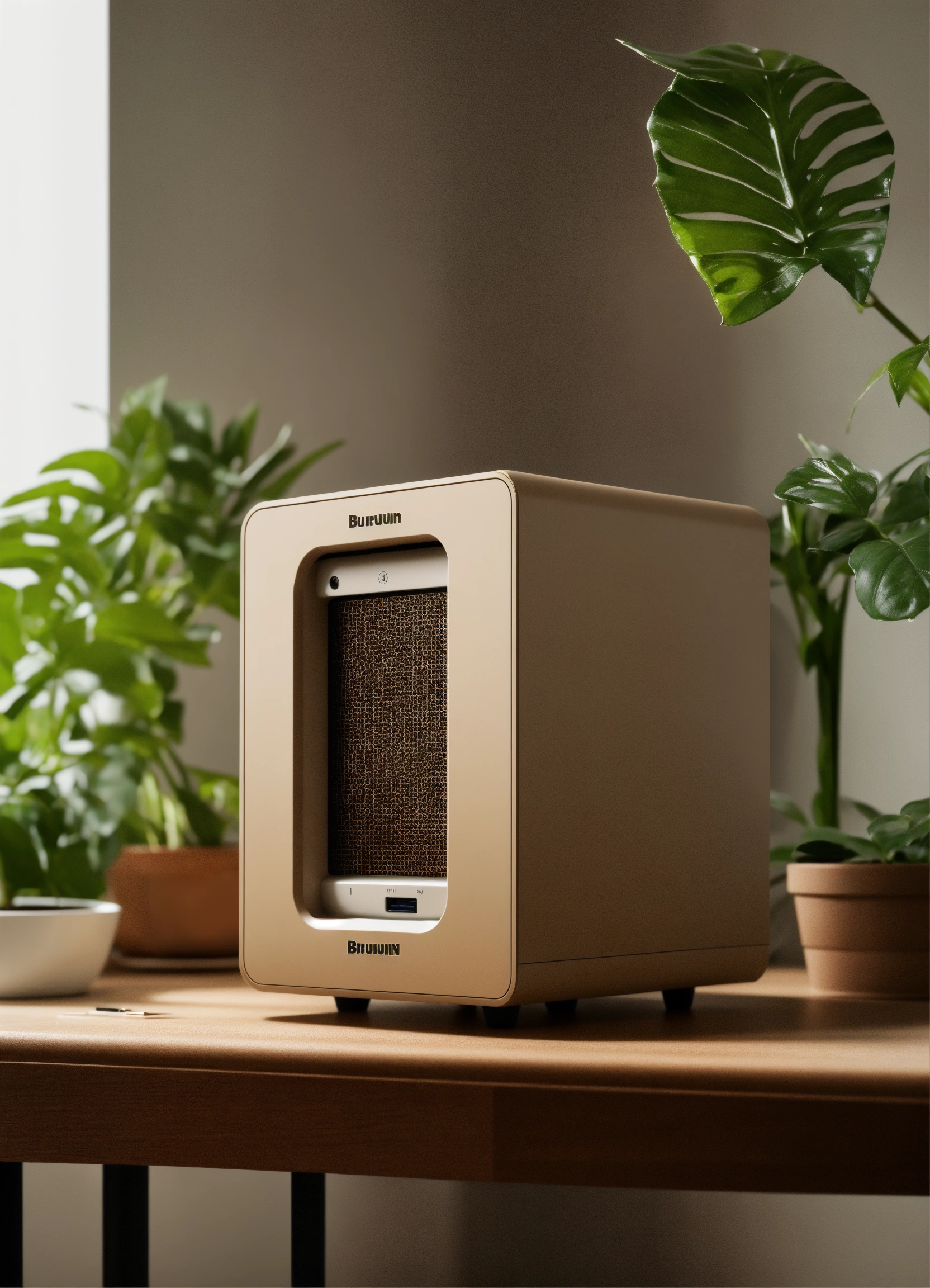 A stunning minimal beige mini itx case designed by dieter rams, braun. product ad retro. industrial design inspiration. unreal engine render, natural lighting with plants on desk.