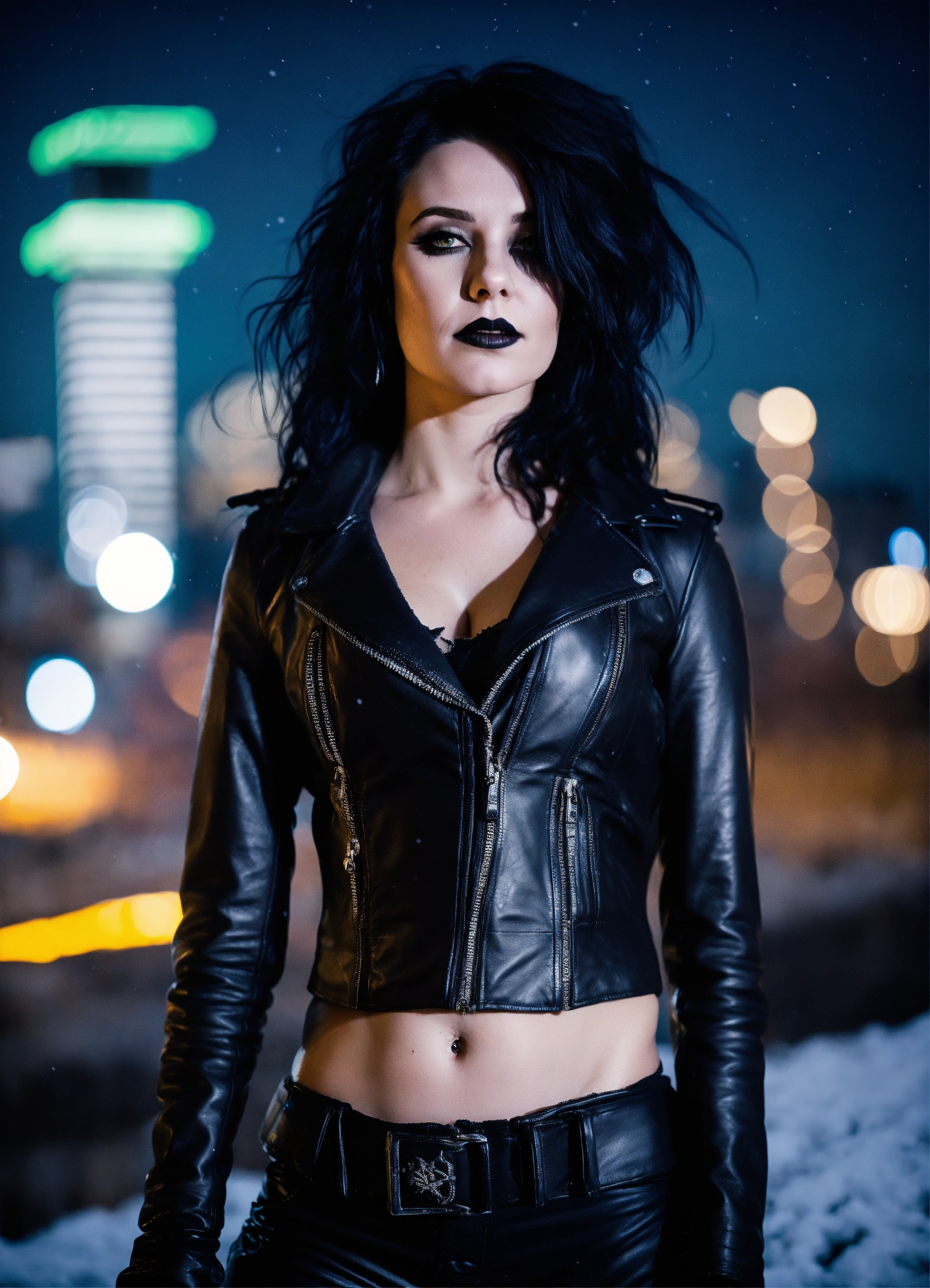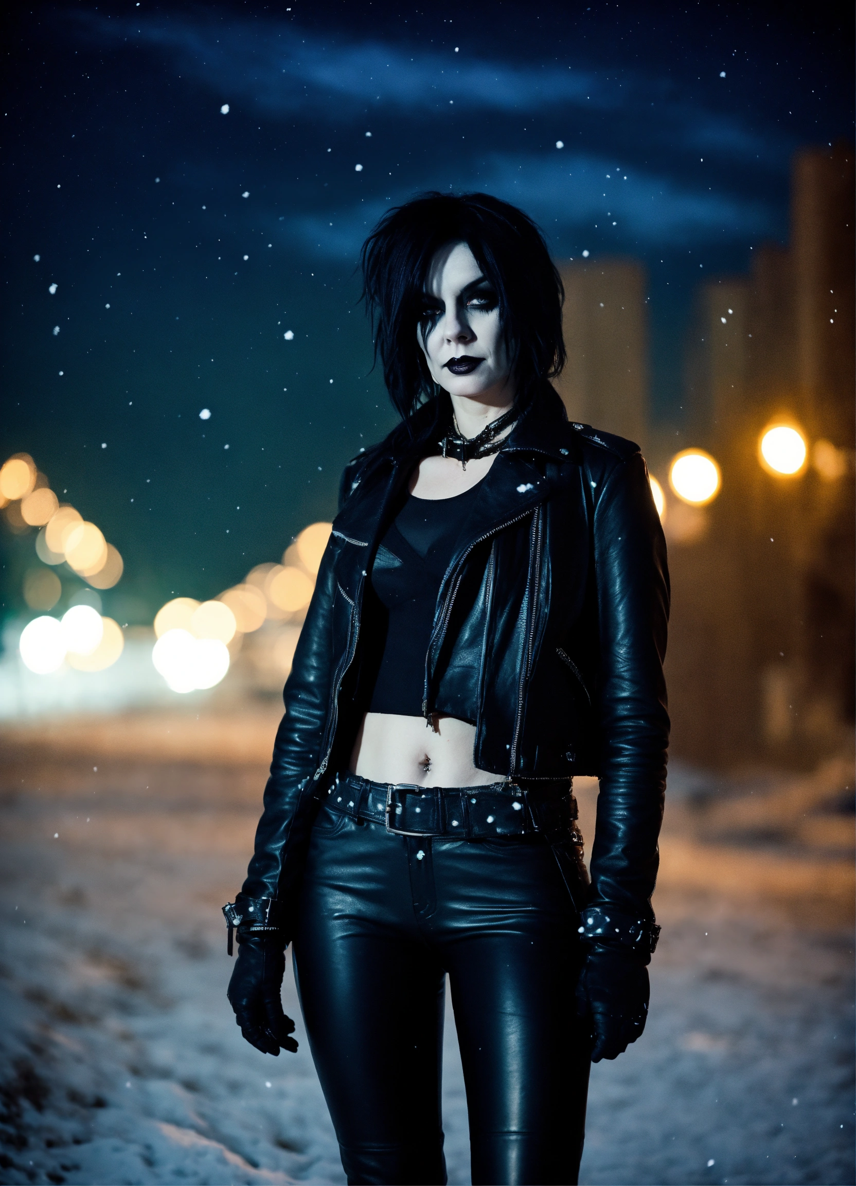 A real photo of a 25 year old woman with looking like a real version of death from sandman, wearing black leather jacket pants corsets and gloves. urban background in the sky we see stars. full body snow at night.