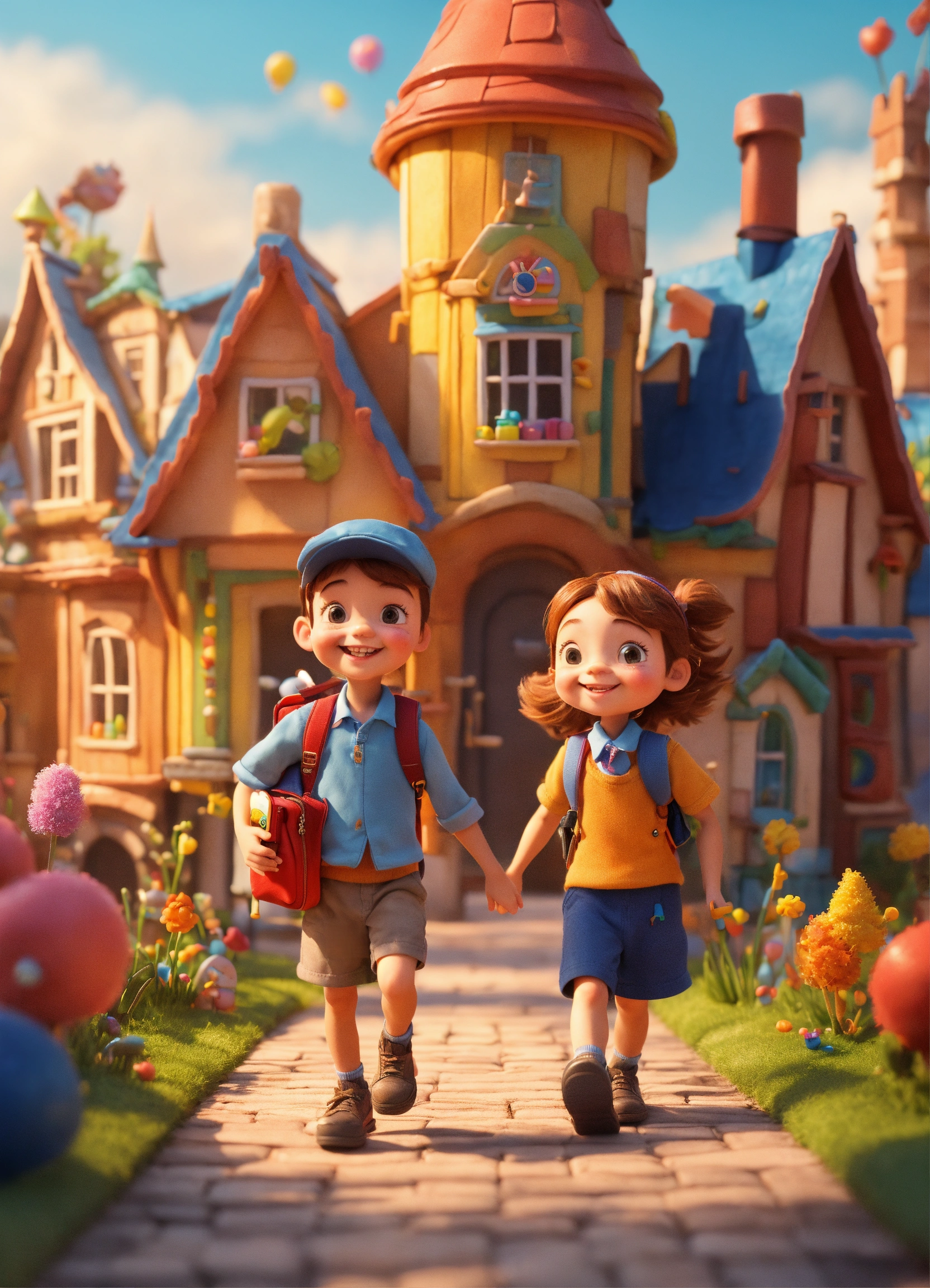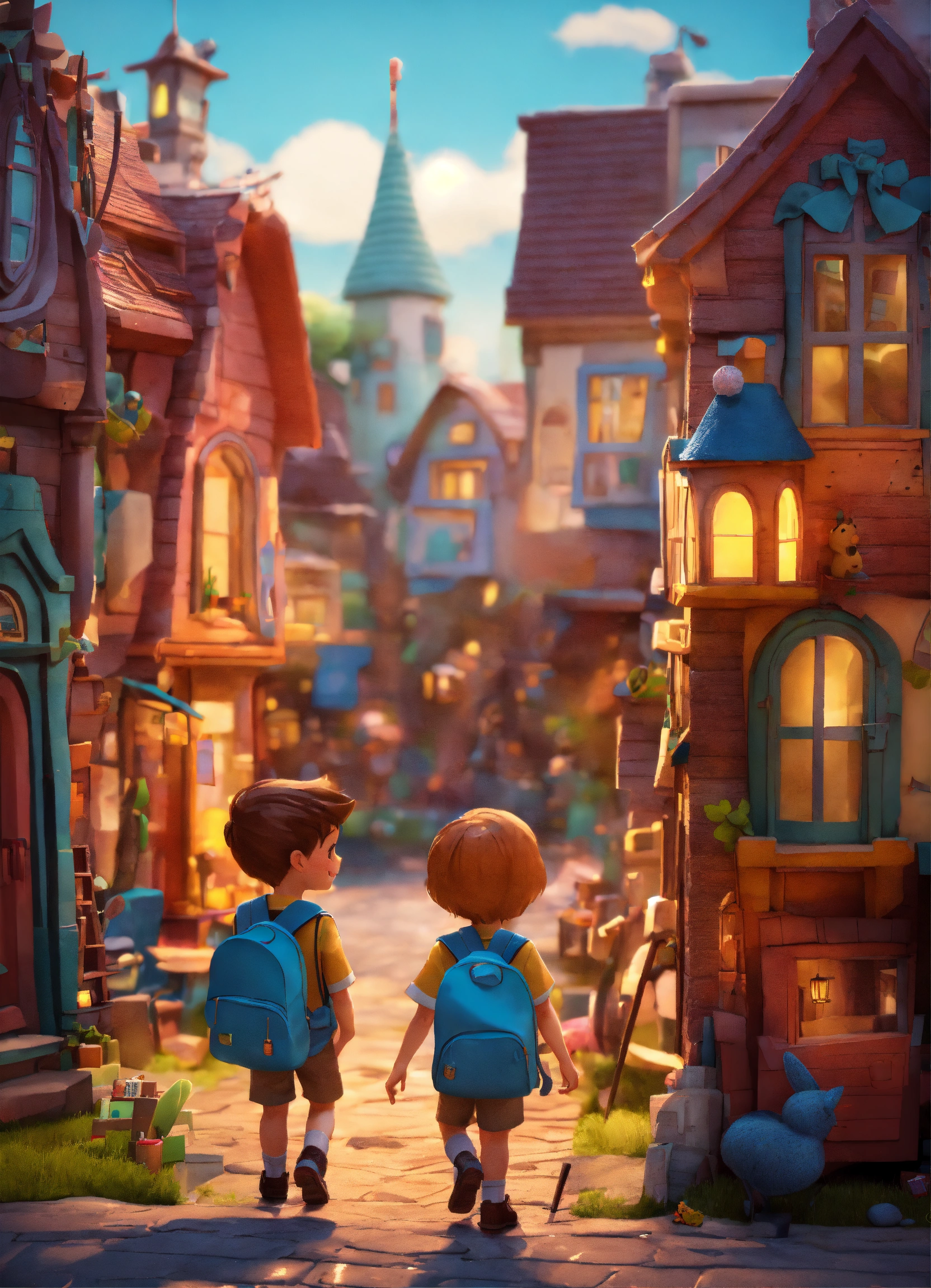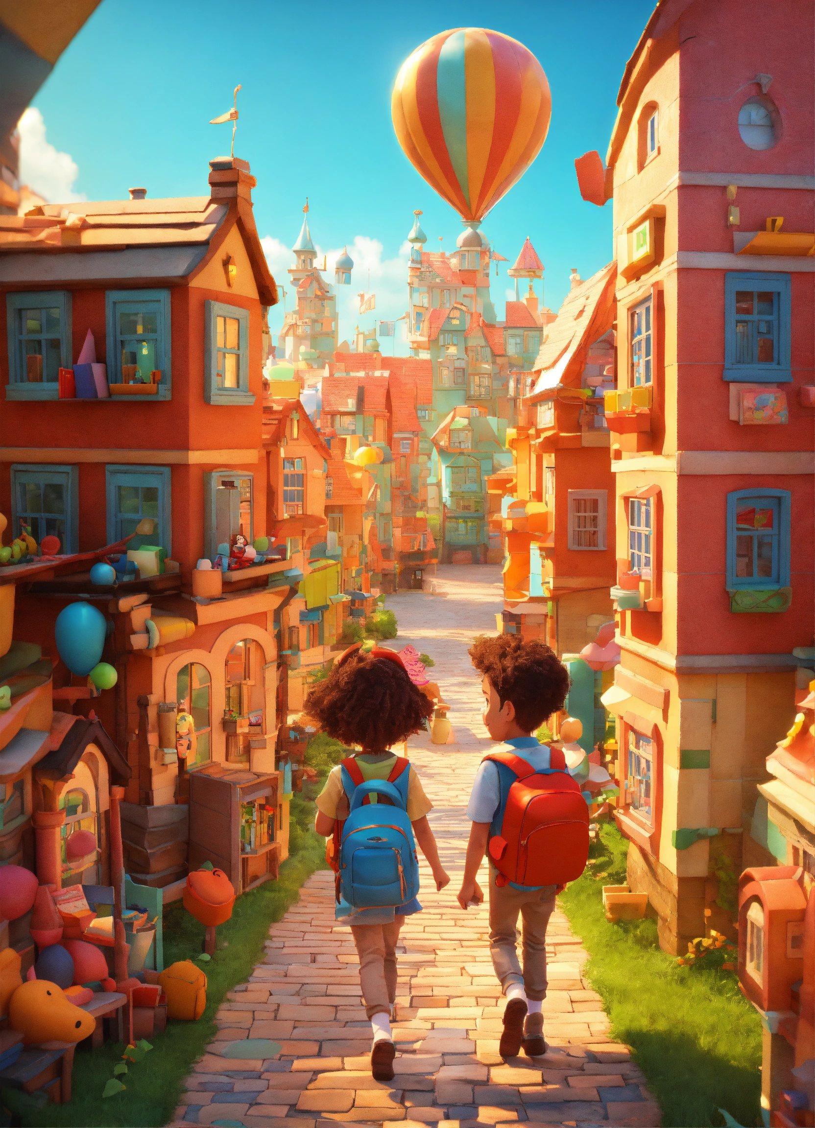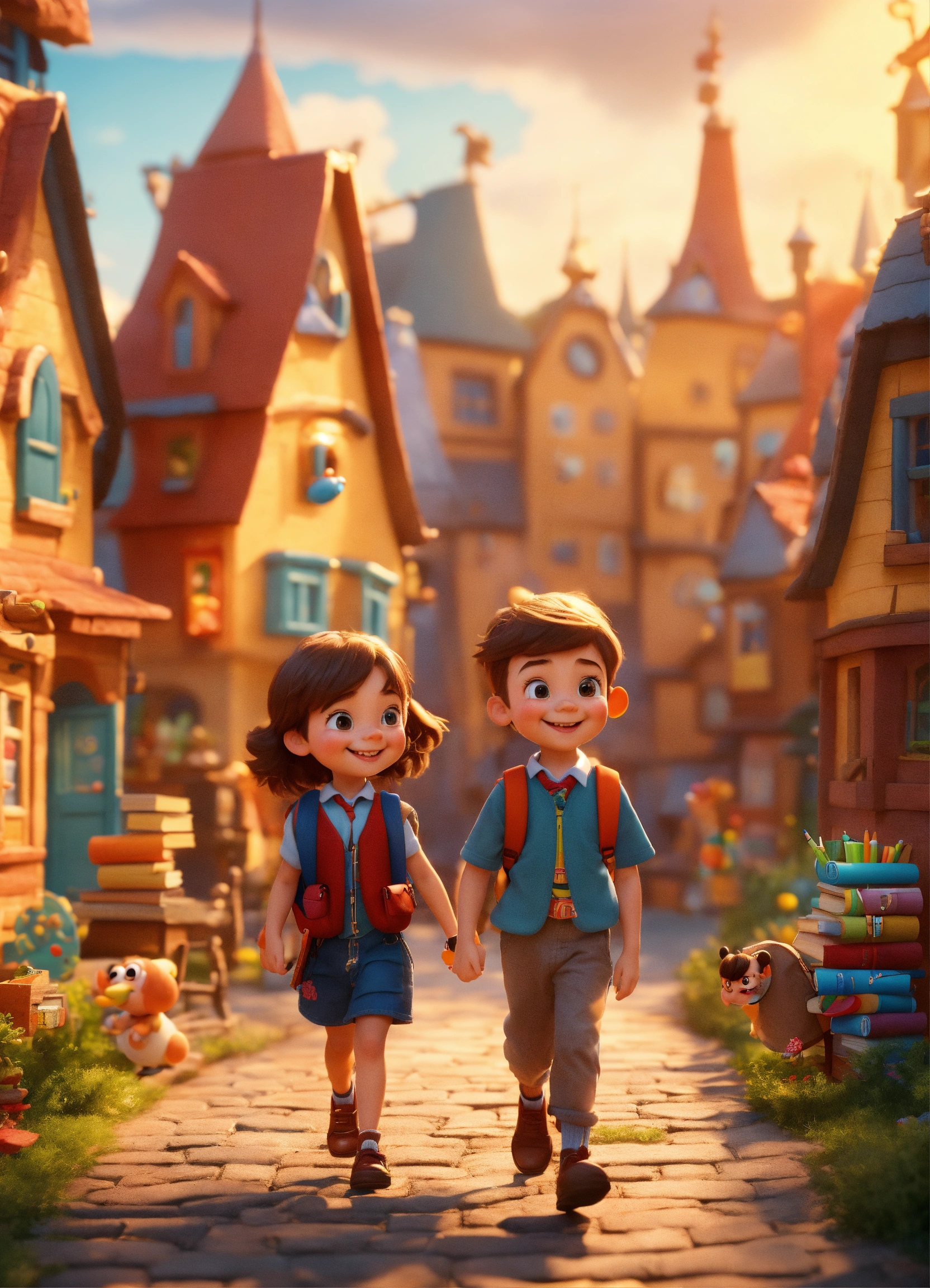 Little boy and girl are walking and smiling whit schoolbag, in whimsical book village. the buildings of the city are made of books, pencils, pens, a rulers . childish and fun style. 3d style. disney and pixar style