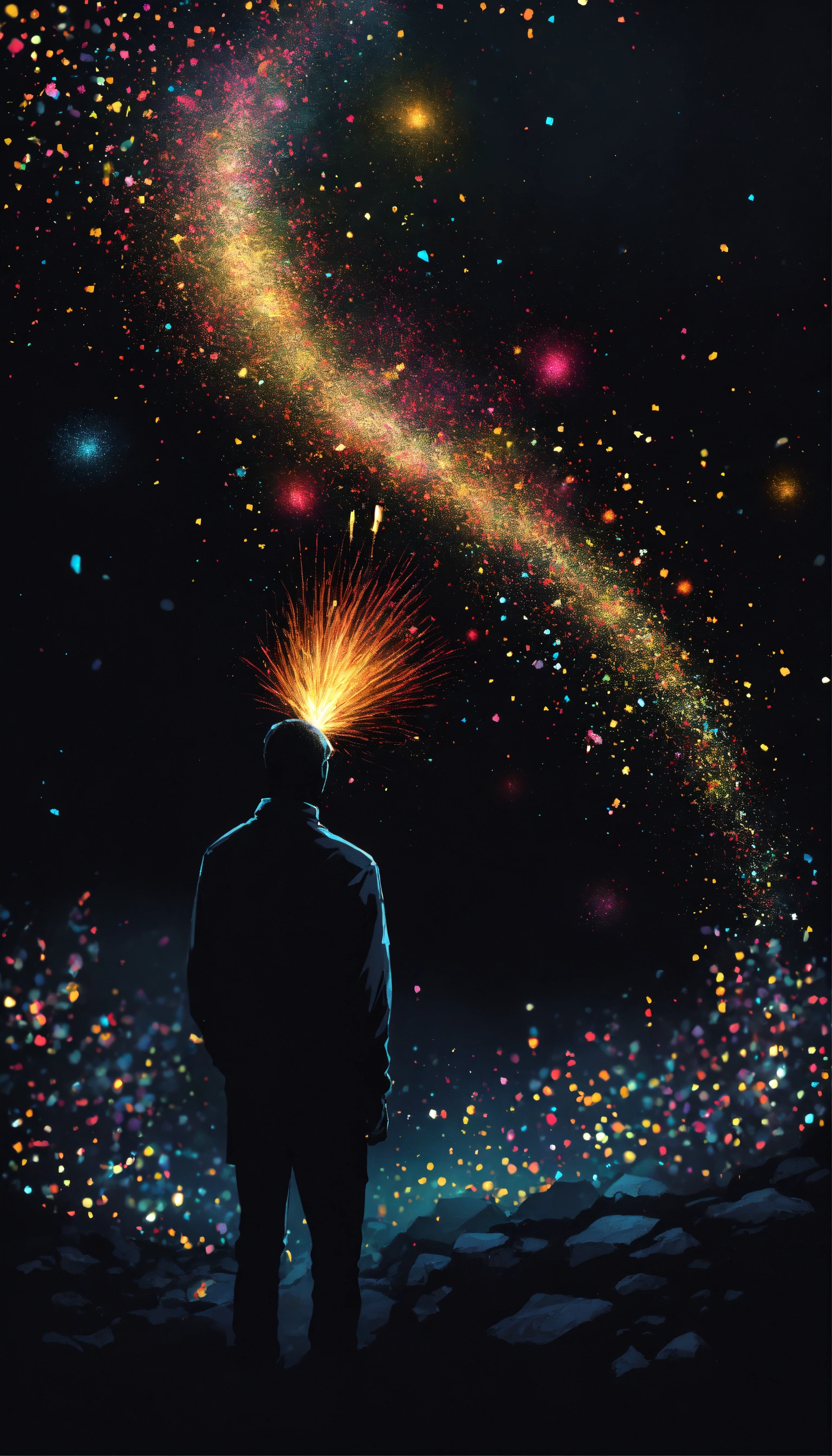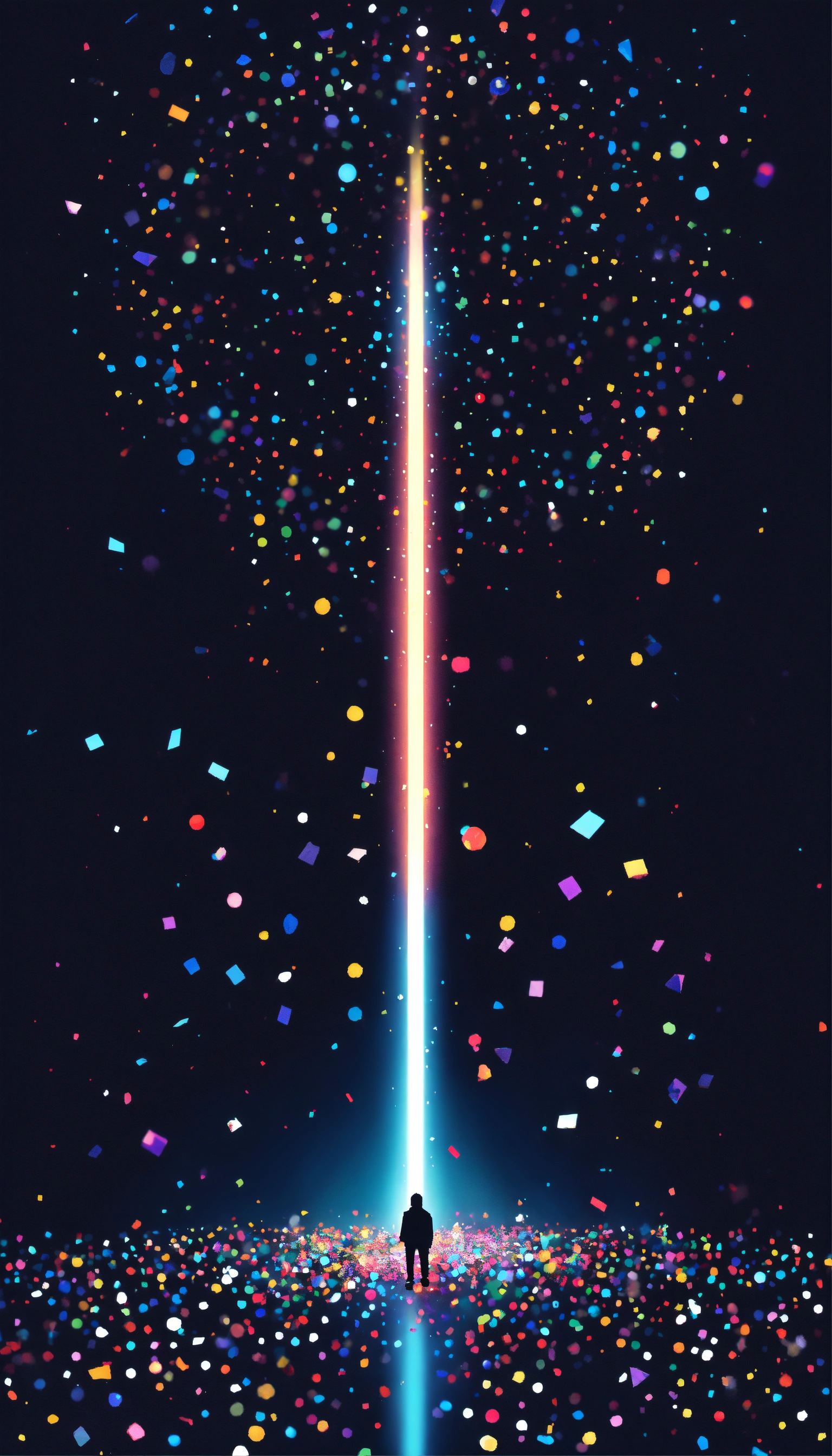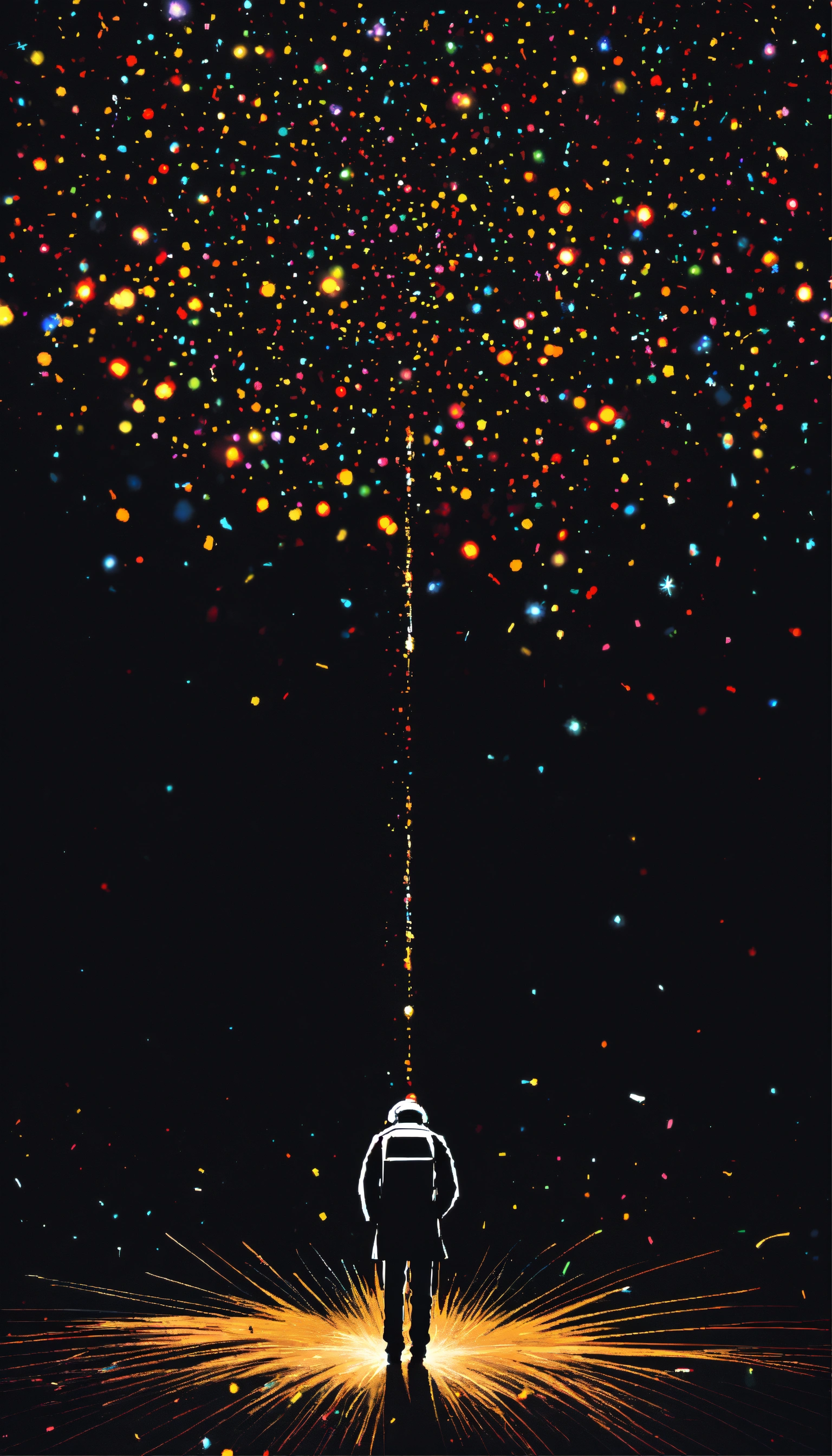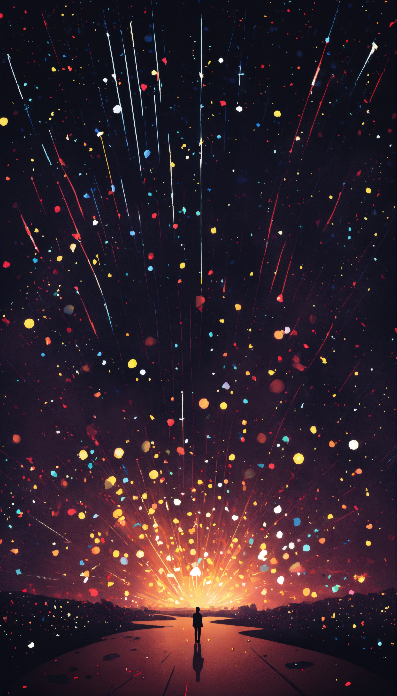 Deepspace, illustration, 2d, black flat background, flat image, mysterious aura, blank page, dark, fireworks and confetties, minimalist, very dark, minimal