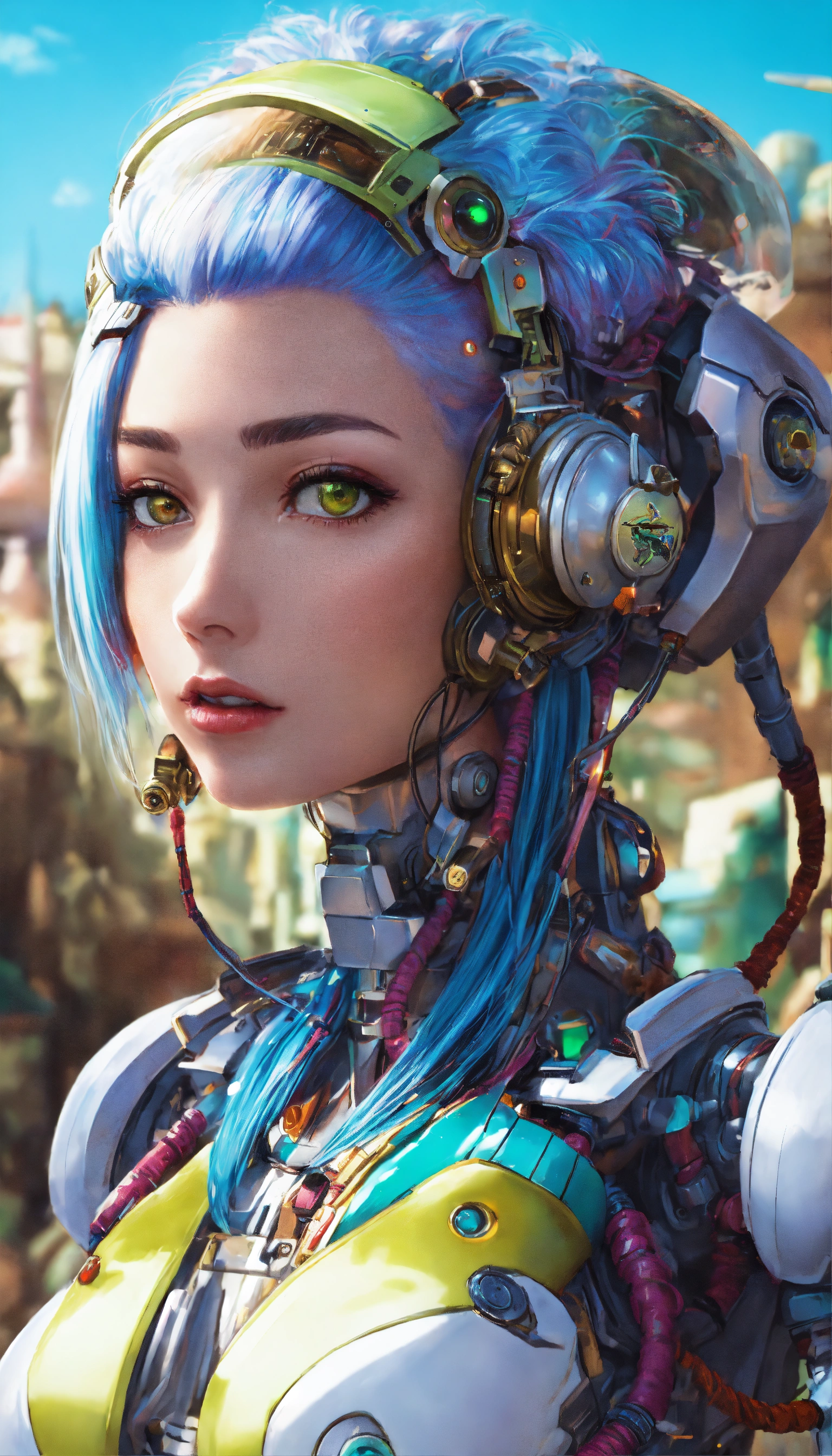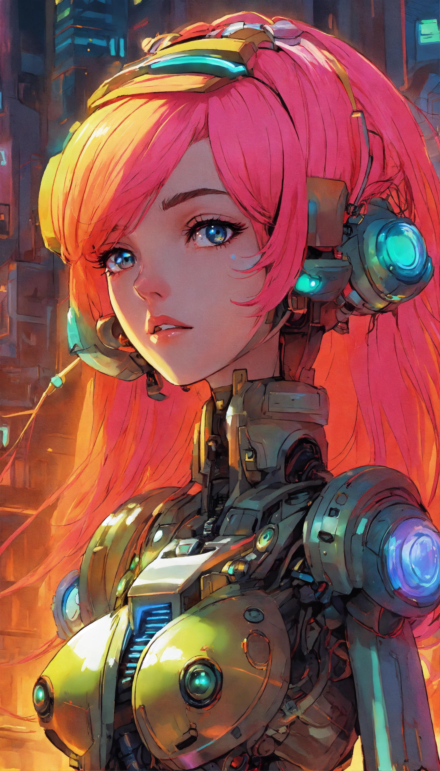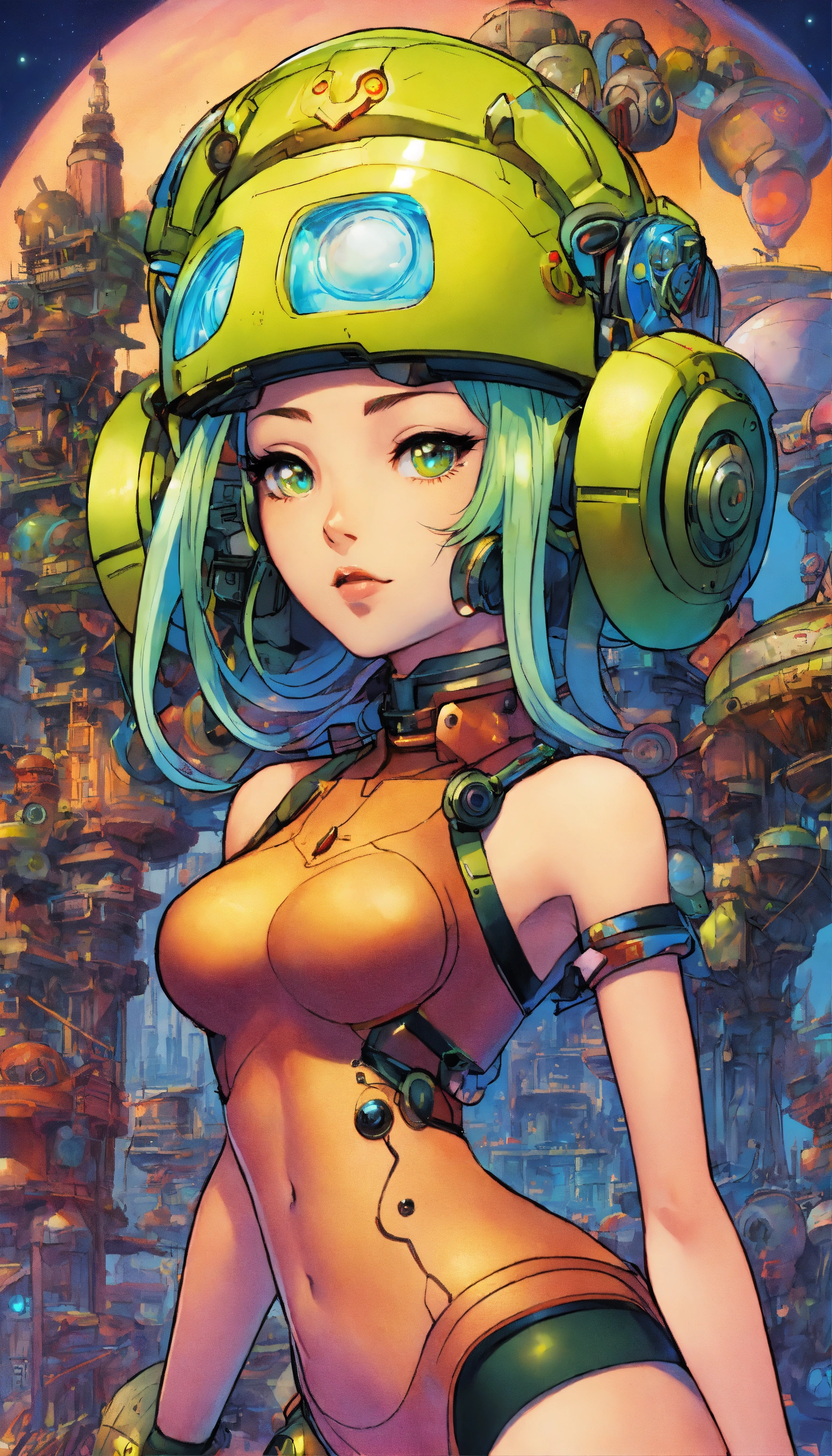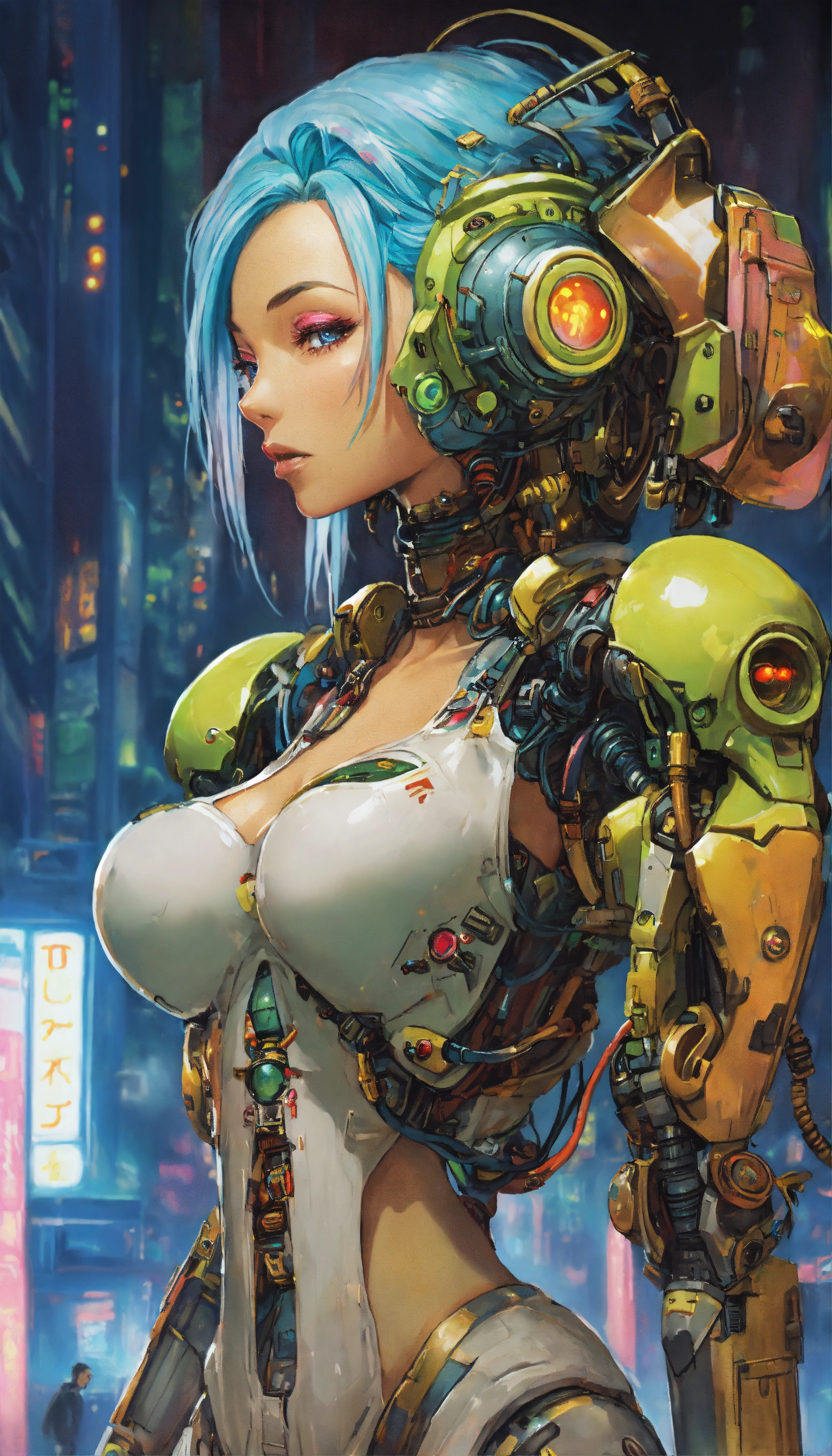 2000s ruined civilization alluring seductress robot with neon hair and alien tech, full detailed eyes, toriyama, miyazaki