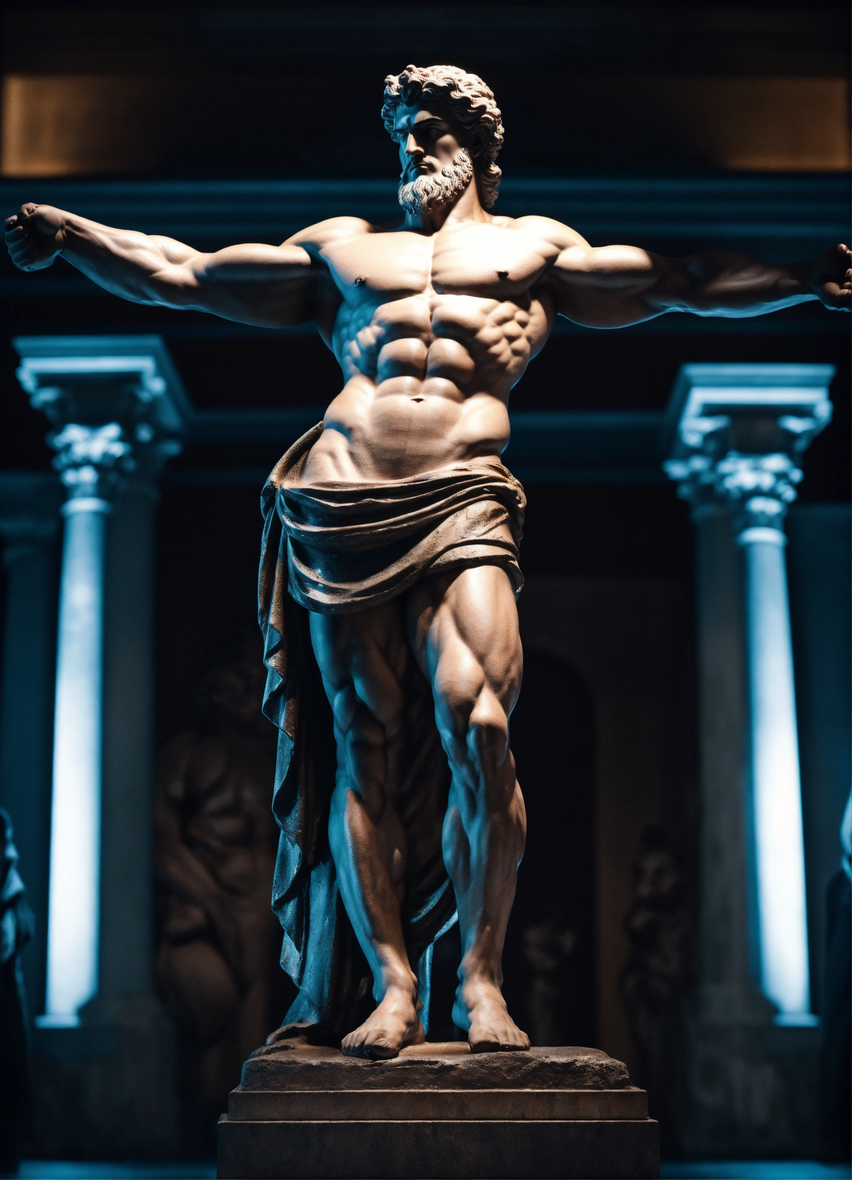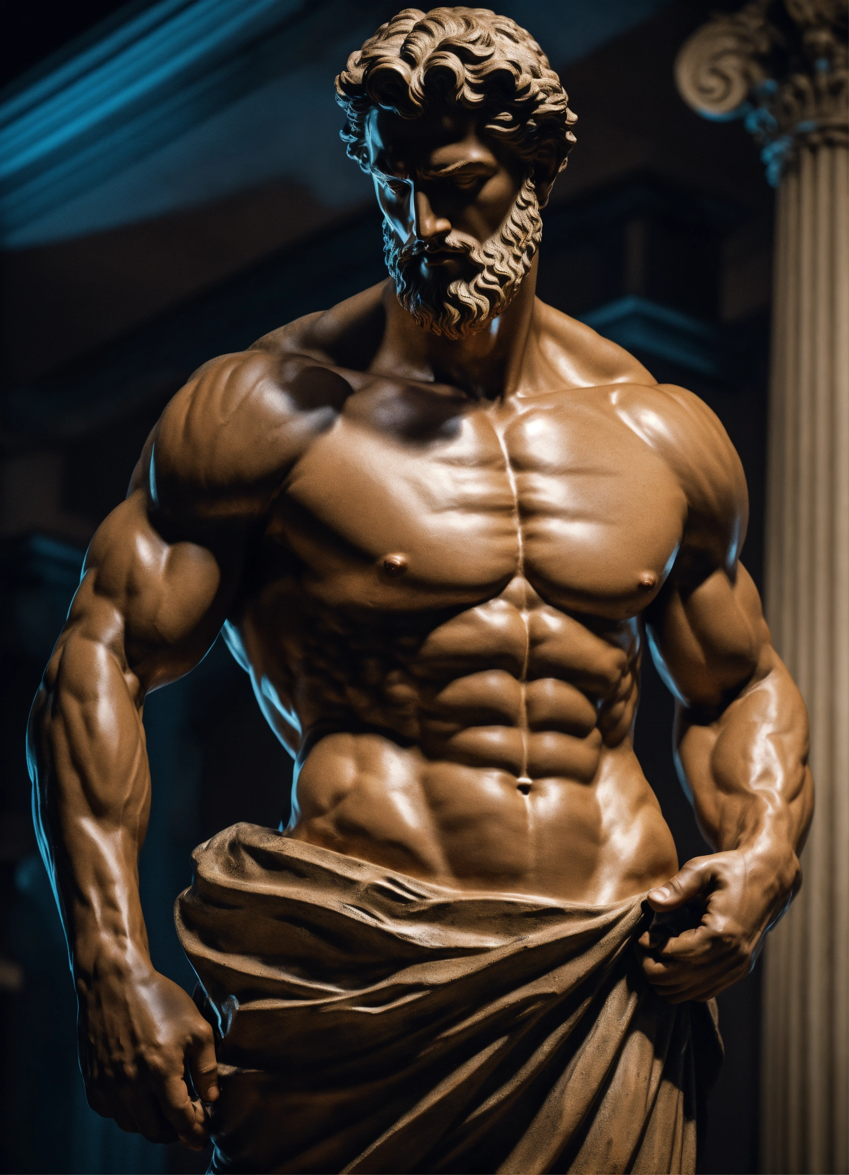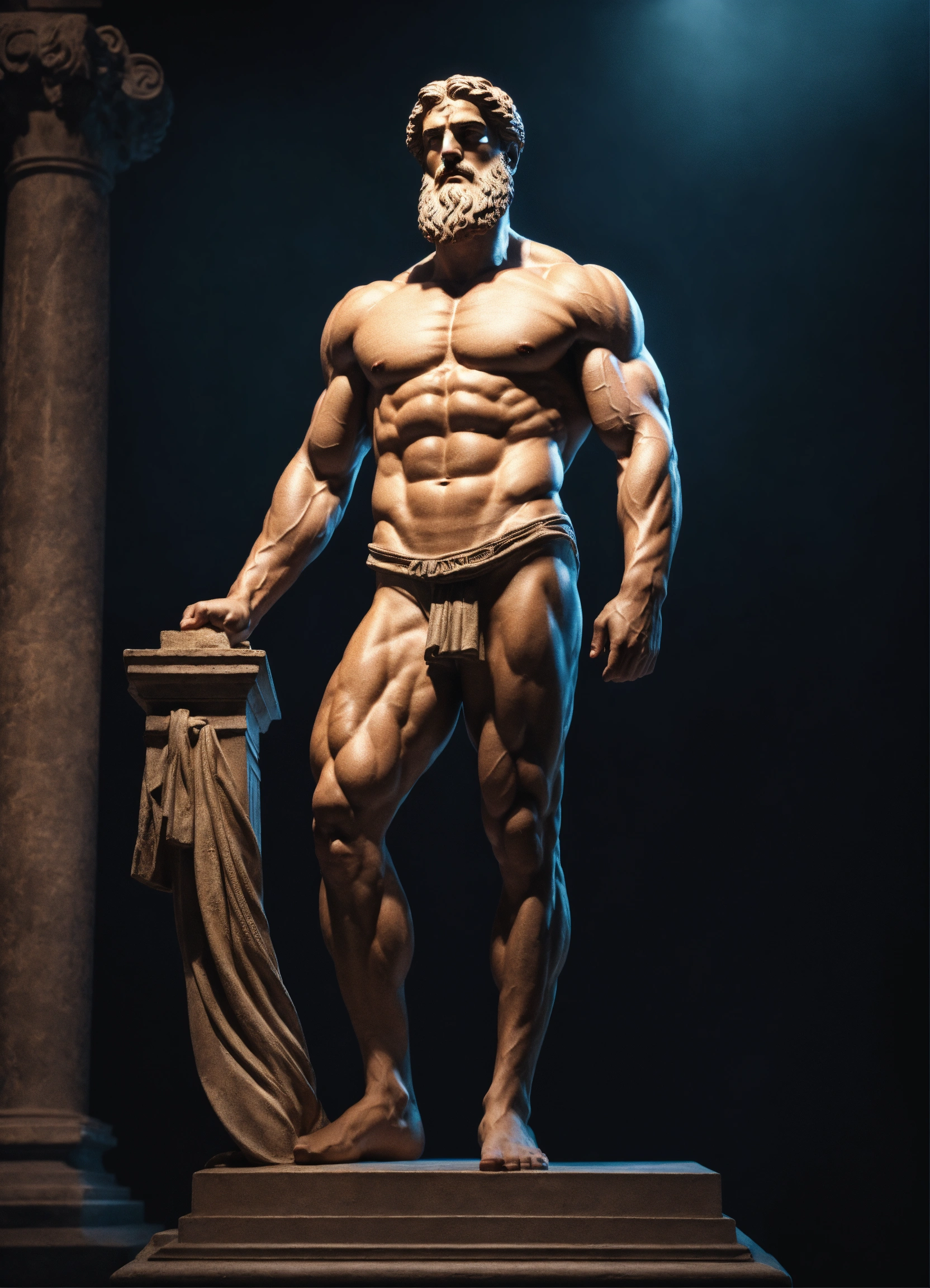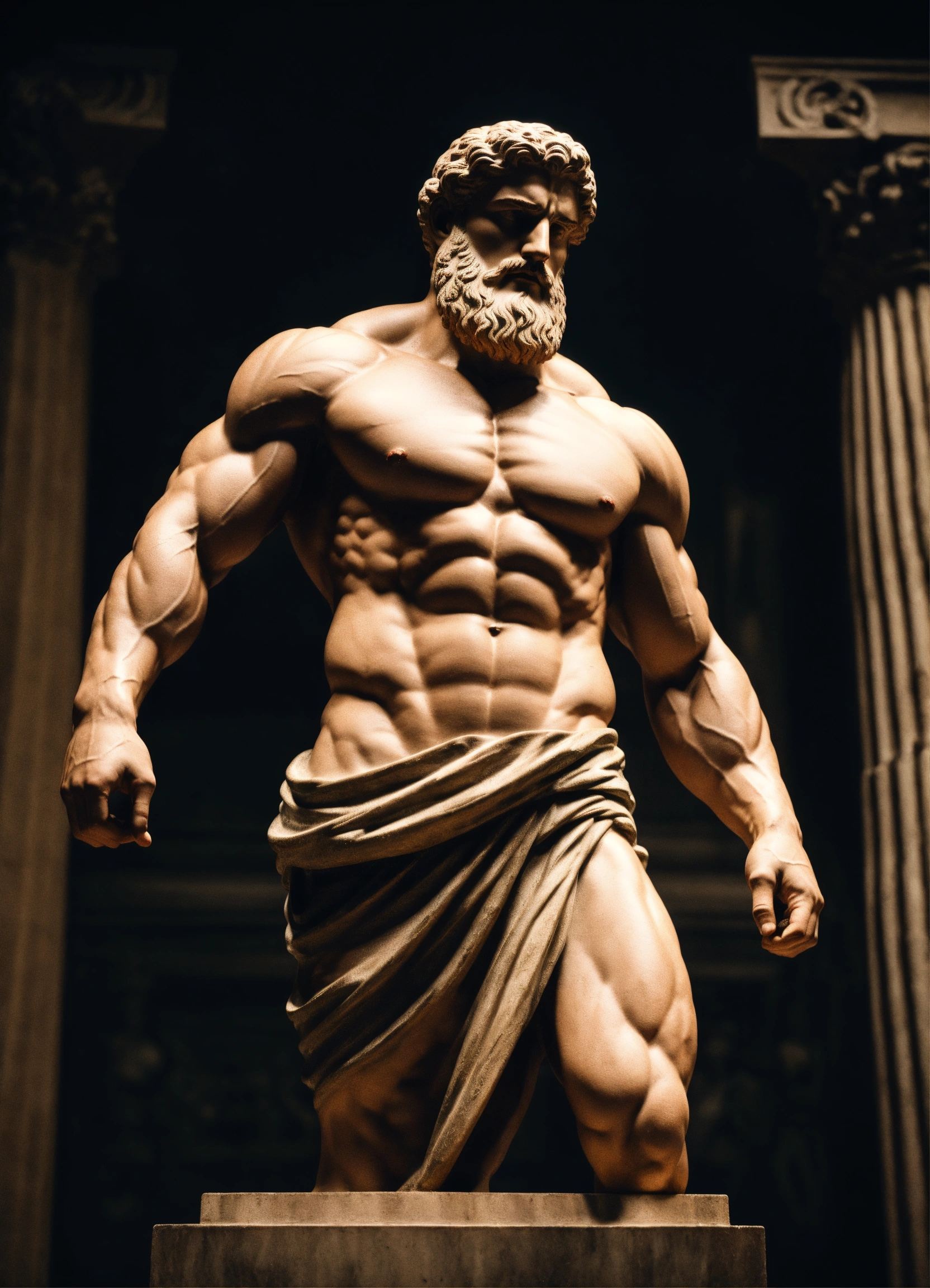 Stoic greek statue with very muscular body in dramatic angles, strong arms, cinematic, 8k, background dark