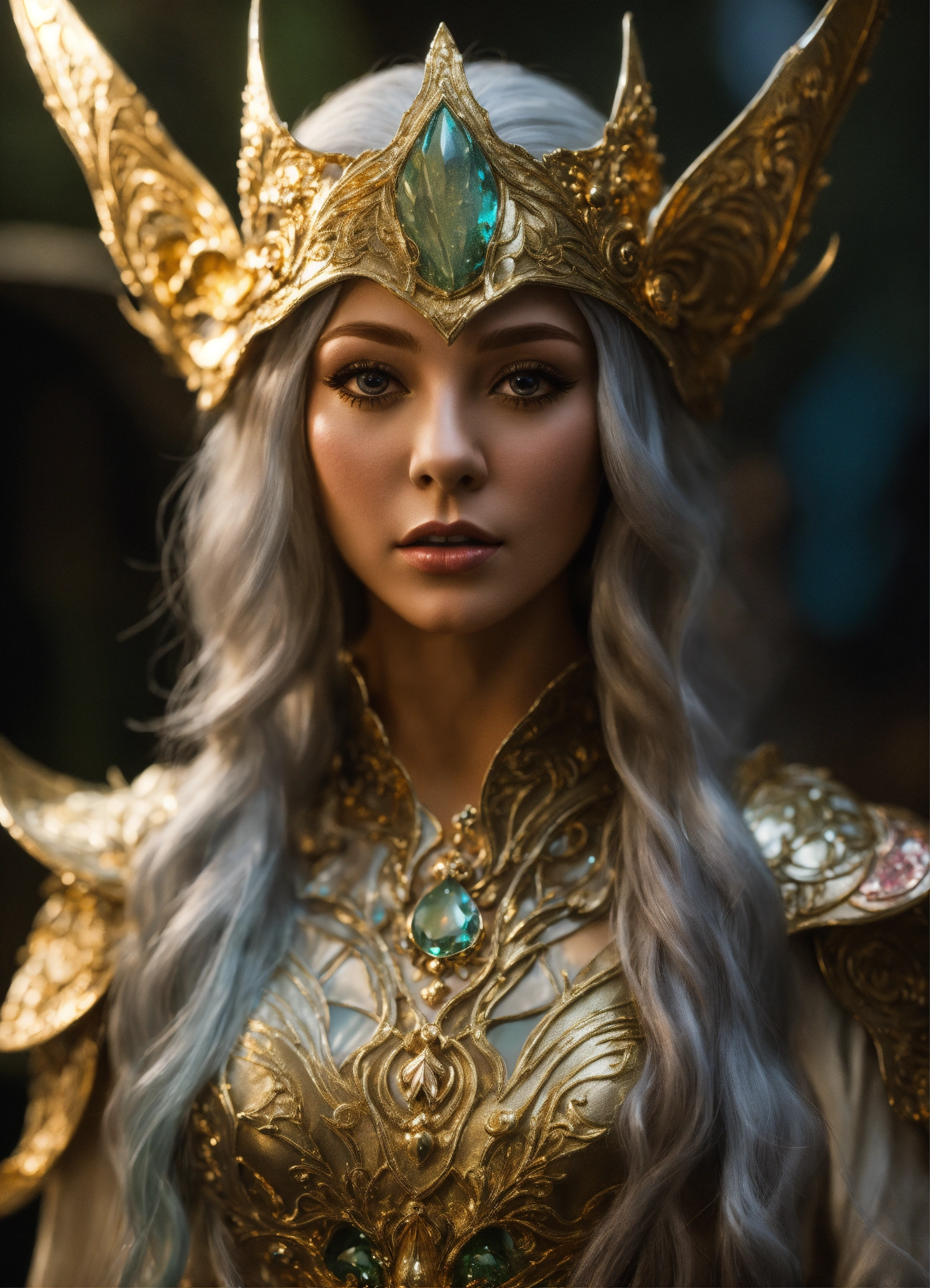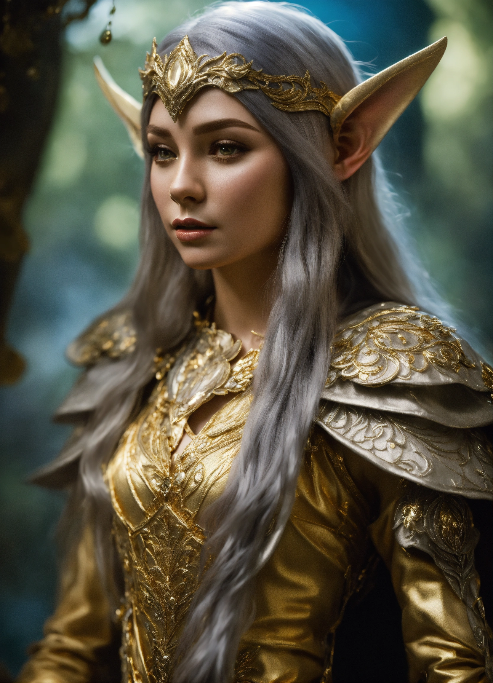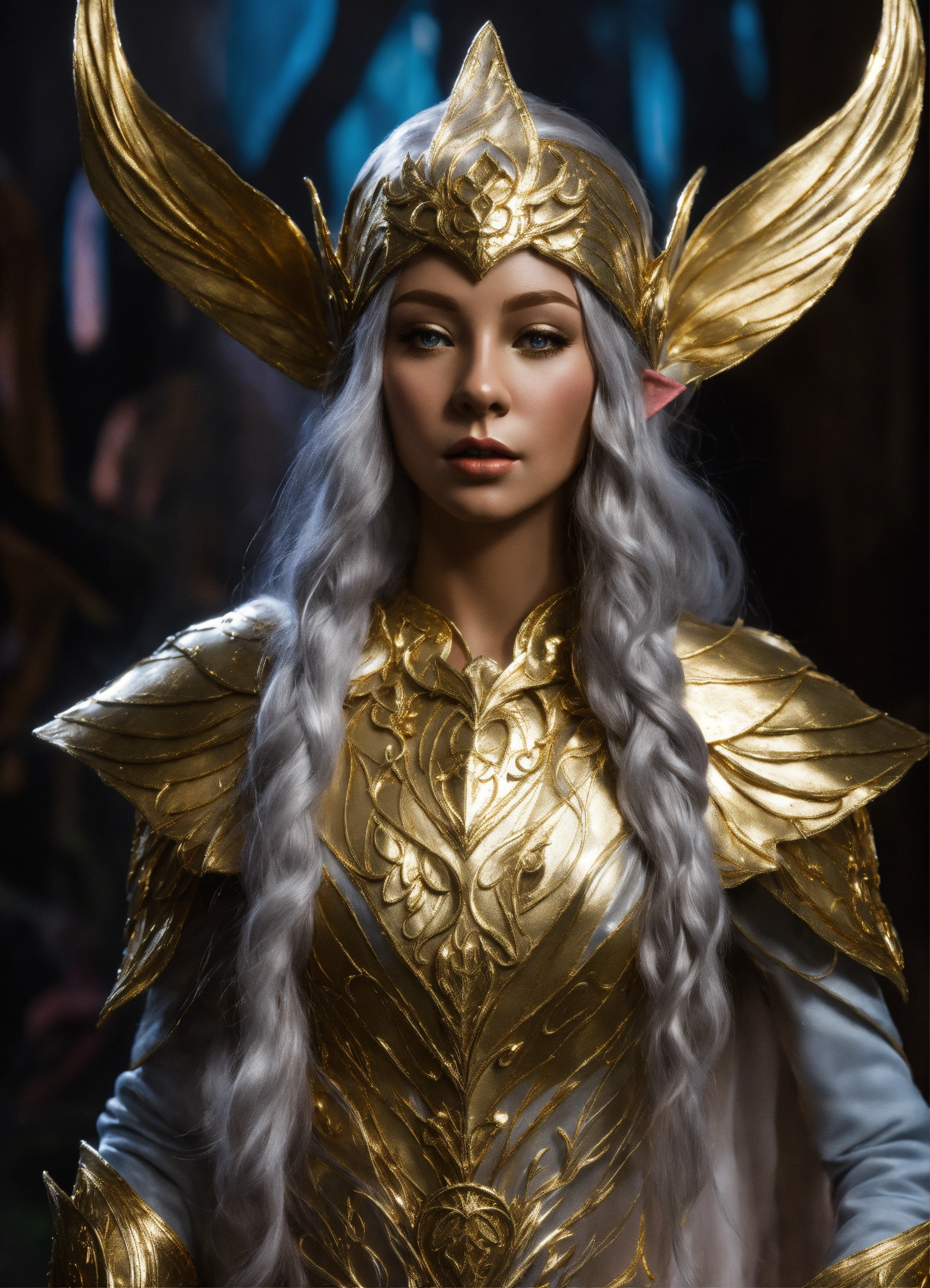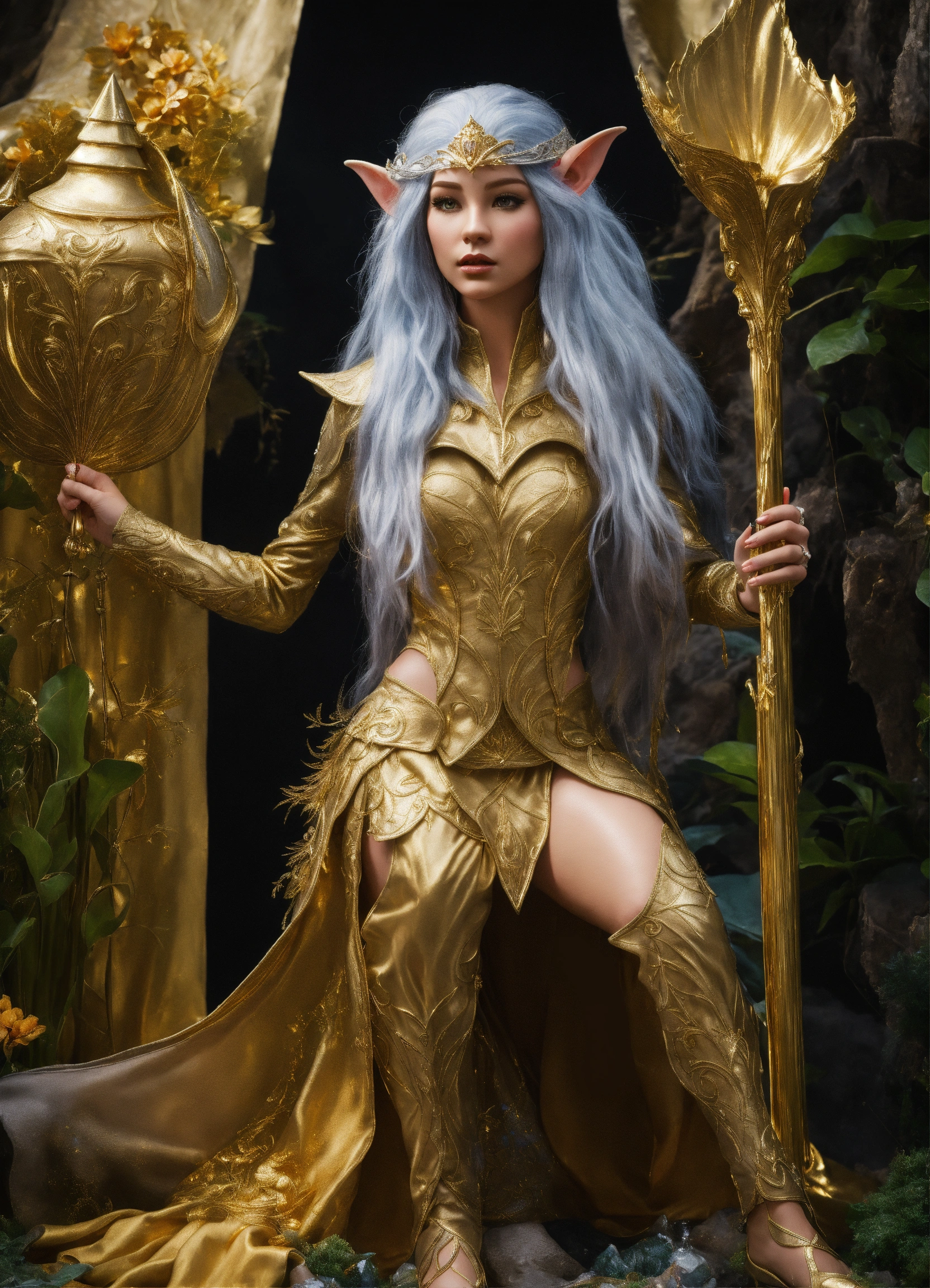 A elf gold and silver clothes princess full body life size from the dark crystal hyperrealistic, splash art, concept art, mid shot, intricately detailed, color depth, dramatic, high definition