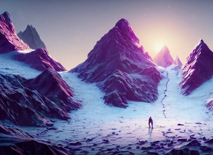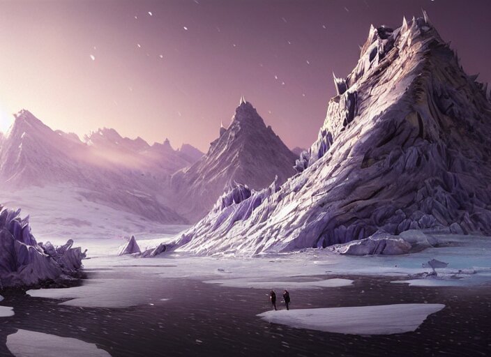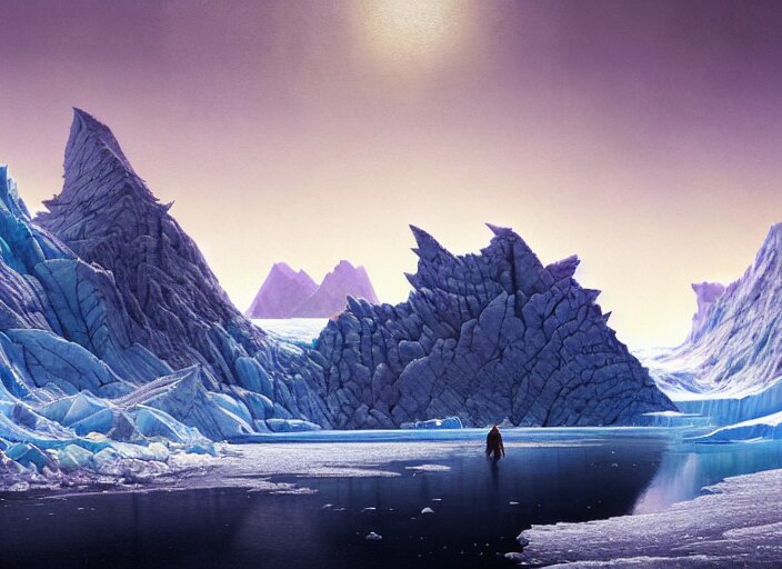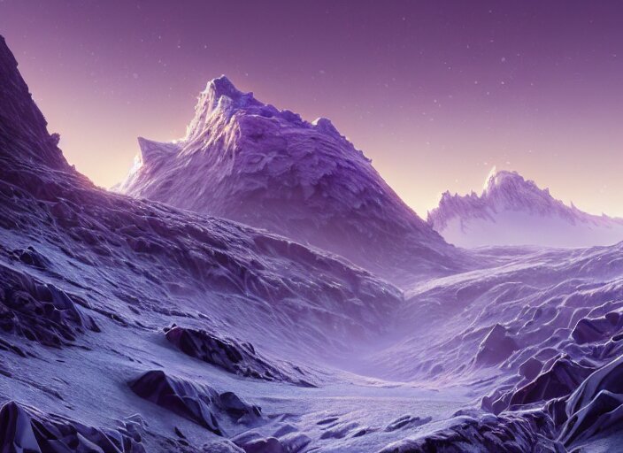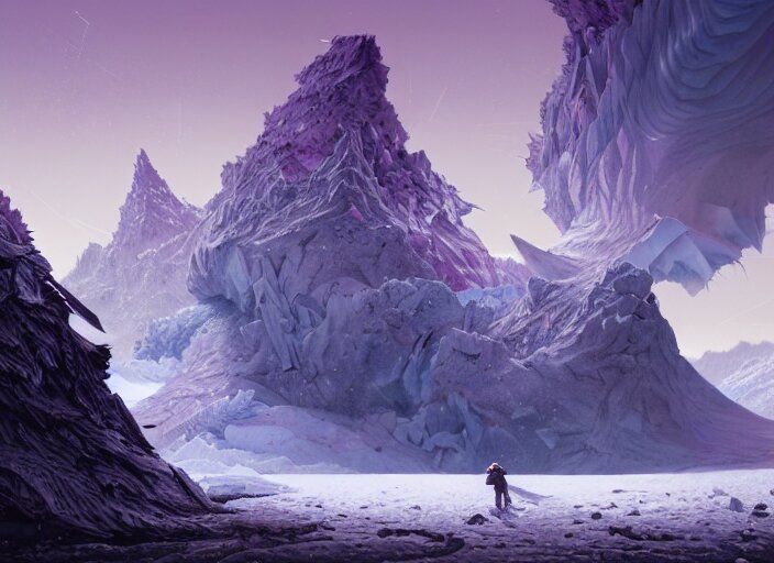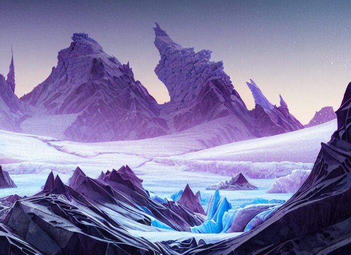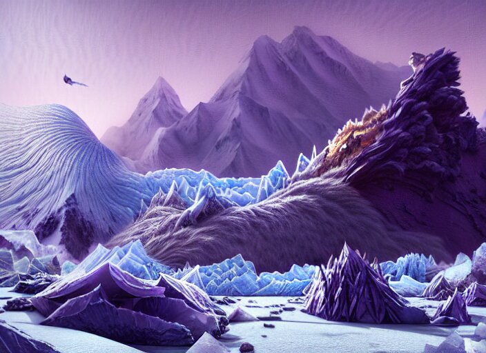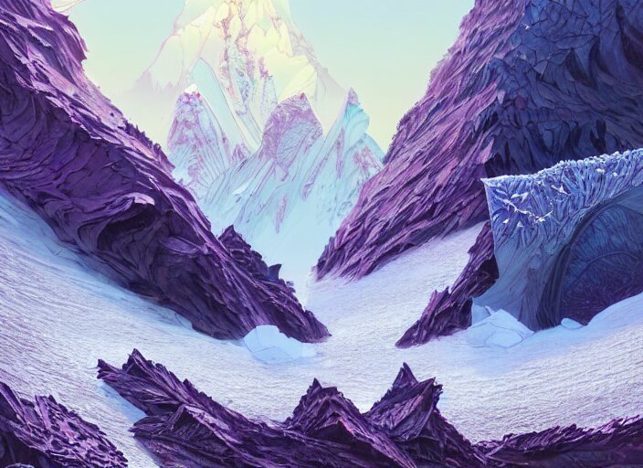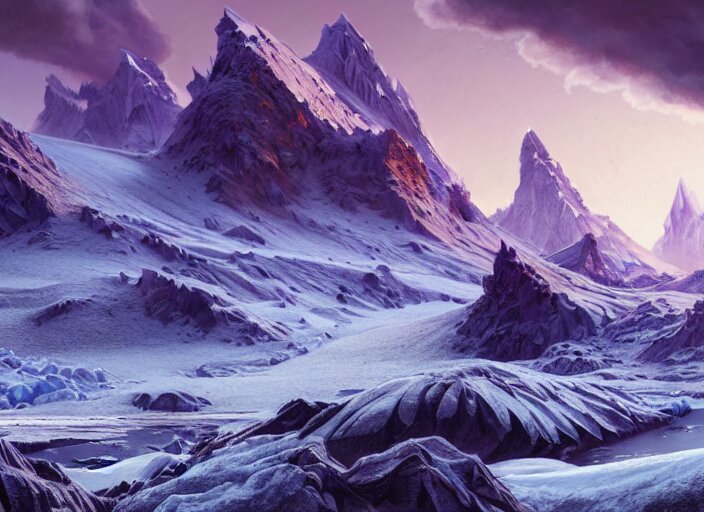 Detailed intricate digital illustration by greg rutkowski and wlop and sanford robinson gifford ; icy glacier landscape with shards of purple glistening geode sticking up from the ground like mountains, puffy clouds and snow ; 1 3 mm film, arri alfa anamorphic lens ; sharp focus, golden hour lighting, trending on artstation 4 k