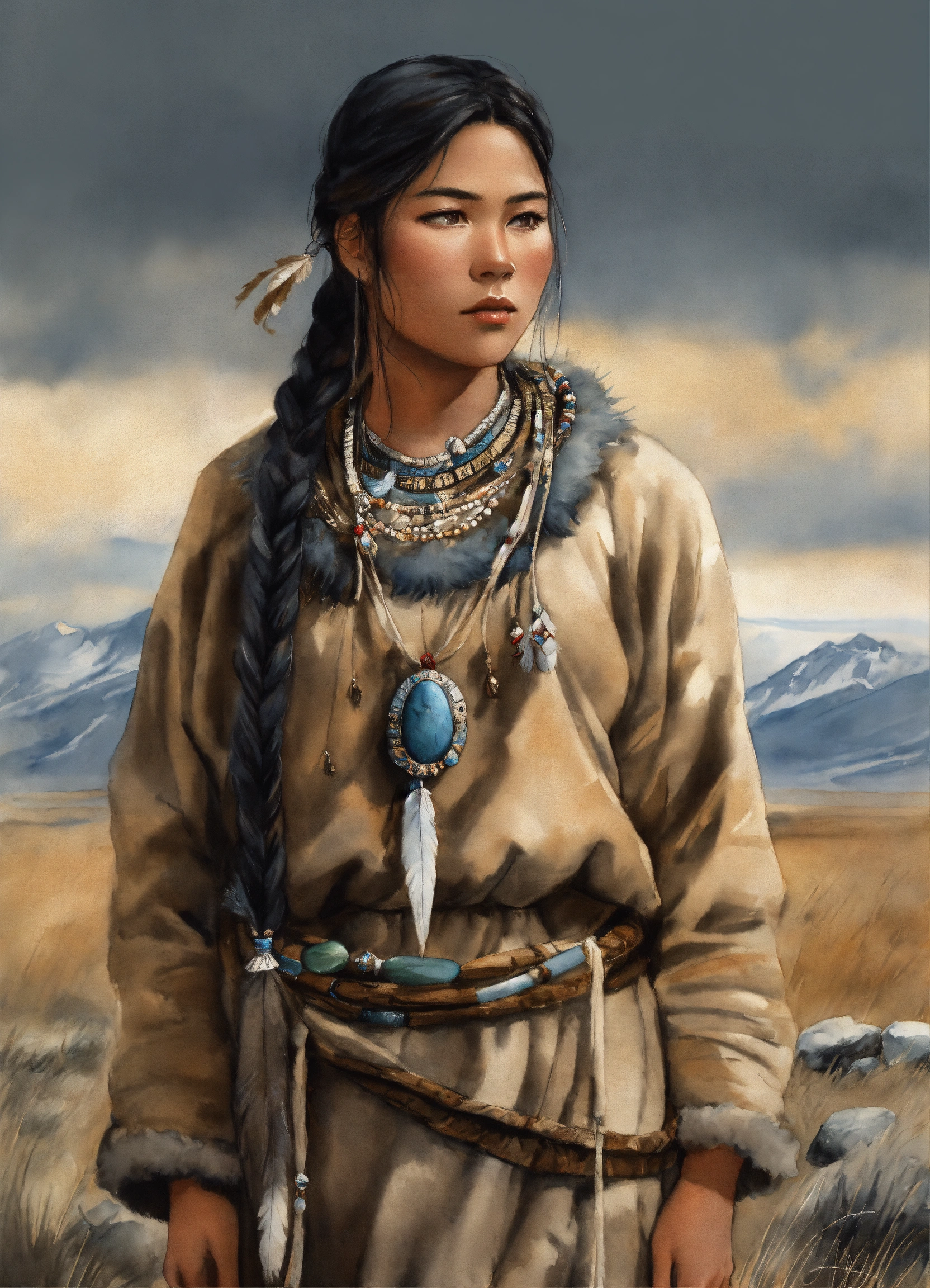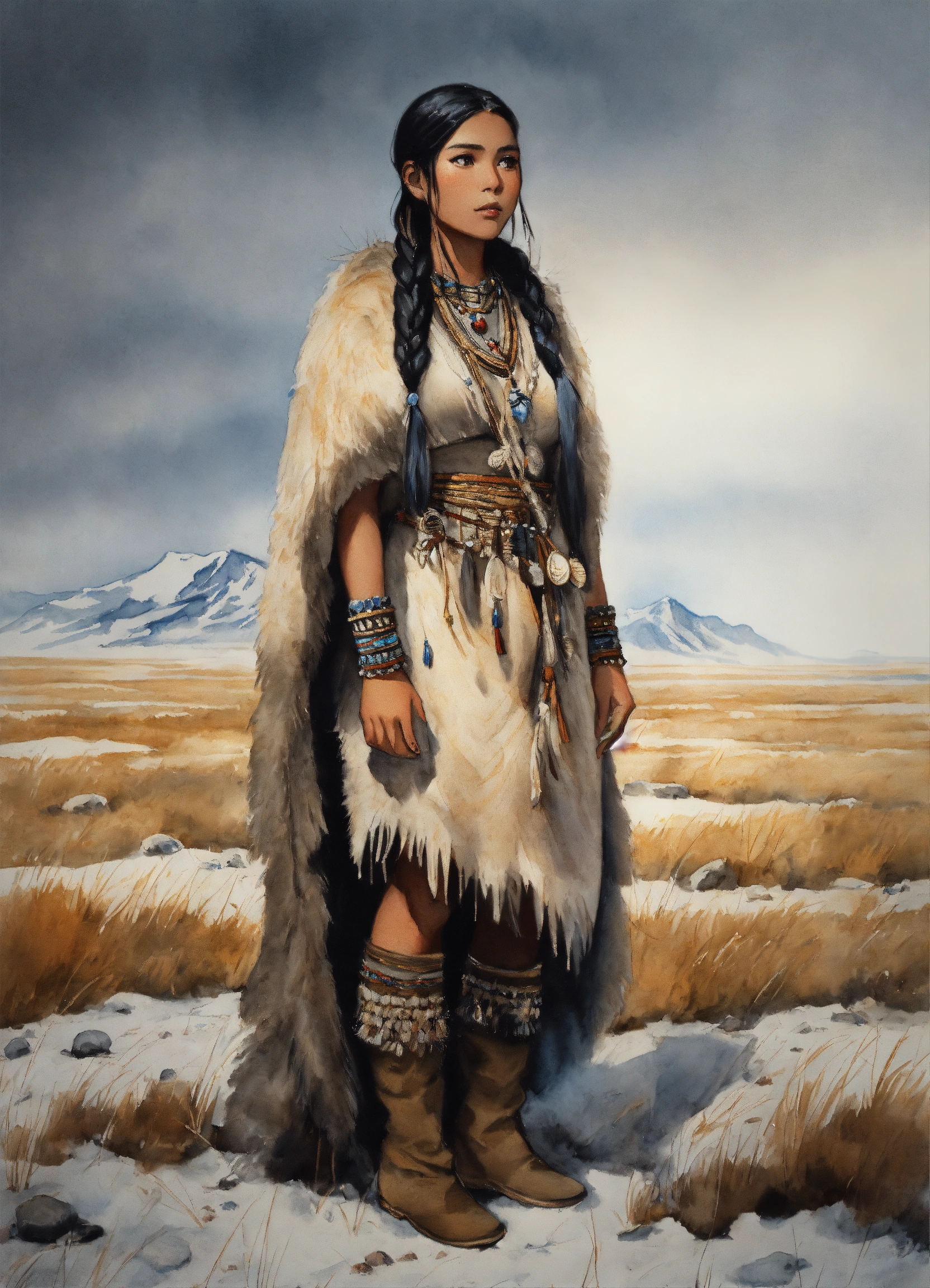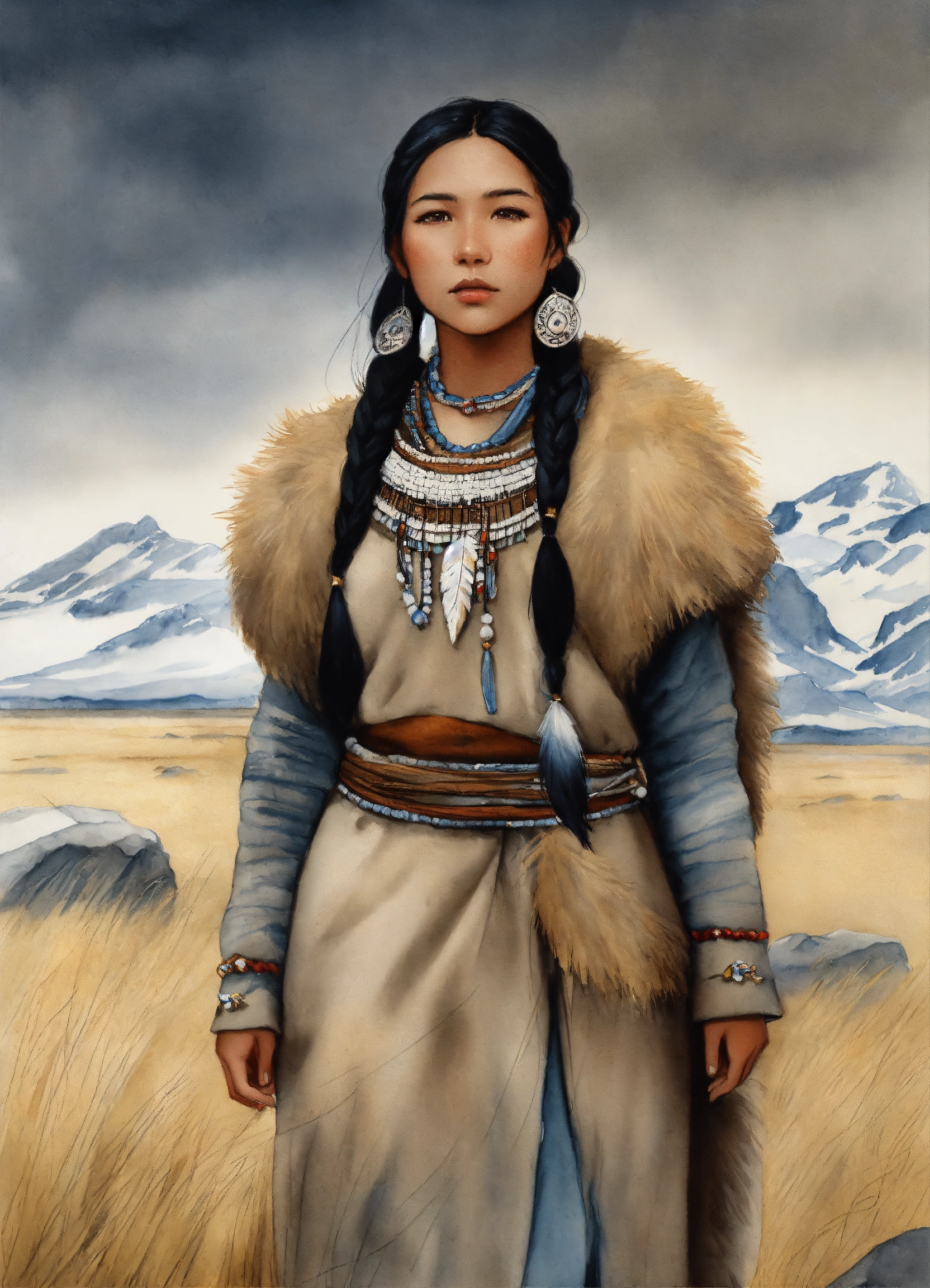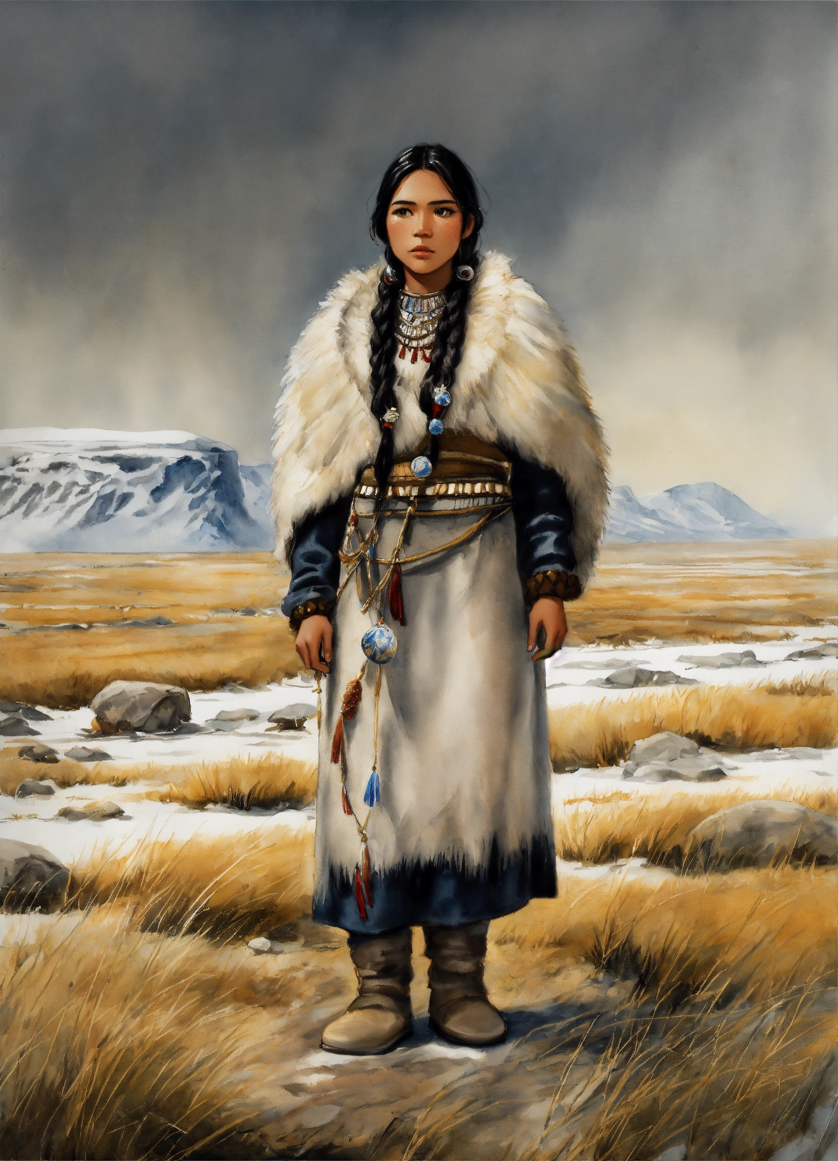 An inuit woman, young, 18 years old, beautiful, tall, almond skin tone, black braided hair, wearing stone age clothing adorned with feathers, beads and shells, stading on the tundra steppe. full body illustration by tom björklund, hand drawning, watercolor, gloomy and depressing, realistic painting.