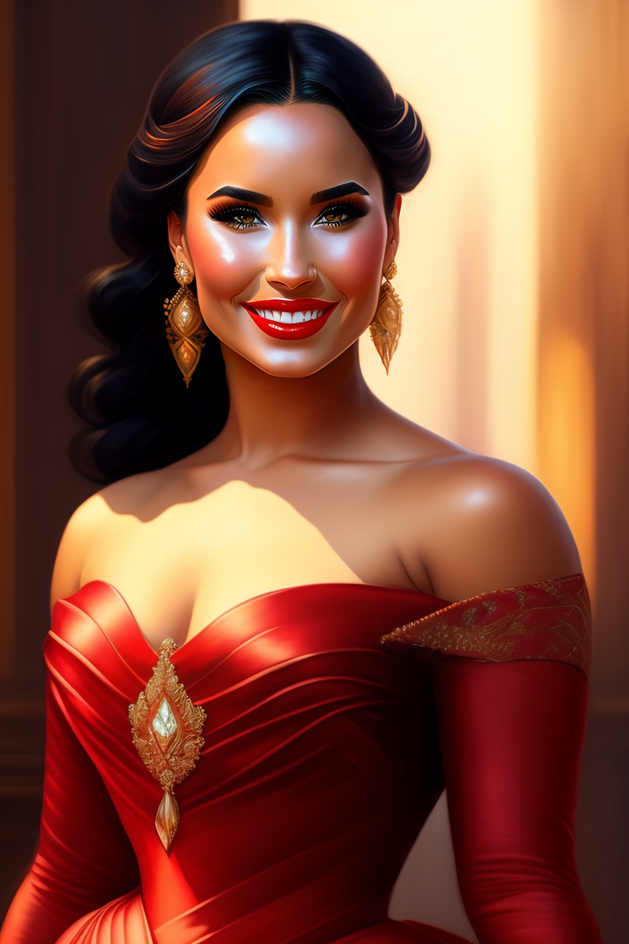 Demi lovato smiling in beautiful romanichal dress, ful body, red lips, intricate, elegant, highly detailed, digital painting, artstation, concept art, smooth, sharp focus, illustration, art by artgerm and greg rutkowski and alphonse mucha and william - adolphe bouguereau