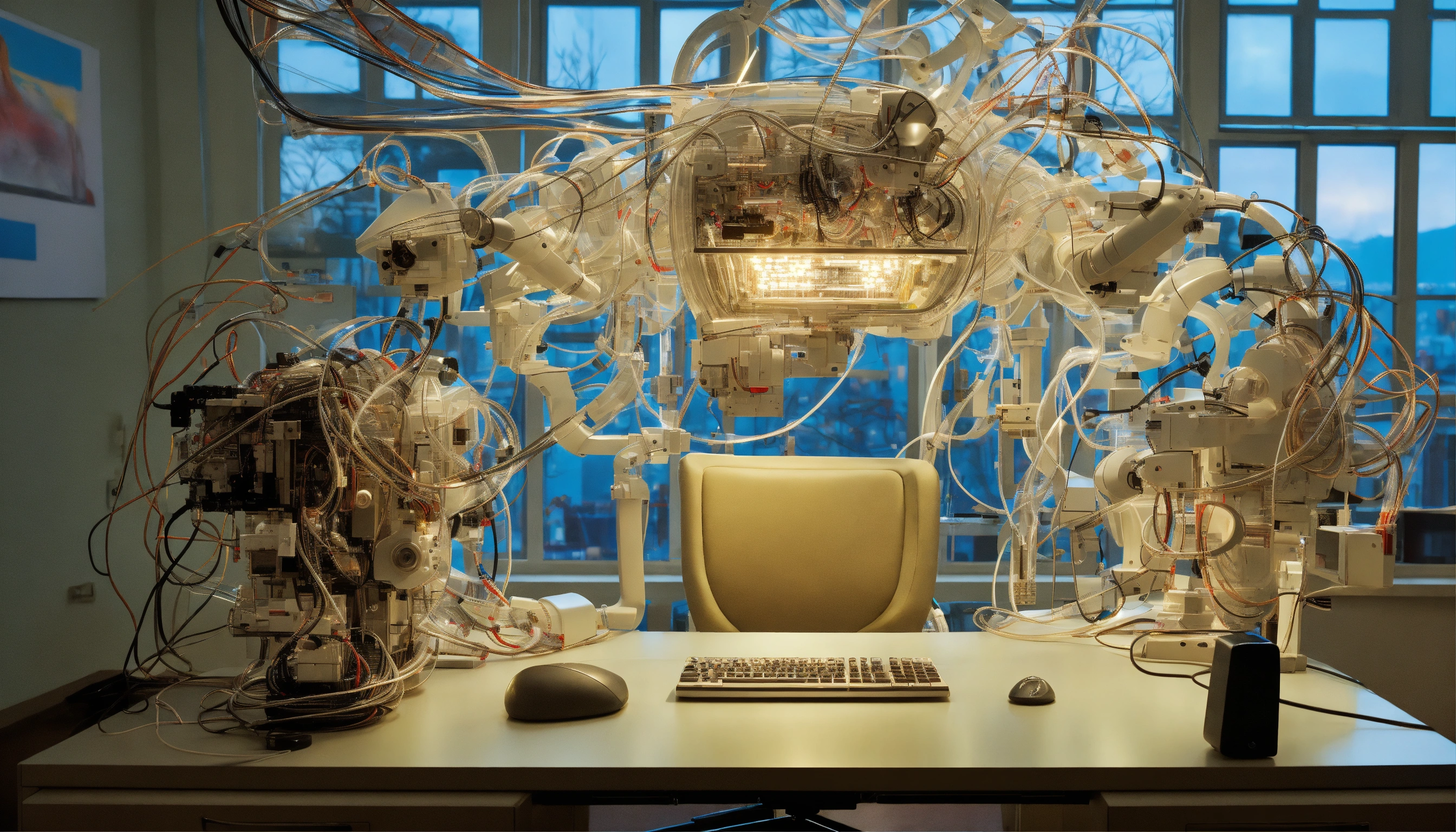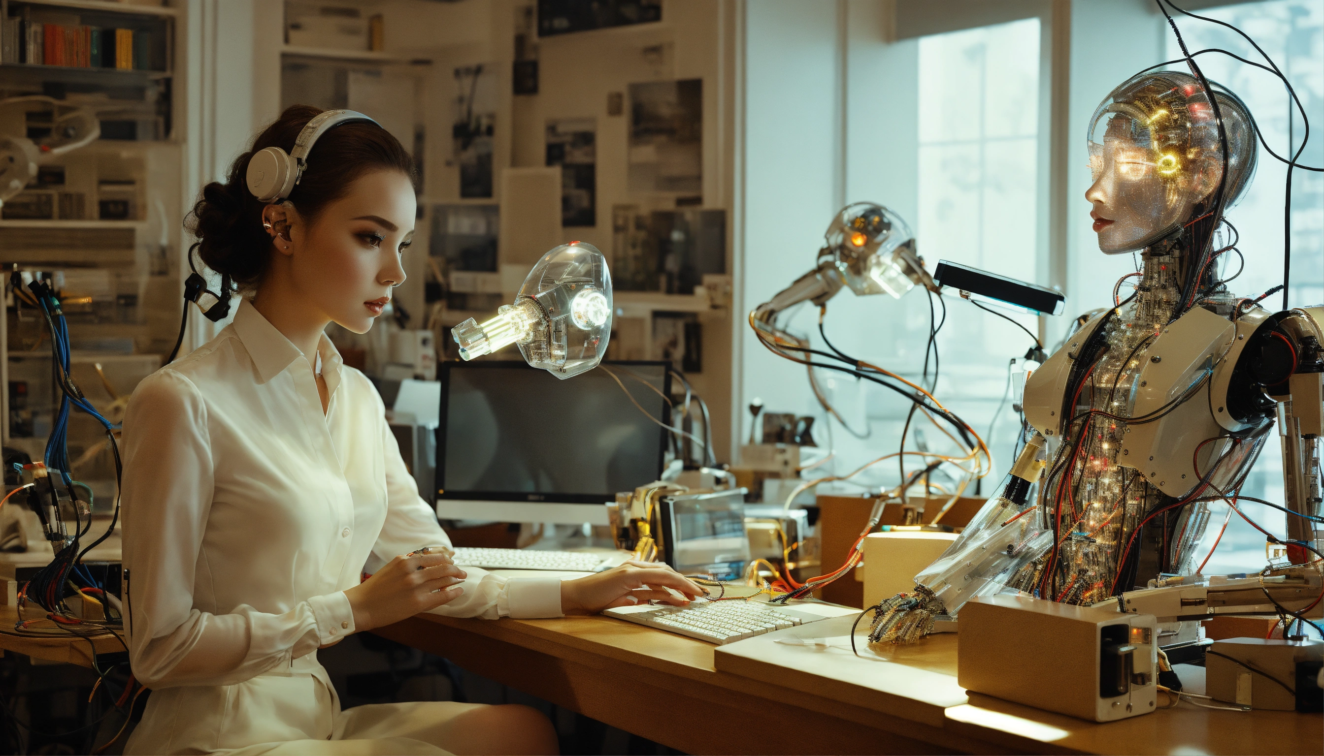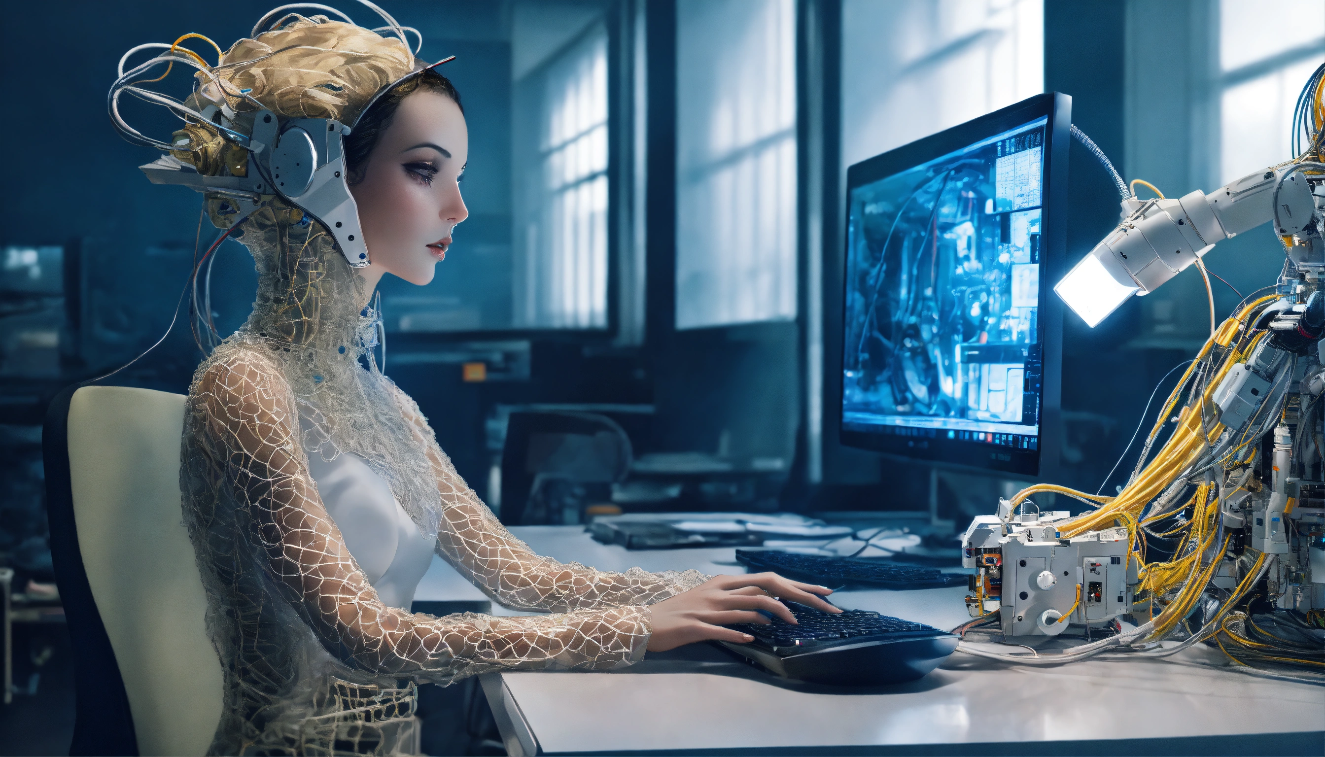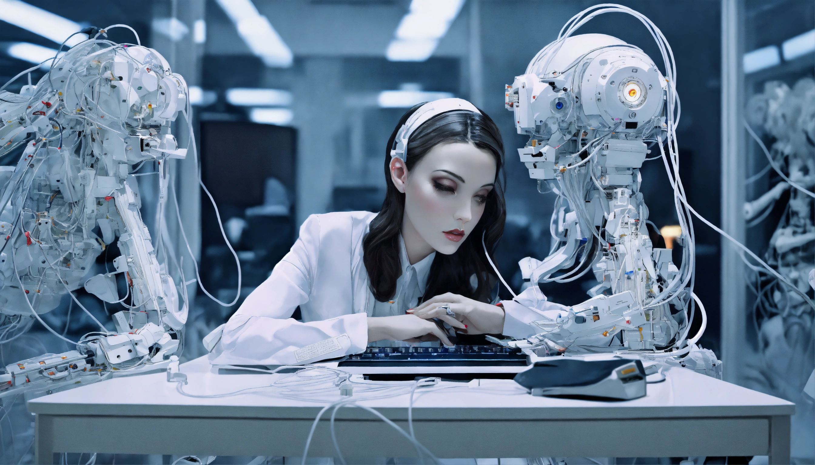 Body portrait photography, in an office full of cables and wires and led, driving a carbon motor head attractive transparent white plexiglass secretary robots typing, 80 degree view, art by sergio lopez, natalie shau, james jean and salvador dali
