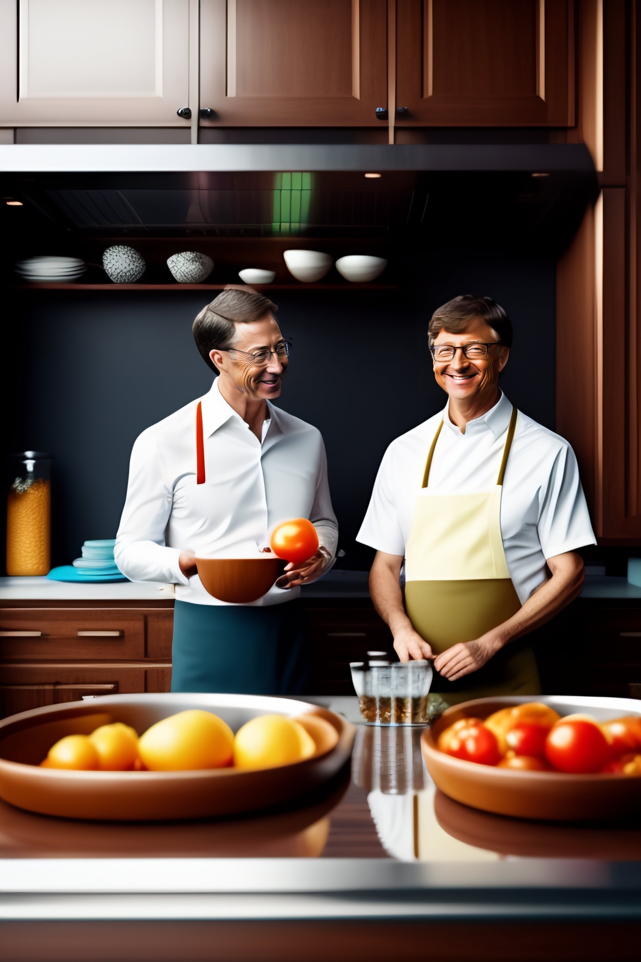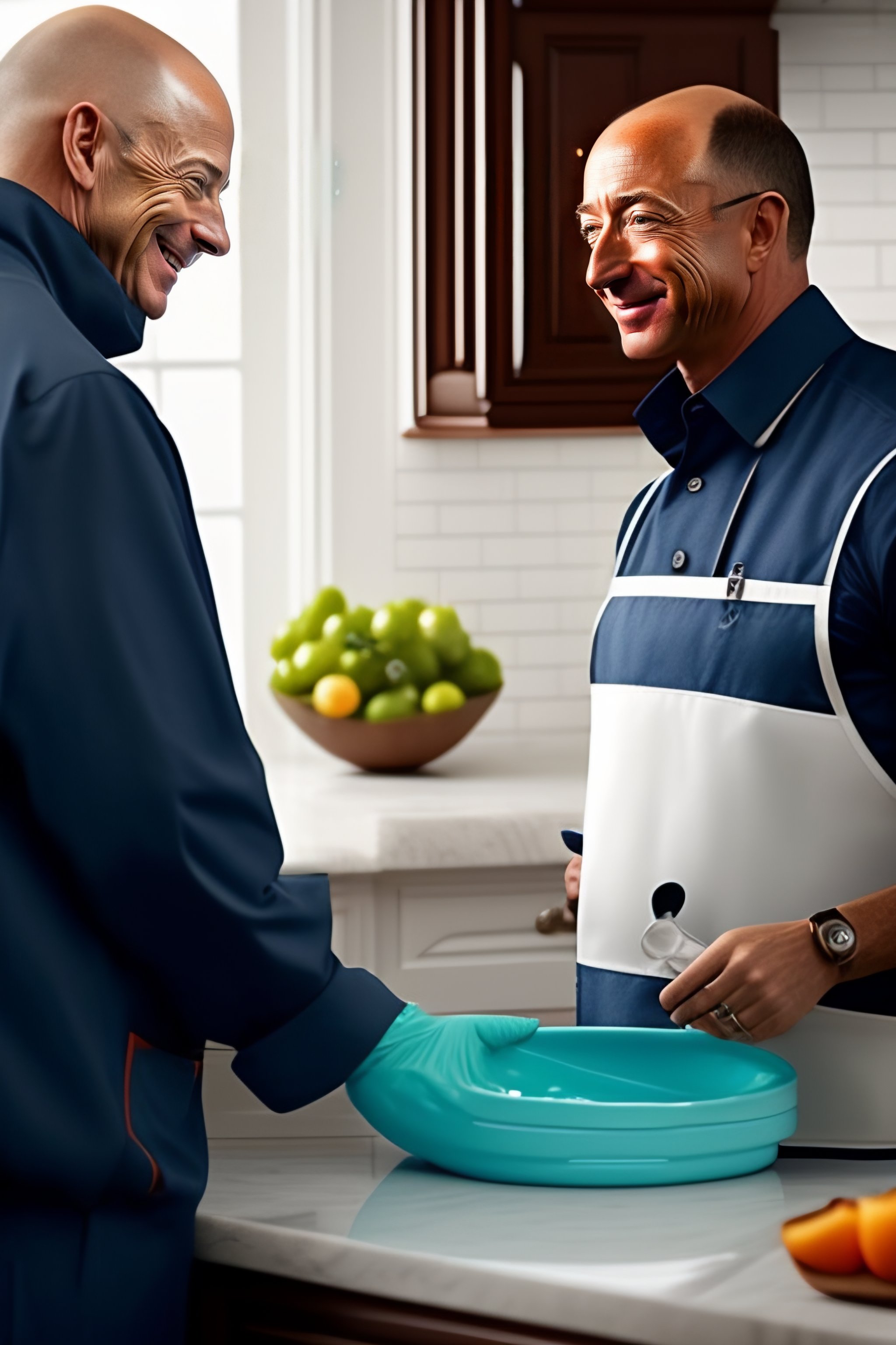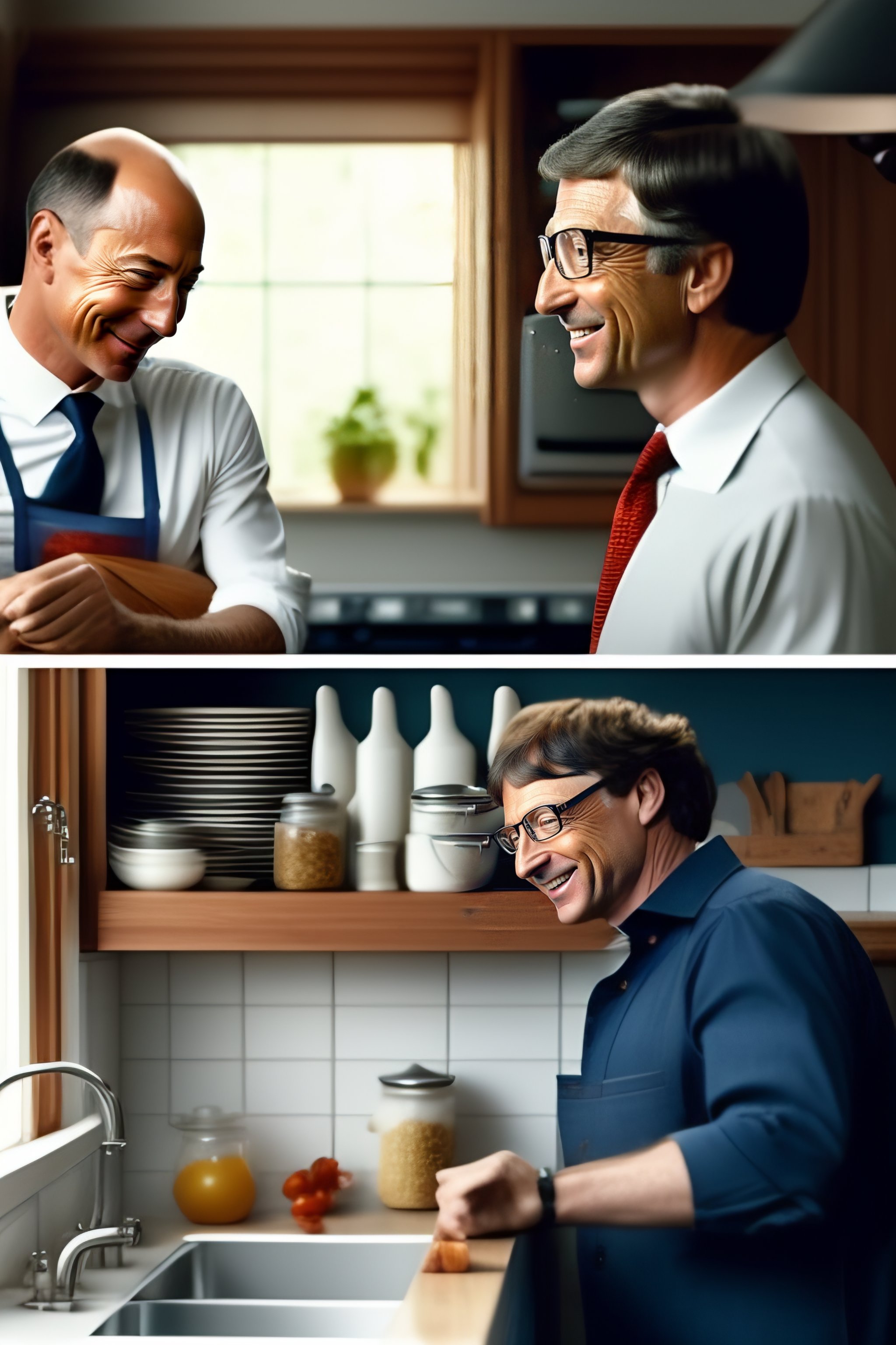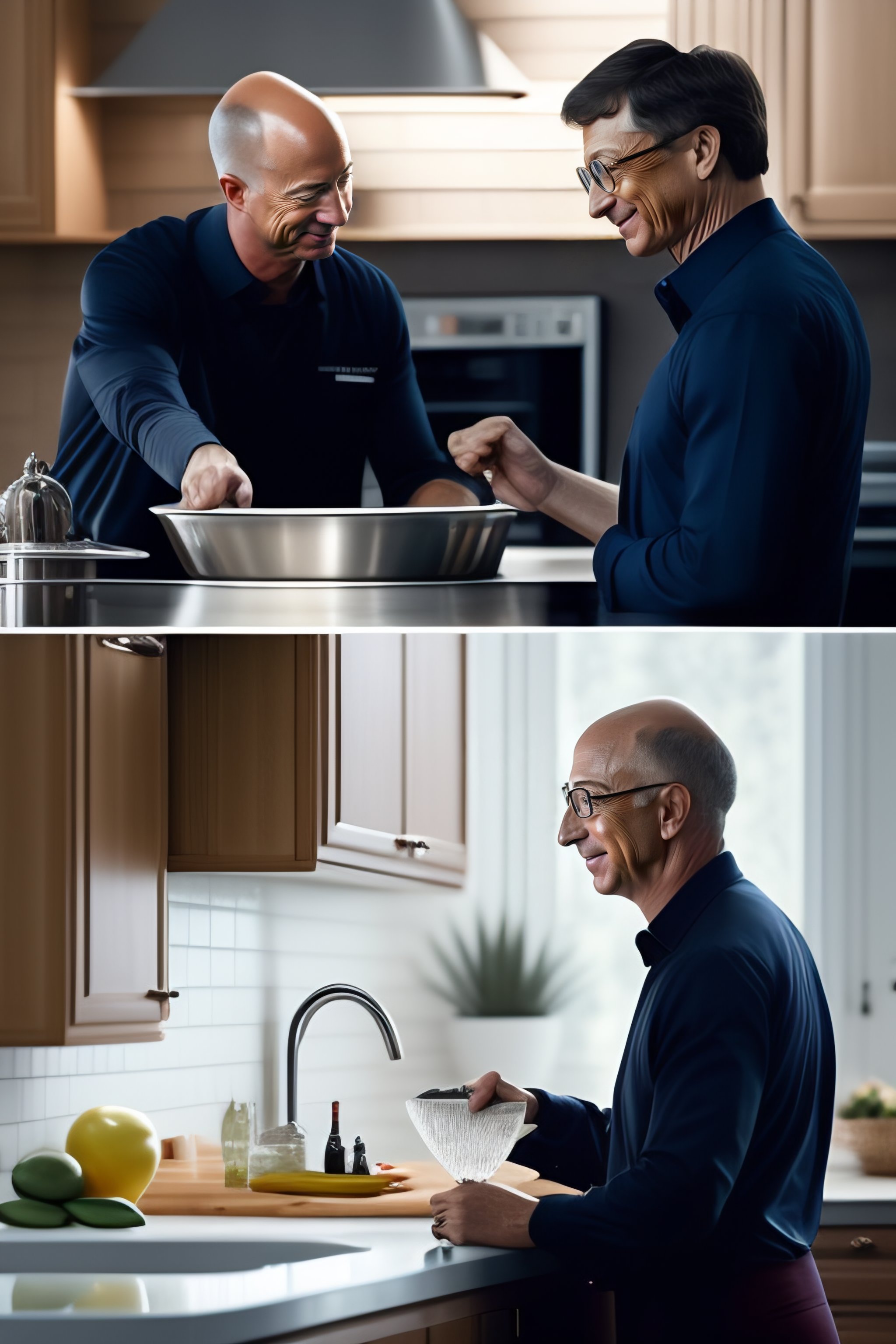 Jeff bezos and bill gates washing the dishes while wearing kitchen assistant clothes