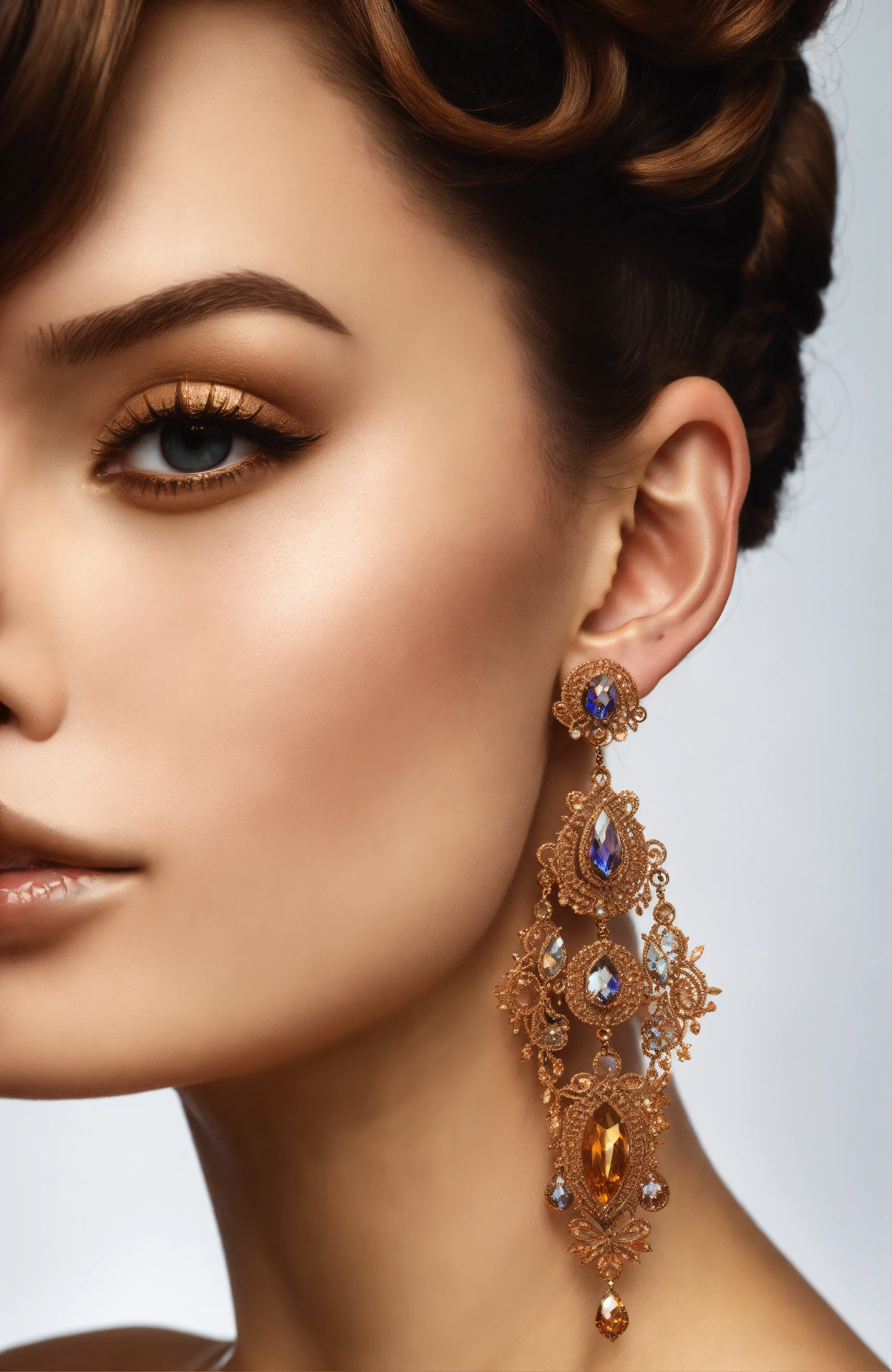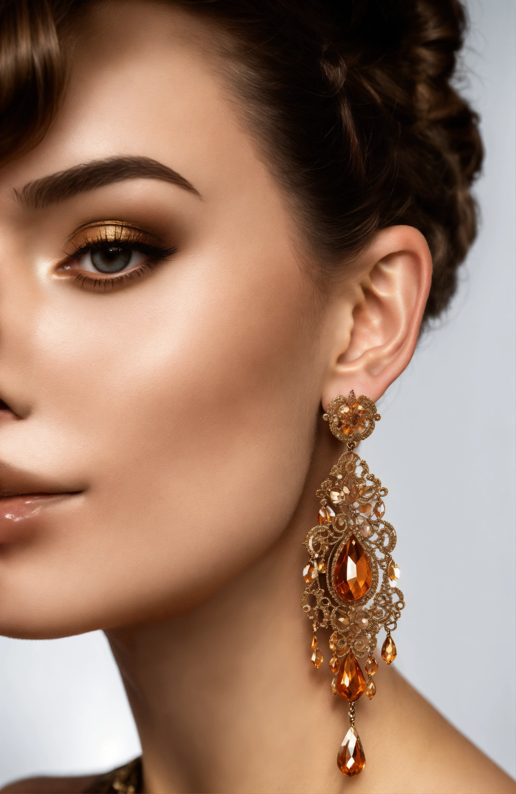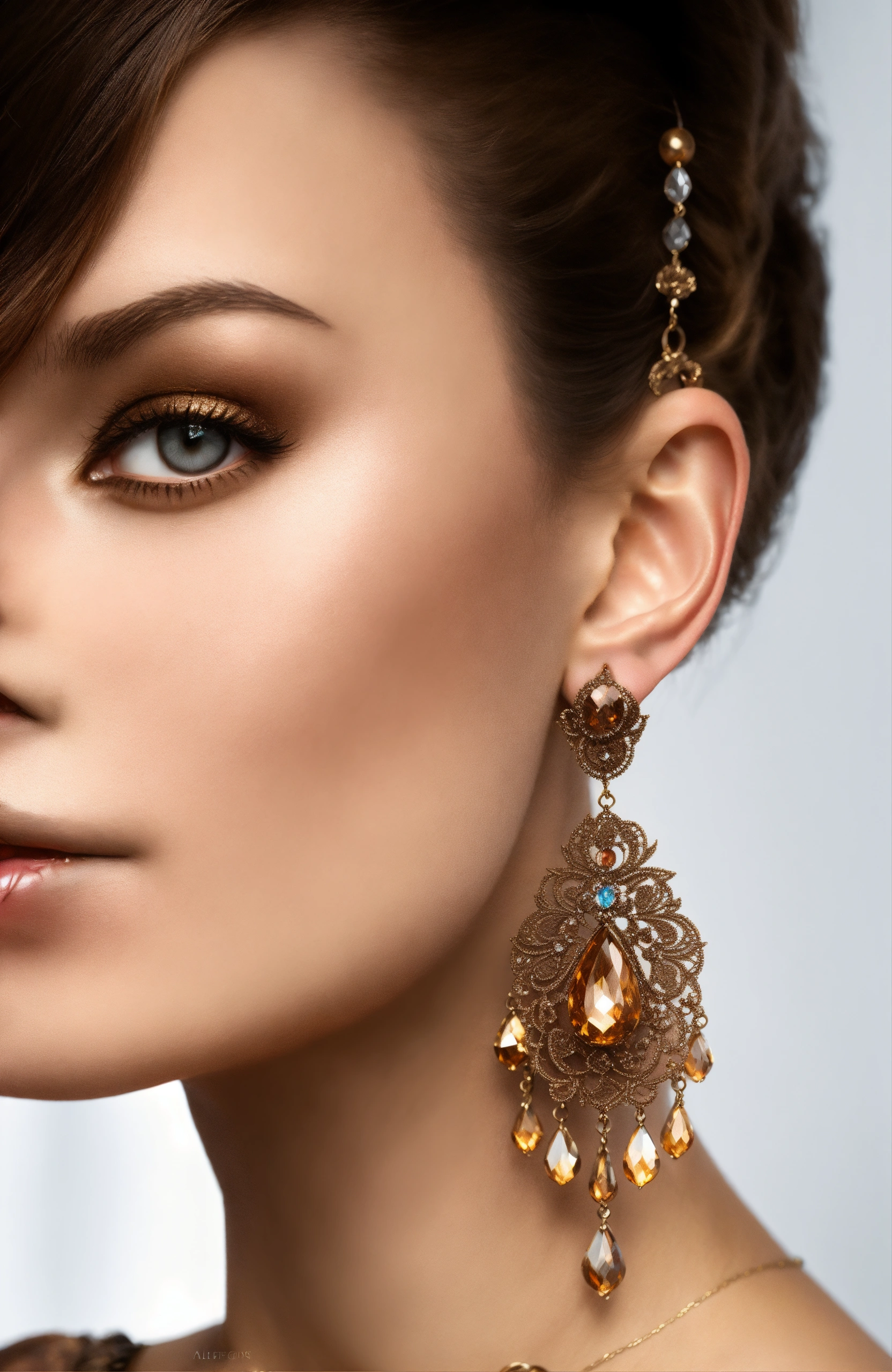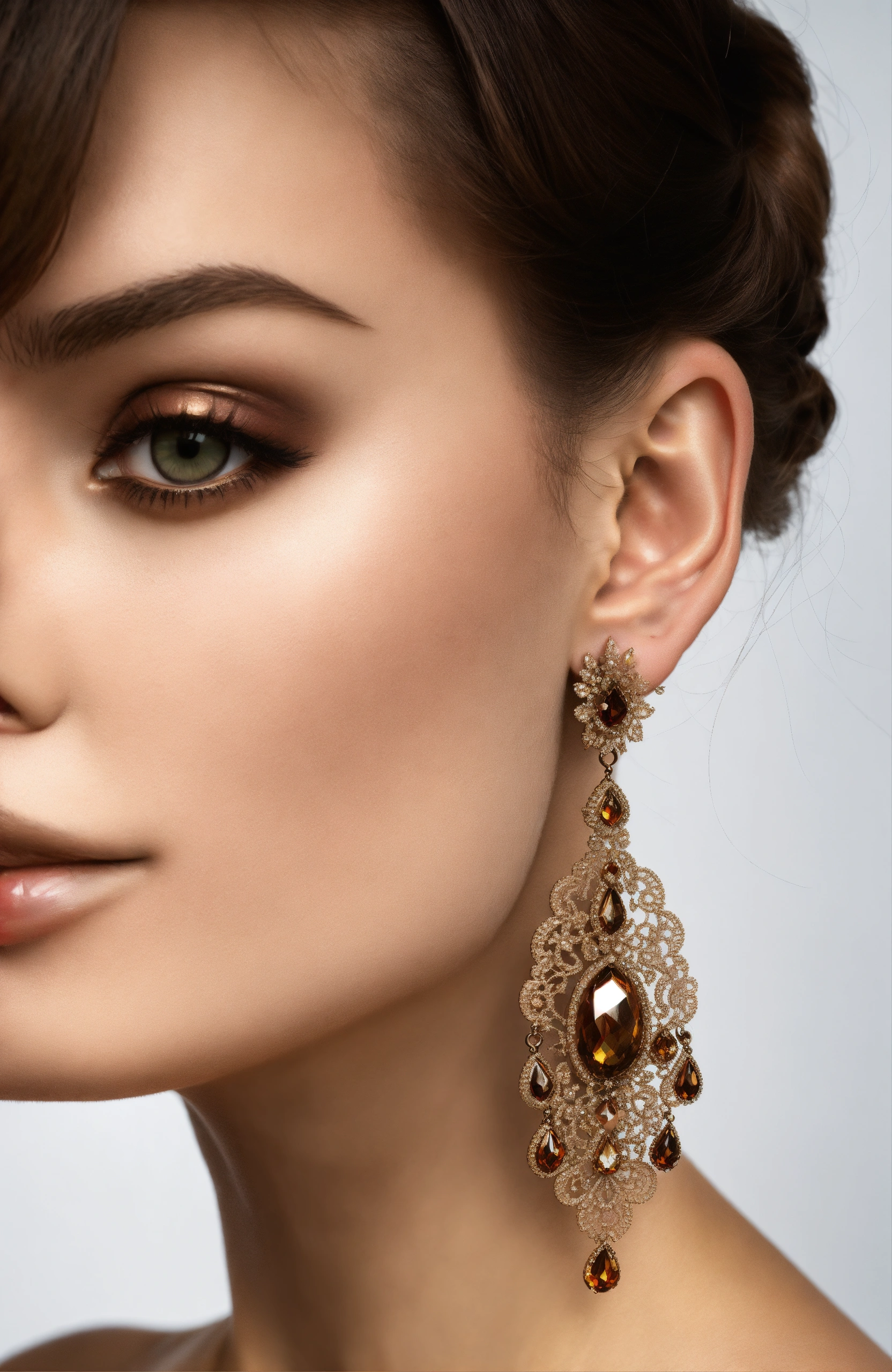 A fashion victorian style pretty woman portrait wearing luxurious detailed shades of bronze venetian lace earrings decorated with champaign color crystals in the style of liam sharp, dutch tradition, webcam, gail simone, mark seliger, alfons mucha inspired 8k, high resolution, dark background