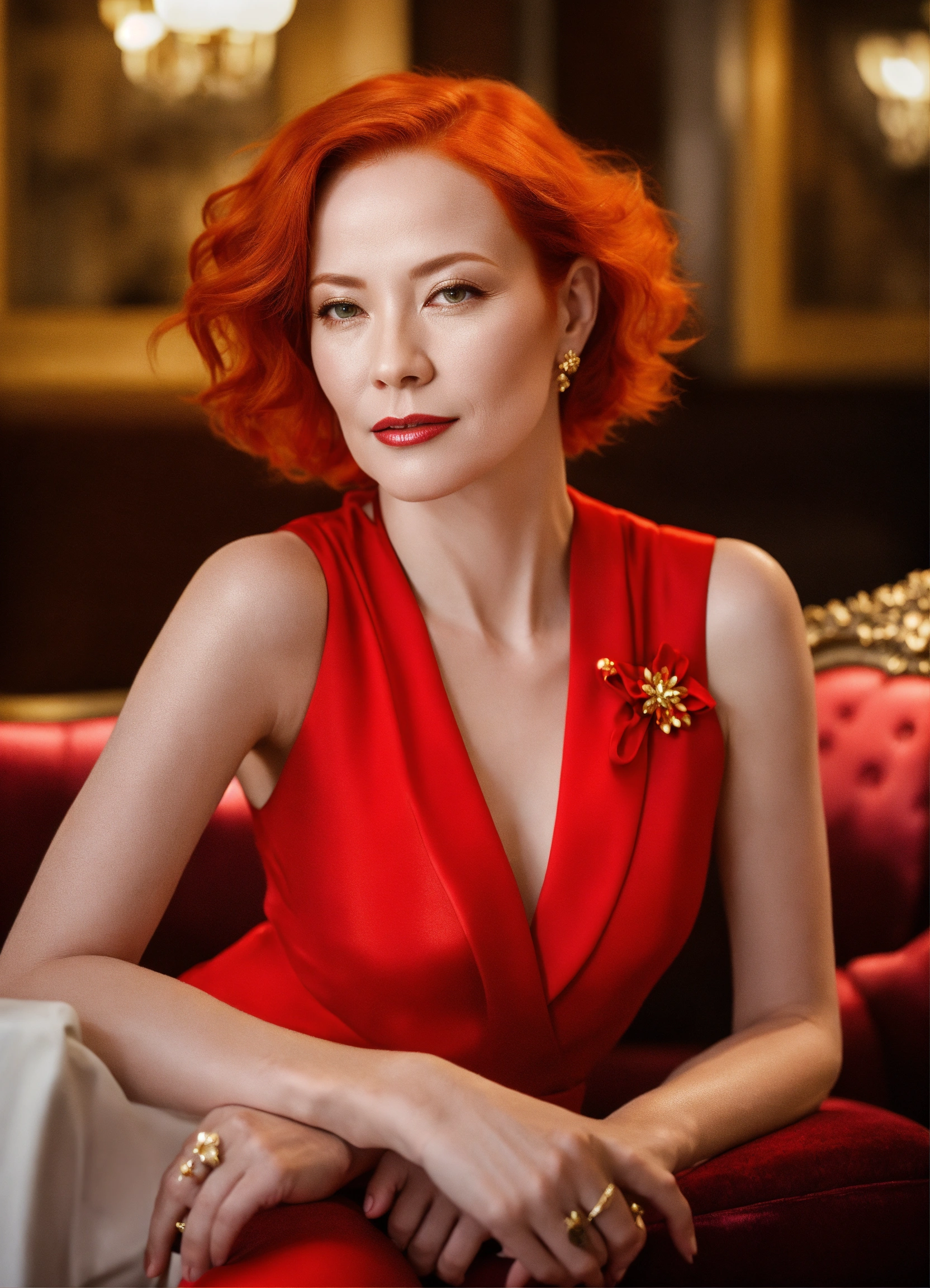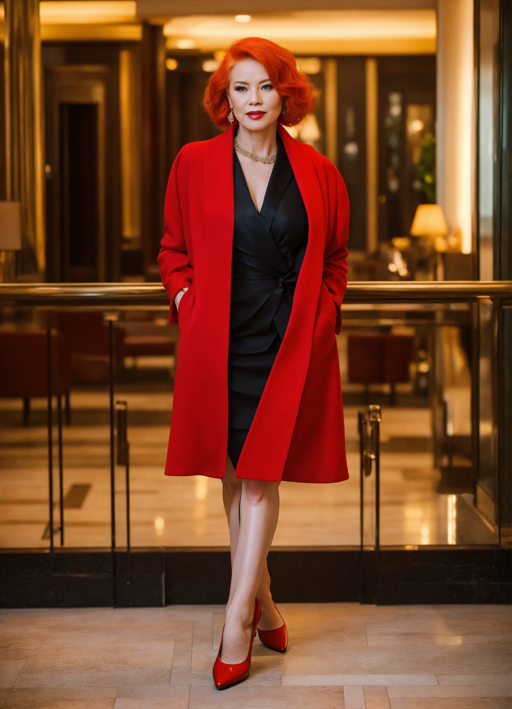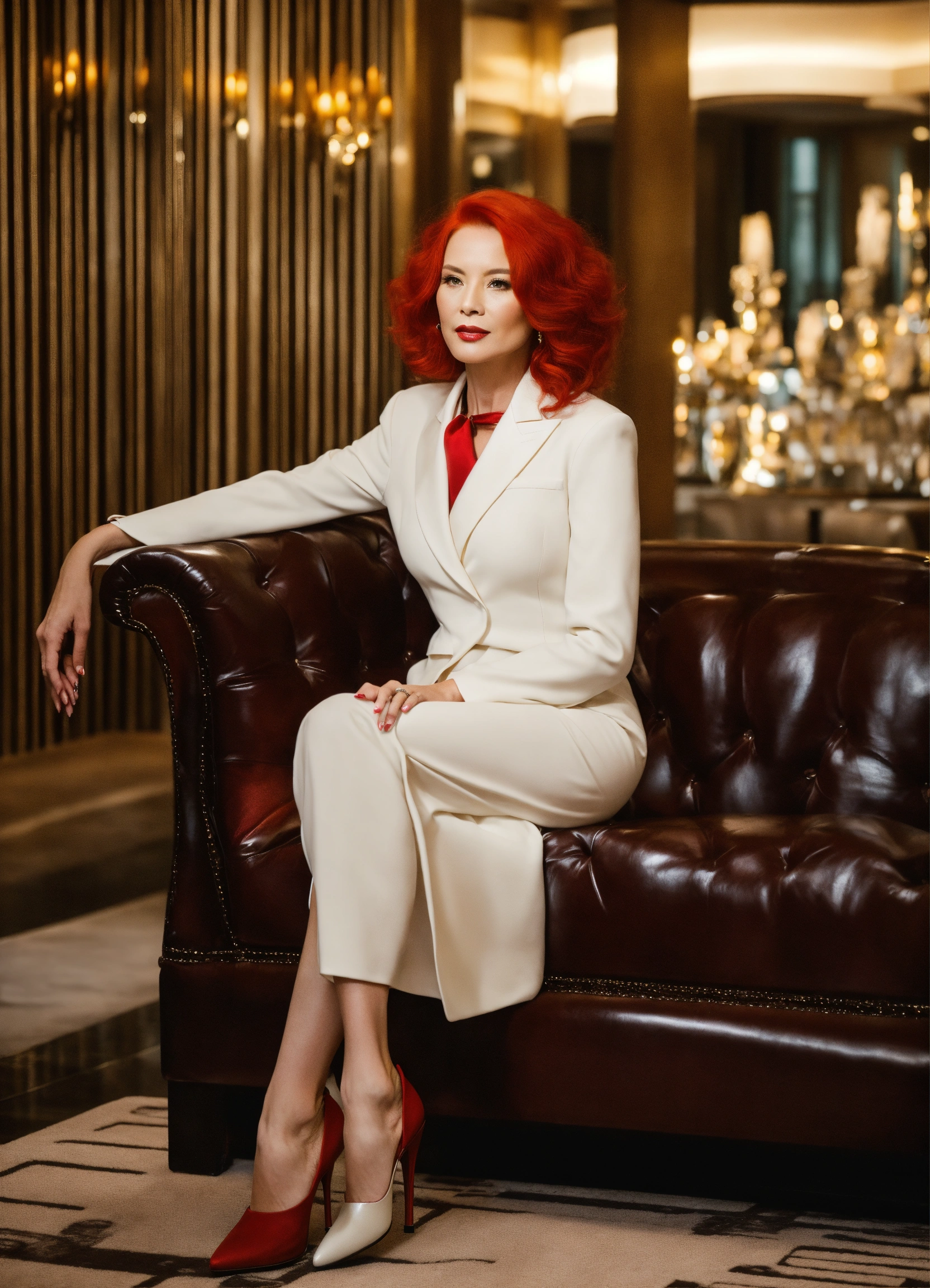 Gorgeous 50-year-old female, chalk-white albino skin, red hair, european features, thin build, haute couture sui and heels, in upscale lobby. pompous demeanor