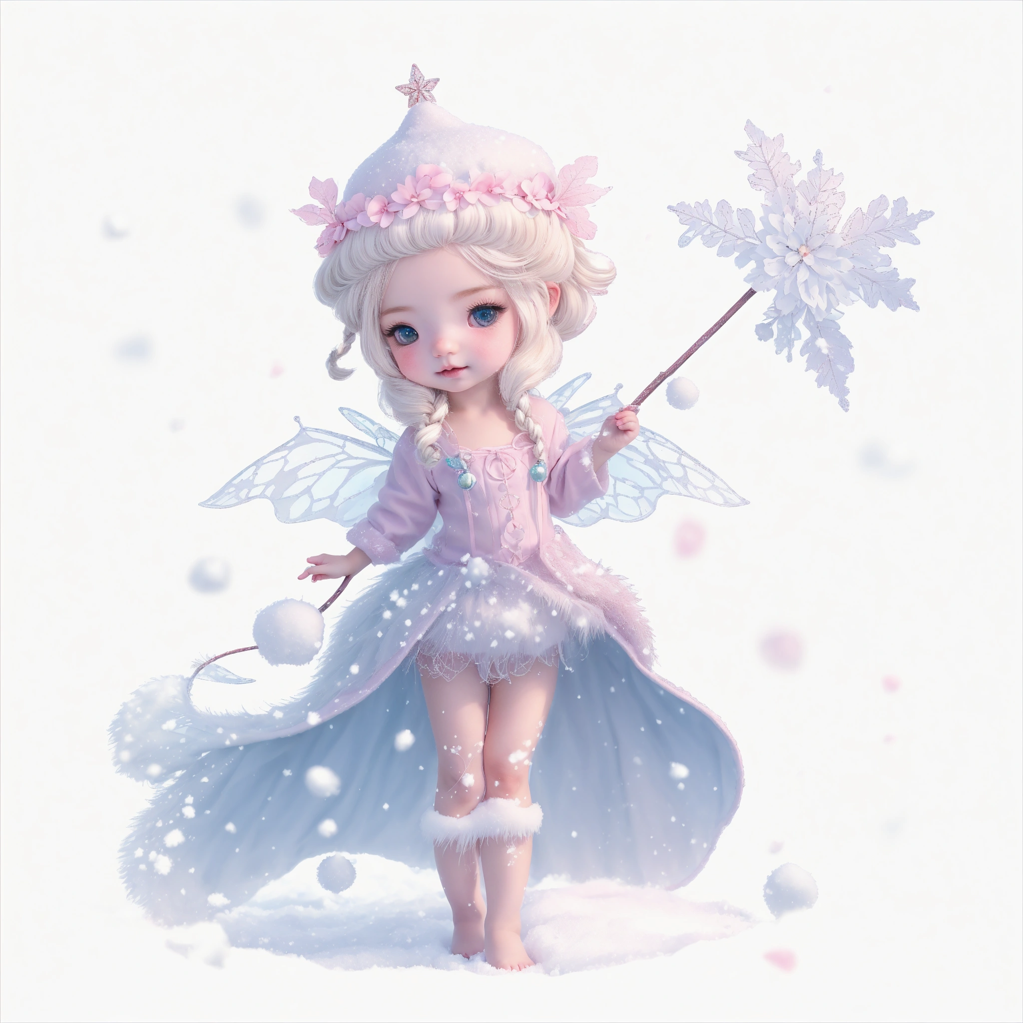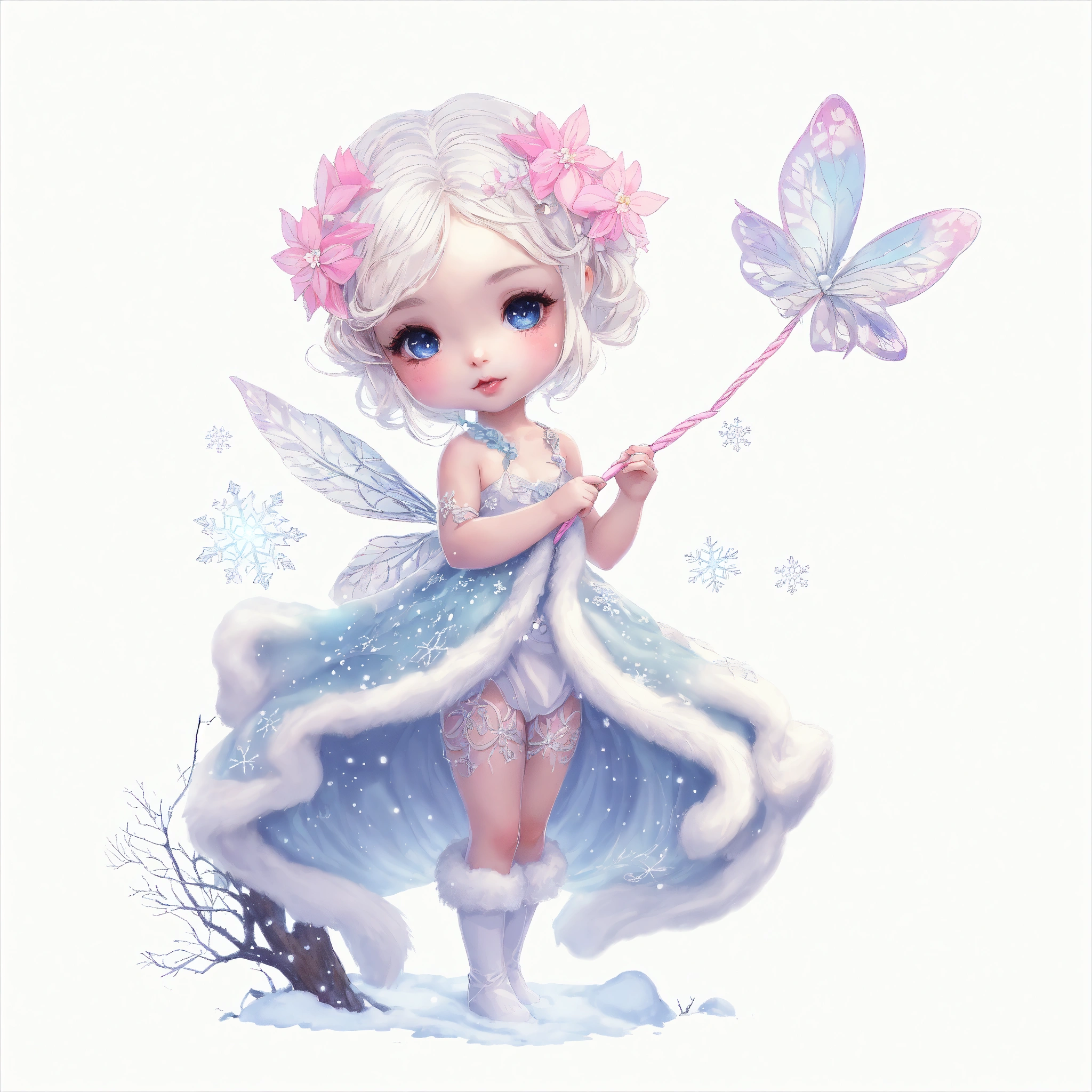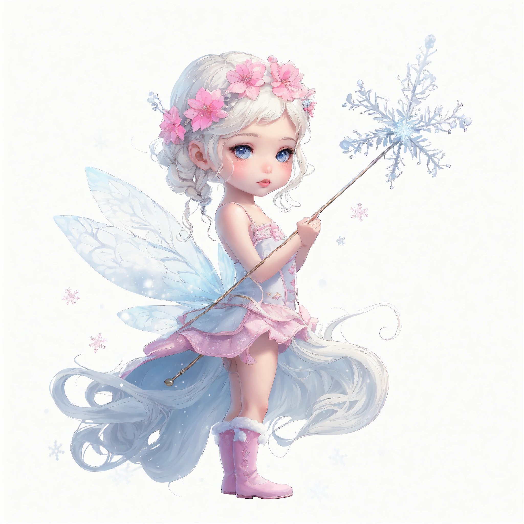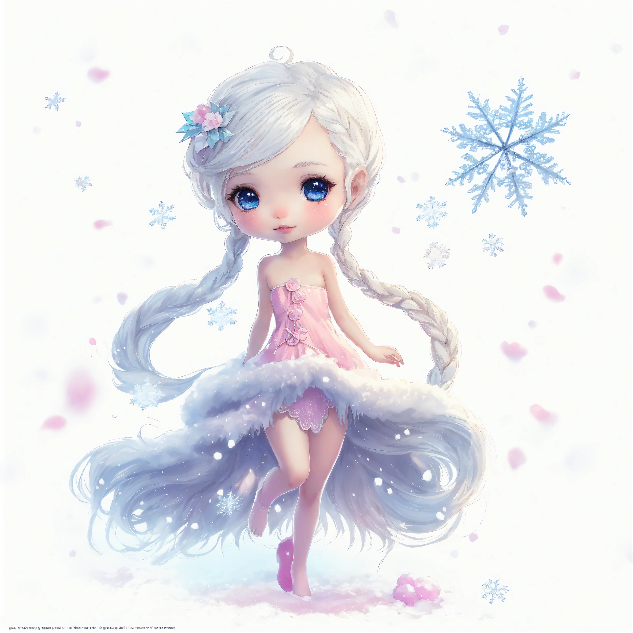 Full body of a realistic sweetness baby chibi snow fairy girl winter freckled two braids in her long white blonde hair she is playing in a enchanted winter magic garden, clipart digital art style, pink colors, very detailed, by stanley artgerm and tom bagshaw, 32k