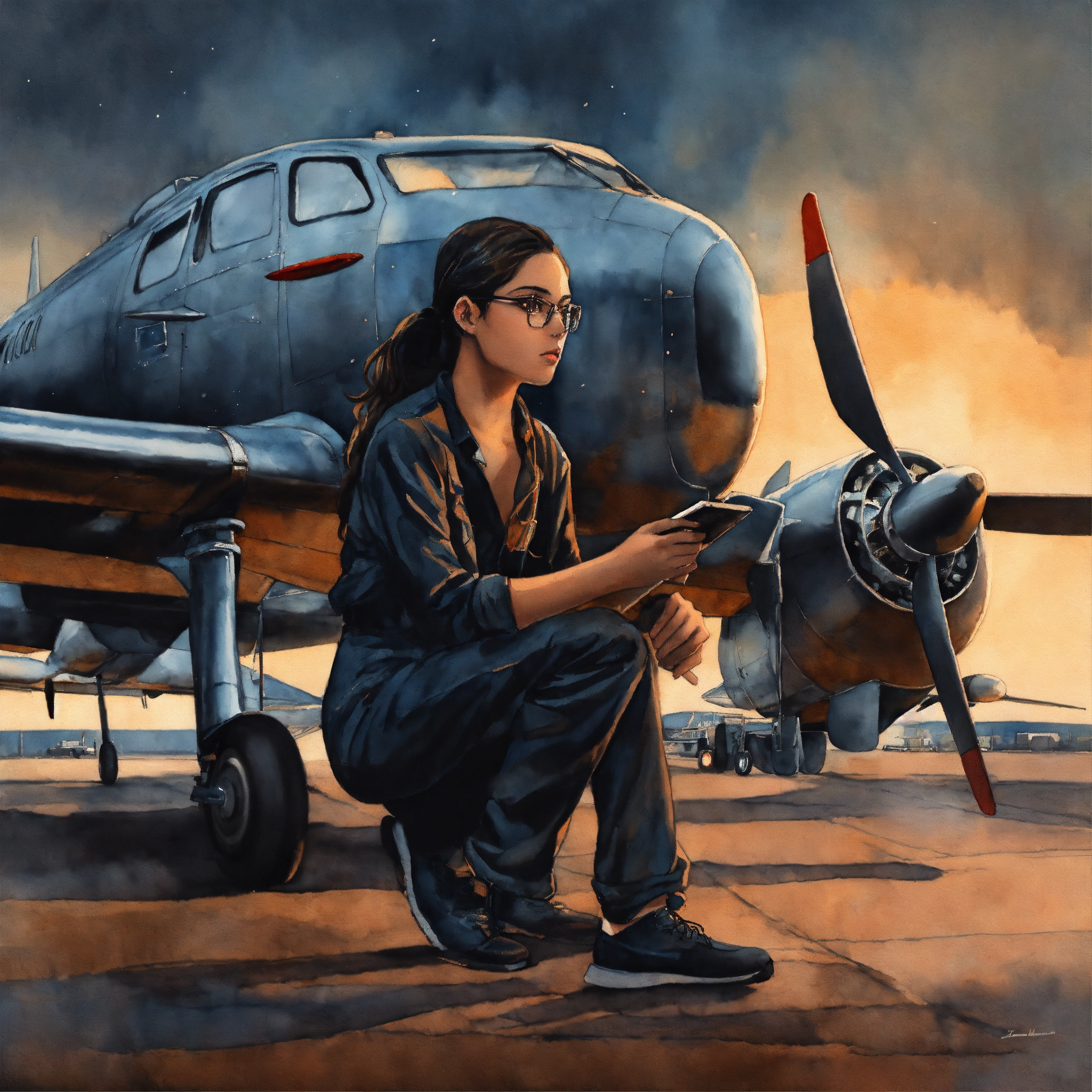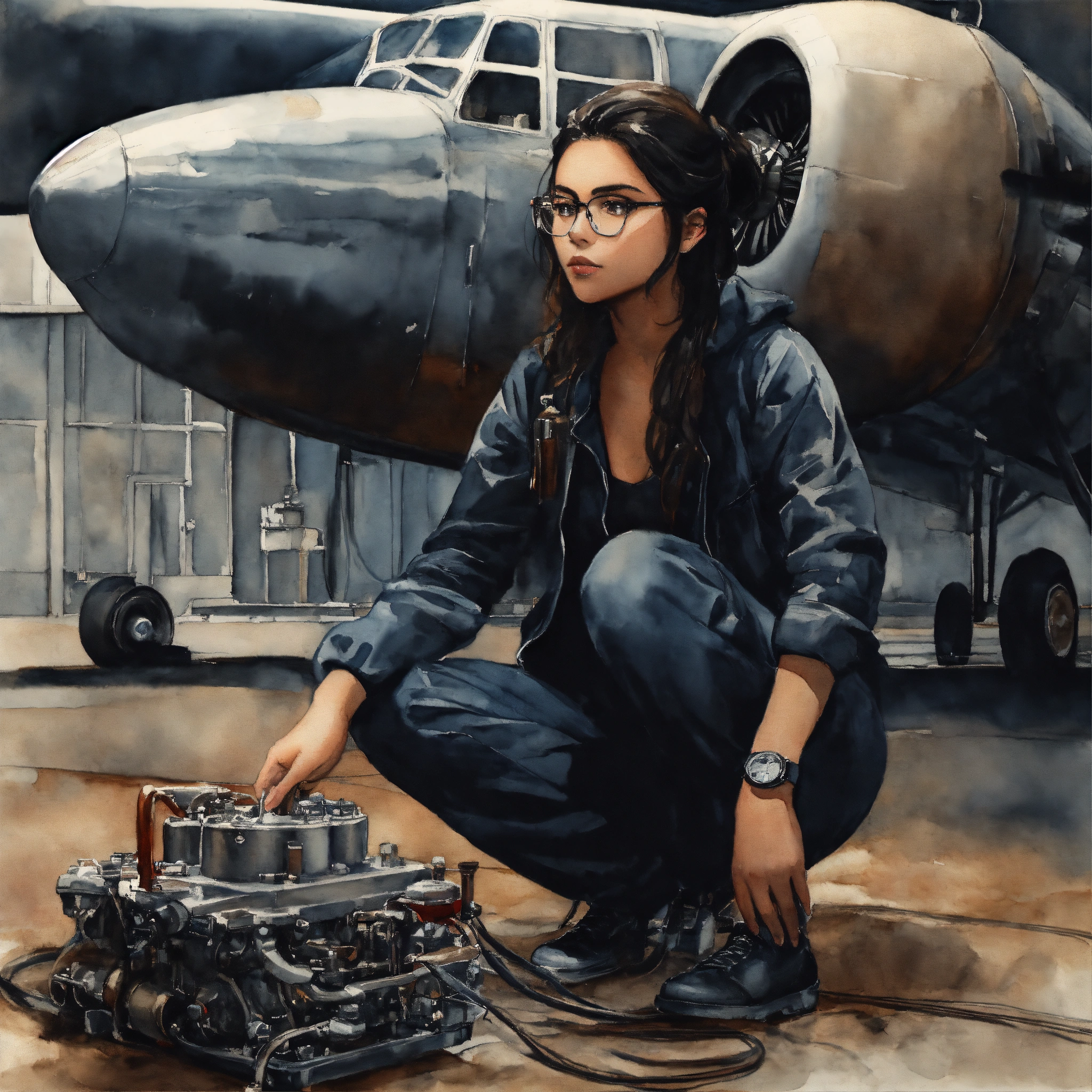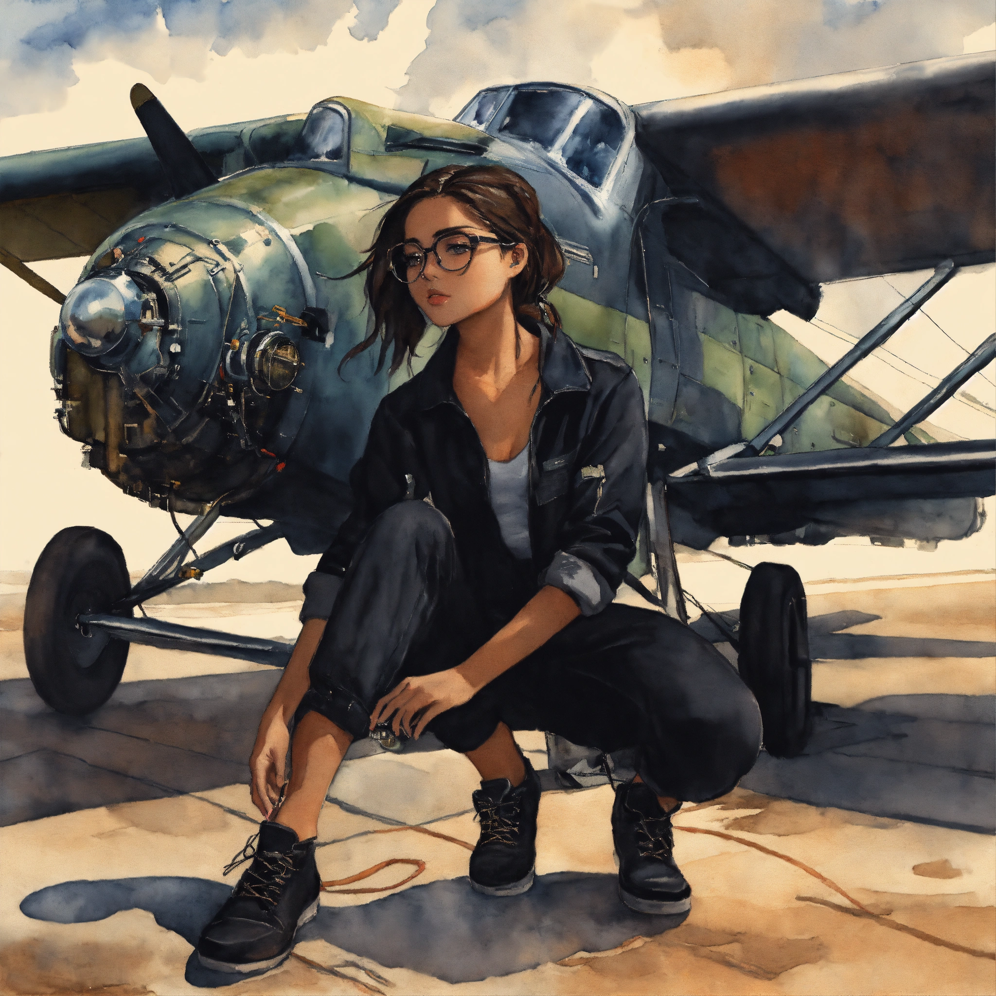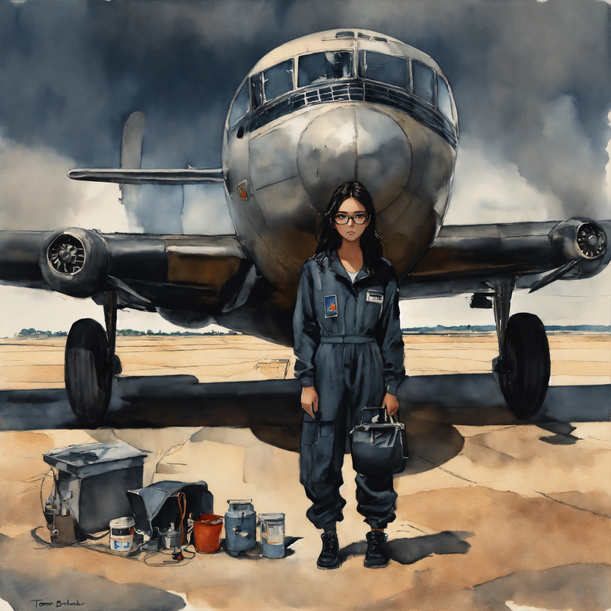 Full body illustration of a woman, young, 18 years old, beautiful, latino phenotype, wearing a black jumpsuit and glasses, preparing an airplane engine, watercolors, gloomy and depressing ambient, artwork by tom björklund