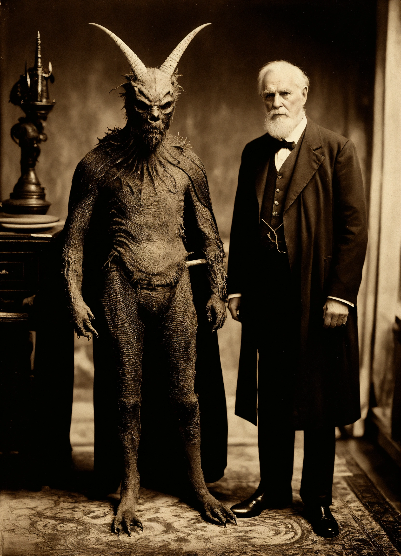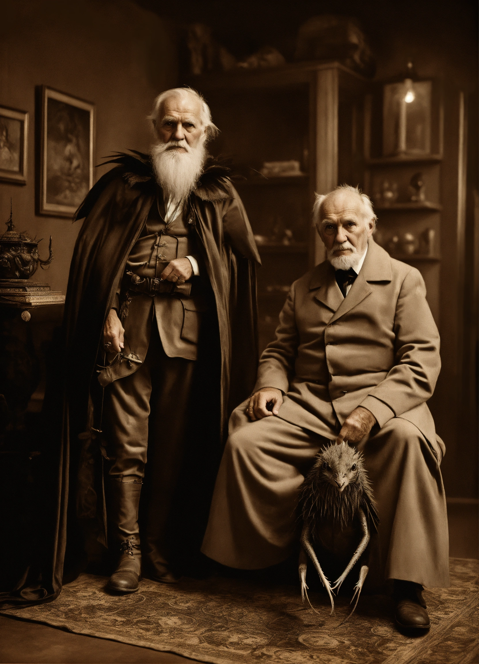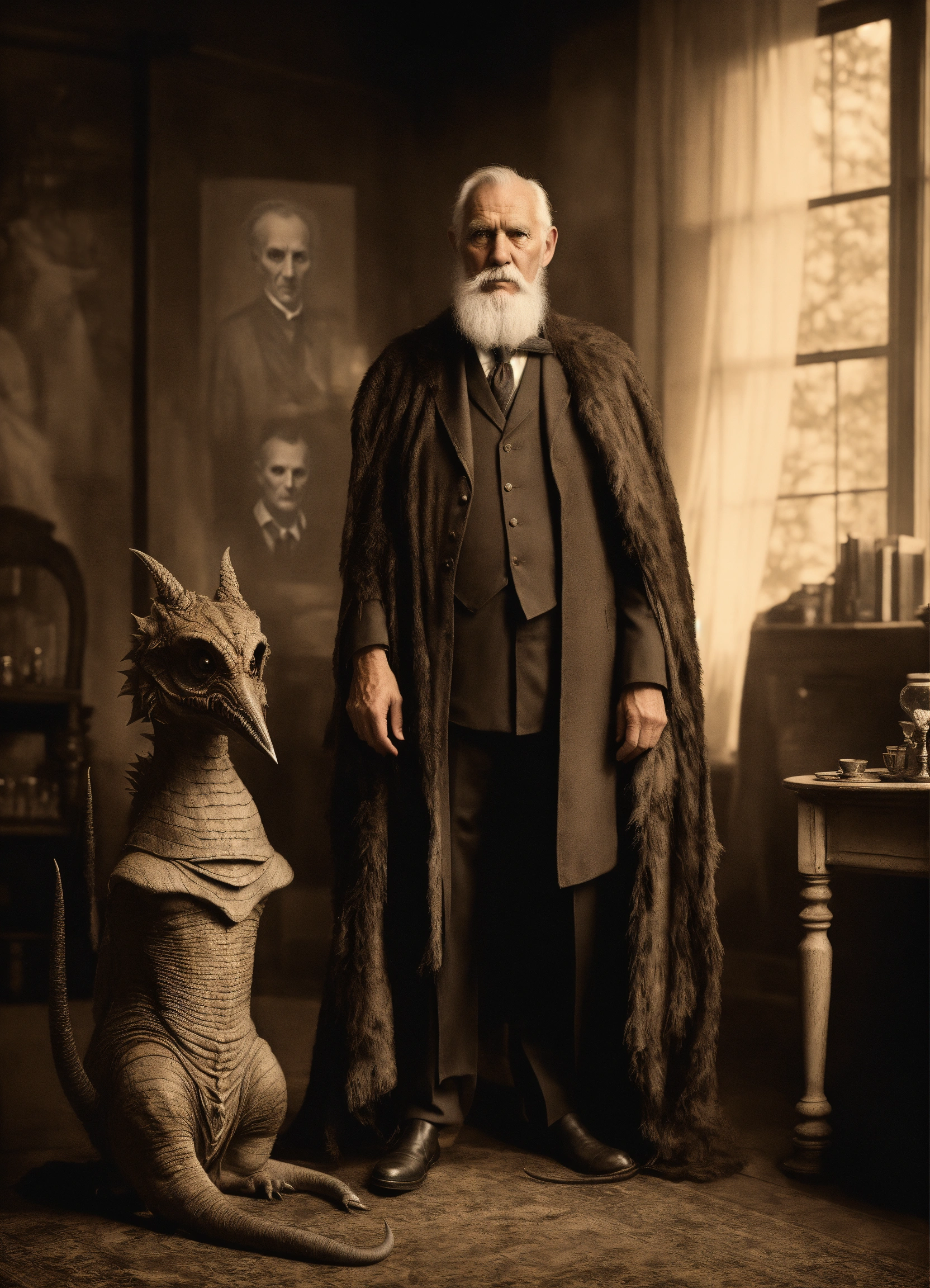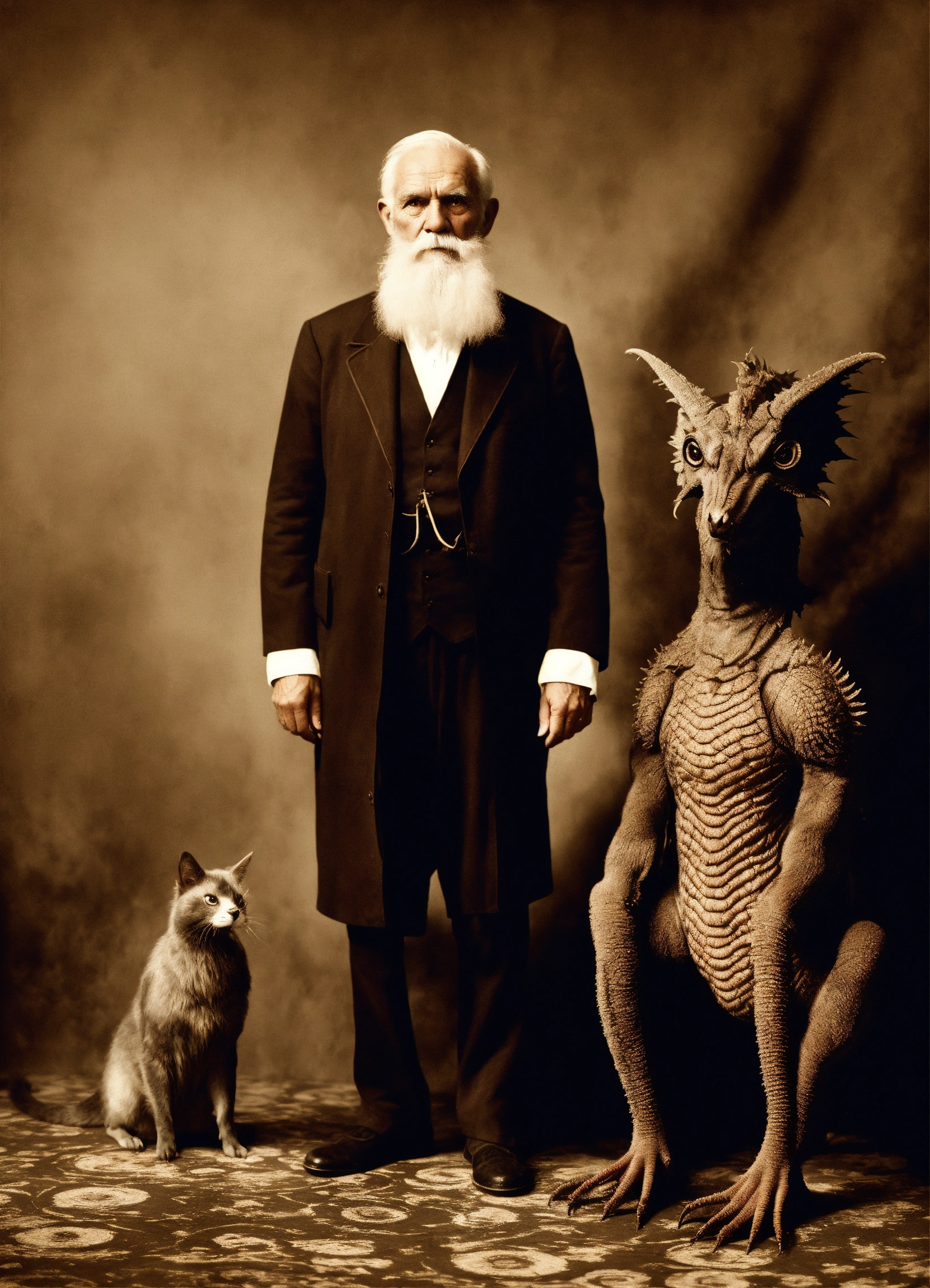Old man wearing a superhero costume standing next to anstrange creature, in the style of contemporary vintage photography, necronomicon illustrations, tabletop photography, 1890, hyperrealistic animal portraits, ghostly presence, whirring contrivances
