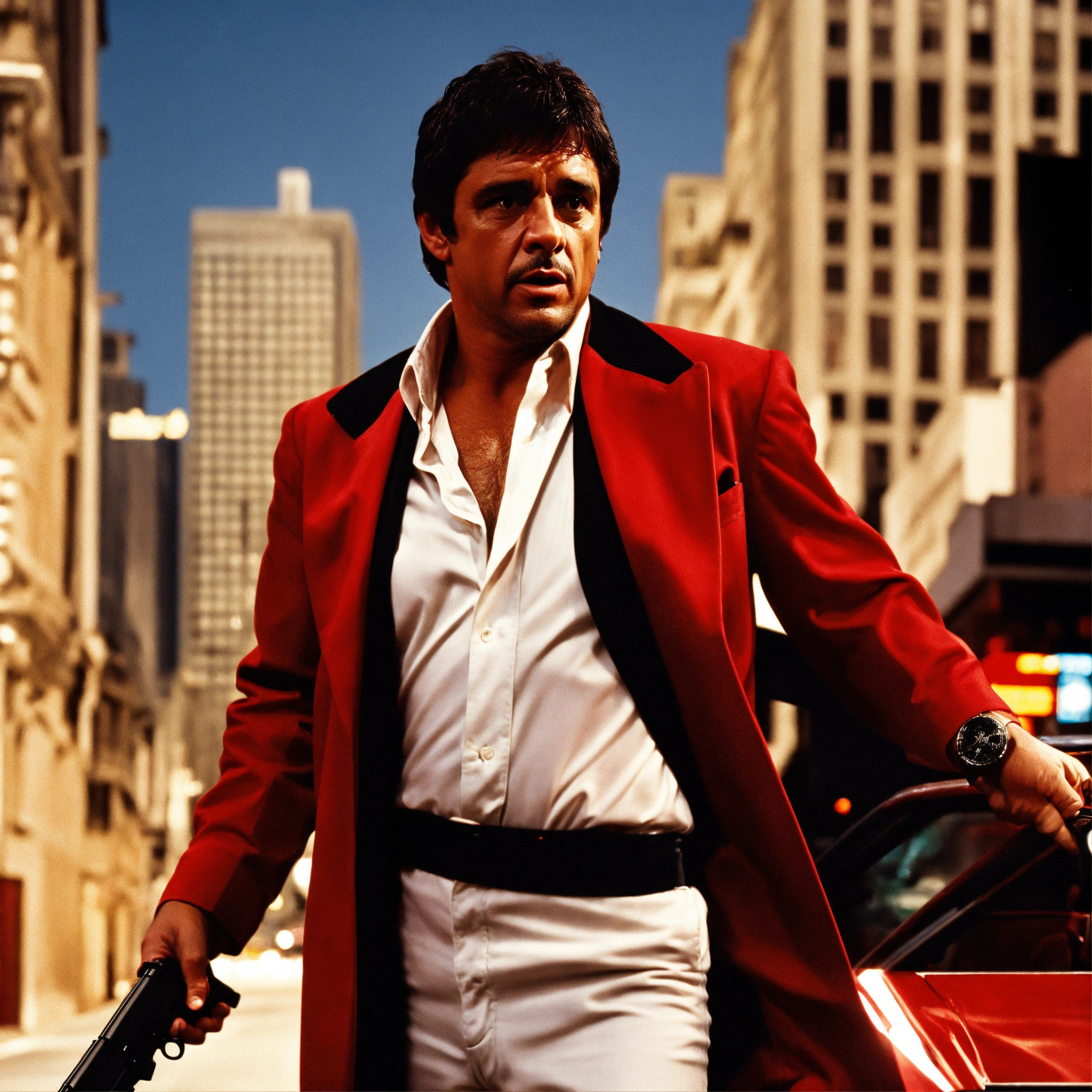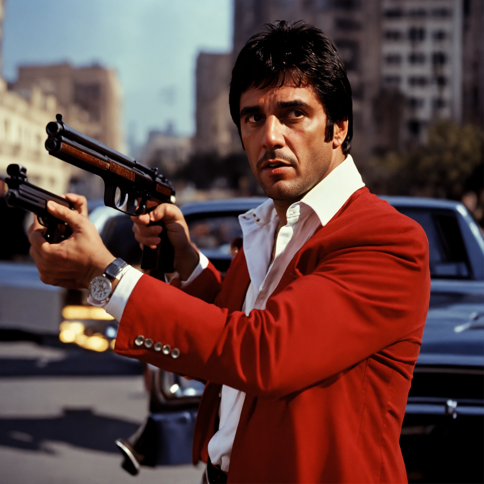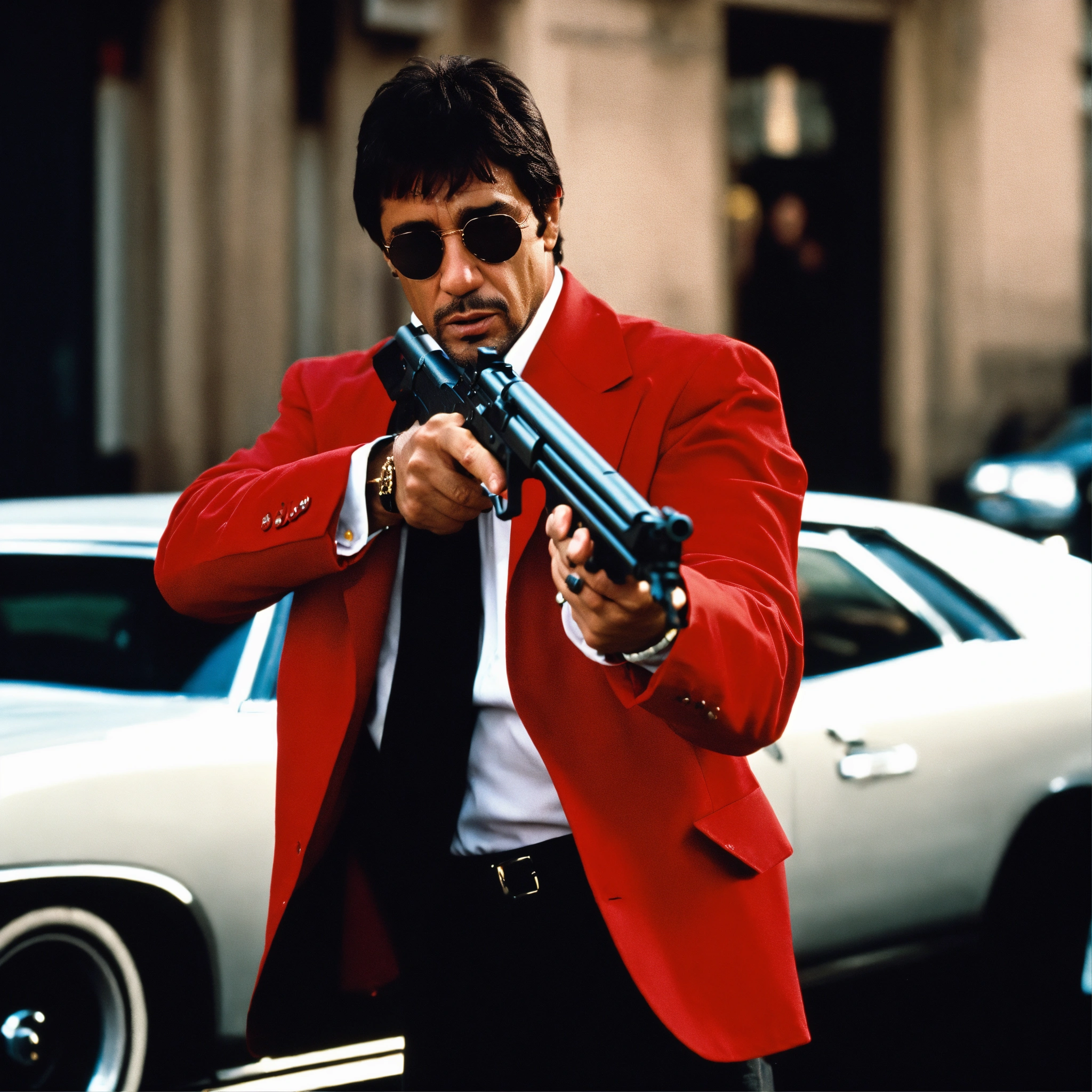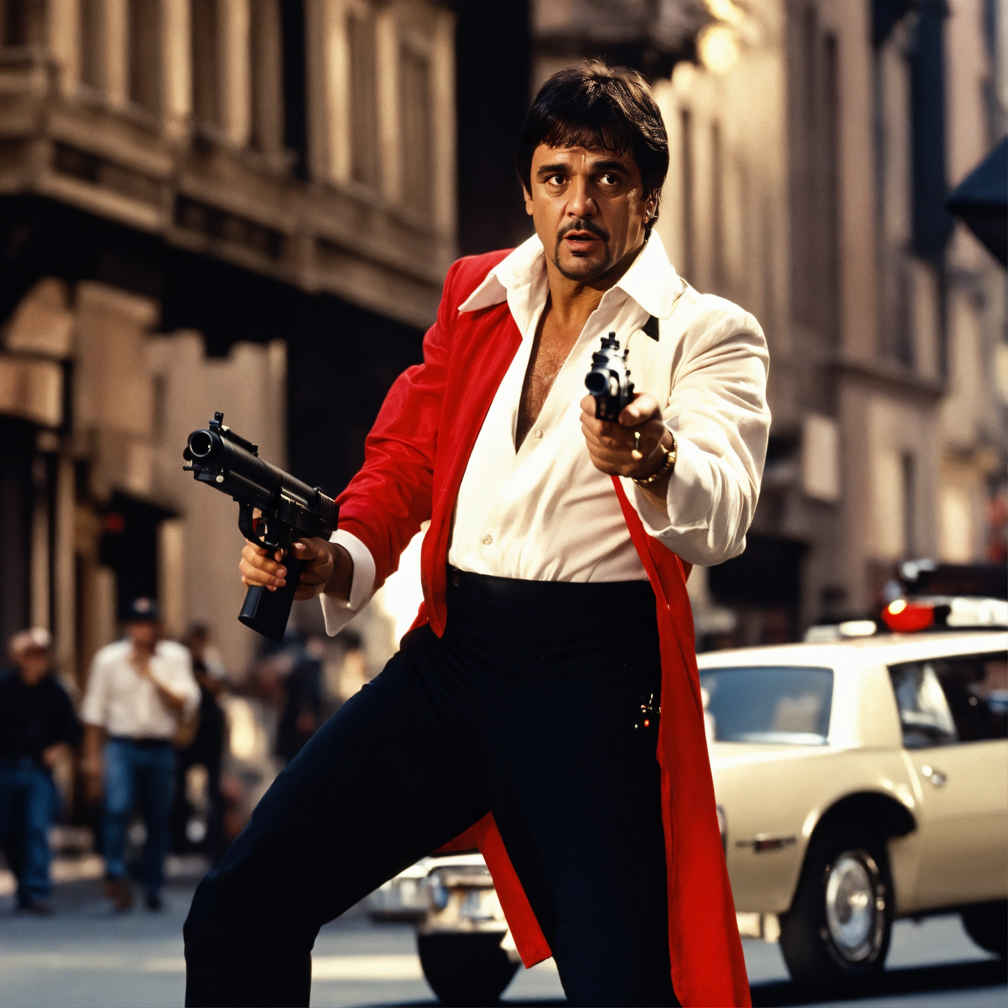 with white costume and red shirt shooting in the city with shotgun