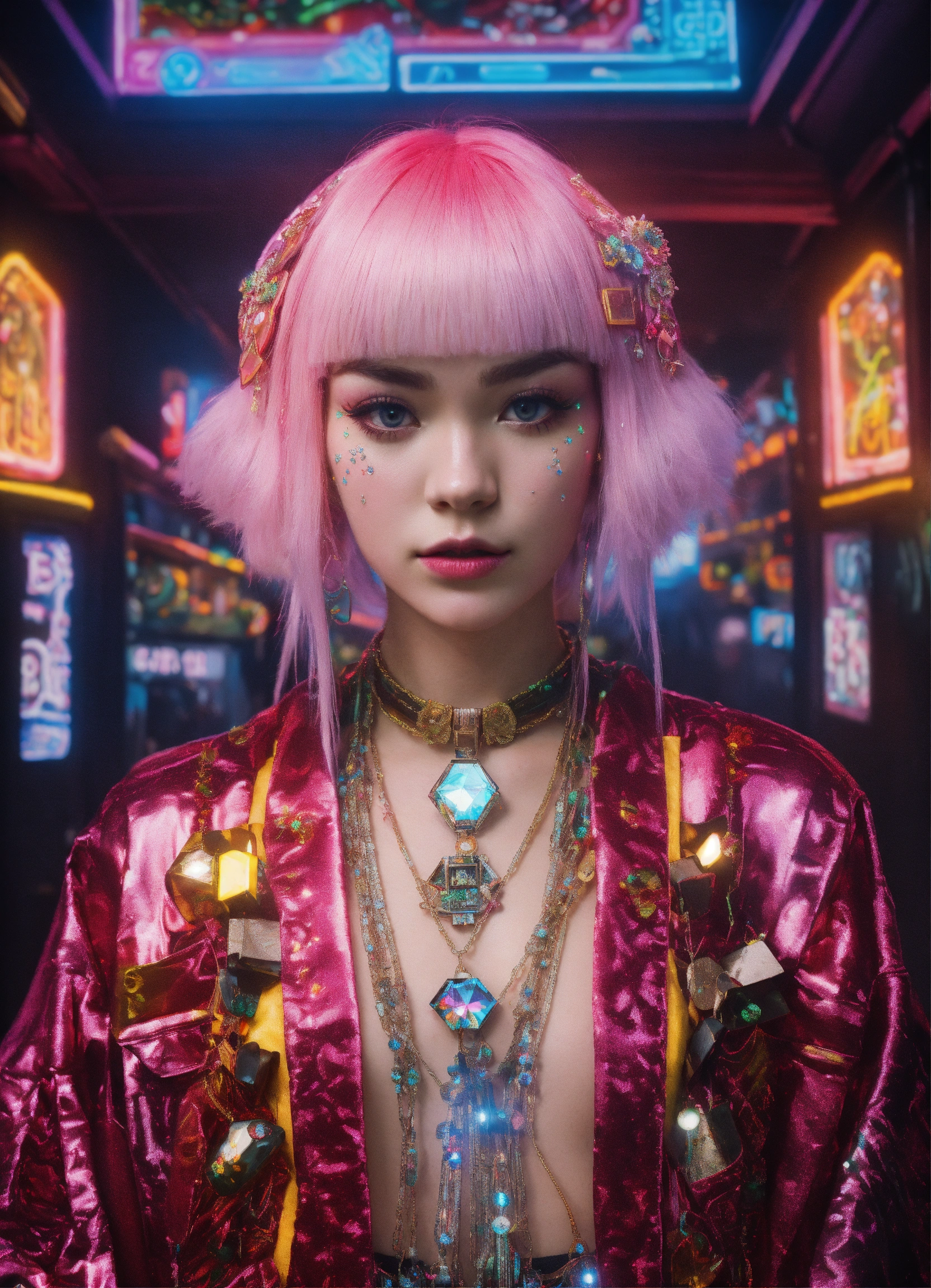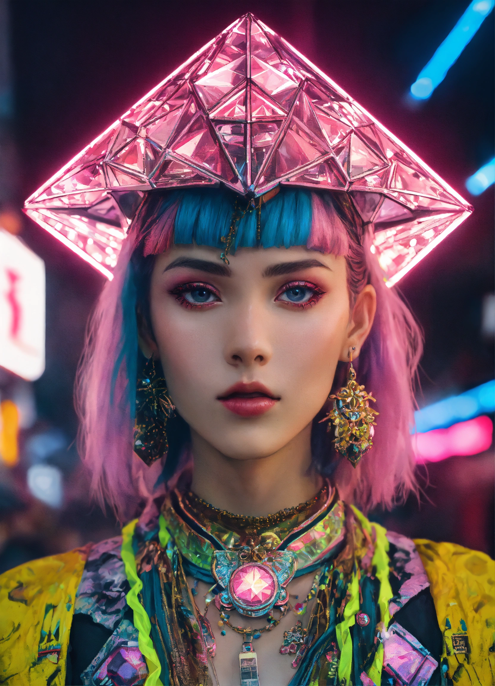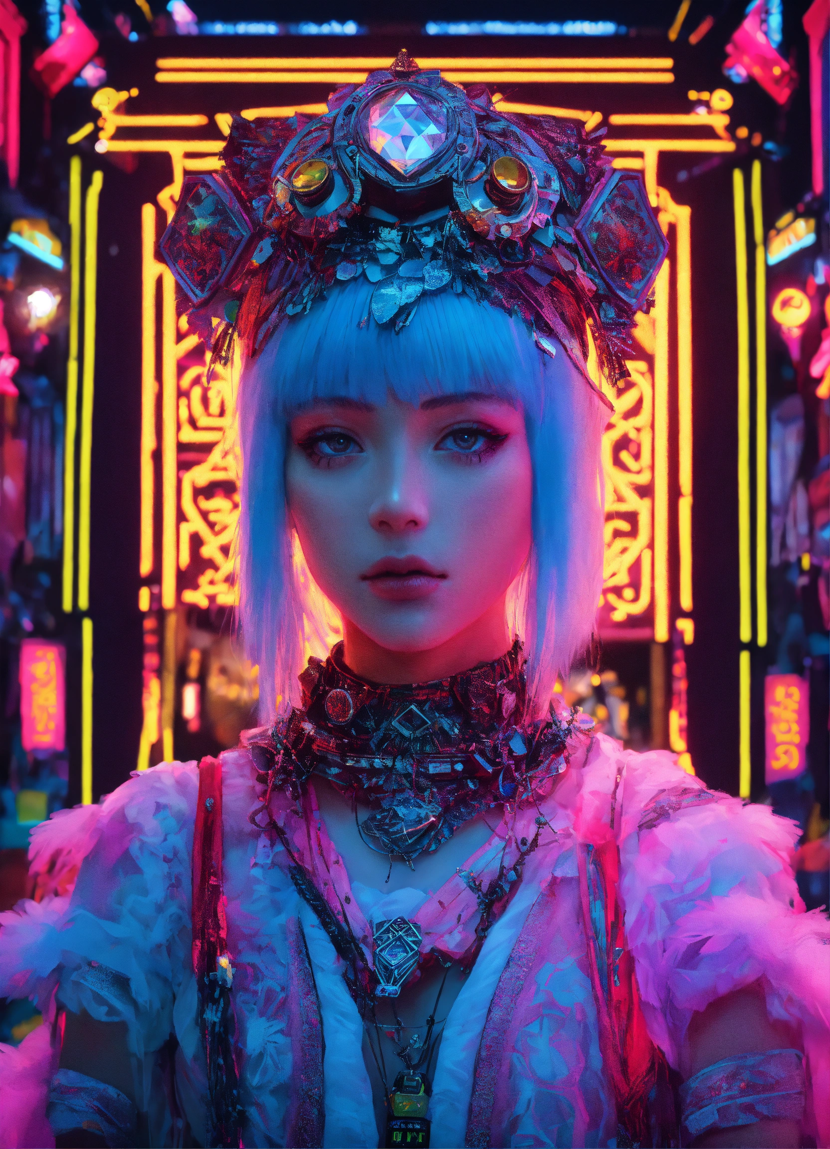 I’m photorealistic portrait of a diamond metal occult technology grimes ai god kawaii punk in folk costume, photorealistic tokyo arcade a death note cyberpunk colorado festival raver style with diamonds, of a person in urban dmt qr code wear, techno dmt neon room photorealistic, volumetric lighting, 8k, highly detailed