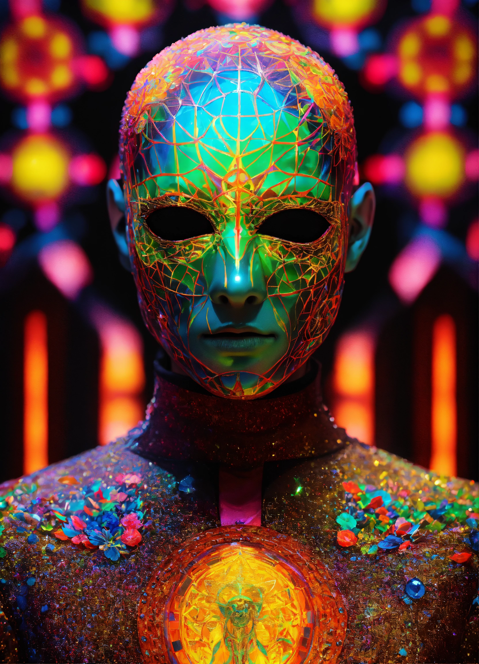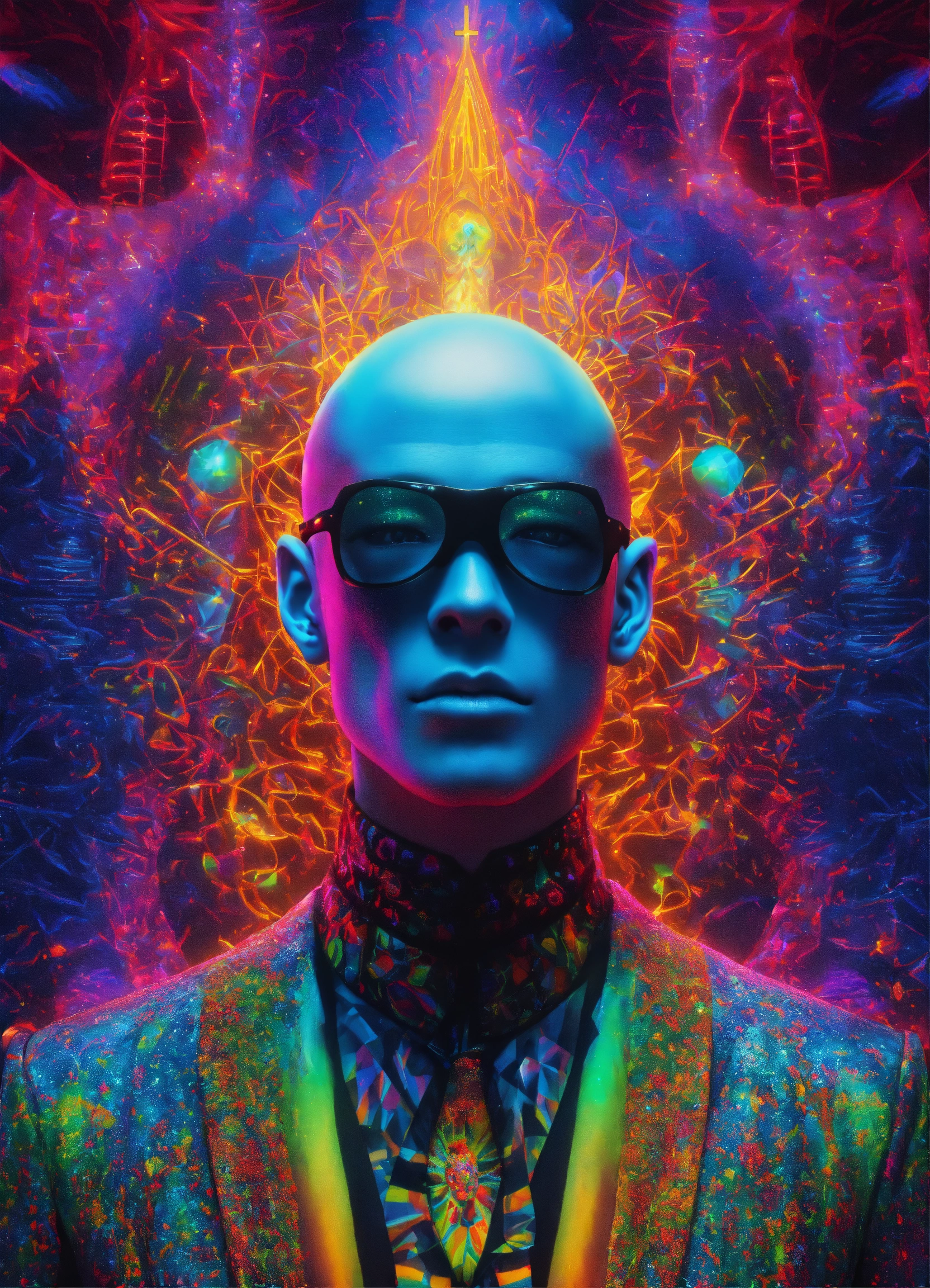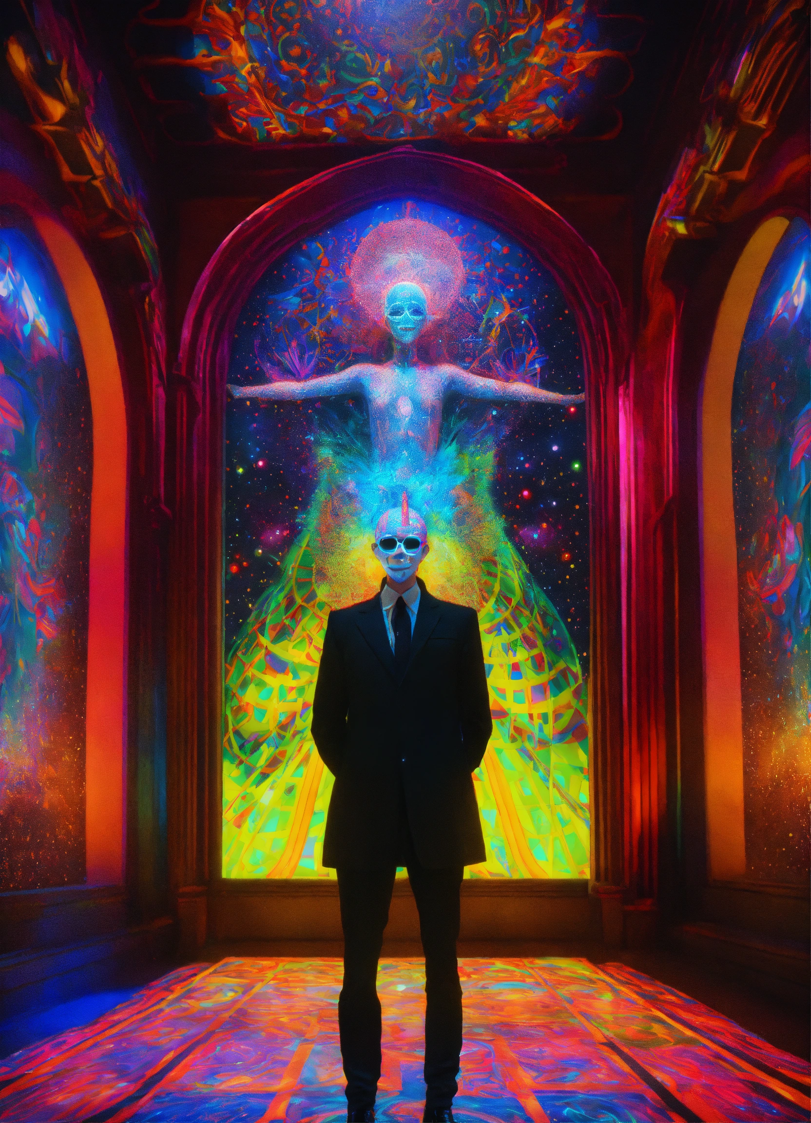 Photorealistic 3d portrait of ai god dmt psytrance slender man pinhead punk rock anime haute couture costume, baptized in a cosmic alex grey painting in a dmt black laser light glitter neon black rainbow glitter holographic paris fashion church at dark night 70mm film, art by salvador dali and holy mountain the movie.