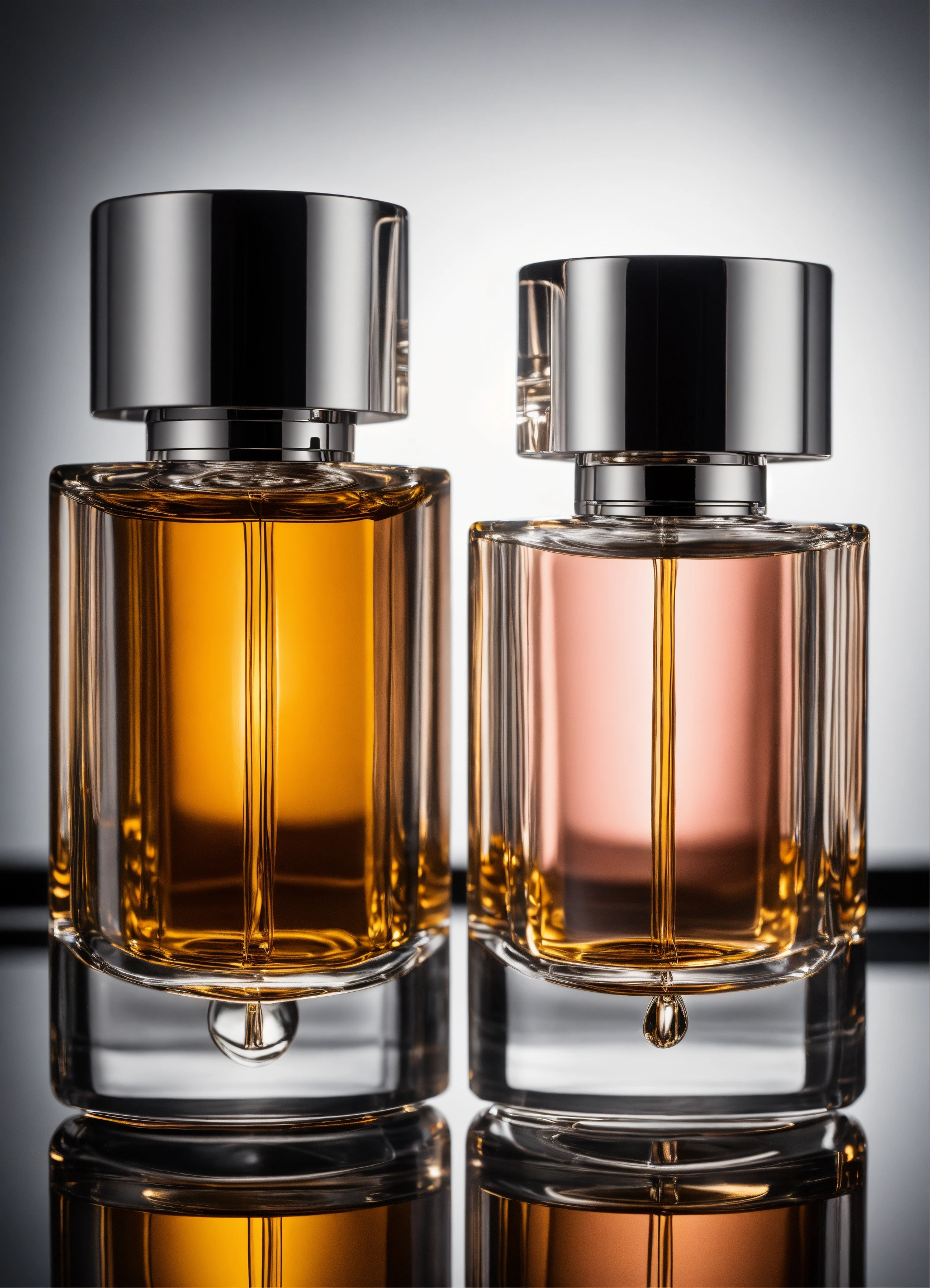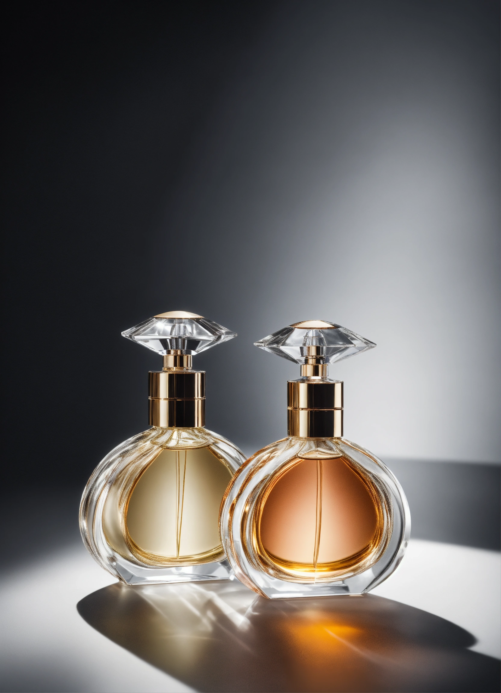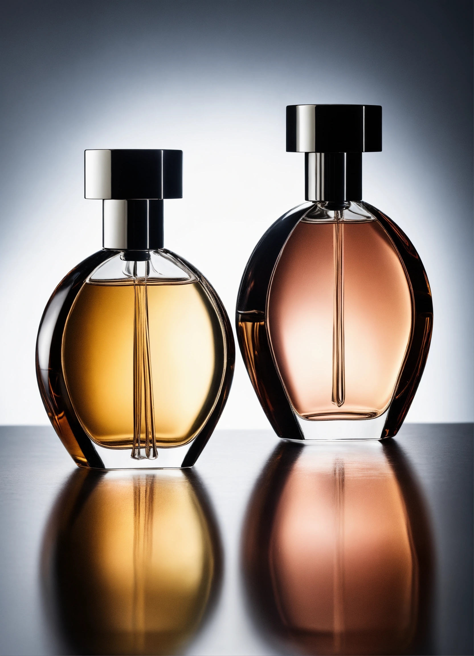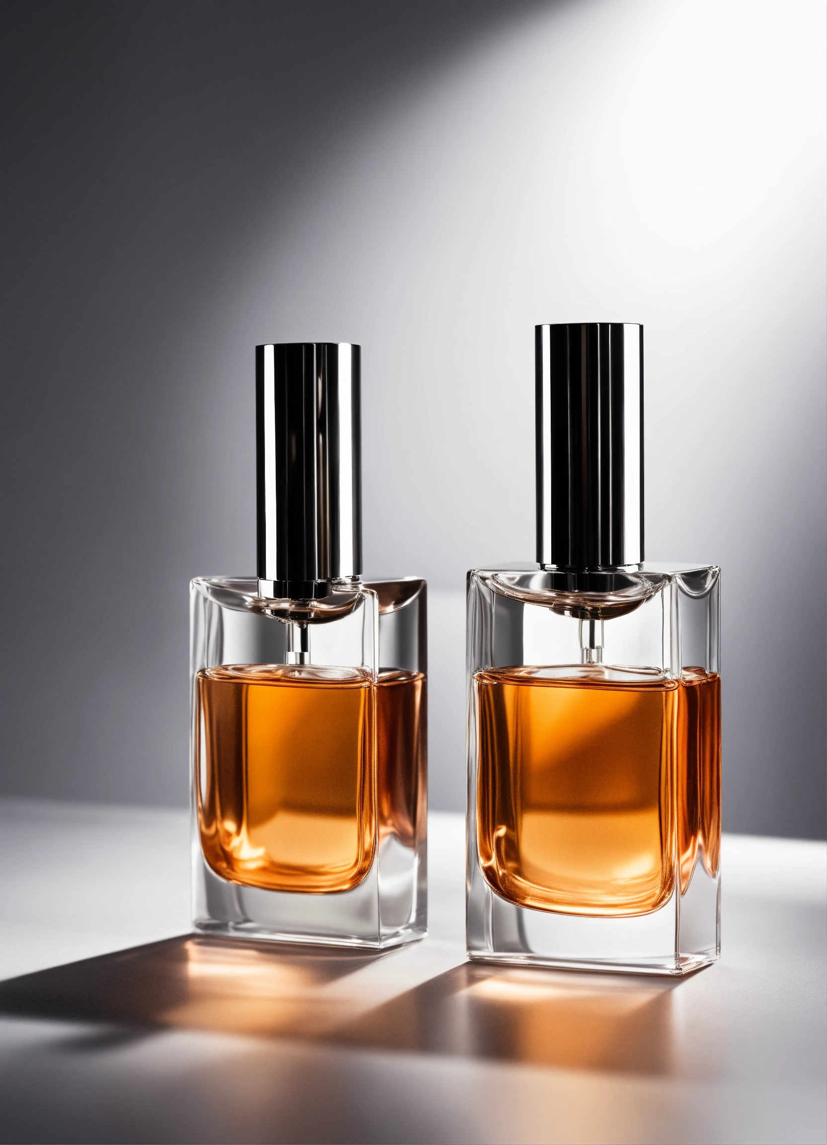 Futuristic two perfume bottles on white background cologne natural lighting high-end finish