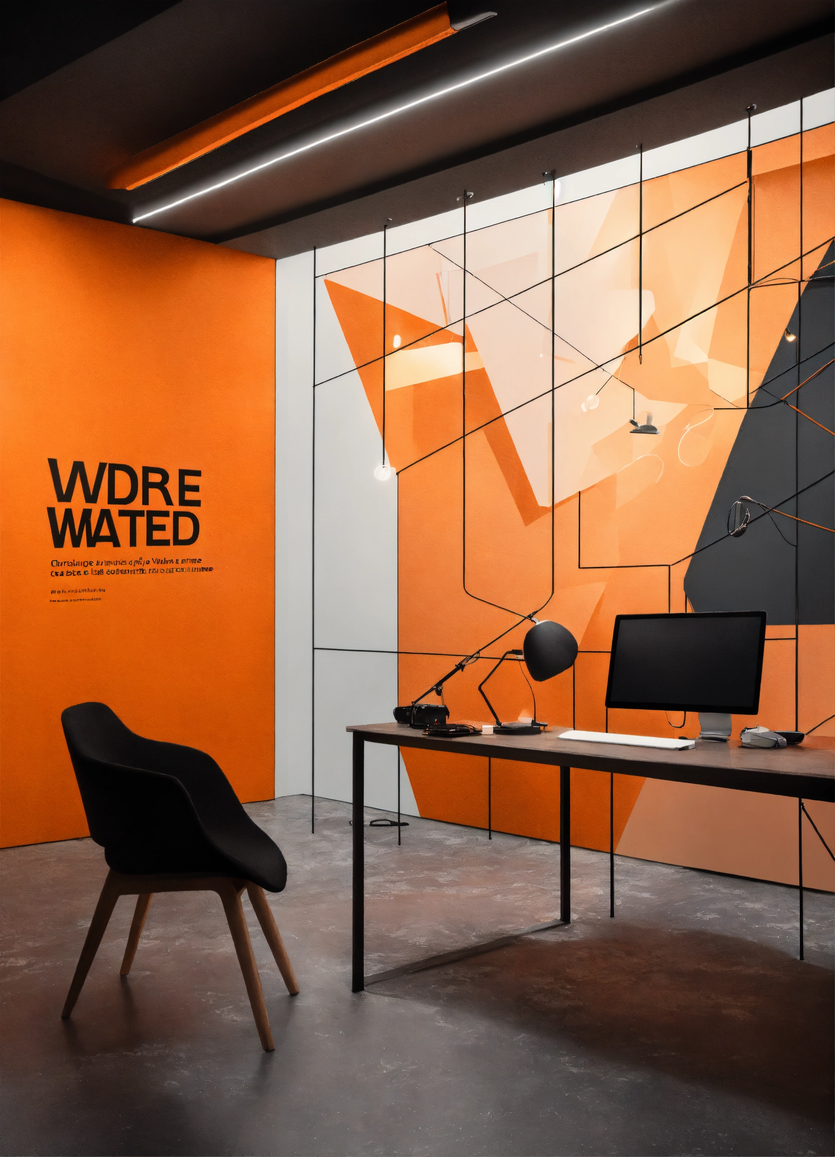 Marketing design communication "agence design plus" en fond noir avec des cercles orange concentriques. au centre, un template de site web de décoration d'intérieur minimaliste et épuré, avec un pc noir avec un clavier lumineux orange et noir, avec sur la droite la carte de l'agence design +, une loupe montre une étiquette indiquant "votre site web avec adp +", tout est sur un fond orange et noir.