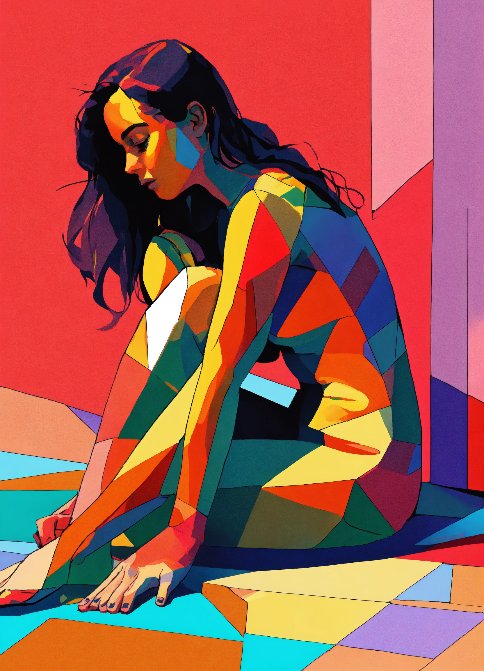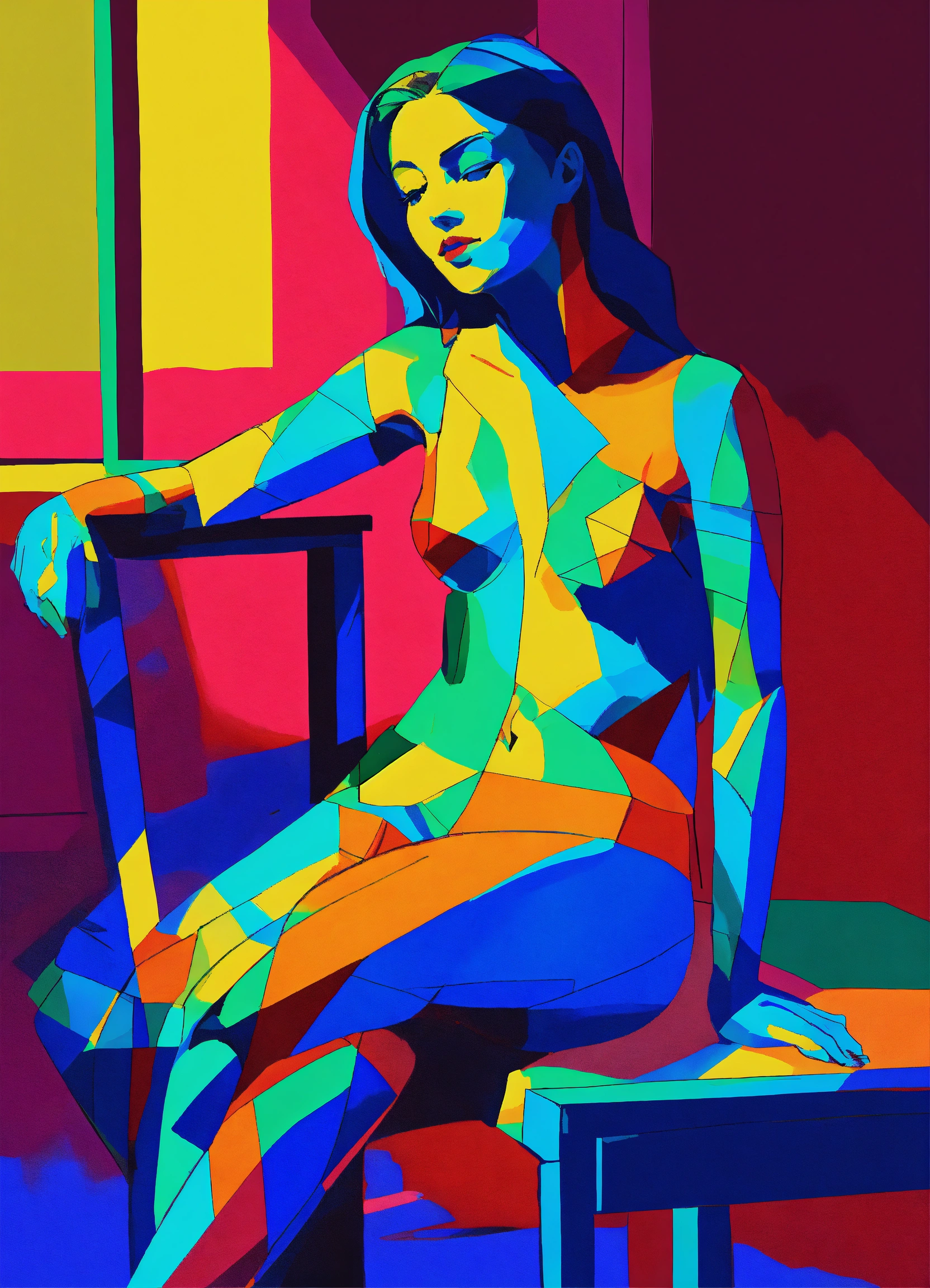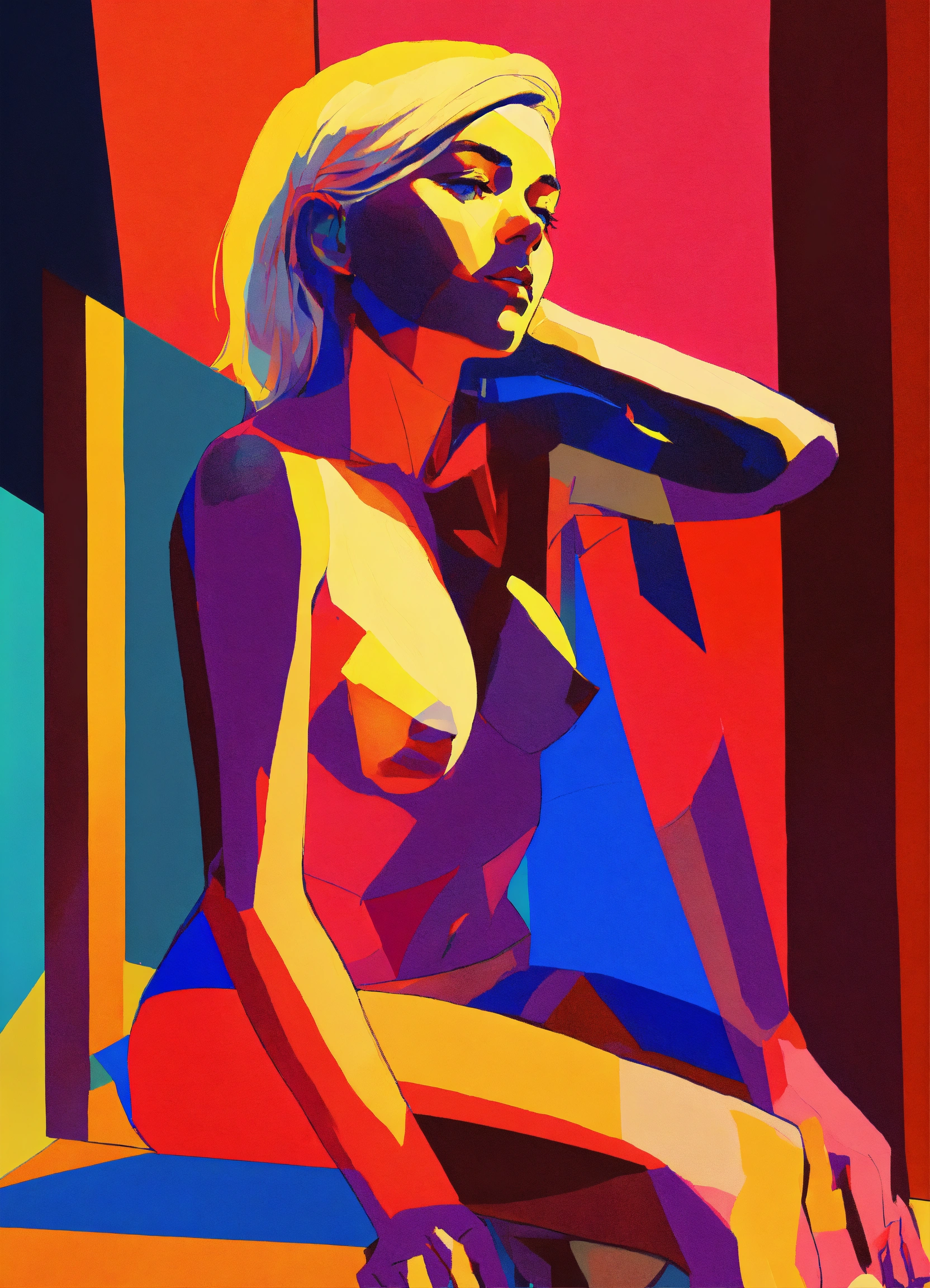Genz female life drawing poseur gazing, art pose reference au naturel, "intense shadows", "neon-lit scene", “solarized printing”, graphic novel illustration by mztgr7 henri matisse, saturated sharp geometric color blocks are used to shade the skin, flat color, heavy use of the color black, expected and unexpected coloring, bare contours, low poly art, high contrast, the buff, —stylize 100