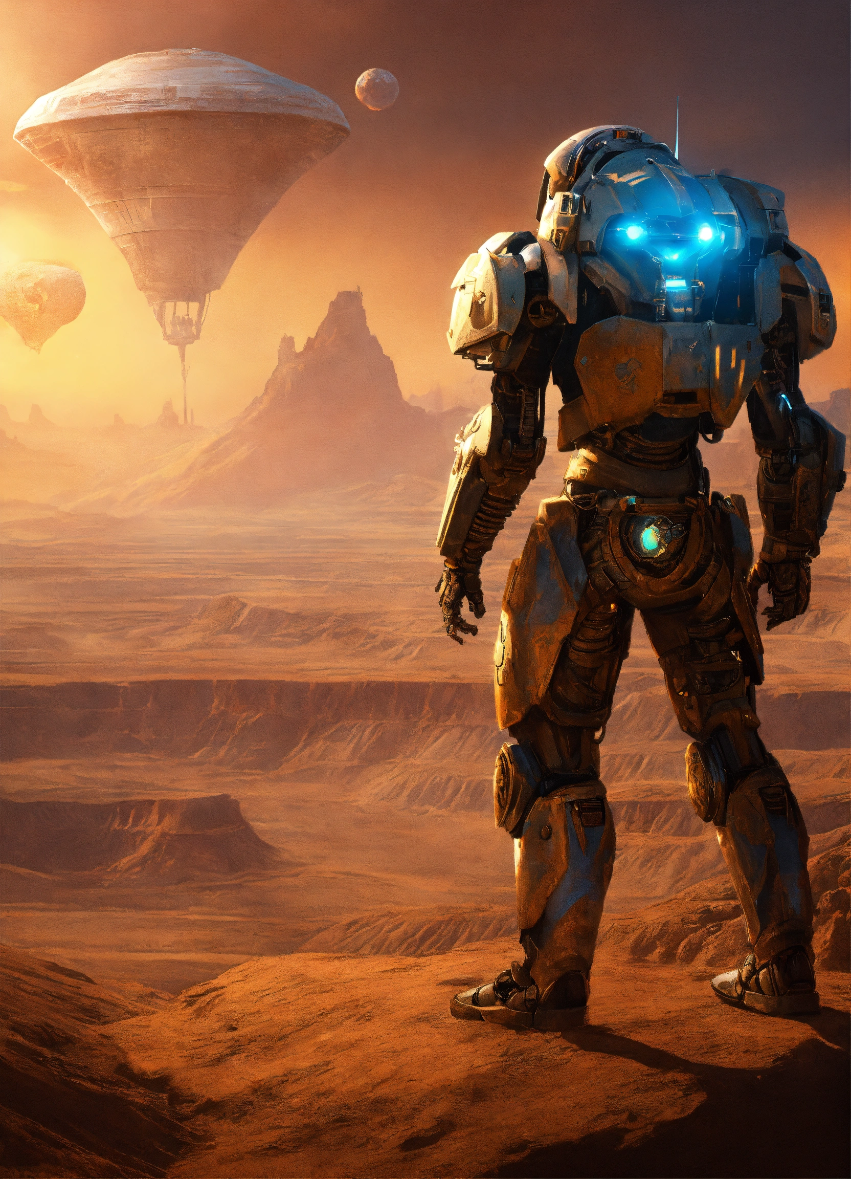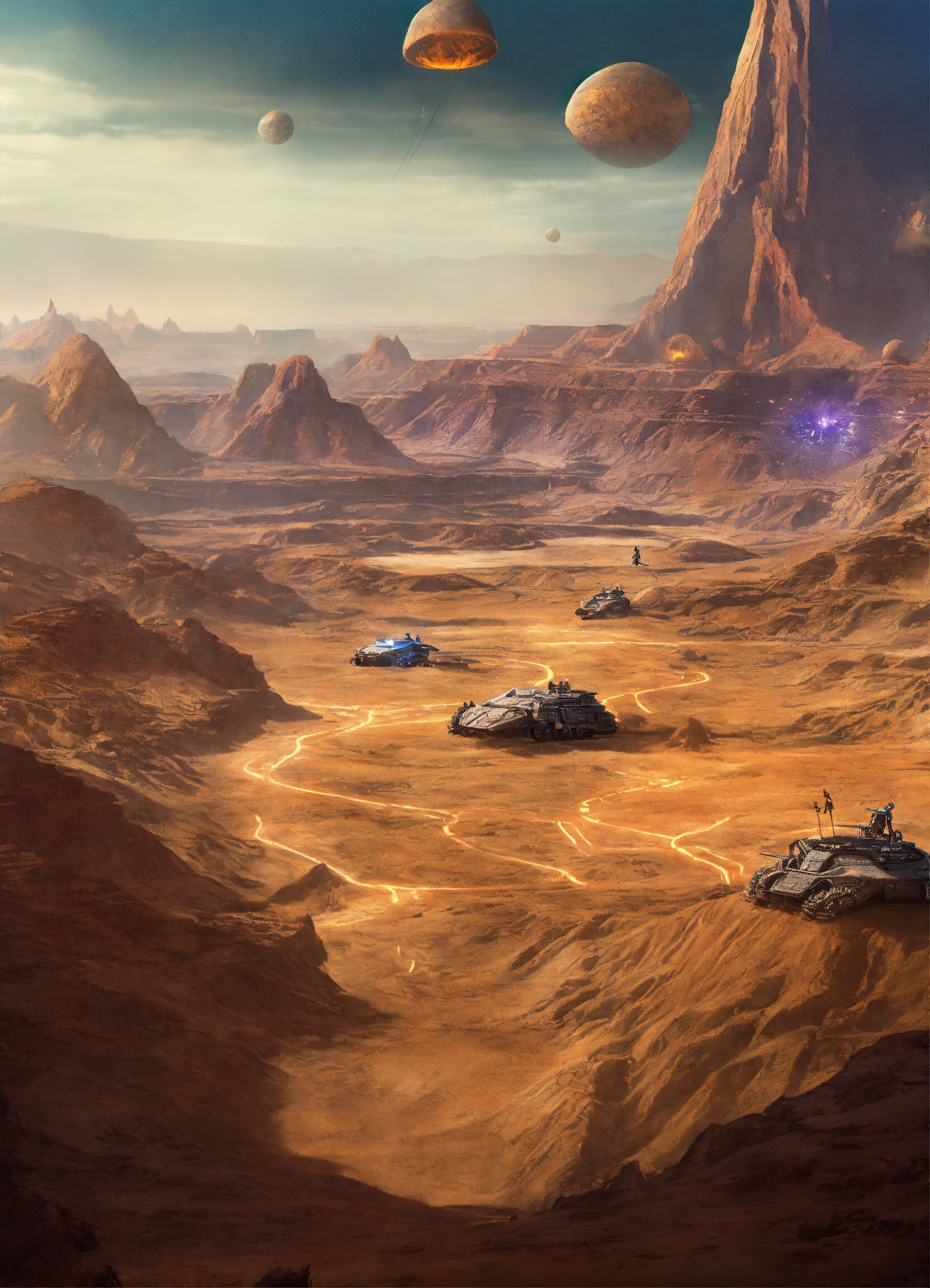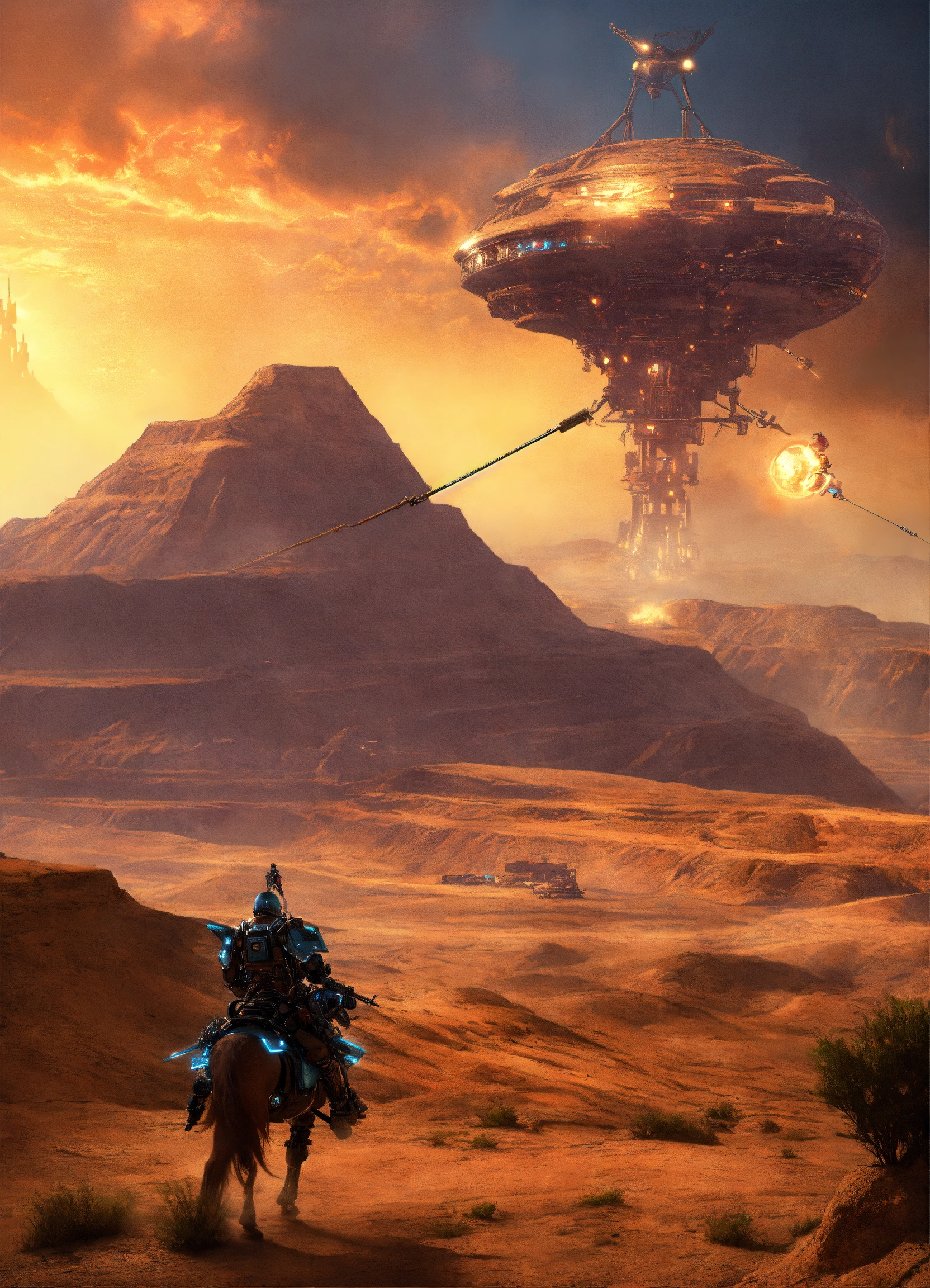 Ancient-interdimensional battles in the badlands with biomechanical enhancements and cybernetic war