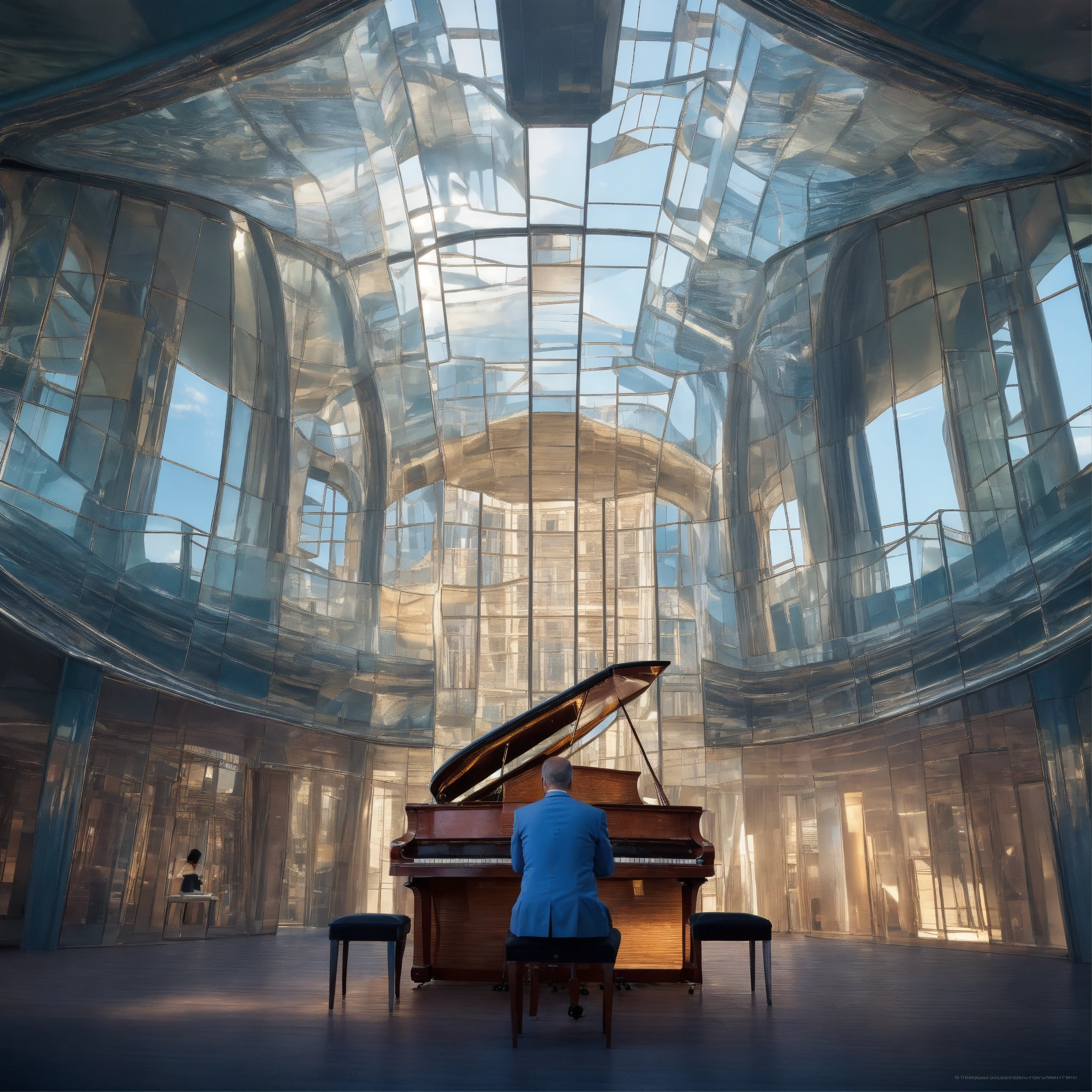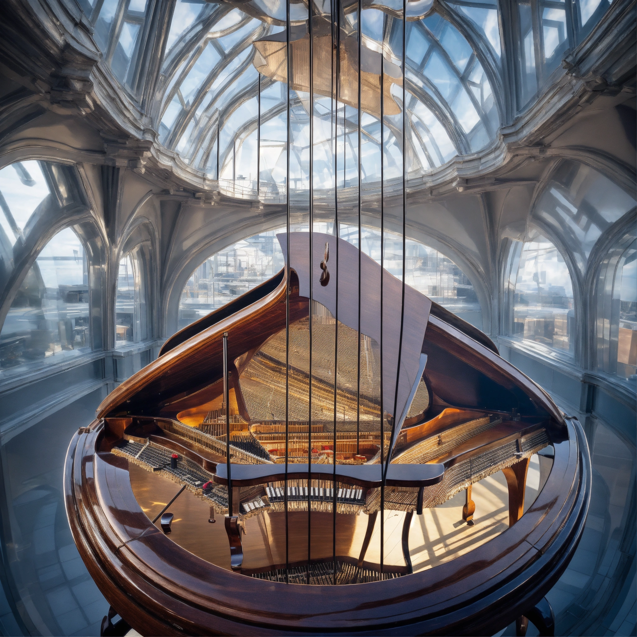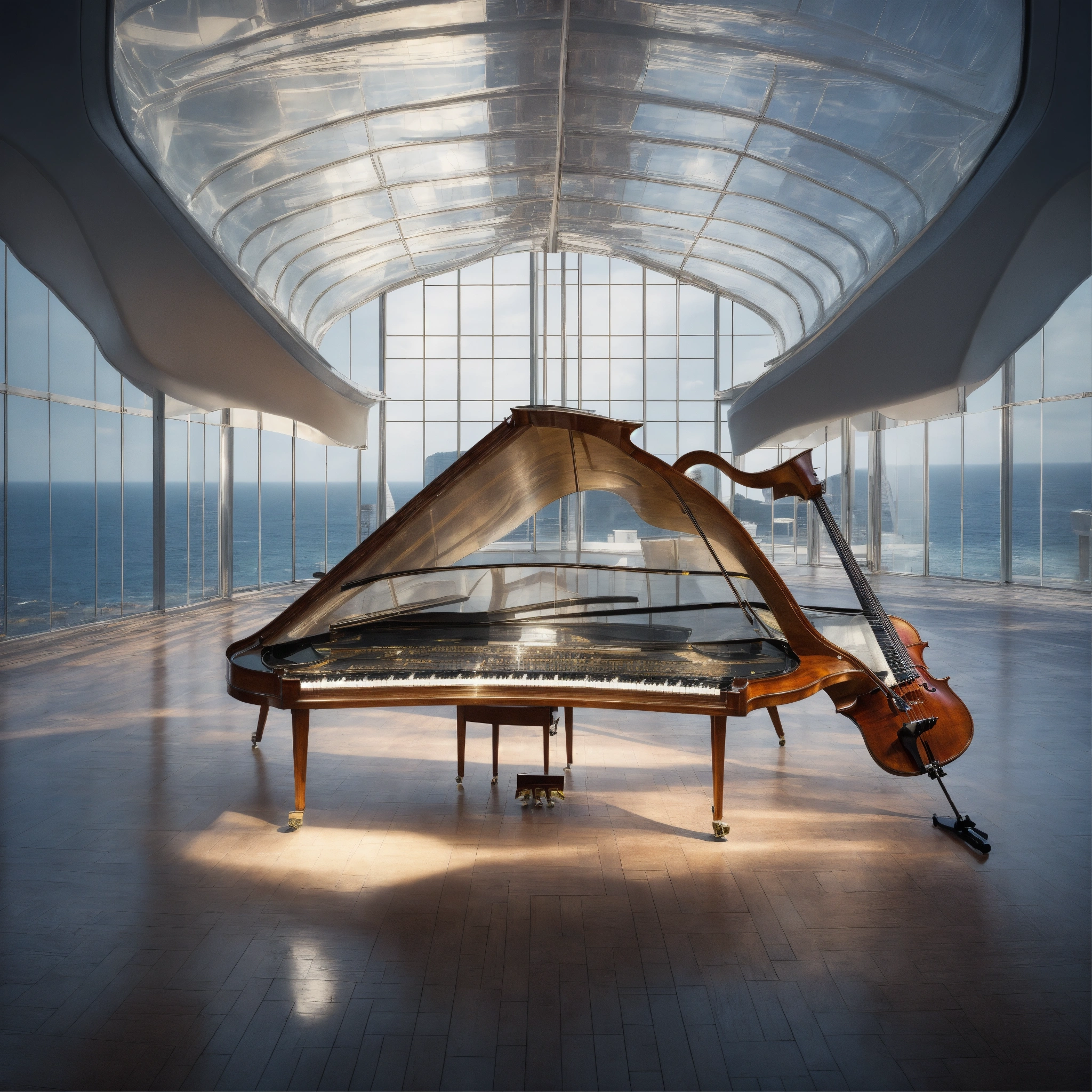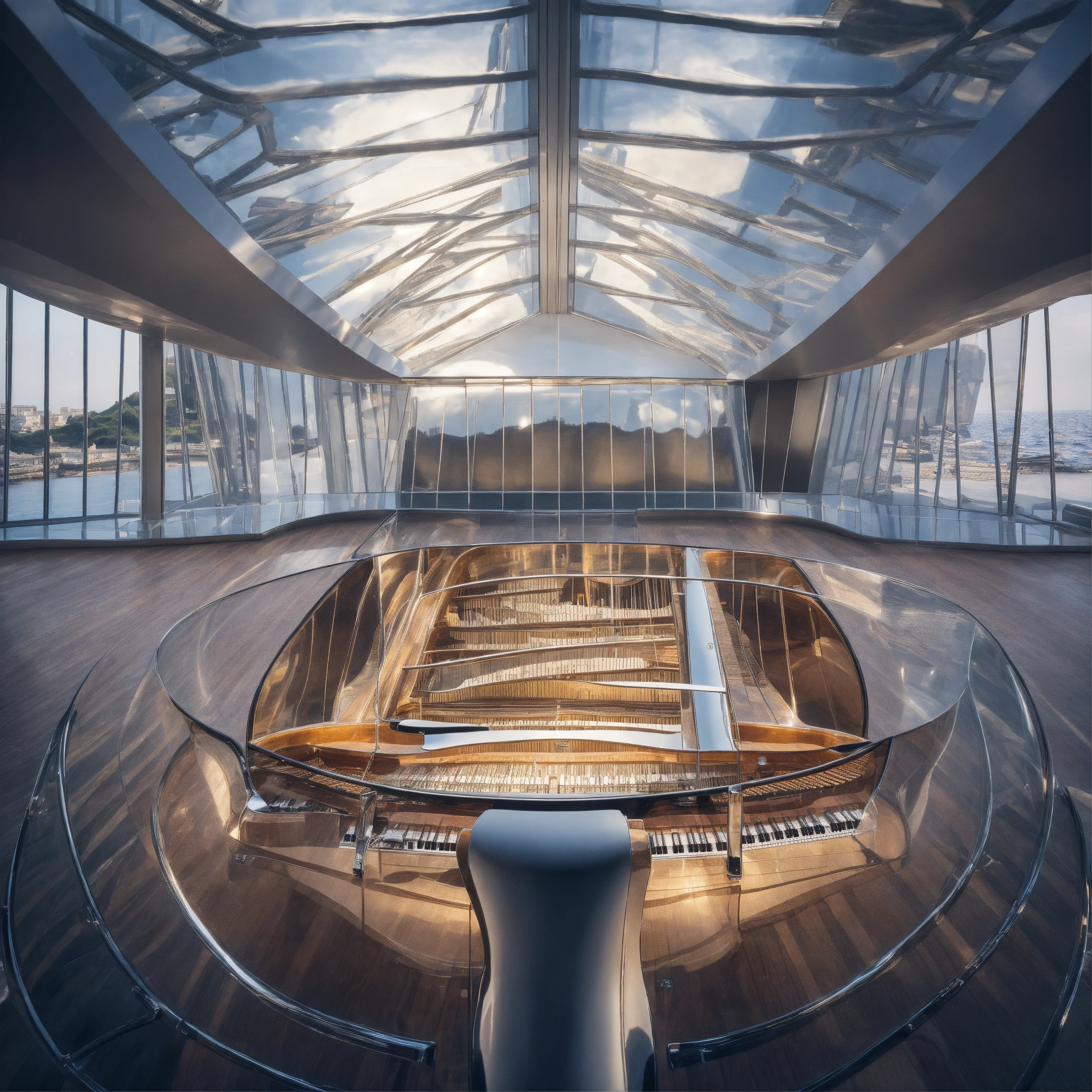 Very bizarre angle of a photorealistic closeup view of inside a transparent piano, imagine you are standing inside of a piano and watching a modern concert hall inside the architecture of the instrument designed by frank gehry, don't show anything outside of the instrument but an ocean, just inside, the hidden part from eyes. created by canaletto, highly detailed image, extremely high resolution, surrealistic construction inside the cello, landscape ratio, 16/9 aspect ratio
