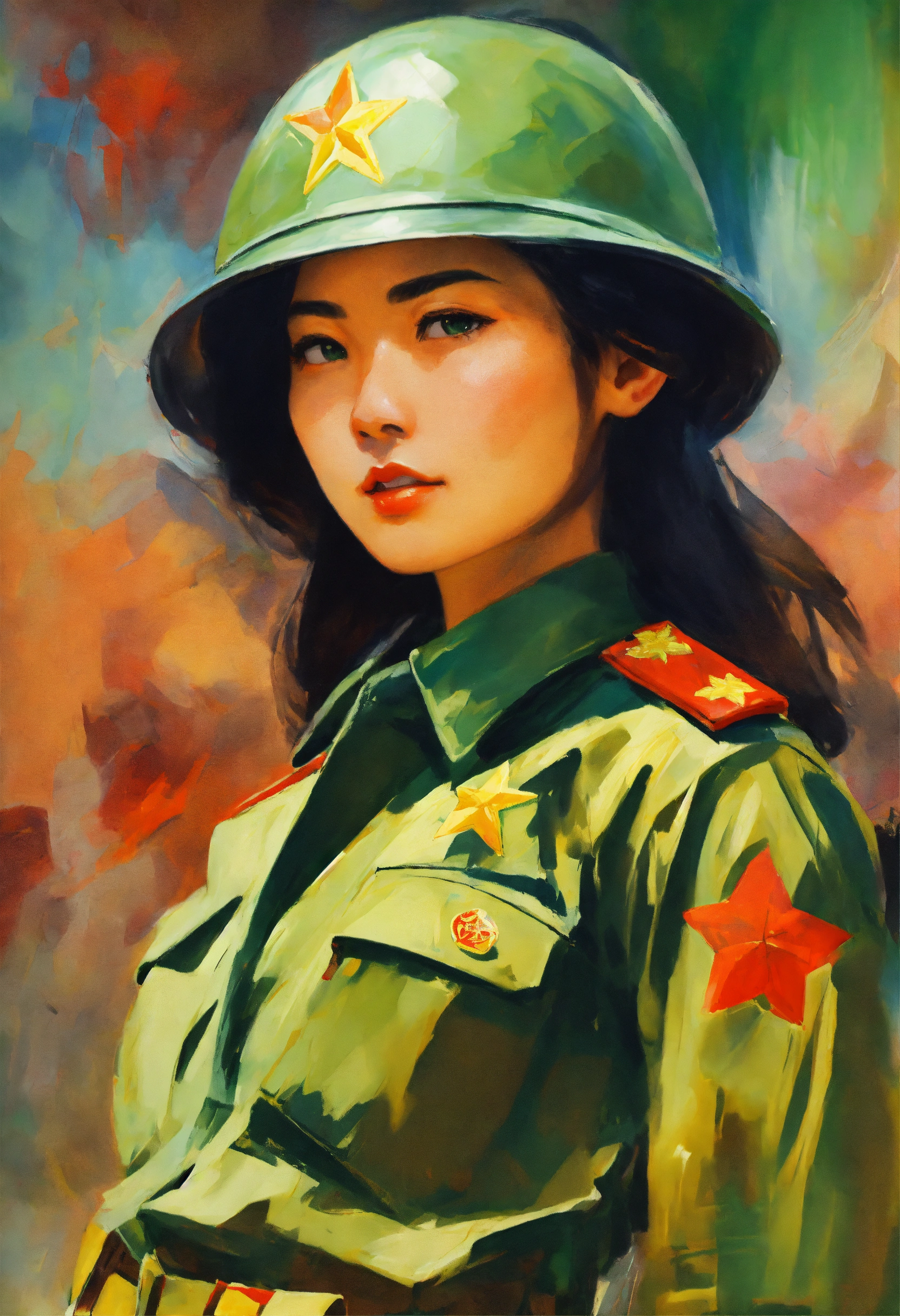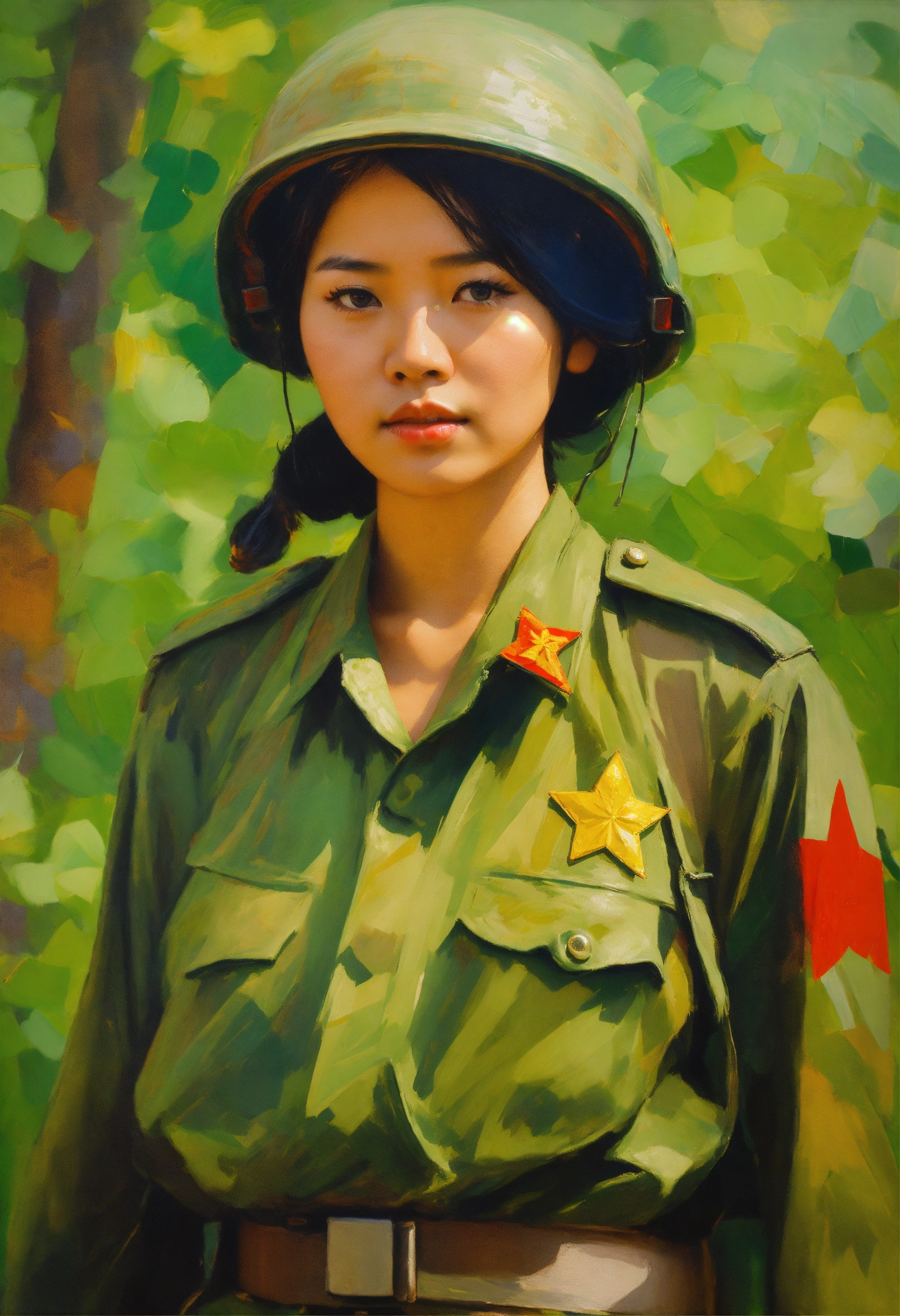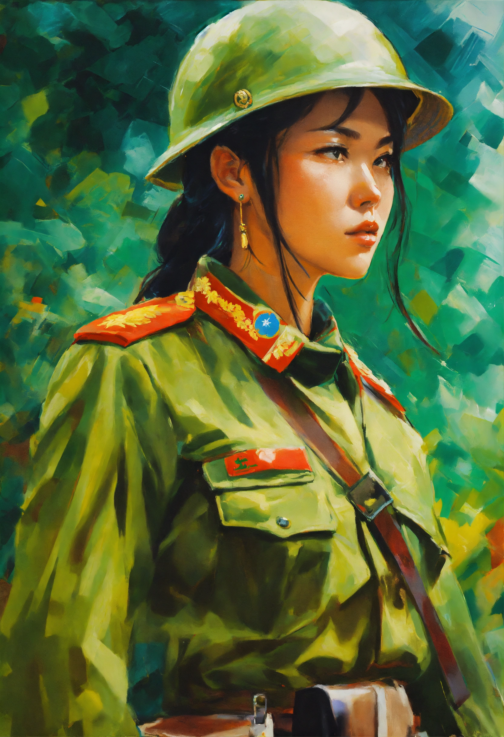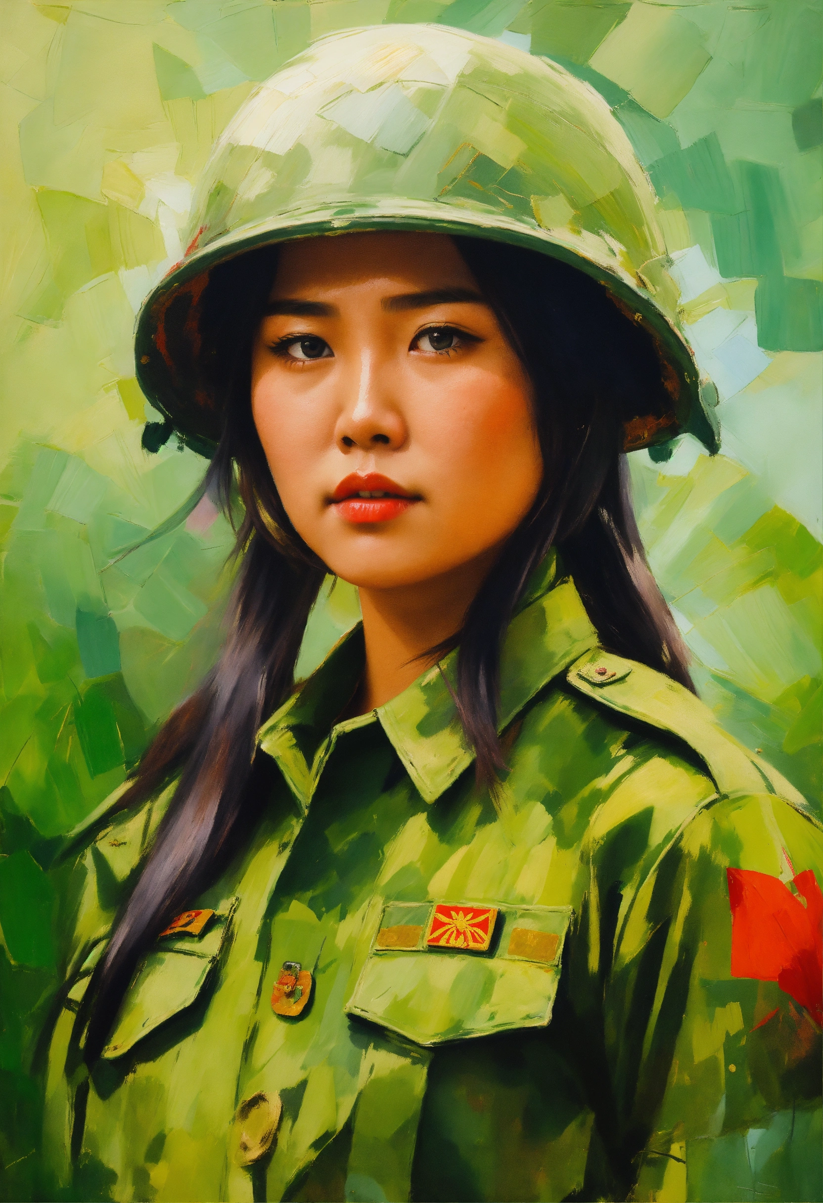 Female vietnamese soldier, north vietnamese army uniform, green vietnamese pith helmet, impressionist, colorful