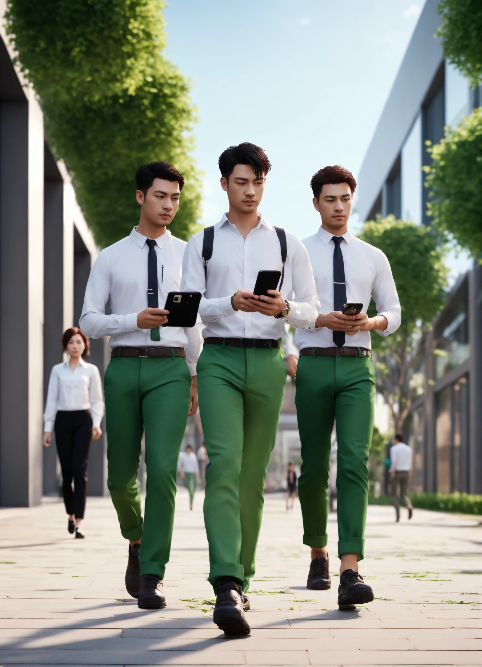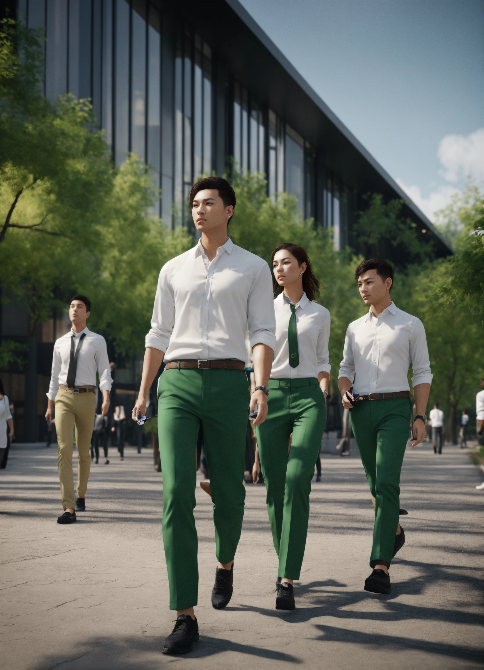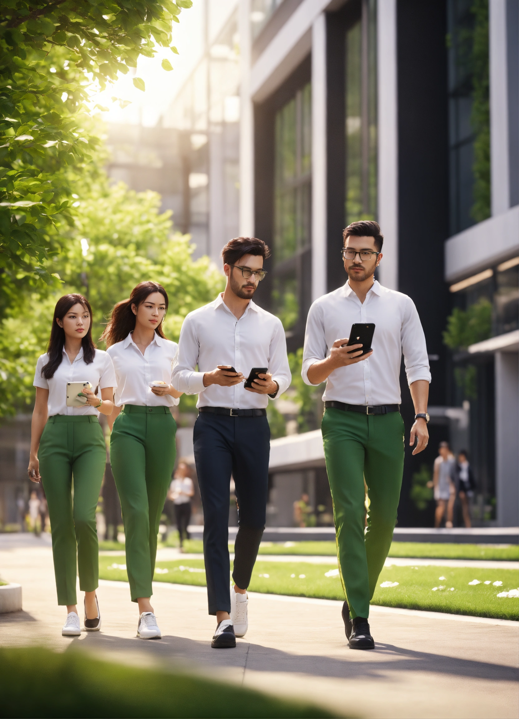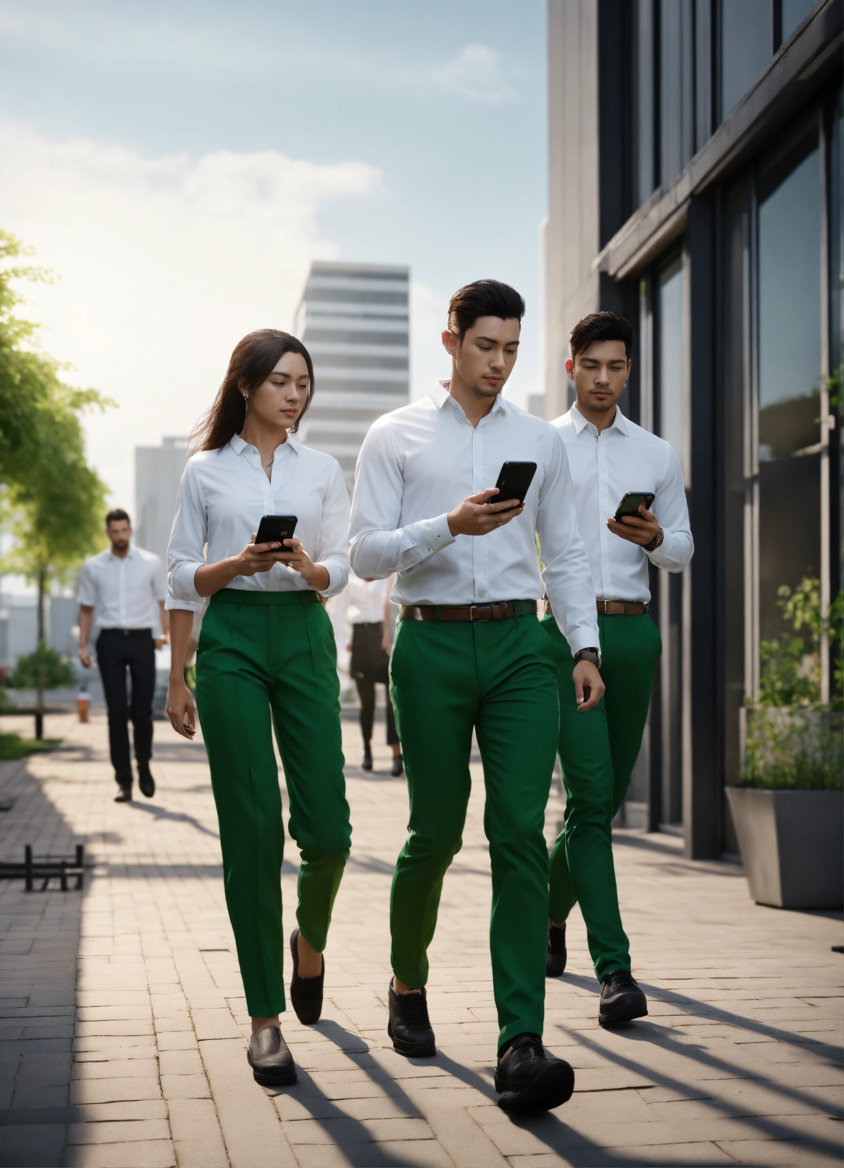 A group of employee walking together, wearing white shirt, wearing green trousers, wearing black shoes, hold a smartphone, at office yard, unreal engine rendering, 8k