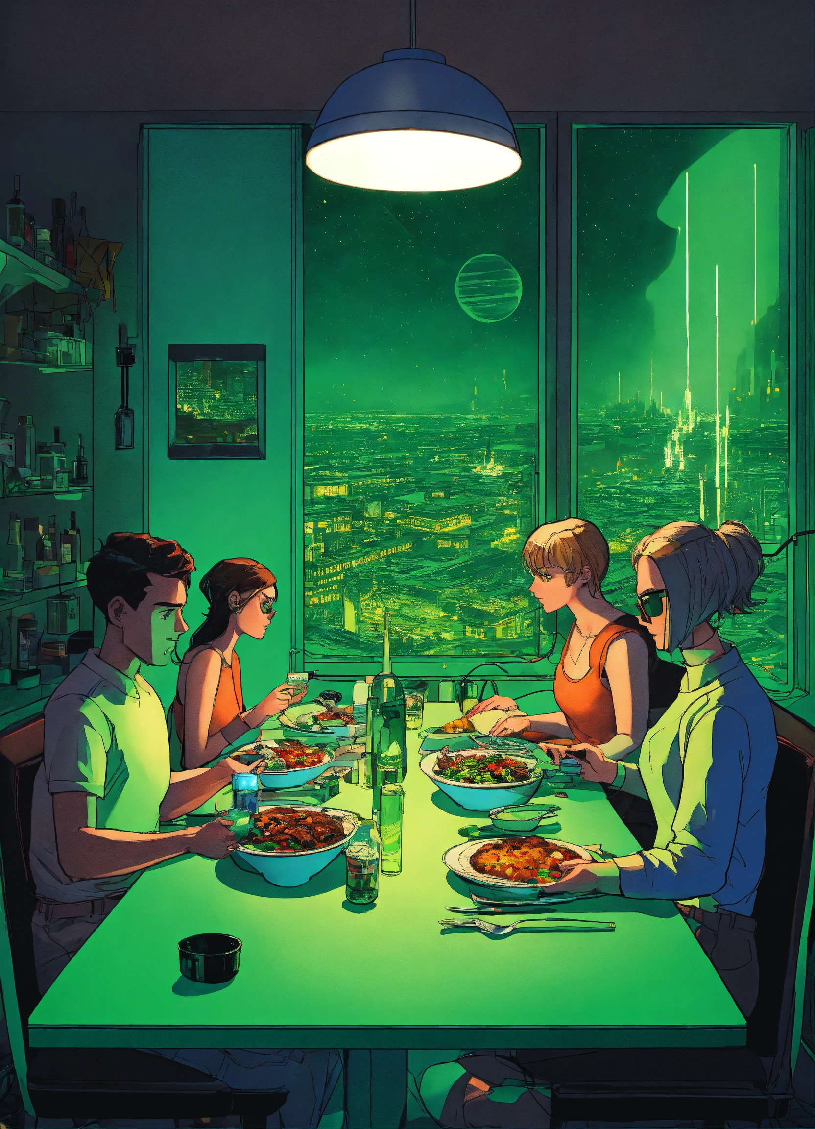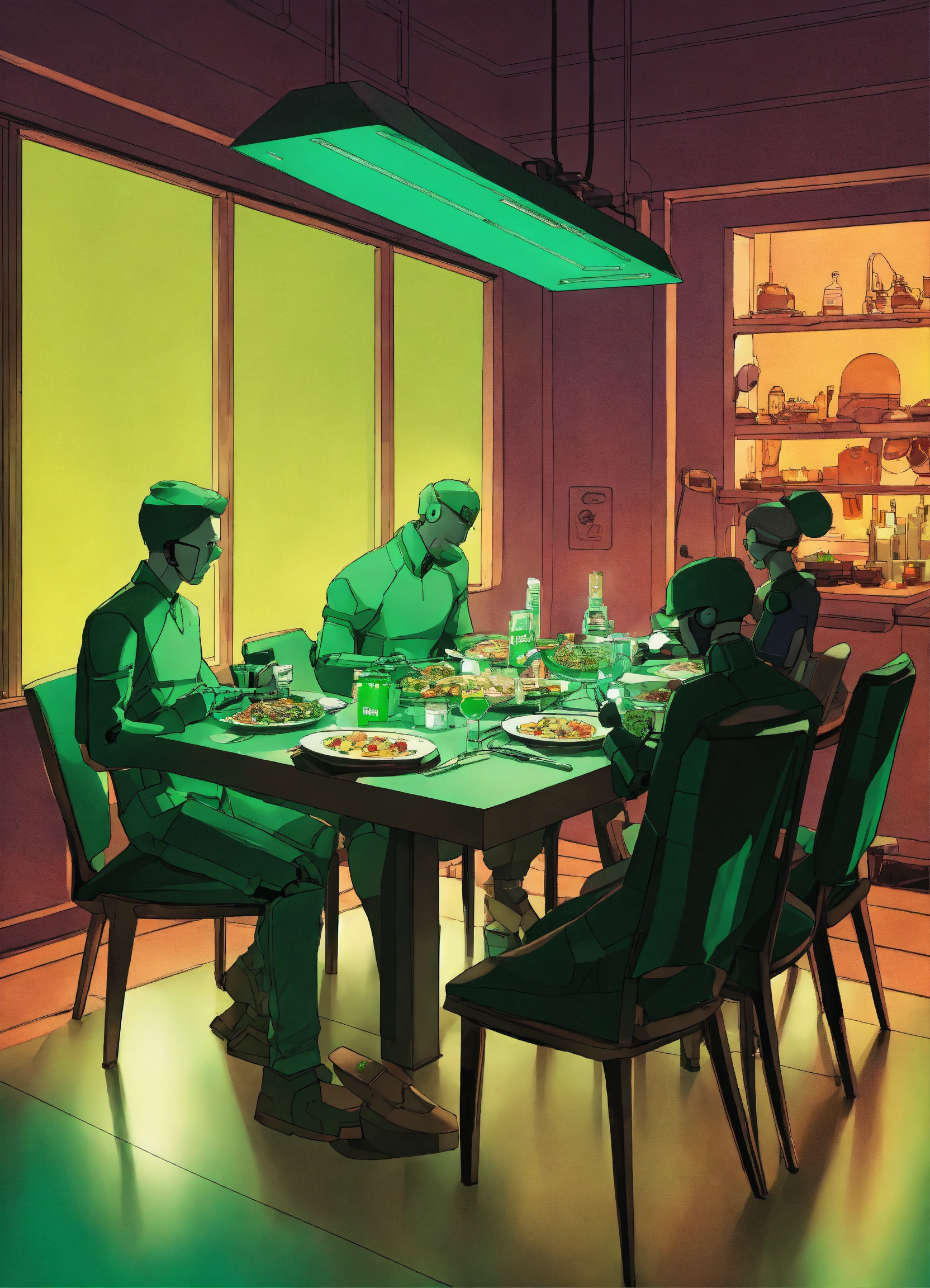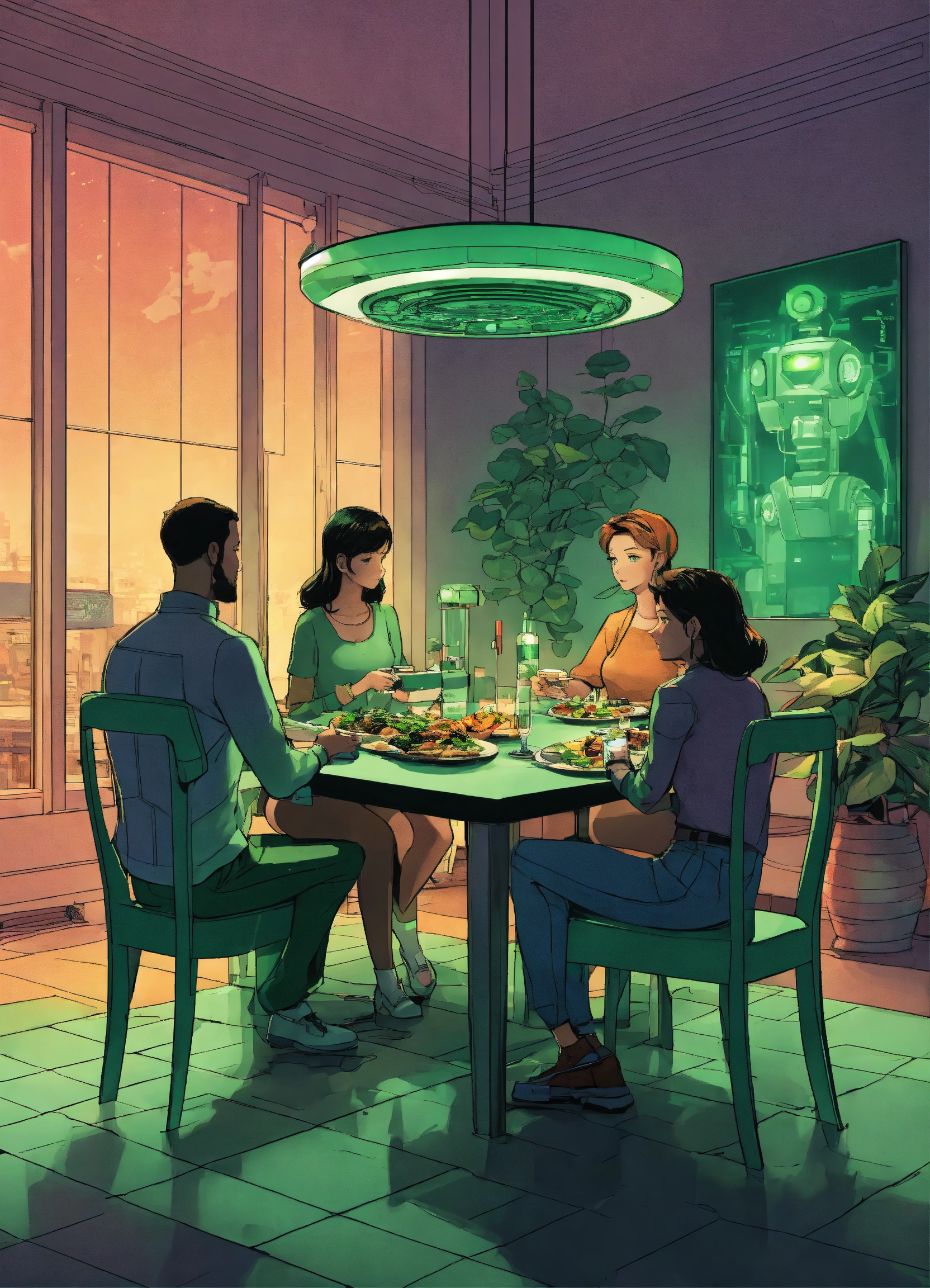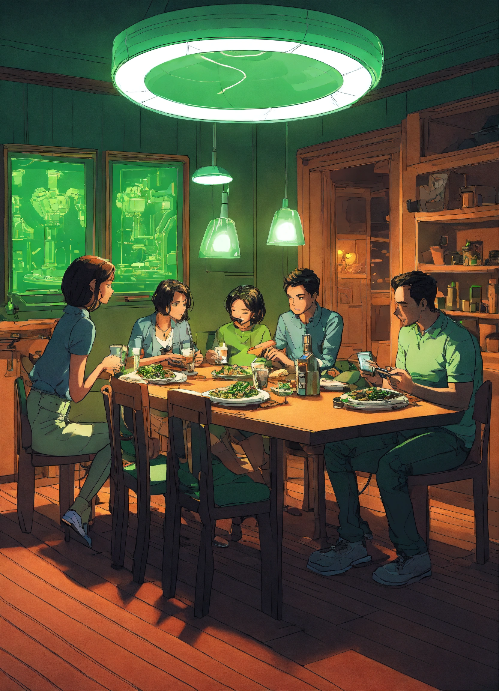 Craft a comic cartoon poster of a futuristic dinner scene, where robotic arms feed individuals locked into their phones' green glow. the family sits around a black table that seems to absorb the light, deepening the sense of isolation
