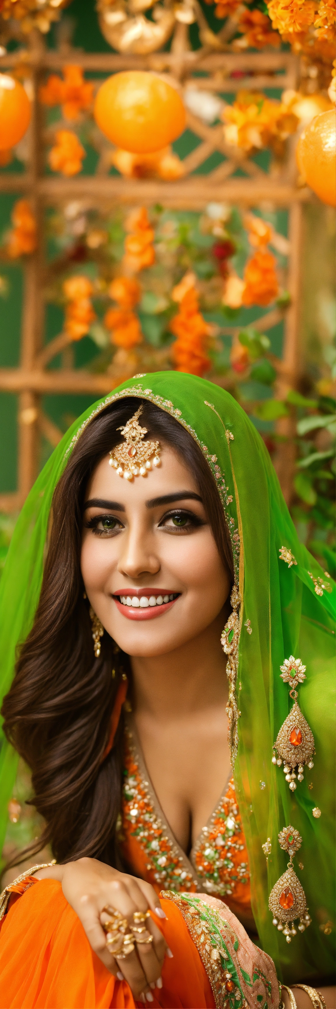 Persian beautiful housewife, beige bra orange ghagra, jewellery, long hairs, cute smile, shy, nice shape body, bright green background, celebration mode
