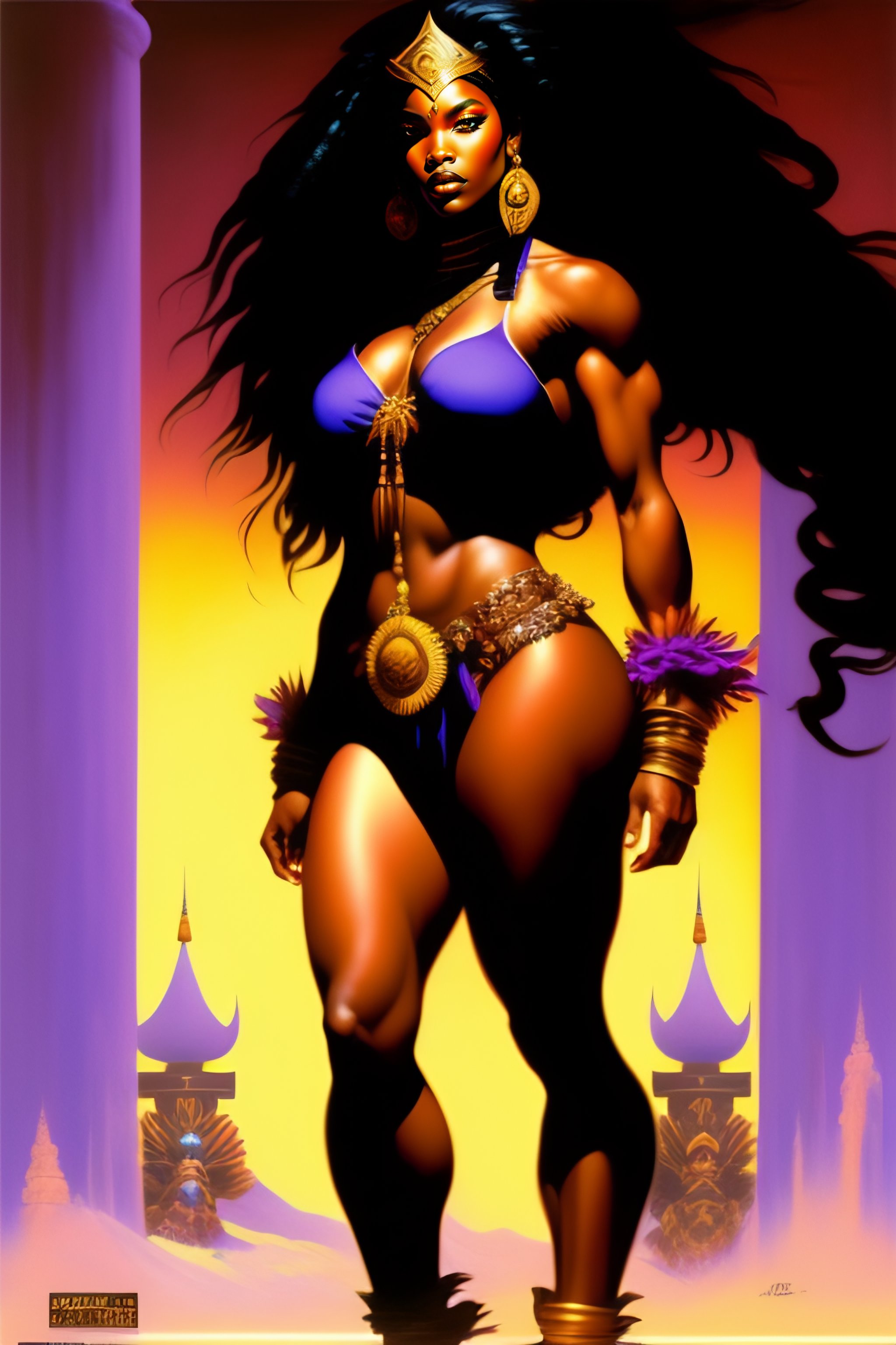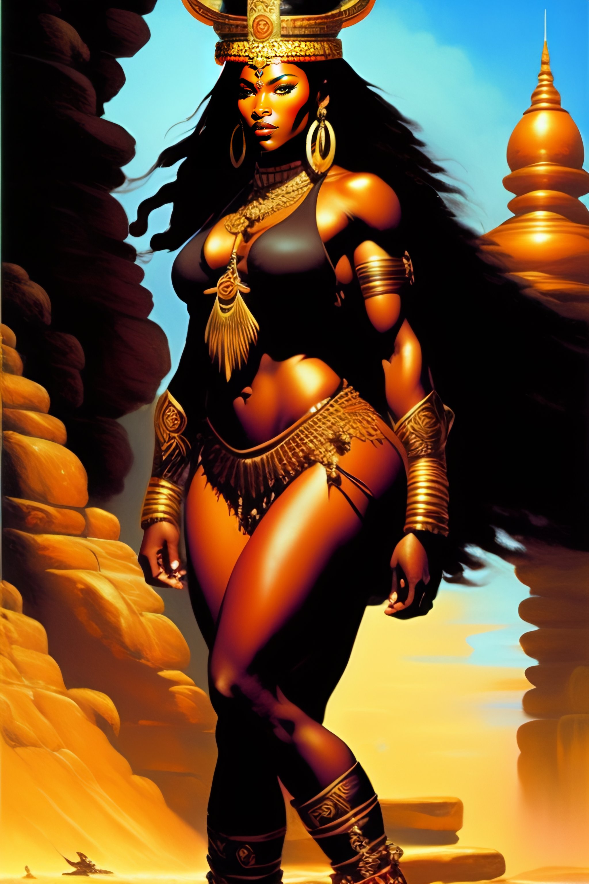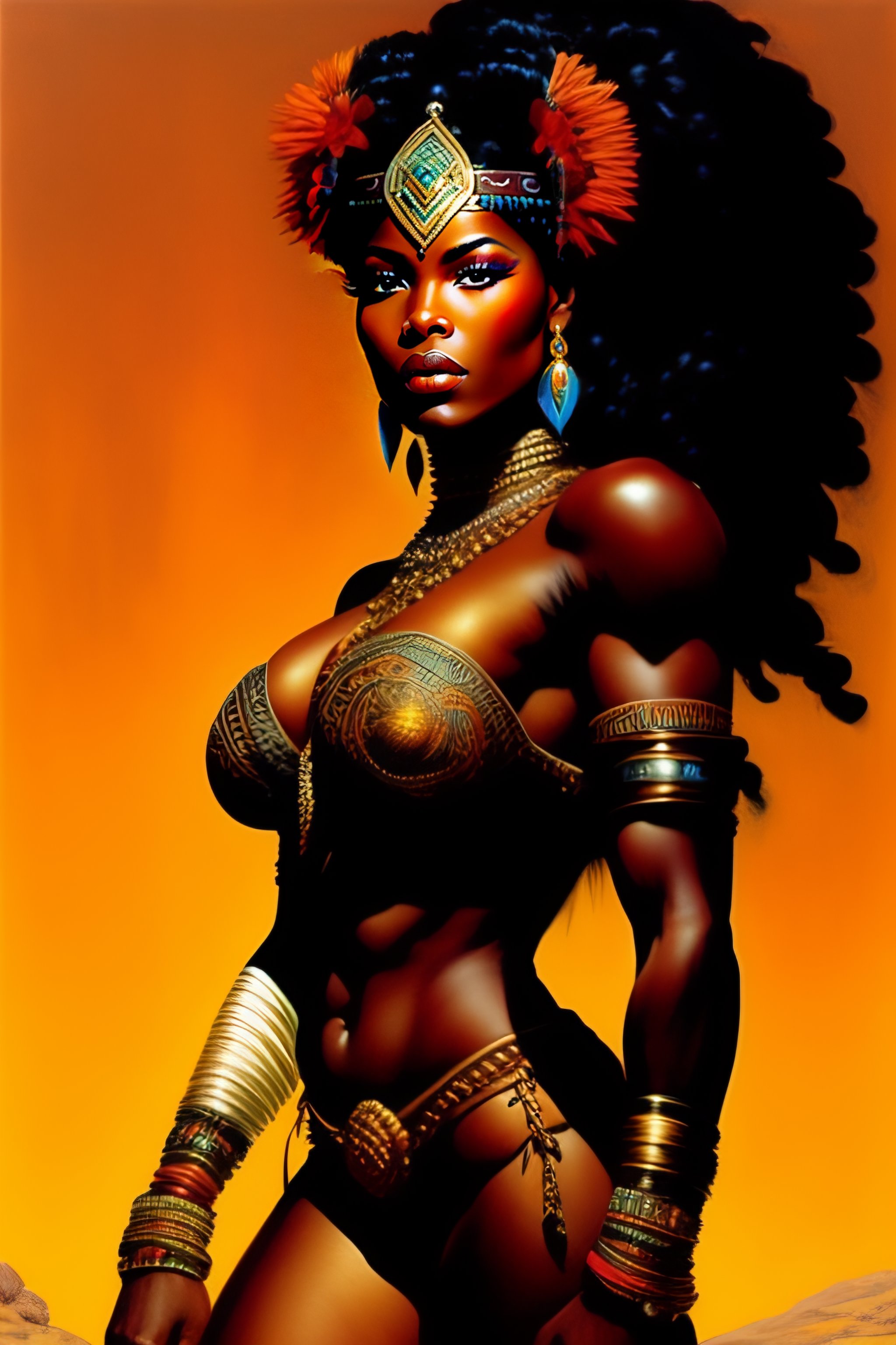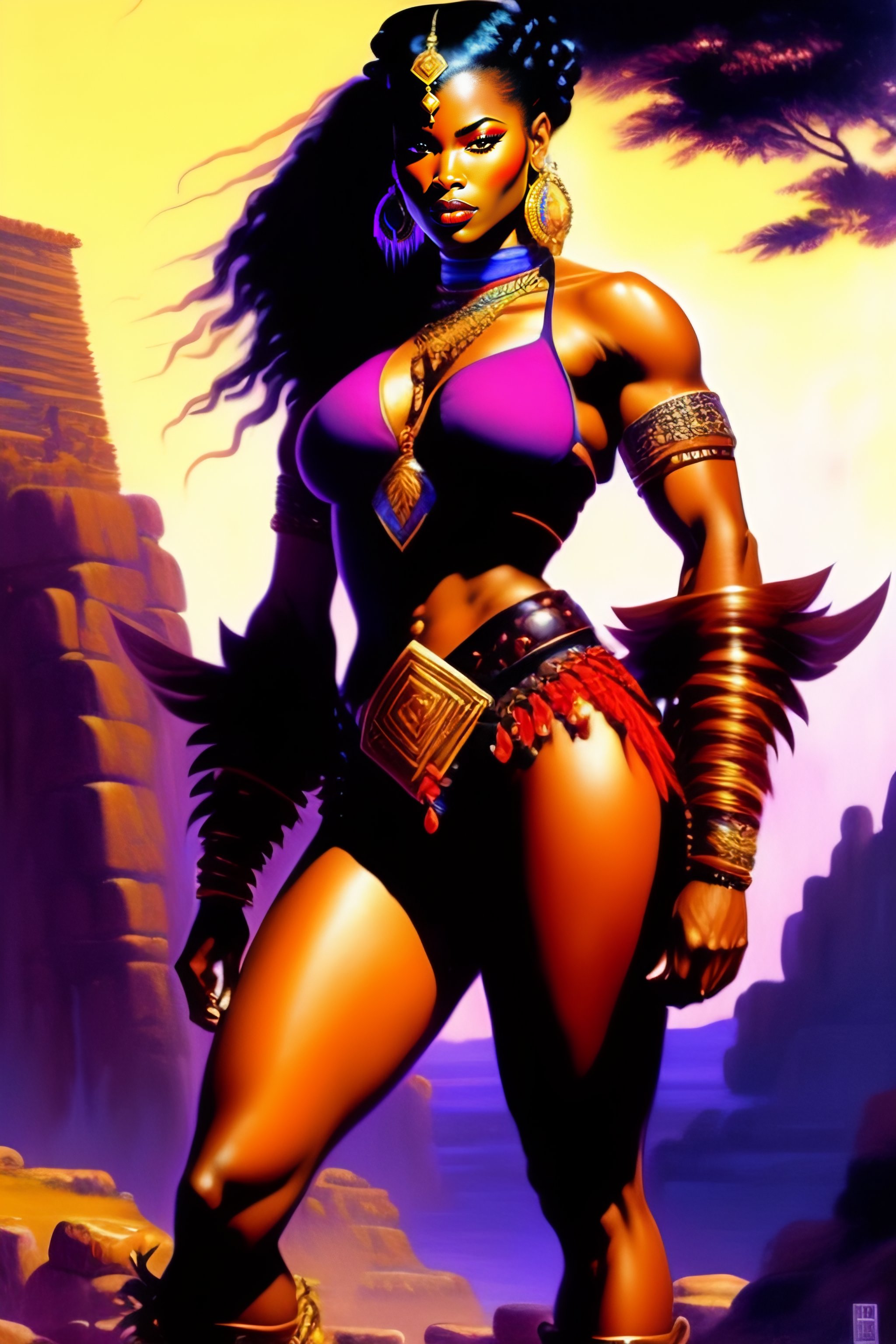 Beautiful black warrior princess, full body, strong, art by masamune shirow, frank frazetta, aztec, mayan, incan