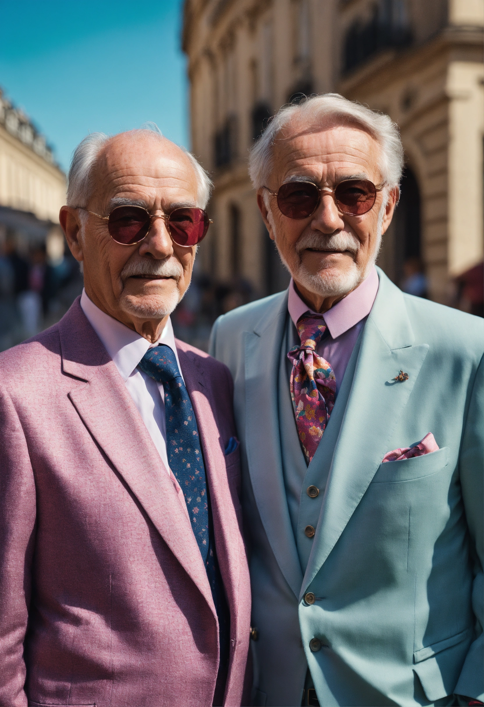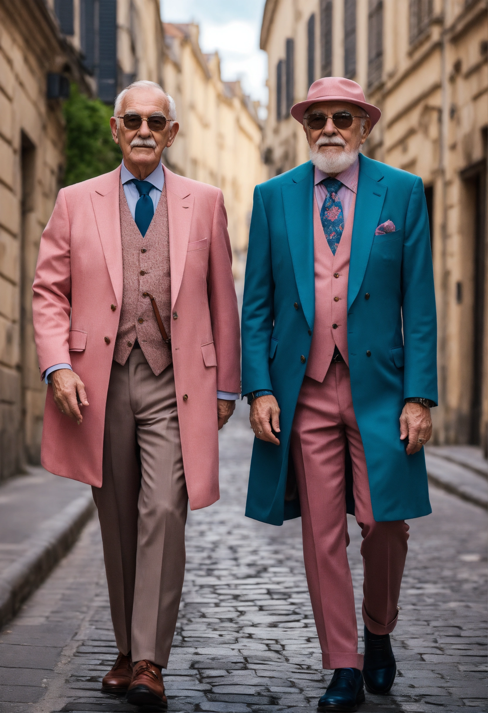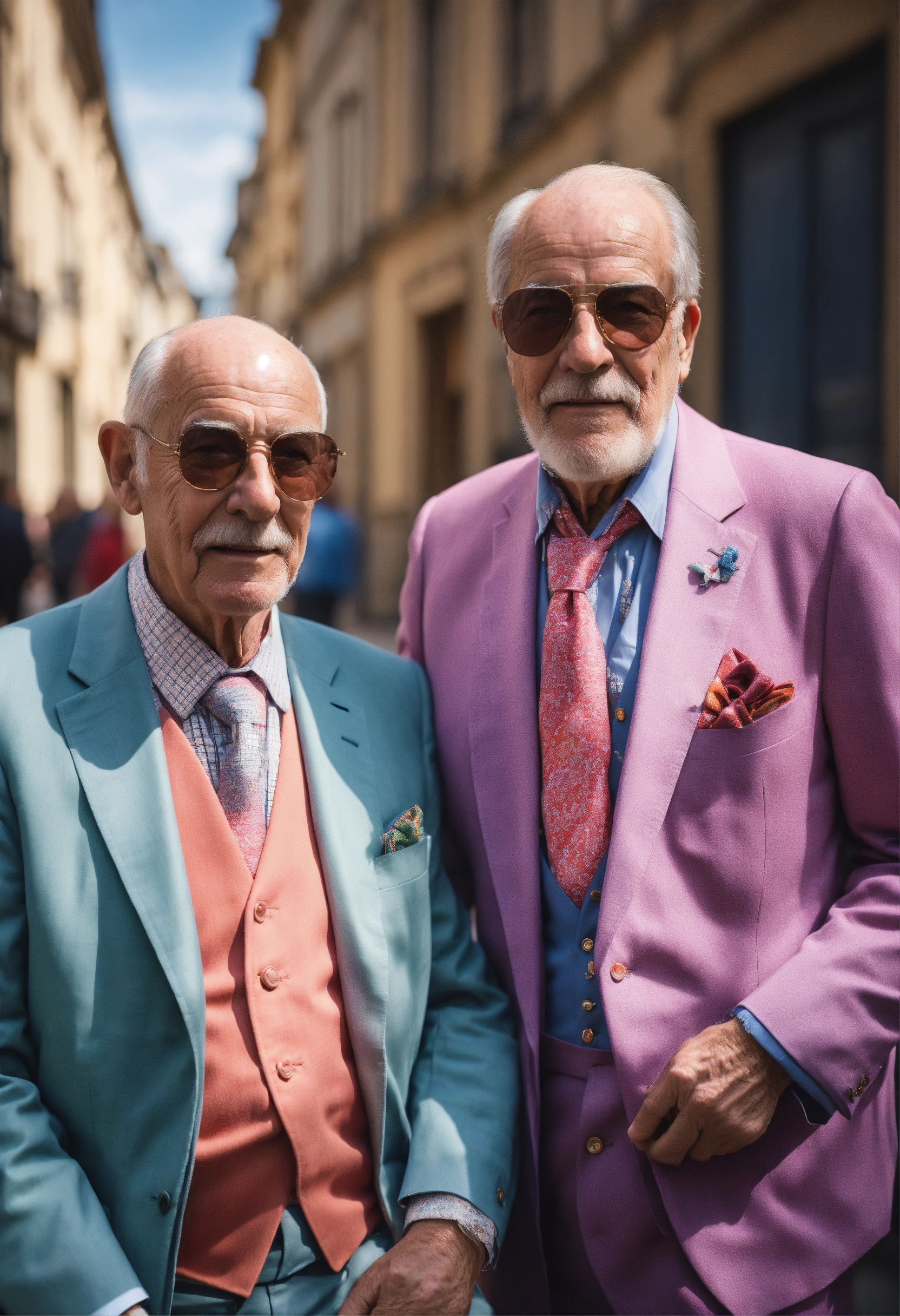 Realistic photo, 16k portrait photo, variant style, two variant old men dressed in suits in fashionable and trendy pastel varient colors and very funky, trendy, and friendly, in bordeaux france, fine definition, ultra-detailed